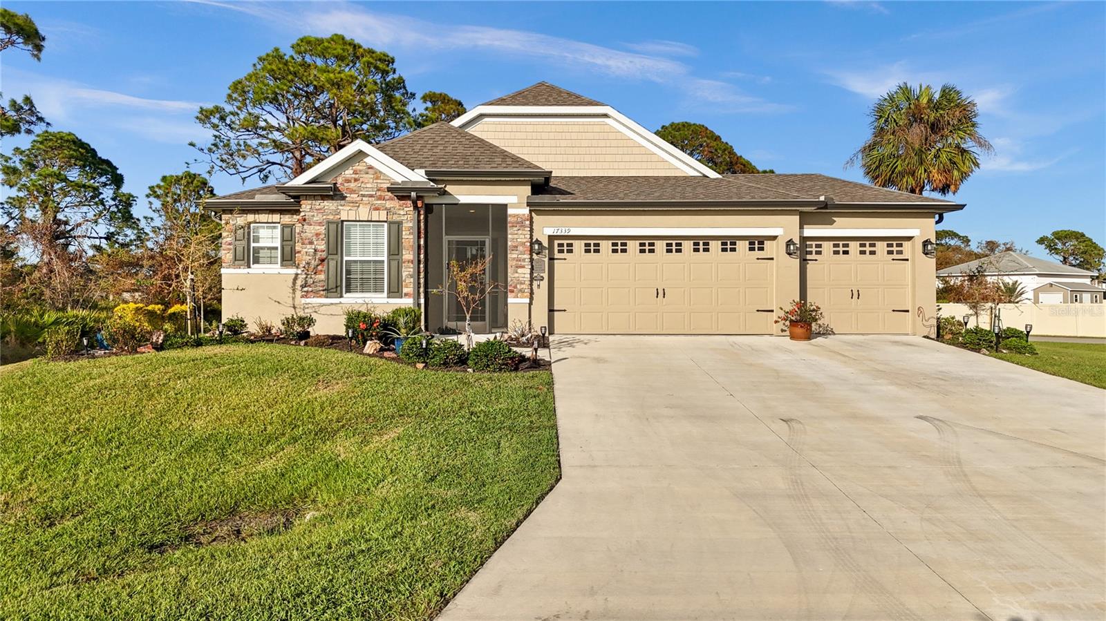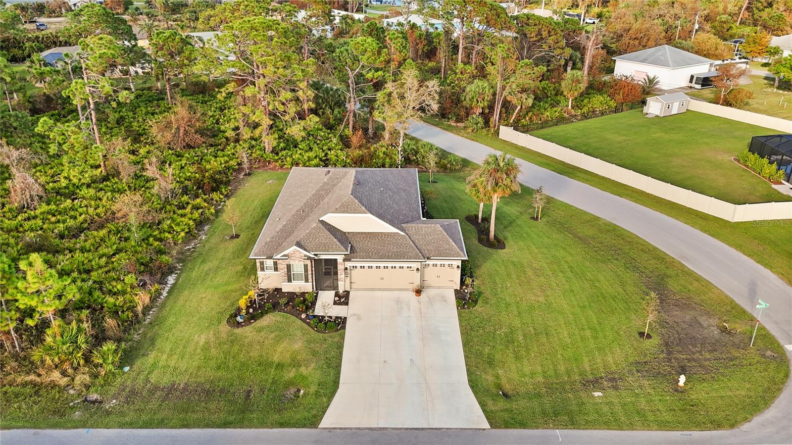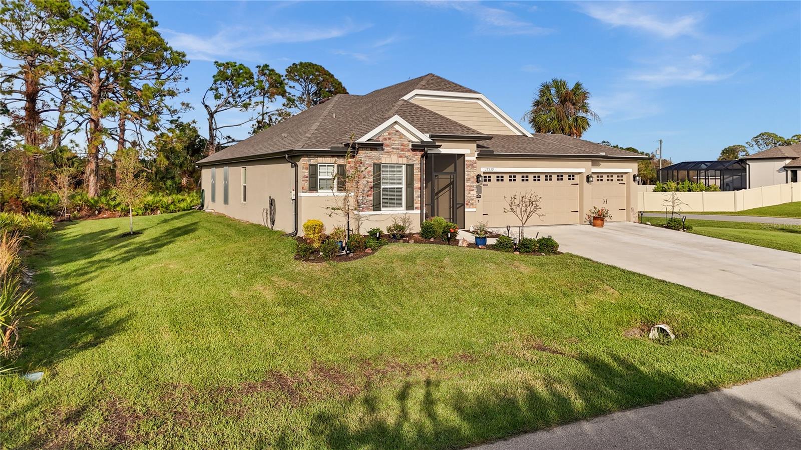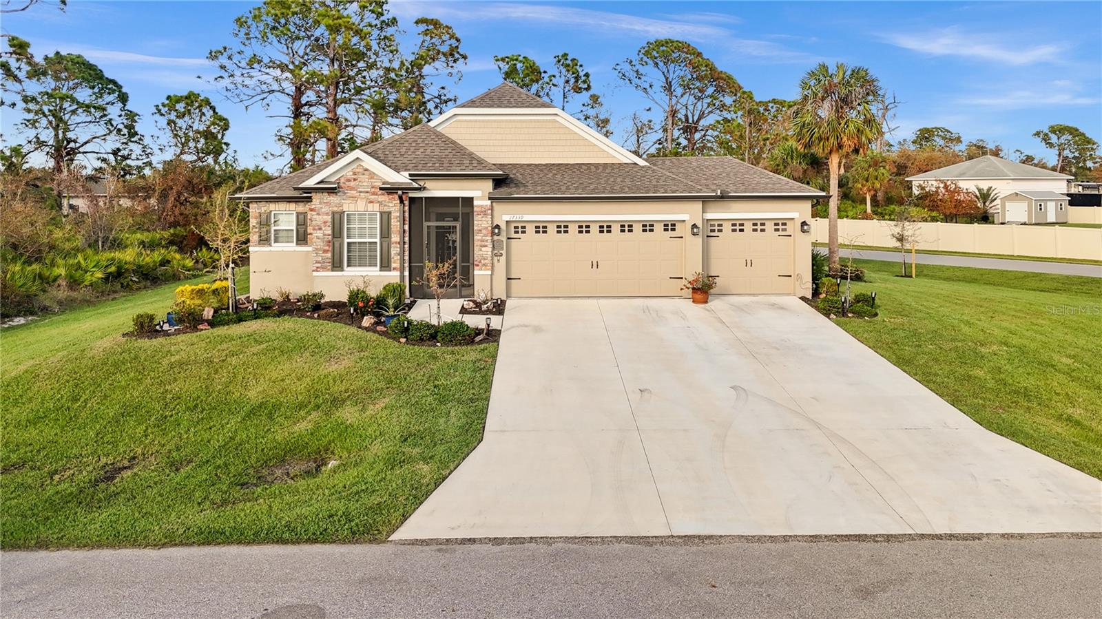Why Wait For New Construction, when you can move right in to this beautiful 2023 built home with upgrades galore!! This tastefully designed home just may have everything on your Wishlist. Be Wowed as soon as you drive up by the architectural features of this 3-car garage home with stacked stone accents and “Craftsman” style rooflines all surrounded by a meticulously maintained landscape. Upon entering the home, you are welcomed by an extended foyer into the grand open plan living/kitchen/dining area. The entire space is accented with crown molding, wood trimmed energy efficient windows featuring wood sills and custom blinds, upgraded ceiling fans and light fixtures. Sliding doors allow views of the large lanai and the serene, wooded back yard with abundant wildlife. The exquisite kitchen features craftsman style solid wood cabinetry w/soft close doors & drawers, 42” upper cabinets, crown molding, Quartz counter tops, Glass tile backsplash, all stainless-steel appliances including a double oven, glass cooktop French door refrigerator, microwave, dishwasher and an amazing 46”X 11.5’ island that is perfect for casual dining as well as entertaining. The primary bedroom offers a very generous 7’X9’ walk in closet, crown molding, a tray ceiling and a large en-suite bathroom. The 10’X13’ Primary bath features craftsman style cabinet with quartz top, double sink and a huge shower with multiple shower heads including a “Rain” head. Two additional bedrooms, guest bath and a 6’X9’ laundry (Washer & Dryer included) complete the interior of this lovely home. Relax after a long day on the large, screened lanai which has 20/20screen to keep out biting insects. Additional features include Luxury Vinyl floors throughout the entire home, upgraded wall Tile in both showers, 8’8” ceilings throughout, Ceiling fans in all bedrooms, Screened front entry(20/20screen), Oversized garage, Storm rated garage doors, Garage ceiling insulated, Rain Gutters around entire home, Storm Shutters, oversized driveway and a large corner lot on county water and sewer. This home is conveniently located to all of Charlotte County amenities including, dining, boat launches, beaches and shopping. Put this one at the TOP of your list to see!