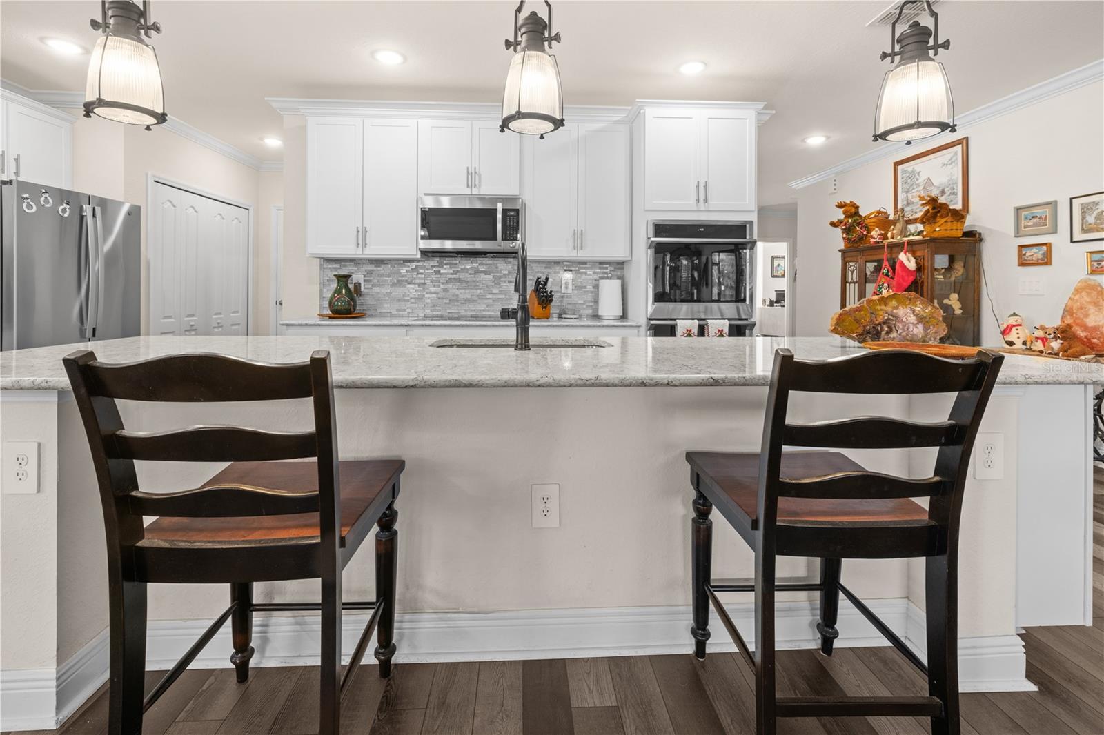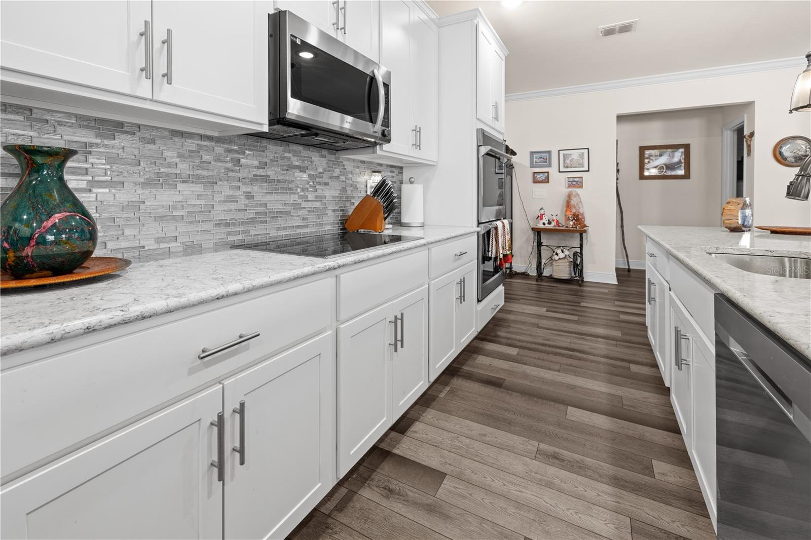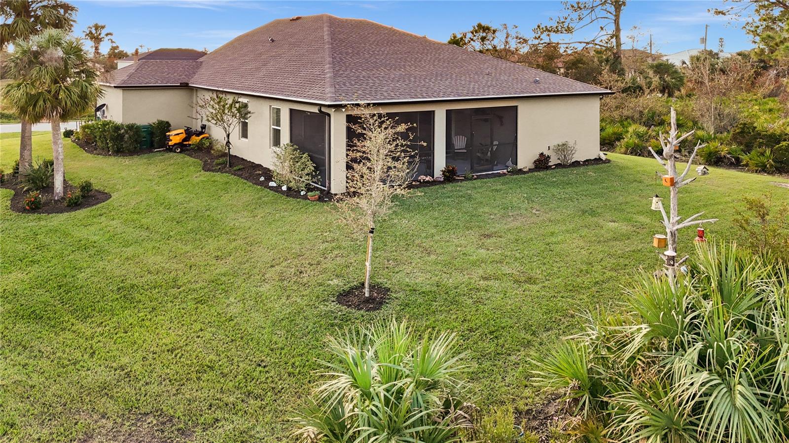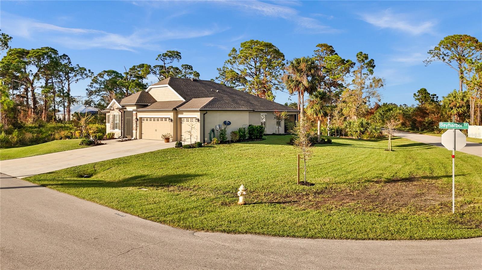 Why Wait For New Construction, when you can move right in to this beautiful 2023 built home with upgrades galore!! This tastefully designed home just may have everything on your Wishlist. Be Wowed as soon as you drive up by the architectural features of this 3-car garage home with stacked stone accents and “Craftsman” style rooflines all surrounded by a meticulously maintained landscape. Upon entering the home, you are welcomed by an extended foyer into the grand open plan living/kitchen/dining area. The entire space is accented with crown molding, wood trimmed energy efficient windows featuring wood sills and custom blinds, upgraded ceiling fans and light fixtures. Sliding doors allow views of the large lanai and the serene, wooded back yard with abundant wildlife. The exquisite kitchen features craftsman style solid wood cabinetry w/soft close doors & drawers, 42” upper cabinets, crown molding, Quartz counter tops, Glass tile backsplash, all stainless-steel appliances including a double oven, glass cooktop French door refrigerator, microwave, dishwasher and an amazing 46”X 11.5’ island that is perfect for casual dining as well as entertaining. The primary bedroom offers a very generous 7’X9’ walk in closet, crown molding, a tray ceiling and a large en-suite bathroom. The 10’X13’ Primary bath features craftsman style cabinet with quartz top, double sink and a huge shower with multiple shower heads including a “Rain” head. Two additional bedrooms, guest bath and a 6’X9’ laundry (Washer & Dryer included) complete the interior of this lovely home. Relax after a long day on the large, screened lanai which has 20/20screen to keep out biting insects. Additional features include Luxury Vinyl floors throughout the entire home, upgraded wall Tile in both showers, 8’8” ceilings throughout, Ceiling fans in all bedrooms, Screened front entry(20/20screen), Oversized garage, Storm rated garage doors, Garage ceiling insulated, Rain Gutters around entire home, Storm Shutters, oversized driveway and a large corner lot on county water and sewer. This home is conveniently located to all of Charlotte County amenities including, dining, boat launches, beaches and shopping. Put this one at the TOP of your list to see!