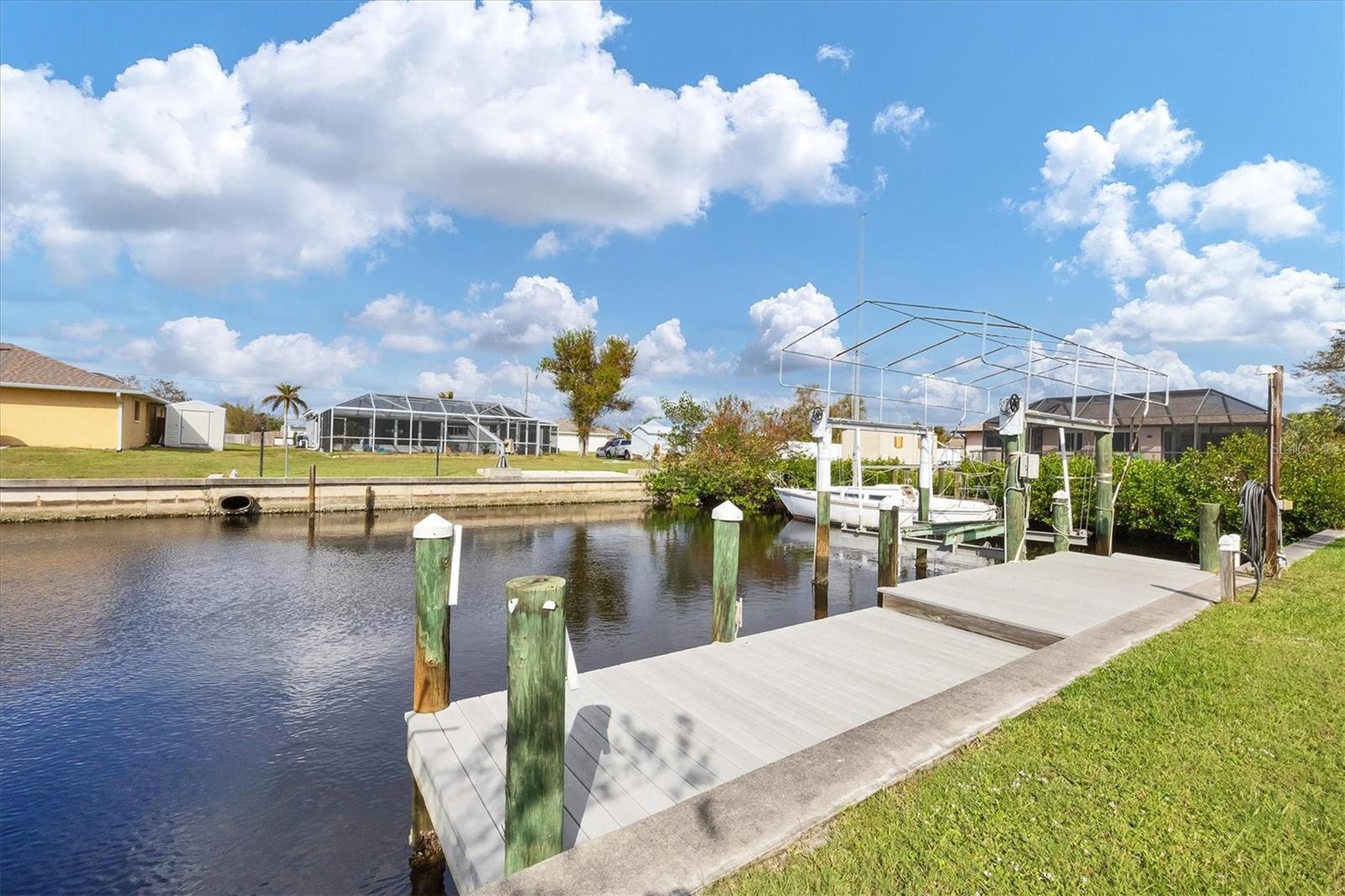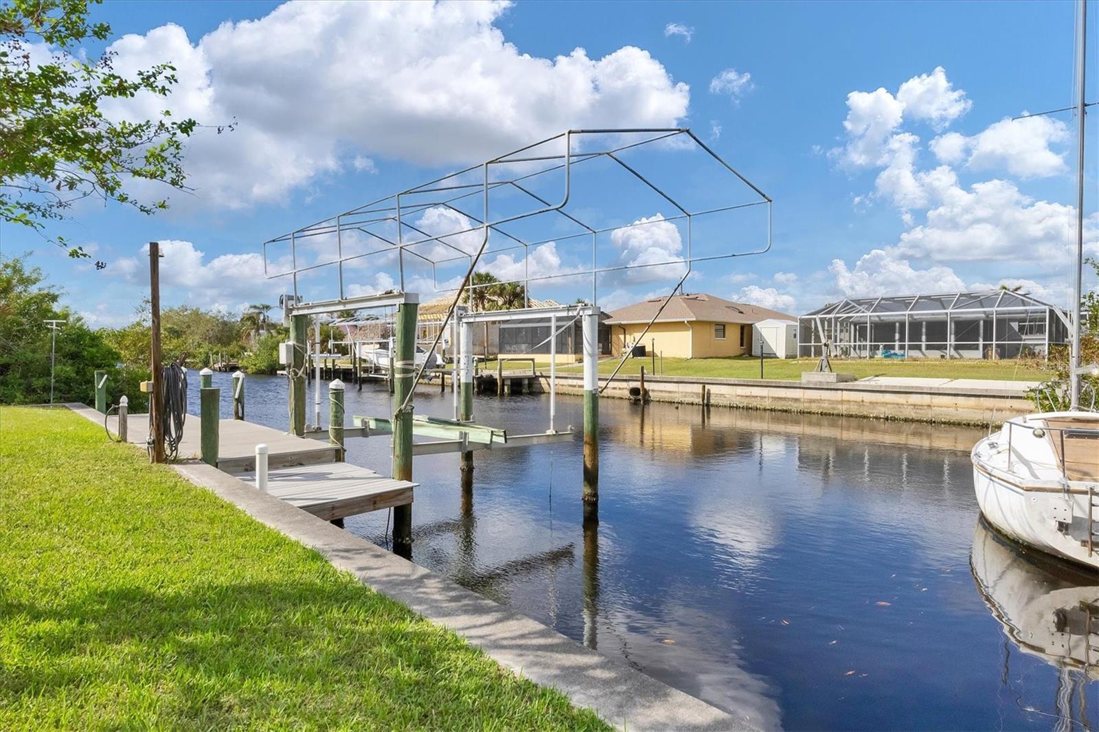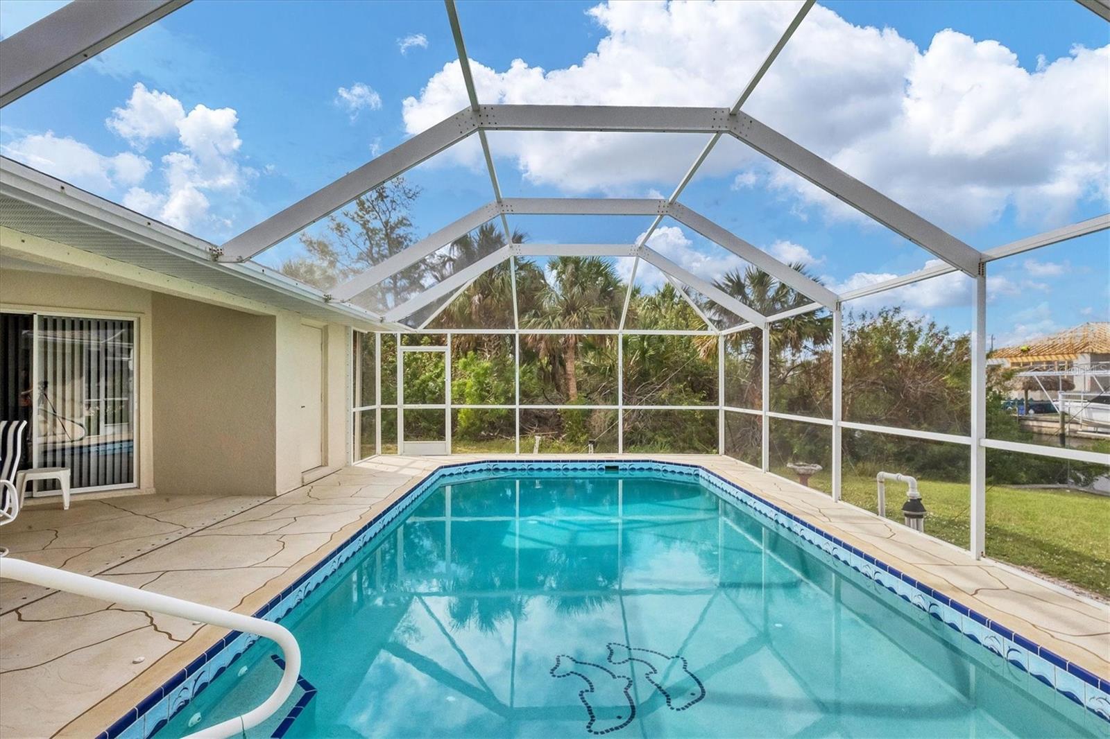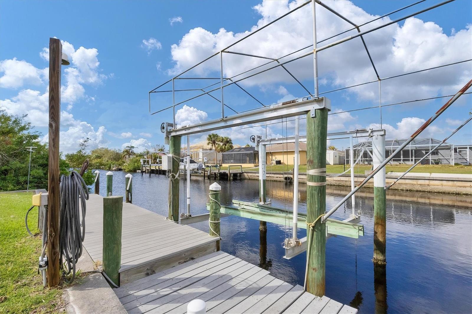 Waterfront pool home lovingly maintained is waiting for you to make it yours! You'll feel secure knowing the roof was replaced in 2022, HVAC system in 2022 and pool motor in 2021 and storm shutters for all openings. You'll also appreciate these features of this home that include but are not limited to self cleaning pool, granite counters in kitchen, support walls preventatively sprayed for bugs and mold when home was being built, 40' Trex dock, 10,000 lb. boat lift, whole house water filter, pool patio resurfaced 2020, generator thar runs propane or gas. This home is spacious and laid out well for family living or just those that may like to entertain. Step through your front door to find formal living/dining room floor plan. You'll move through the entrance to find your kitchen and adjacent family for more causal times. Your kitchen boast stainless appliances including a large stainless farm sink with a pass through window for passing charcuterie trays and drinks through to the lanai. Primary suite is also very spacious and open with sliders to your lanai ad pool and ensuite bath with walk in roman shower. Ever popular and desired split bedroom plan affords privacy for your guest as well as yourself. There are multiple dining choices with a breakfast nook, breakfast bar and formal dining area too. Exit through anyone of the 4 sliders in different rooms or the direct exit from 2nd bath to your beautiful pool, just the place to spend a beautiful Florida day. Head out to the back yard and enjoy cleaning the fish you caught on your boat that day with electric and water available at the TREX dock that boasts a 10,000 lb lift. or head out for a day on the water, no bridges to open water (sailboat water) with beautiful views along the way. Everything you need here to enjoy the true Florida lifestyle - sun, waterfront, pool, dock - just bring your furniture, bathing suits and boat. Do yourself a favor and put this on your must see list now and call to view!