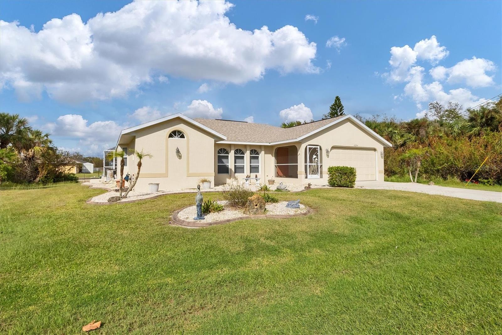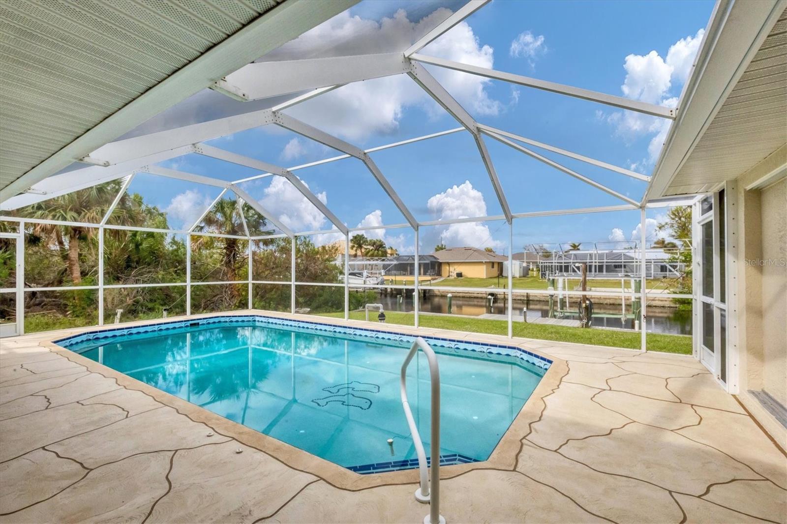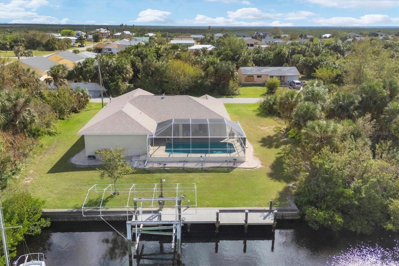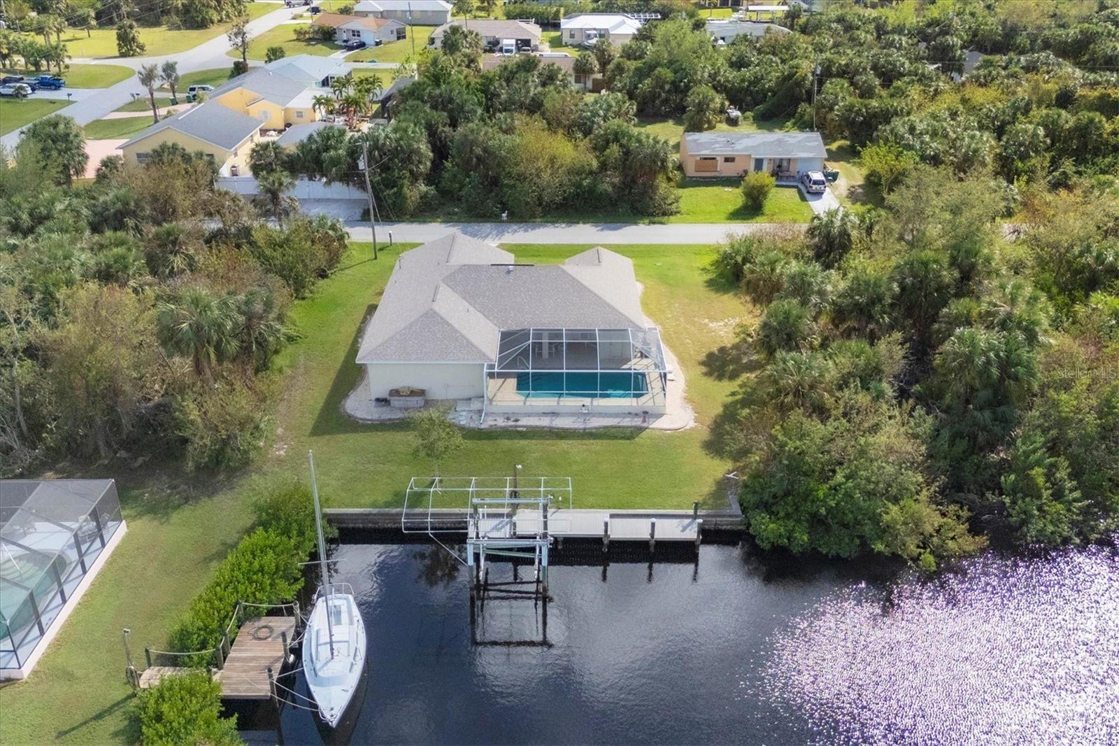 Waterfront pool home lovingly maintained is waiting for you to make it yours! You'll feel secure knowing the roof was replaced in 2022, HVAC system in 2022 and pool motor in 2021 and storm shutters for all openings. You'll also appreciate these features of this home that include but are not limited to self cleaning pool, granite counters in kitchen, support walls preventatively sprayed for bugs and mold when home was being built, 40' Trex dock, 10,000 lb. boat lift, whole house water filter, pool patio resurfaced 2020, generator thar runs propane or gas. This home is spacious and laid out well for family living or just those that may like to entertain. Step through your front door to find formal living/dining room floor plan. You'll move through the entrance to find your kitchen and adjacent family for more causal times. Your kitchen boast stainless appliances including a large stainless farm sink with a pass through window for passing charcuterie trays and drinks through to the lanai. Primary suite is also very spacious and open with sliders to your lanai ad pool and ensuite bath with walk in roman shower. Ever popular and desired split bedroom plan affords privacy for your guest as well as yourself. There are multiple dining choices with a breakfast nook, breakfast bar and formal dining area too. Exit through anyone of the 4 sliders in different rooms or the direct exit from 2nd bath to your beautiful pool, just the place to spend a beautiful Florida day. Head out to the back yard and enjoy cleaning the fish you caught on your boat that day with electric and water available at the TREX dock that boasts a 10,000 lb lift. or head out for a day on the water, no bridges to open water (sailboat water) with beautiful views along the way. Everything you need here to enjoy the true Florida lifestyle - sun, waterfront, pool, dock - just bring your furniture, bathing suits and boat. Do yourself a favor and put this on your must see list now and call to view!