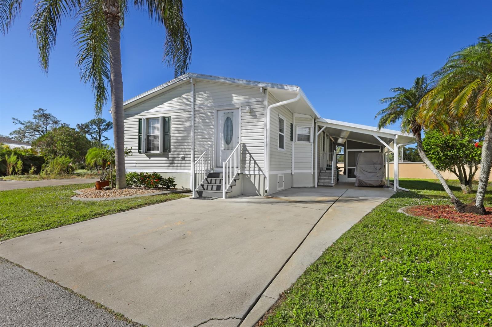Welcome to 977 Sherbrooke Cres in award winning Maple Leaf Golf & Country Club. This 2005 Fleetwood built home is located on perimeter lot. Interior remodeled floorplan includes 2 bedrooms, 2 bathrooms, a BONUS room, kitchen, living room and interior laundry for added convenience. Move in ready home that is sure to impress with a split bedroom floorplan for additional privacy, perfect for your overnight guests. The original 12'x11' guest bedroom has been converted into a spacious primary en-suite bathroom complete with tiled walk-in shower, double vanity with granite counter and plenty of added storage. The guest bedroom has been relocated to the front of the home. Crown molding and drywall are featured in this well maintained home. Open concept is perfect to entertaining. Luxury vinyl plank flooring is featured throughout the home for easy maintenance. The primary suite has a ceiling fan and they converted the original primary bath into a large walk-in closet. The guest bathroom features a shower/tub combo and upgraded vanity with granite counter. The custom built kitchen has wood cabinets, center island and granite counters. The shed at the end of the covered / screened carport offers additional storage. New roof-over March 2023. Upgraded storm shutters on the exterior. Home is being sold furnished with a golf cart! **Be sure to check out the 3-D virtual tour and walk through video links**. Located in award winning Maple Leaf Golf & Country Club, a popular 55+ gated golf course community with an active resort lifestyle. Features a Par 62, 18 hole golf course, 5 tennis courts, bocce ball, lawn bowling, 2 shuffleboard courts, 4 heated swimming pools, 2 hot tubs, fitness facility, woodworking facility, 75+ clubs/activities, 4 pickleball courts, restaurant with full service bar, tiki hut/bar and more. Don't miss out on this opportunity to live in a thriving community where every day feels like a vacation. It's true what they say, it's all about the lifestyle.