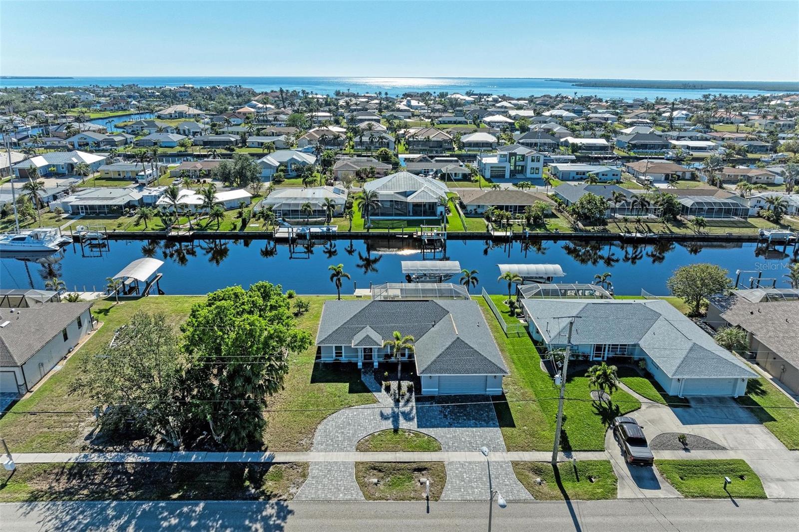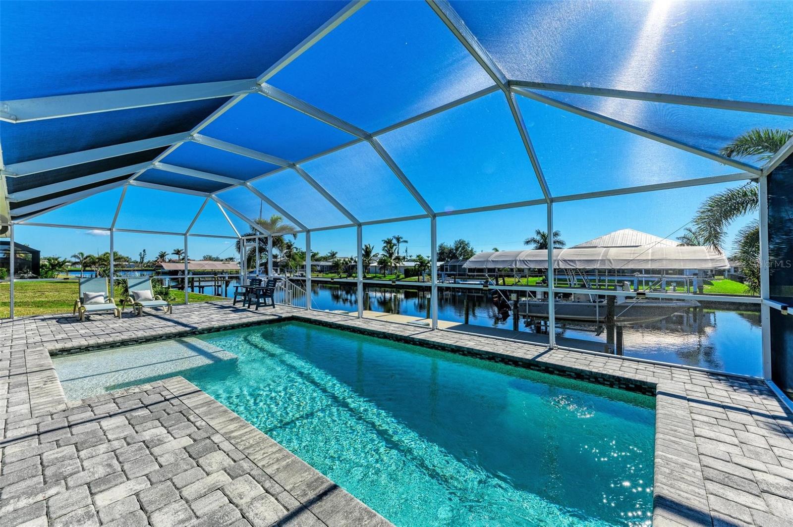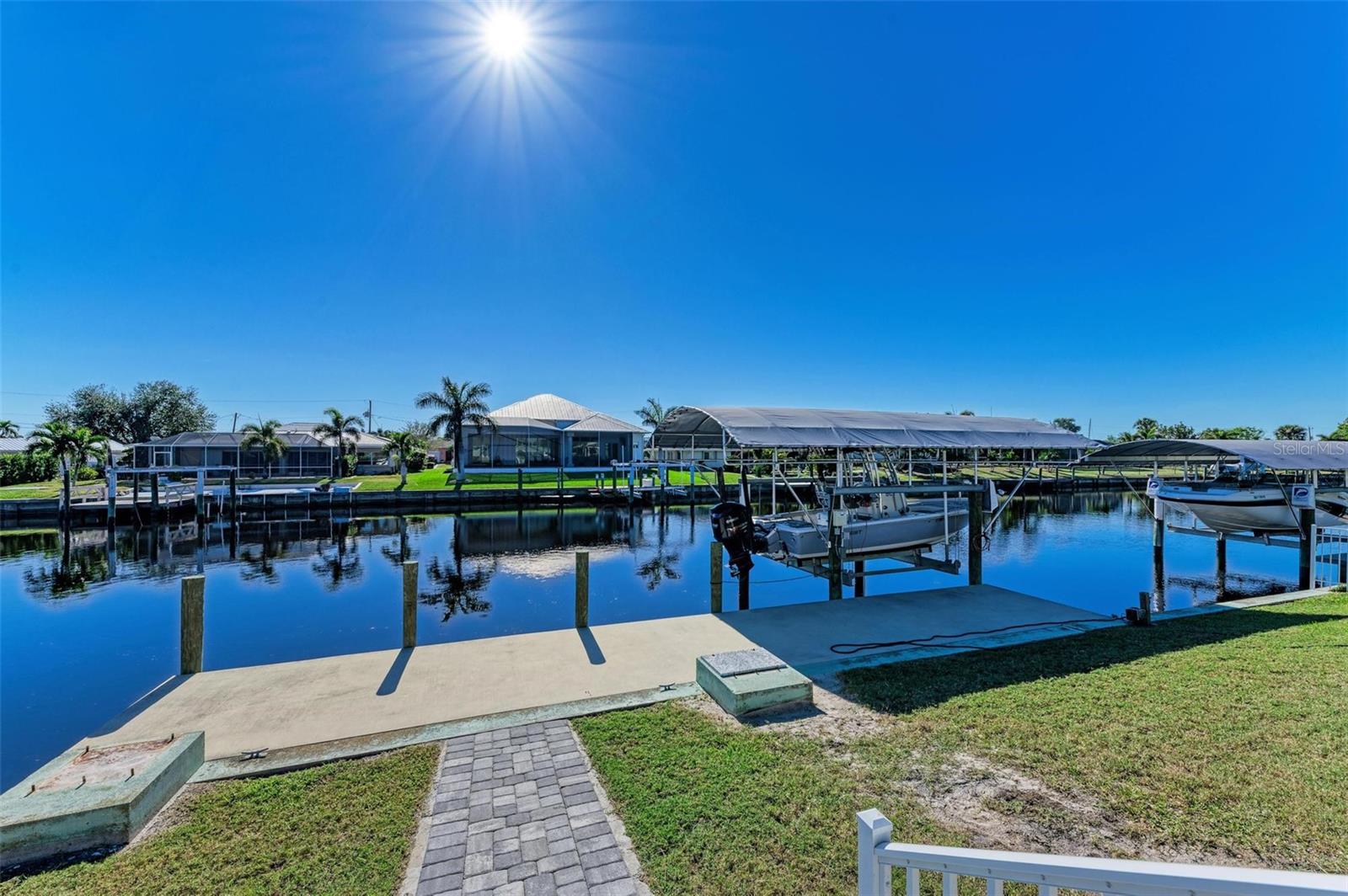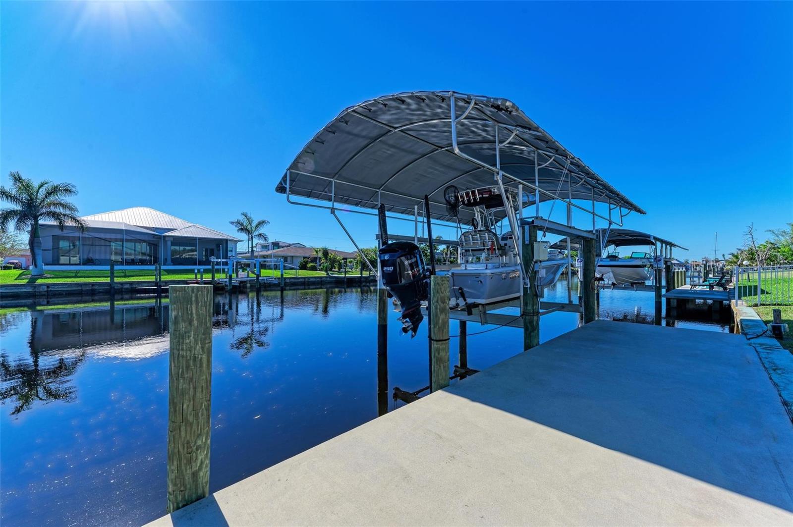This exquisite home, built in 2019, features THREE GENEROUSLY SIZED BEDROOMS and TWO BATHROOMS with a DEN/OFFICE, complemented by a HEATED POOL and beautiful SUMMER KITCHEN. Boaters will enjoy easy access to Charlotte Harbor via DEEP WATER SAILBOAT ACCESS that takes you to open water in JUST 5 MINUTES. So, bring your boat and tie off to the 45-FOOT CONCRETE DOCK equipped with a COVERED 10,000-POUND BOAT LIFT. The exterior is fitted with IMPACT-RESISTANT WINDOWS AND DOORS for added safety and efficiency. Inside, the large primary bedroom features TWO WALK-IN CLOSETS and access directly to the pool deck with a lavish primary bathroom that includes a WALK-IN SHOWER AND A FREESTANDING TUB for relaxation. Each guest bedroom is generously sized and boasts a walk-in closet. While the guest bathroom doubles as a pool bath and is equipped with a TILED-WALL SHOWER/TUB COMBO AND QUARTZ COUNTERTOP VANITY. The well-situated kitchen has NEWER APPLIANCES, STUNNING QUARTZ COUNTERTOPS, and a LARGE ISLAND, perfect for meal preparation and hosting guests. The expansive pool deck offers an abundance of shaded space under the COVERED PATIO, along with plenty of room around the pool to enjoy all day SOUTHERN EXPOSURE sunshine and amazing sunsets. The pool features a PEBBLE TECH SURFACE and includes a SUN SHELF, ideal for lounging right in the water. This area is perfect for both relaxation and entertainment, making it an ideal spot to unwind with family and friends. A spacious CIRCULAR PAVED DRIVEWAY ensures convenient entry and exit to the 2-car garage. NO FLOODING from the last storms and Just minutes away from DOWNTOWN PUNTA GORDA, this location can’t get any better.