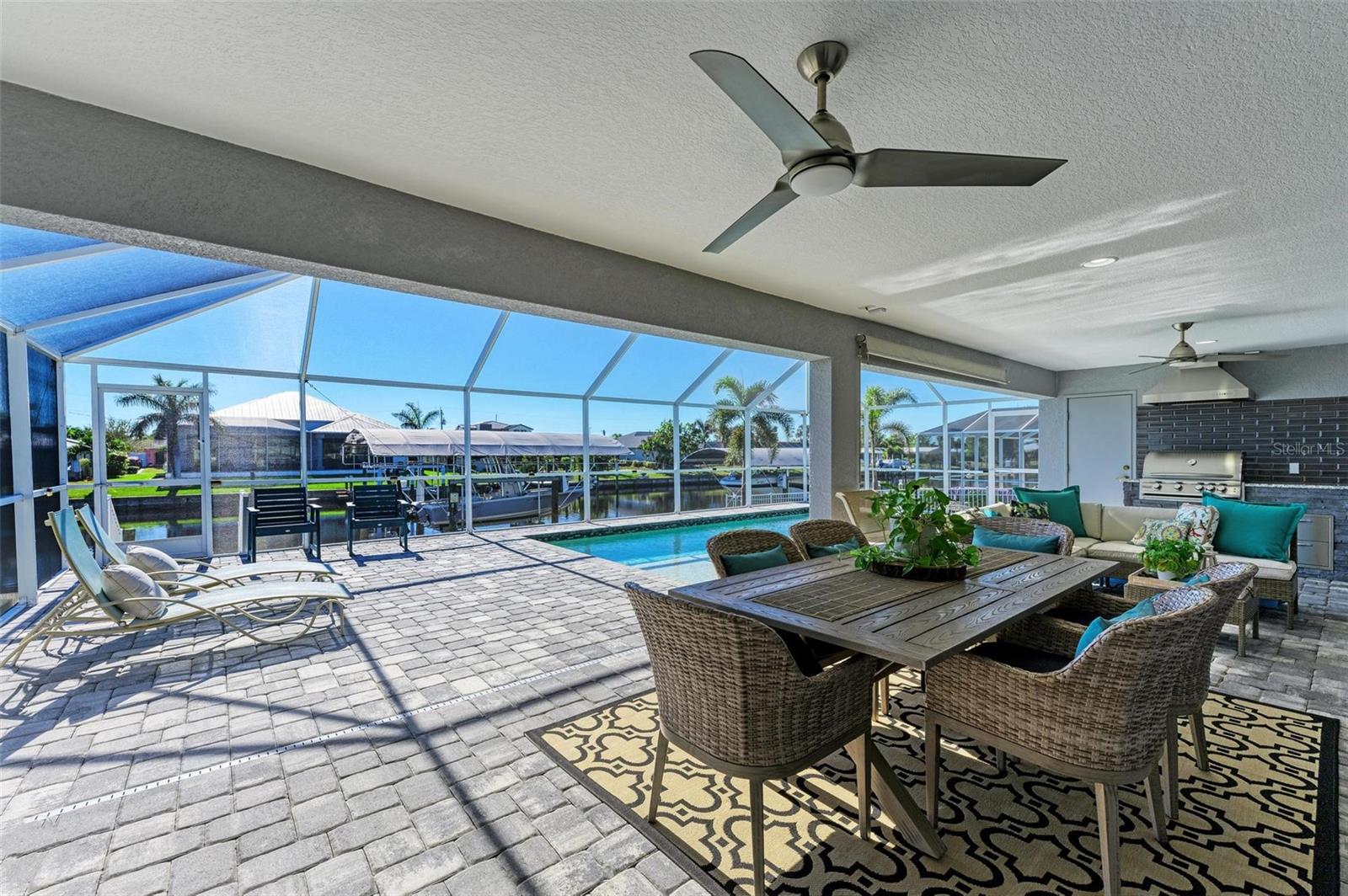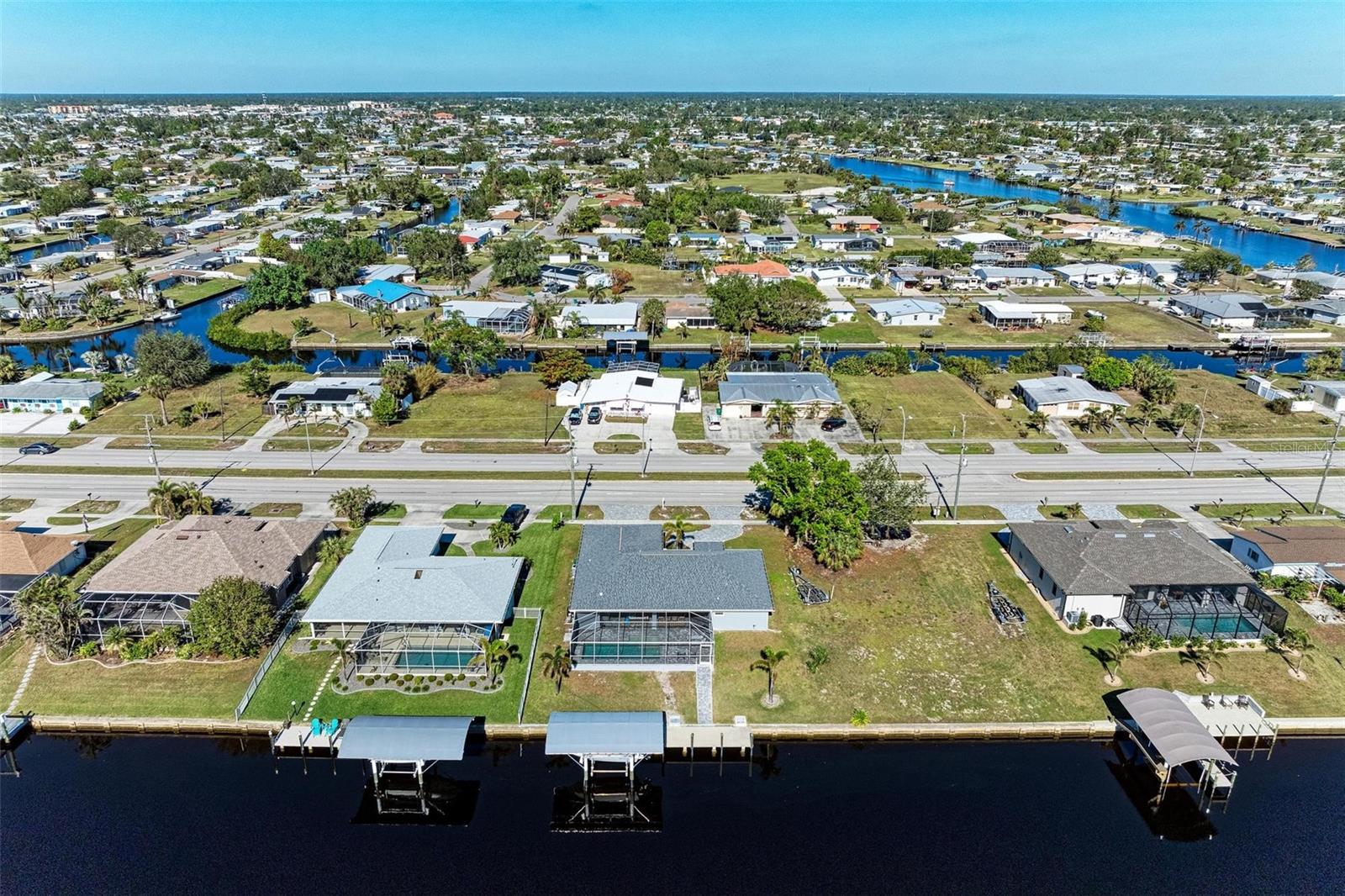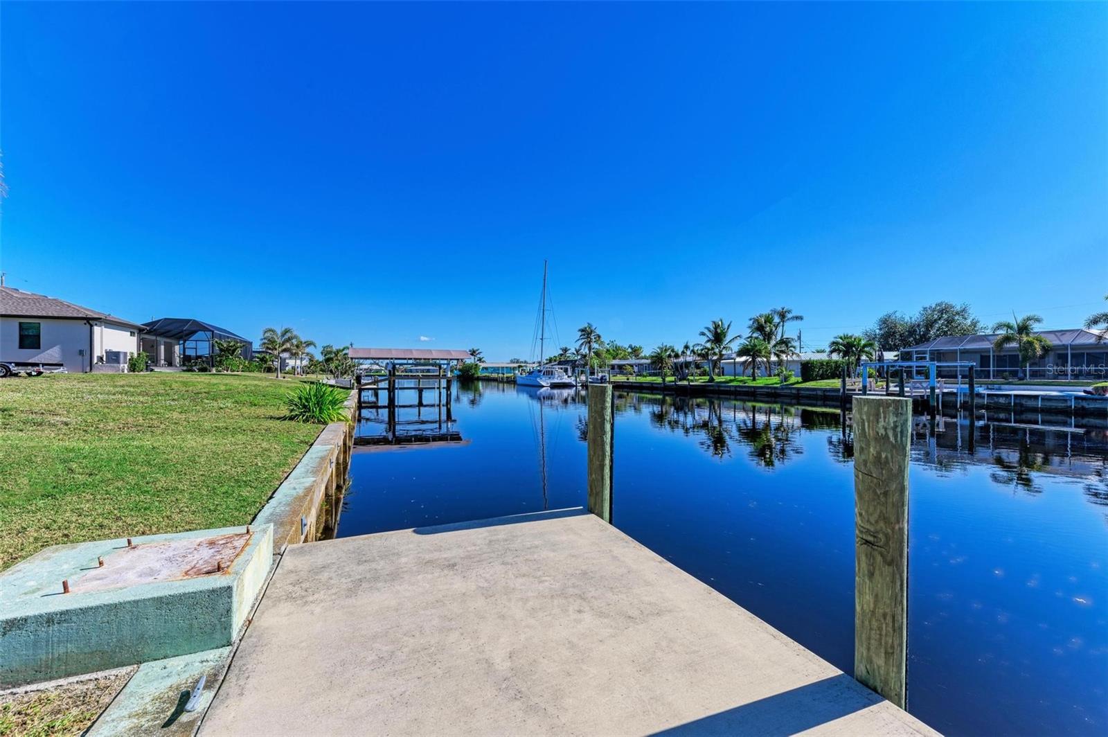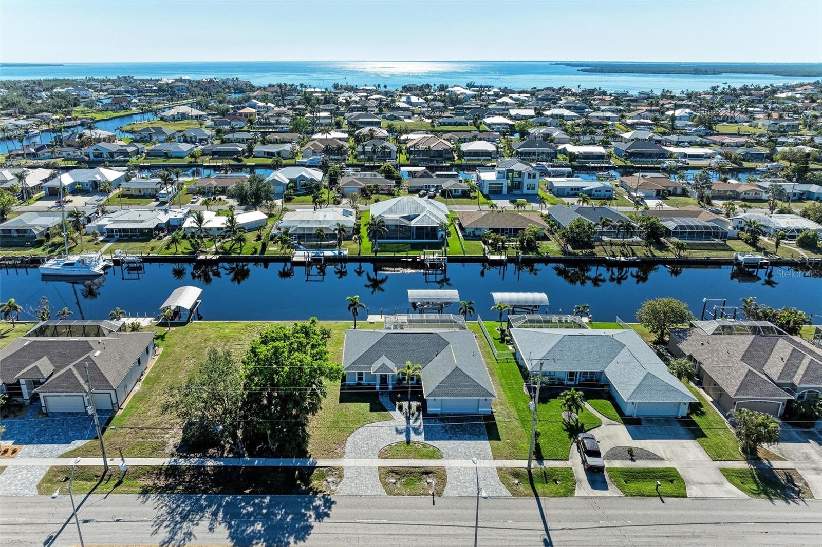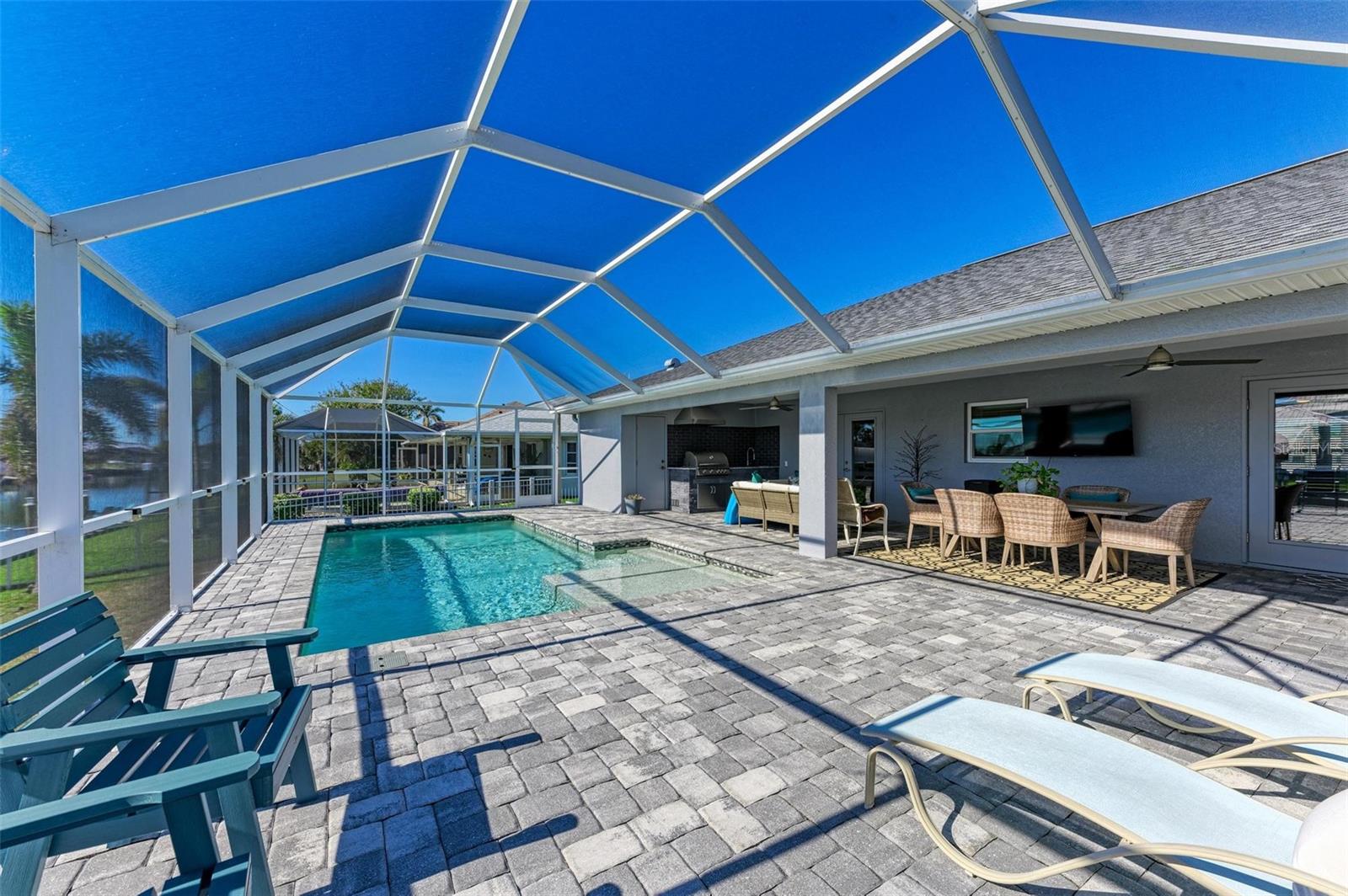 This exquisite home, built in 2019, features THREE GENEROUSLY SIZED BEDROOMS and TWO BATHROOMS with a DEN/OFFICE, complemented by a HEATED POOL and beautiful SUMMER KITCHEN. Boaters will enjoy easy access to Charlotte Harbor via DEEP WATER SAILBOAT ACCESS that takes you to open water in JUST 5 MINUTES. So, bring your boat and tie off to the 45-FOOT CONCRETE DOCK equipped with a COVERED 10,000-POUND BOAT LIFT. The exterior is fitted with IMPACT-RESISTANT WINDOWS AND DOORS for added safety and efficiency. Inside, the large primary bedroom features TWO WALK-IN CLOSETS and access directly to the pool deck with a lavish primary bathroom that includes a WALK-IN SHOWER AND A FREESTANDING TUB for relaxation. Each guest bedroom is generously sized and boasts a walk-in closet. While the guest bathroom doubles as a pool bath and is equipped with a TILED-WALL SHOWER/TUB COMBO AND QUARTZ COUNTERTOP VANITY. The well-situated kitchen has NEWER APPLIANCES, STUNNING QUARTZ COUNTERTOPS, and a LARGE ISLAND, perfect for meal preparation and hosting guests. The expansive pool deck offers an abundance of shaded space under the COVERED PATIO, along with plenty of room around the pool to enjoy all day SOUTHERN EXPOSURE sunshine and amazing sunsets. The pool features a PEBBLE TECH SURFACE and includes a SUN SHELF, ideal for lounging right in the water. This area is perfect for both relaxation and entertainment, making it an ideal spot to unwind with family and friends. A spacious CIRCULAR PAVED DRIVEWAY ensures convenient entry and exit to the 2-car garage. NO FLOODING from the last storms and Just minutes away from DOWNTOWN PUNTA GORDA, this location can’t get any better.