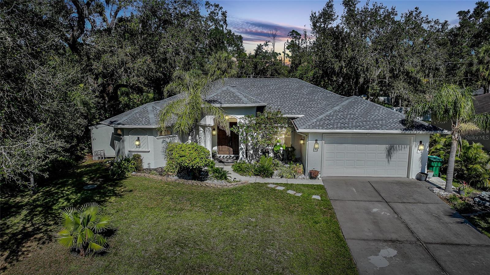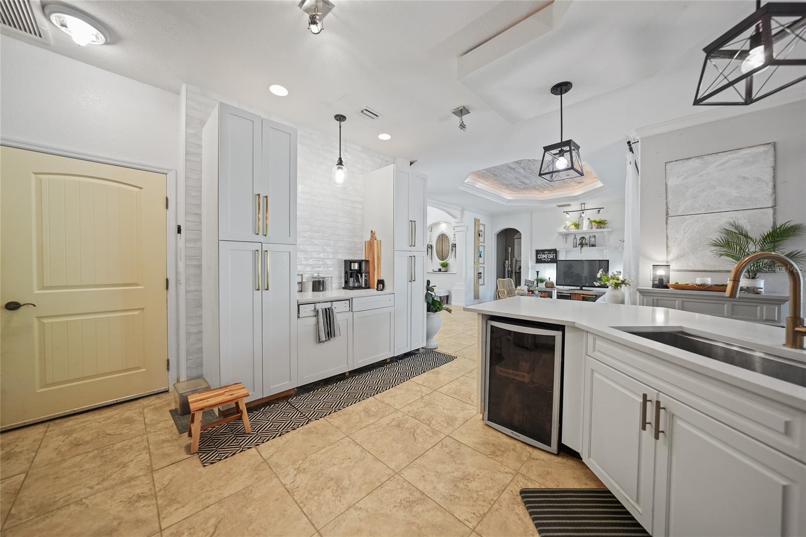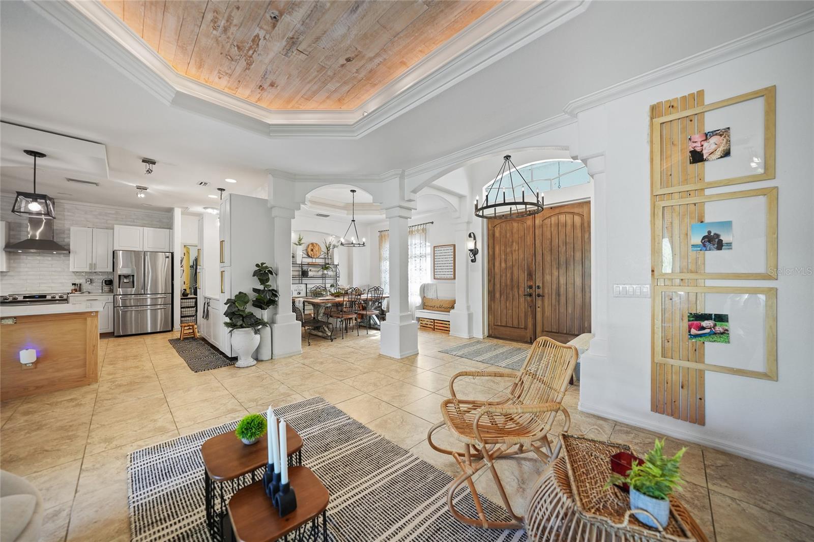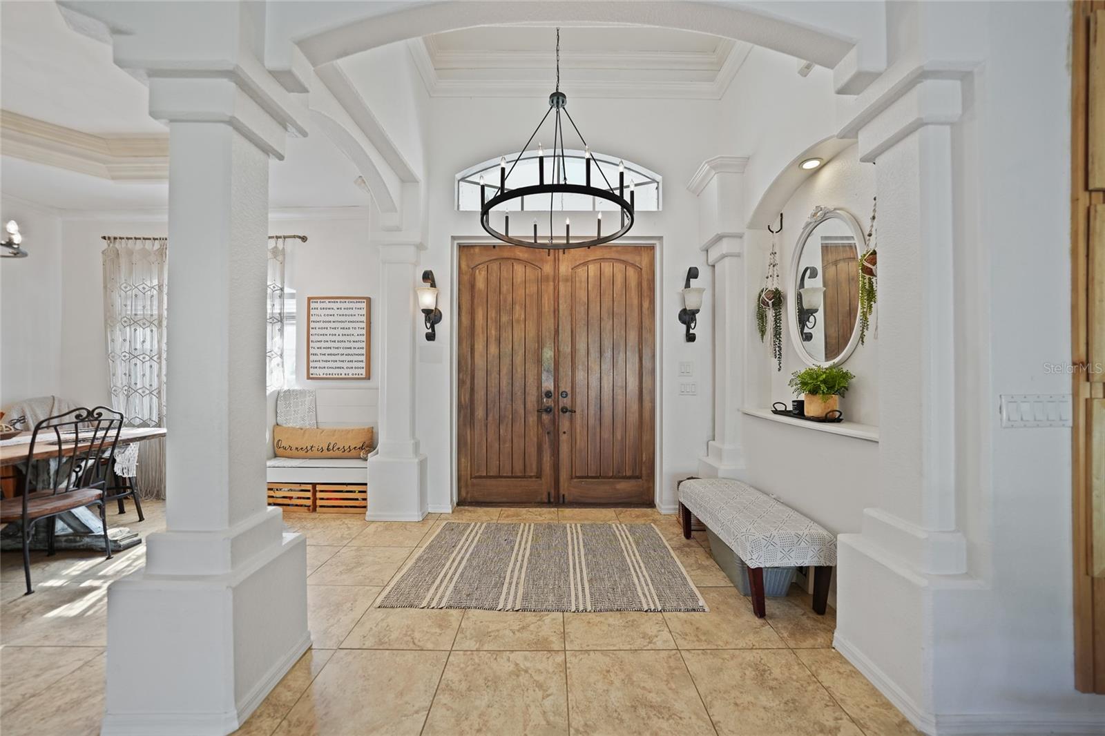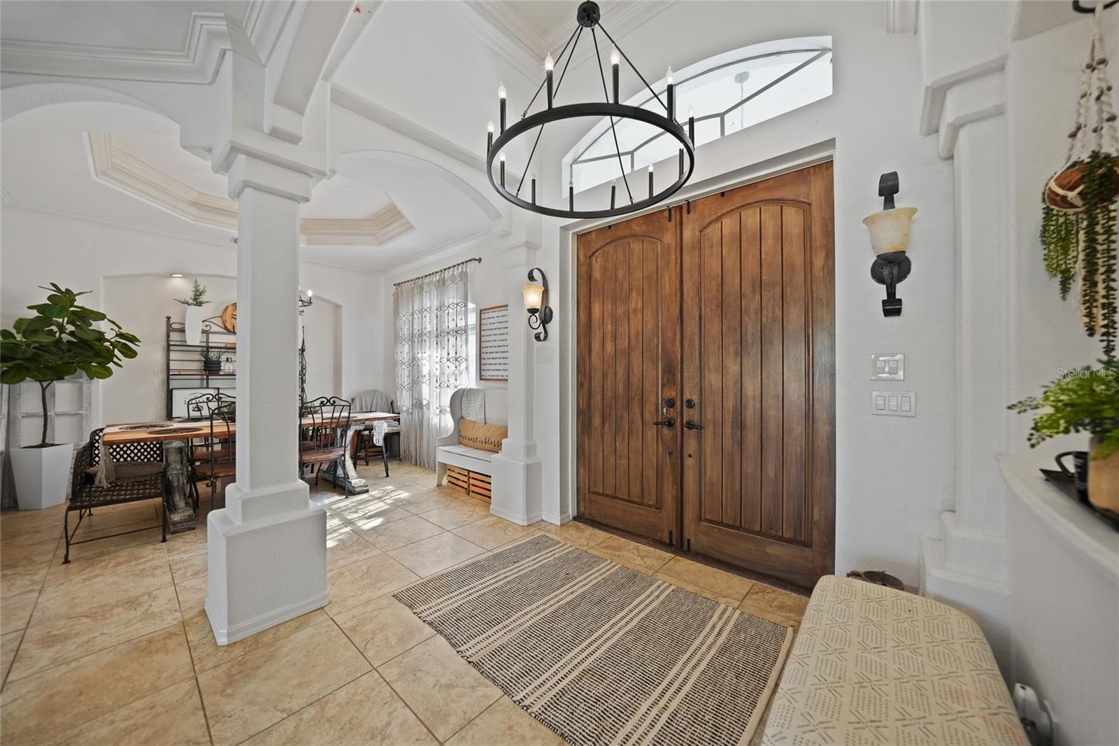This stunning home captivates from the moment you arrive. The elegant design features a stately columned, brick-paved entryway, complemented by a magnificent solid wood double-door entrance and upgraded exterior lighting with a NEW ROOF as of 2023. Step inside, and the extraordinary details continue to impress. The soaring volume ceiling in the foyer sets the stage, showcasing interior columns, tray ceilings with accent lighting, a dramatic backlit reverse tray ceiling, and a combination of recessed, pendant, and track lighting. Additional architectural touches include a frameless breakfast nook window, pre-wired built-in speakers, built-in nooks, integrated plant shelves, and rounded bull-nose corners—all meticulously crafted for a luxurious feel. A show-stopping glass-enclosed wine cellar adds a modern flair and is perfectly positioned near the gourmet kitchen and dining room for effortless entertaining. The upgraded kitchen is a chef’s dream, complete with stainless steel appliances, quartz countertops, raised-panel cabinetry, and bar seating. The spacious master suite is a retreat of its own, featuring separate his-and-her walk-in closets, a spa-like bathroom with a walk-through double-head shower, a Roman tub, dual sinks, and a private water closet. The guest bathroom has also been renovated to give a more modern feel. Step outside to the brick-paved rear lanai, where lush foliage and a semi-private setting create the perfect backdrop for relaxation or entertaining. Every detail of this home has been thoughtfully designed to leave you in awe. Current owners would consider including furnishings for the right price! Don’t miss the opportunity to experience it for yourself—schedule your private showing today before it’s gone!