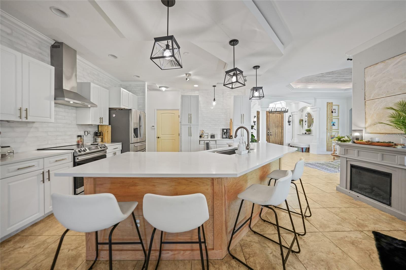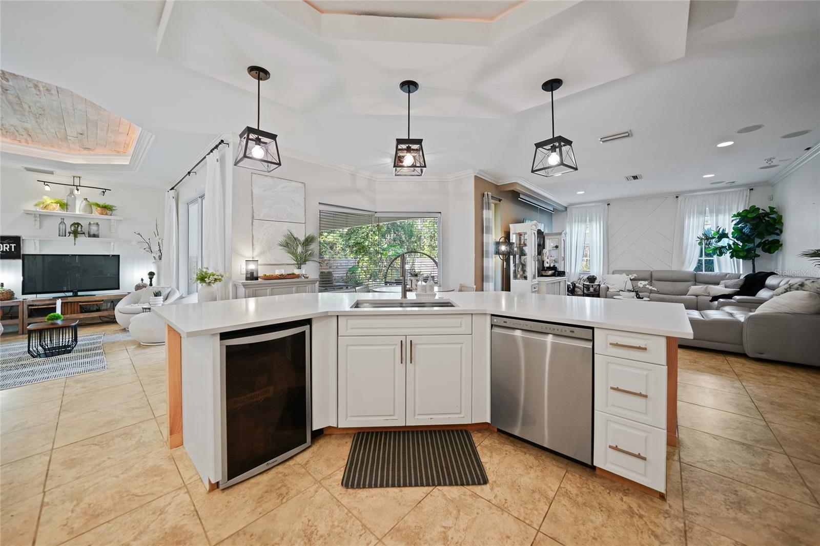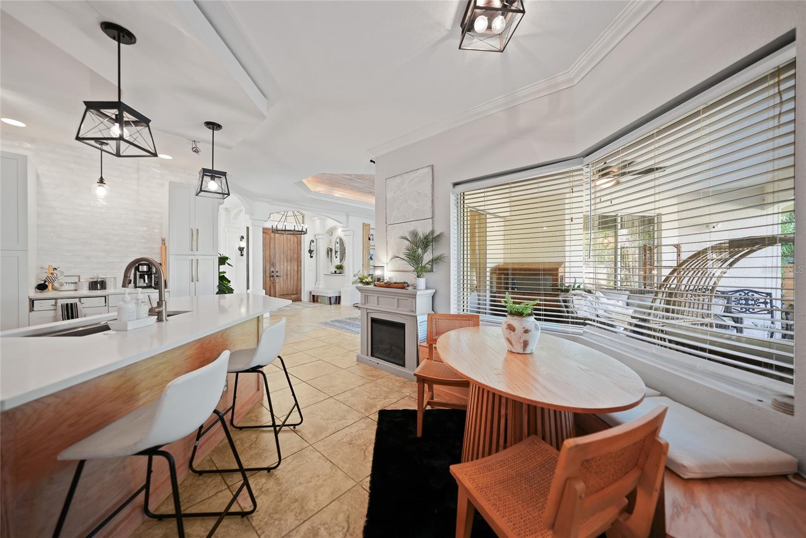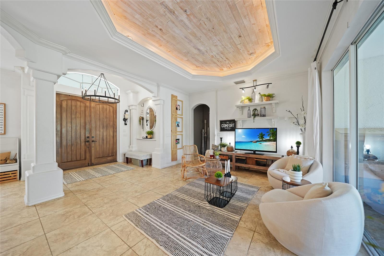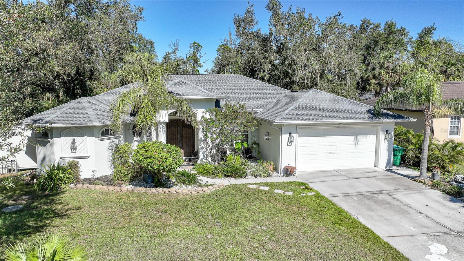 This stunning home captivates from the moment you arrive. The elegant design features a stately columned, brick-paved entryway, complemented by a magnificent solid wood double-door entrance and upgraded exterior lighting with a NEW ROOF as of 2023. Step inside, and the extraordinary details continue to impress. The soaring volume ceiling in the foyer sets the stage, showcasing interior columns, tray ceilings with accent lighting, a dramatic backlit reverse tray ceiling, and a combination of recessed, pendant, and track lighting. Additional architectural touches include a frameless breakfast nook window, pre-wired built-in speakers, built-in nooks, integrated plant shelves, and rounded bull-nose corners—all meticulously crafted for a luxurious feel. A show-stopping glass-enclosed wine cellar adds a modern flair and is perfectly positioned near the gourmet kitchen and dining room for effortless entertaining. The upgraded kitchen is a chef’s dream, complete with stainless steel appliances, quartz countertops, raised-panel cabinetry, and bar seating. The spacious master suite is a retreat of its own, featuring separate his-and-her walk-in closets, a spa-like bathroom with a walk-through double-head shower, a Roman tub, dual sinks, and a private water closet. The guest bathroom has also been renovated to give a more modern feel. Step outside to the brick-paved rear lanai, where lush foliage and a semi-private setting create the perfect backdrop for relaxation or entertaining. Every detail of this home has been thoughtfully designed to leave you in awe. Current owners would consider including furnishings for the right price! Don’t miss the opportunity to experience it for yourself—schedule your private showing today before it’s gone!
