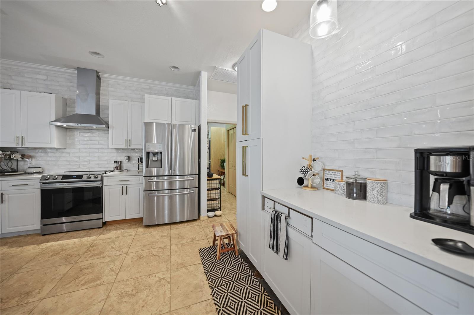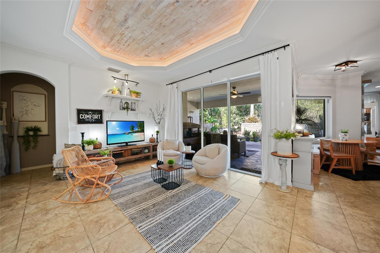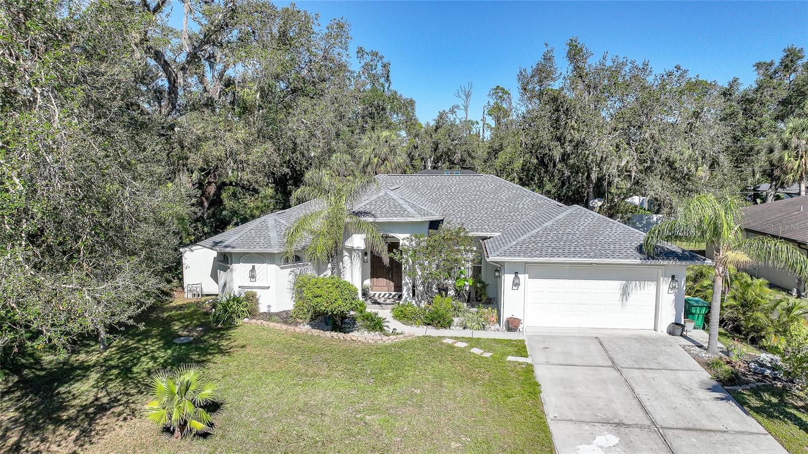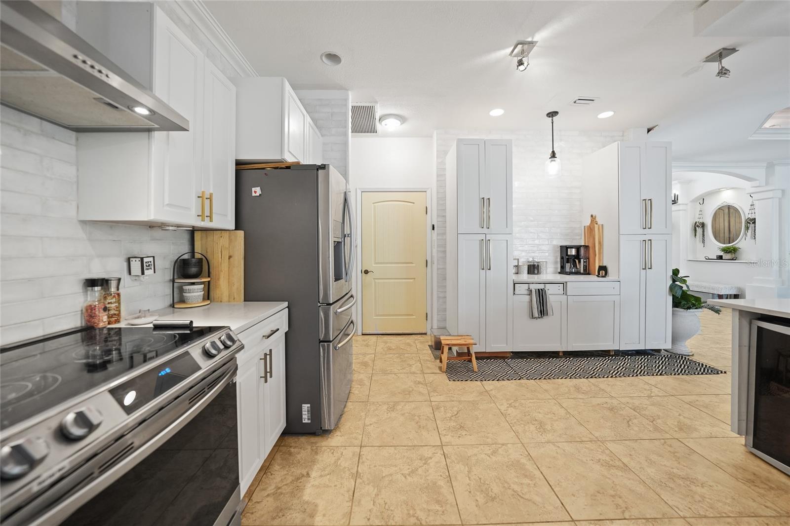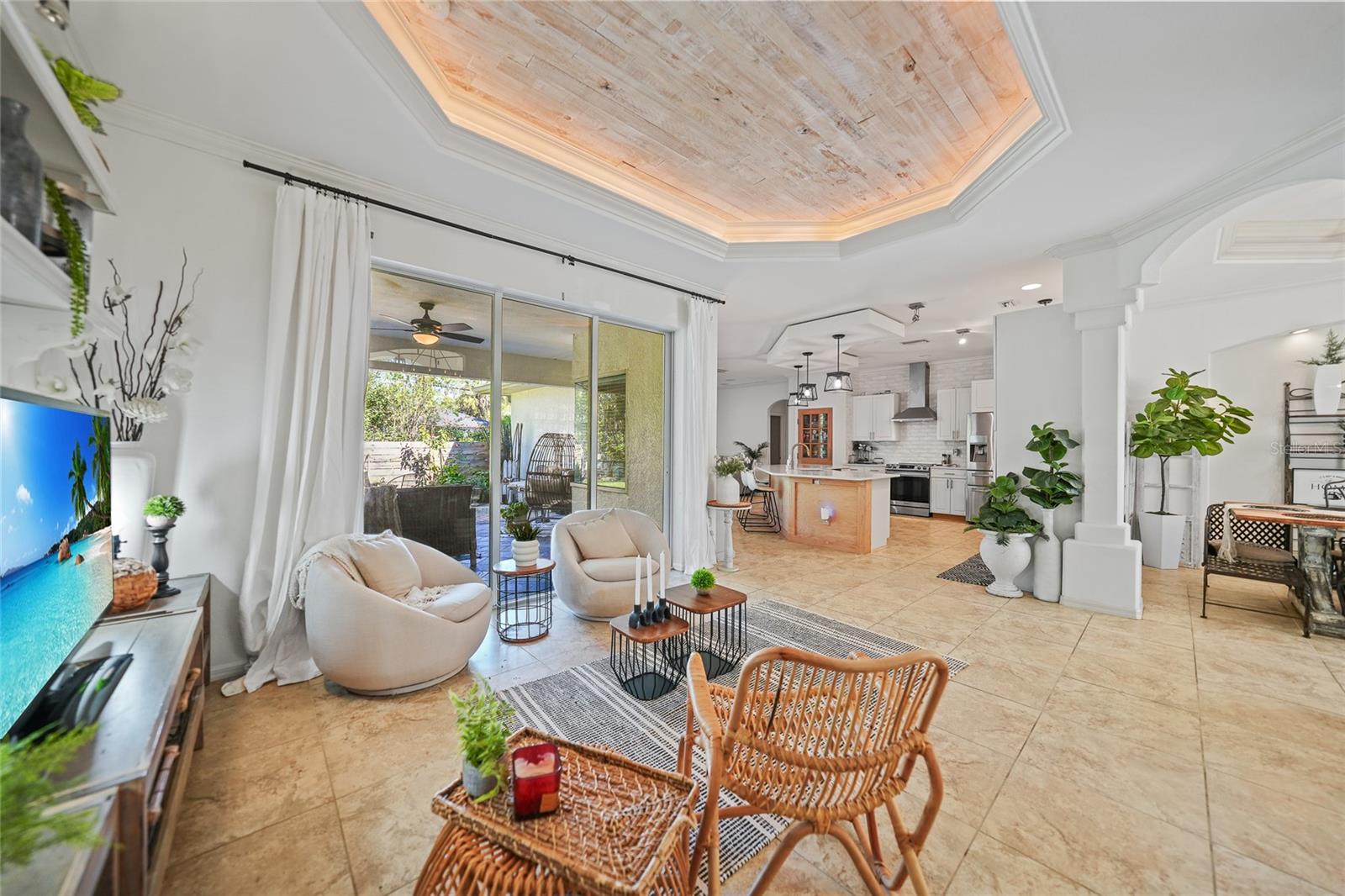 This stunning home captivates from the moment you arrive. The elegant design features a stately columned, brick-paved entryway, complemented by a magnificent solid wood double-door entrance and upgraded exterior lighting with a NEW ROOF as of 2023. Step inside, and the extraordinary details continue to impress. The soaring volume ceiling in the foyer sets the stage, showcasing interior columns, tray ceilings with accent lighting, a dramatic backlit reverse tray ceiling, and a combination of recessed, pendant, and track lighting. Additional architectural touches include a frameless breakfast nook window, pre-wired built-in speakers, built-in nooks, integrated plant shelves, and rounded bull-nose corners—all meticulously crafted for a luxurious feel. A show-stopping glass-enclosed wine cellar adds a modern flair and is perfectly positioned near the gourmet kitchen and dining room for effortless entertaining. The upgraded kitchen is a chef’s dream, complete with stainless steel appliances, quartz countertops, raised-panel cabinetry, and bar seating. The spacious master suite is a retreat of its own, featuring separate his-and-her walk-in closets, a spa-like bathroom with a walk-through double-head shower, a Roman tub, dual sinks, and a private water closet. The guest bathroom has also been renovated to give a more modern feel. Step outside to the brick-paved rear lanai, where lush foliage and a semi-private setting create the perfect backdrop for relaxation or entertaining. Every detail of this home has been thoughtfully designed to leave you in awe. Current owners would consider including furnishings for the right price! Don’t miss the opportunity to experience it for yourself—schedule your private showing today before it’s gone!