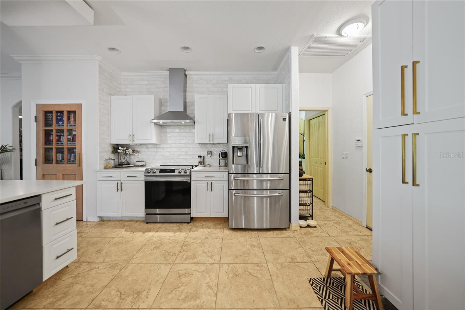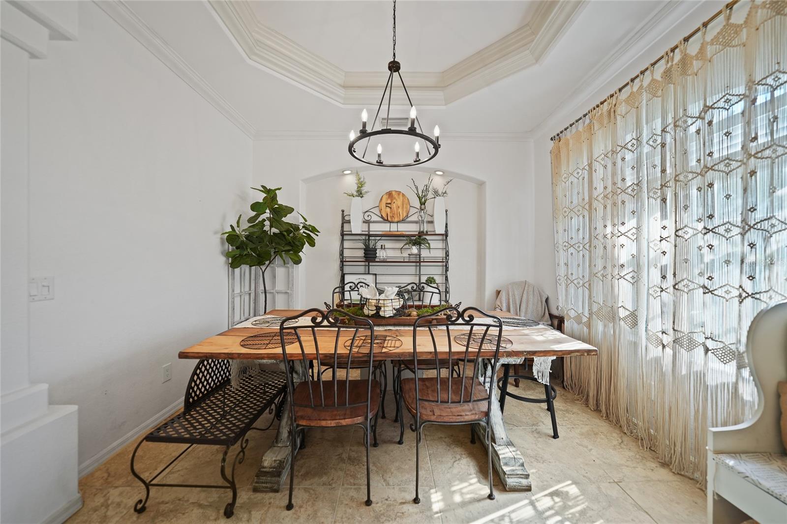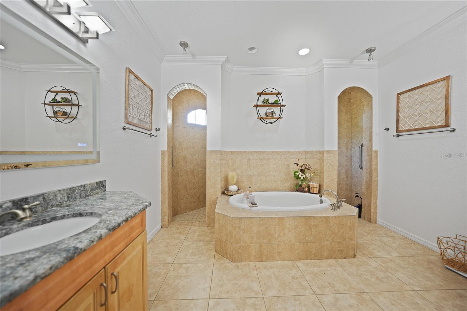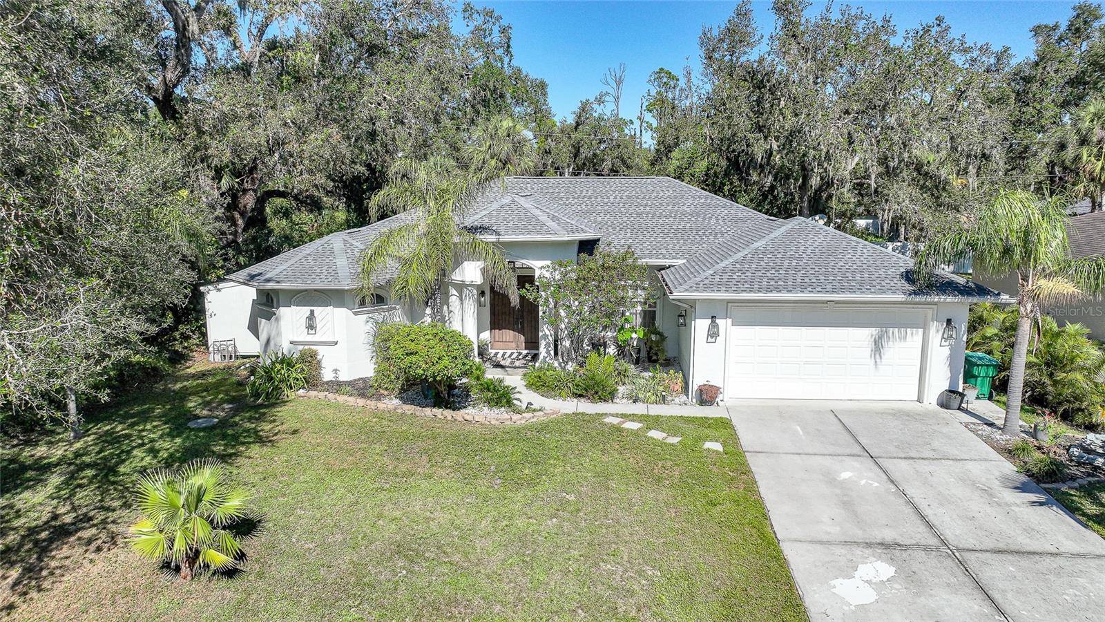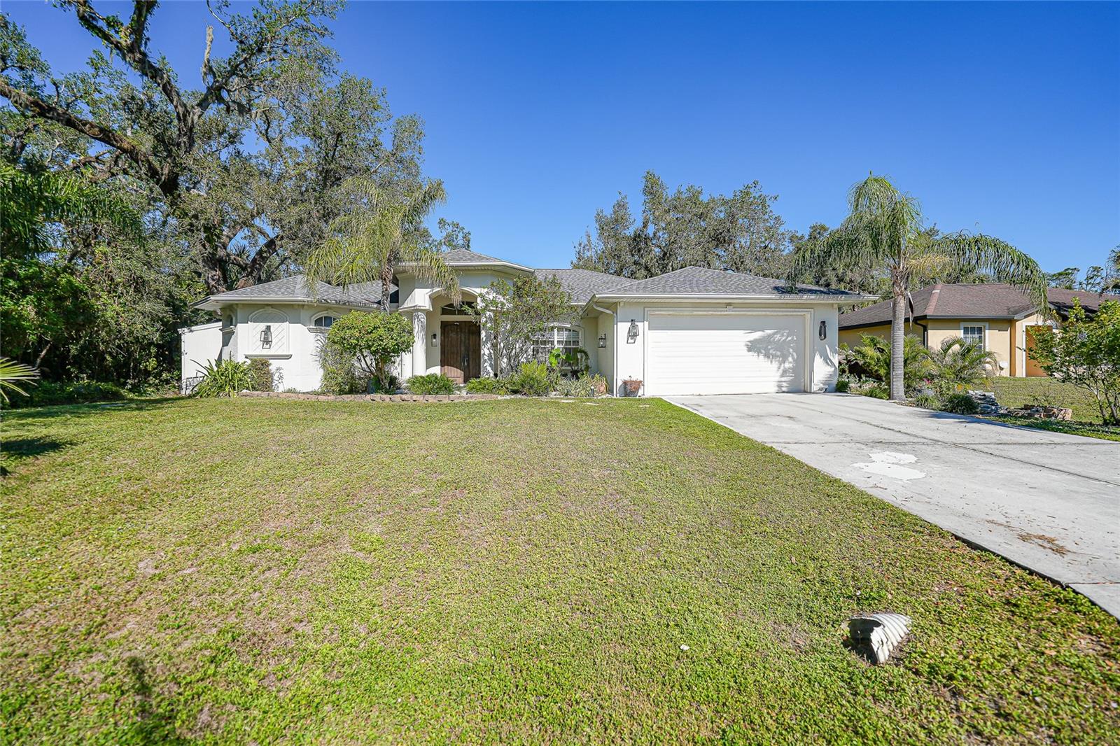 This stunning home captivates from the moment you arrive. The elegant design features a stately columned, brick-paved entryway, complemented by a magnificent solid wood double-door entrance and upgraded exterior lighting with a NEW ROOF as of 2023. Step inside, and the extraordinary details continue to impress. The soaring volume ceiling in the foyer sets the stage, showcasing interior columns, tray ceilings with accent lighting, a dramatic backlit reverse tray ceiling, and a combination of recessed, pendant, and track lighting. Additional architectural touches include a frameless breakfast nook window, pre-wired built-in speakers, built-in nooks, integrated plant shelves, and rounded bull-nose corners—all meticulously crafted for a luxurious feel. A show-stopping glass-enclosed wine cellar adds a modern flair and is perfectly positioned near the gourmet kitchen and dining room for effortless entertaining. The upgraded kitchen is a chef’s dream, complete with stainless steel appliances, quartz countertops, raised-panel cabinetry, and bar seating. The spacious master suite is a retreat of its own, featuring separate his-and-her walk-in closets, a spa-like bathroom with a walk-through double-head shower, a Roman tub, dual sinks, and a private water closet. The guest bathroom has also been renovated to give a more modern feel. Step outside to the brick-paved rear lanai, where lush foliage and a semi-private setting create the perfect backdrop for relaxation or entertaining. Every detail of this home has been thoughtfully designed to leave you in awe. Current owners would consider including furnishings for the right price! Don’t miss the opportunity to experience it for yourself—schedule your private showing today before it’s gone!