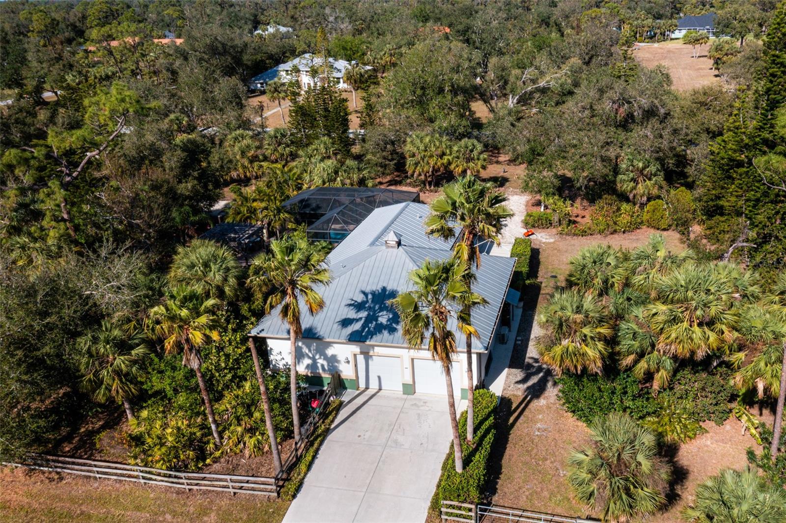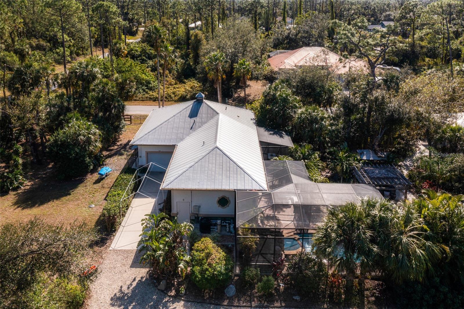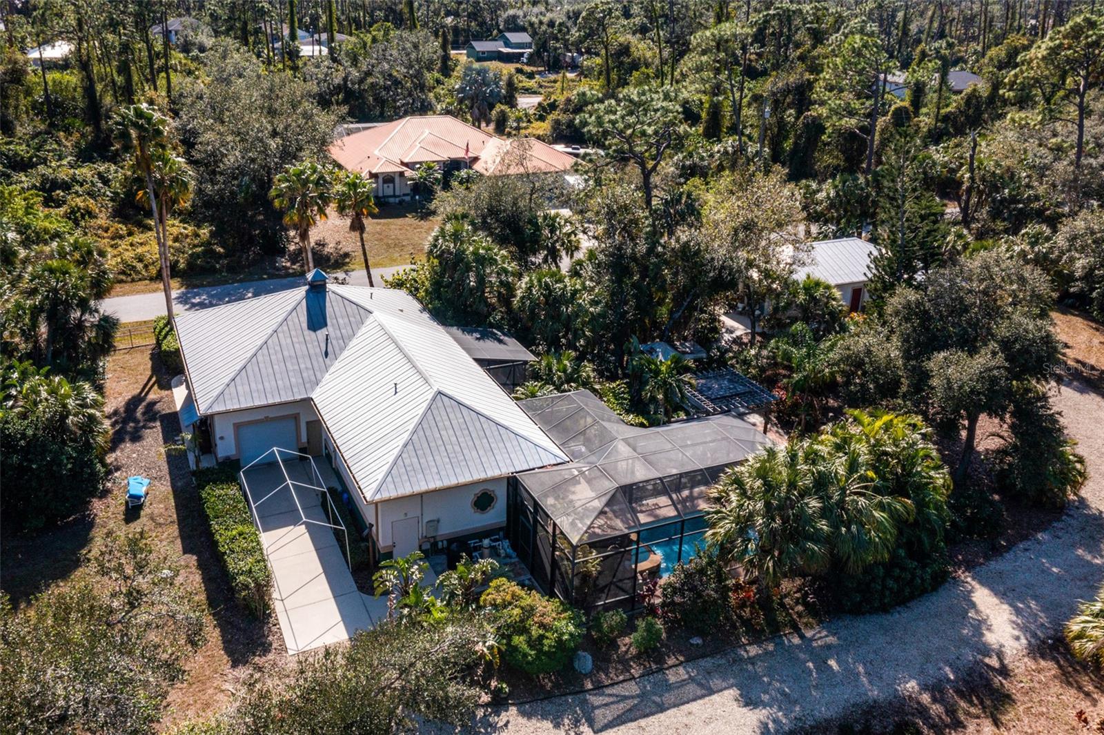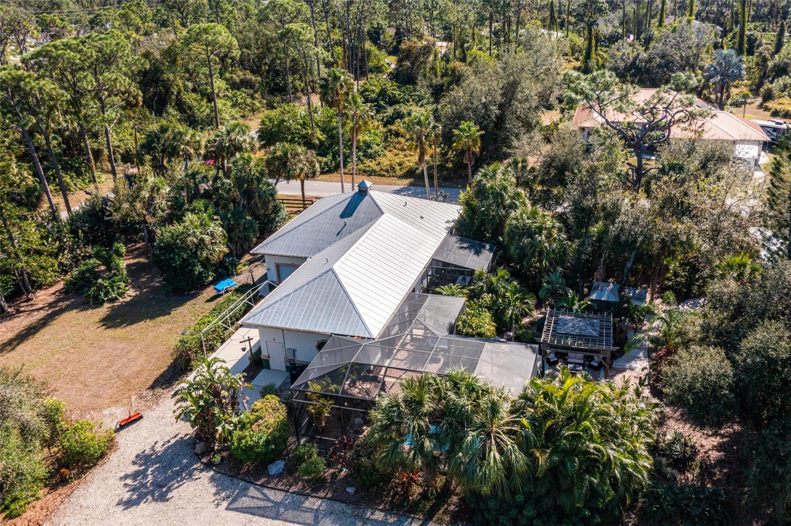 Resort-Style Living on Nearly 2 Acres of Tropical Paradise! Welcome to your private sanctuary, offering the best of luxury and practicality. This custom-built property is surrounded by lush, mature palms and tropical landscaping, fully fenced for security and accessed via a private entry gate. The resort style estate includes a main home with 2 car tandem garage and a separate detached guest apt with 1 car garage perfectly designed for privacy, entertaining, and versatile living. Spacious Design: Open floor plan featuring a living room, dining room, and bright office/den with custom wood cabinetry. • 2 Bedrooms & 2 Baths: • Master suite with lighted tray ceiling, sliders to the pool, custom walk-in closet, and a marble-and-granite bathroom featuring a dual-head walk-in shower, soaking tub, and double vanity. • Split-plan second bedroom with easy access to the second full bathroom. • Gourmet Kitchen: • Thomasville 42” cabinets with pull-out drawers, stainless steel appliances, large pantry, and tube skylight for natural lighting. • High-Quality Features:• 12’ ceilings with crown molding. • Hurricane-impact windows and sliders. • Metal roof, insulated block construction, and underground utilities. • deep artesian well with updated equipment (2020). • Security camera system and exterior lighting. Outdoor Oasis: • Heated Saltwater Pool: Grotto spa, waterfall, and sundeck with pavers, all enclosed within a screened lanai. • Outdoor Kitchen & Bar: • Wood-burning pizza oven, stainless-steel grill, sink, refrigerator, storage, and Dekton countertops. • Herb garden and adjacent custom pergola with lighting and fan. • Additional screened in pavers patio by front entry. Separate Guest Suite/Building (Built in 2014) • 940 sq. ft. of Possibilities: • Living area w/French Doors accessing a private patio, a kitchenette, bedroom, full bathroom including marble shower, wet bar, laundry and garage. • Metal roof, 10’ ceilings, foam insulation, and its own septic and electric meter. • Private entrance, fully air-conditioned perfect for a guests, workshop, office, or recreational space. • Pathways to pool, tiki bar, outdoor kitchen & beautiful grounds. Additional Highlights: • Main Home Garage: Tandem setup, 38 ft in length with a 7,000 lb asymmetric auto lift and separate electric meter and an air-conditioned storage room off garage ideal for your Harley Davidson room. • Extras: • 5HP Dayton commercial compressor. • Car canopy. • Tiki bar, fire pit, windmill, and garden arbor, New A/C installed Nov 2024 with 12 yr transferrable warranty • Parking: Ample space for RVs with electric & water with compressor, boats & trailers. The Rear of property faces South and it backs up to Fallkirk Ave for additional rear parking and rear gate access and the front of the property enters on Elder Ave with private gate access. Convenient Location: • Only 3 miles from major retailers, dining, and Port Charlotte Town Center. • Minutes from medical offices, three hospitals (including a VA Clinic), and I-75. • Located in FEMA Zone X, reducing the need for flood insurance. This property is an entertainer’s dream and a private haven. With no HOA and endless possibilities for both the main home and separate building on nearly 2 private acres of true beloved tropical botanical gardens with birds and butterflies, while living close to nature, it offers a rare combination of resort-style living and practical versatility. Please see the two picture tours linked including floor plans