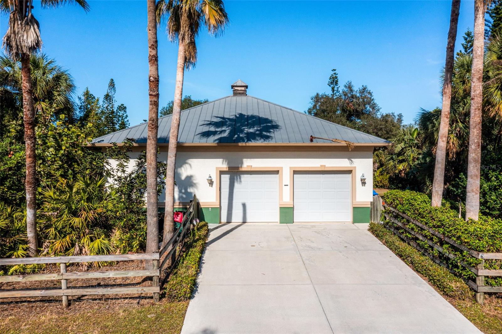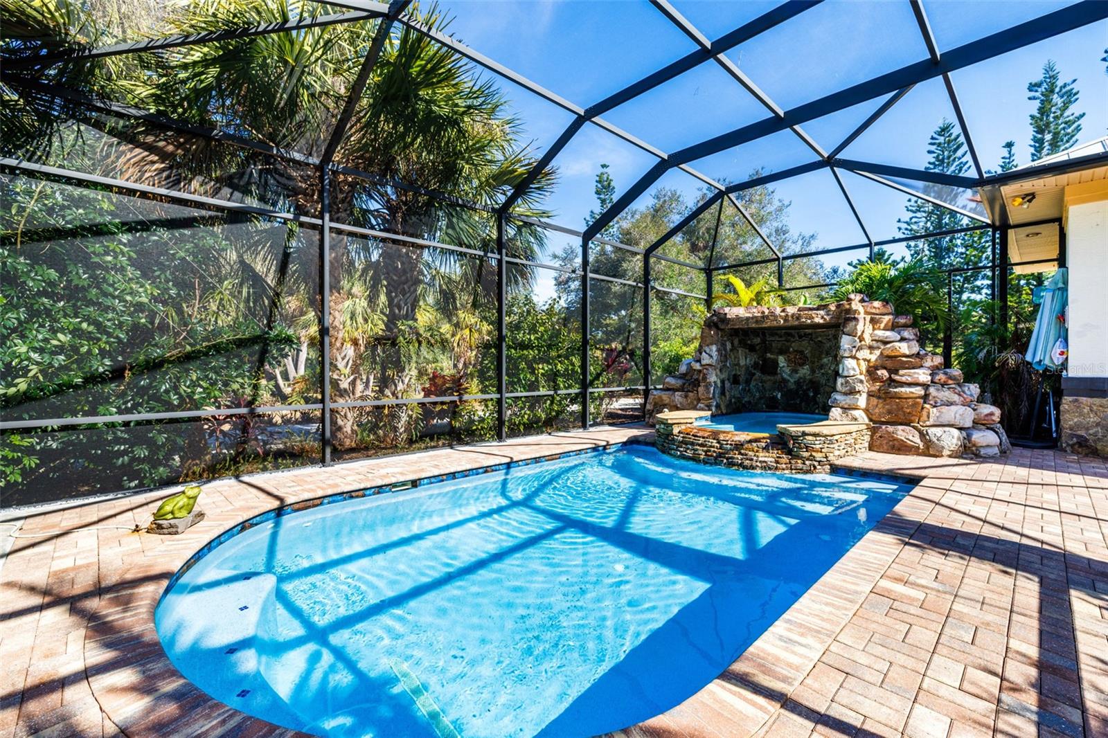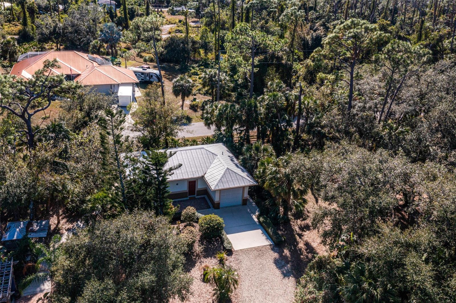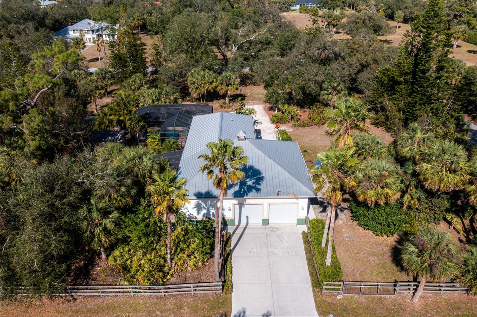 Resort-Style Living on Nearly 2 Acres of Tropical Paradise! Welcome to your private sanctuary, offering the best of luxury and practicality. This custom-built property is surrounded by lush, mature palms and tropical landscaping, fully fenced for security and accessed via a private entry gate. The resort style estate includes a main home with 2 car tandem garage and a separate detached guest apt with 1 car garage perfectly designed for privacy, entertaining, and versatile living. Spacious Design: Open floor plan featuring a living room, dining room, and bright office/den with custom wood cabinetry. • 2 Bedrooms & 2 Baths: • Master suite with lighted tray ceiling, sliders to the pool, custom walk-in closet, and a marble-and-granite bathroom featuring a dual-head walk-in shower, soaking tub, and double vanity. • Split-plan second bedroom with easy access to the second full bathroom. • Gourmet Kitchen: • Thomasville 42” cabinets with pull-out drawers, stainless steel appliances, large pantry, and tube skylight for natural lighting. • High-Quality Features:• 12’ ceilings with crown molding. • Hurricane-impact windows and sliders. • Metal roof, insulated block construction, and underground utilities. • deep artesian well with updated equipment (2020). • Security camera system and exterior lighting. Outdoor Oasis: • Heated Saltwater Pool: Grotto spa, waterfall, and sundeck with pavers, all enclosed within a screened lanai. • Outdoor Kitchen & Bar: • Wood-burning pizza oven, stainless-steel grill, sink, refrigerator, storage, and Dekton countertops. • Herb garden and adjacent custom pergola with lighting and fan. • Additional screened in pavers patio by front entry. Separate Guest Suite/Building (Built in 2014) • 940 sq. ft. of Possibilities: • Living area w/French Doors accessing a private patio, a kitchenette, bedroom, full bathroom including marble shower, wet bar, laundry and garage. • Metal roof, 10’ ceilings, foam insulation, and its own septic and electric meter. • Private entrance, fully air-conditioned perfect for a guests, workshop, office, or recreational space. • Pathways to pool, tiki bar, outdoor kitchen & beautiful grounds. Additional Highlights: • Main Home Garage: Tandem setup, 38 ft in length with a 7,000 lb asymmetric auto lift and separate electric meter and an air-conditioned storage room off garage ideal for your Harley Davidson room. • Extras: • 5HP Dayton commercial compressor. • Car canopy. • Tiki bar, fire pit, windmill, and garden arbor, New A/C installed Nov 2024 with 12 yr transferrable warranty • Parking: Ample space for RVs with electric & water with compressor, boats & trailers. The Rear of property faces South and it backs up to Fallkirk Ave for additional rear parking and rear gate access and the front of the property enters on Elder Ave with private gate access. Convenient Location: • Only 3 miles from major retailers, dining, and Port Charlotte Town Center. • Minutes from medical offices, three hospitals (including a VA Clinic), and I-75. • Located in FEMA Zone X, reducing the need for flood insurance. This property is an entertainer’s dream and a private haven. With no HOA and endless possibilities for both the main home and separate building on nearly 2 private acres of true beloved tropical botanical gardens with birds and butterflies, while living close to nature, it offers a rare combination of resort-style living and practical versatility. Please see the two picture tours linked including floor plans