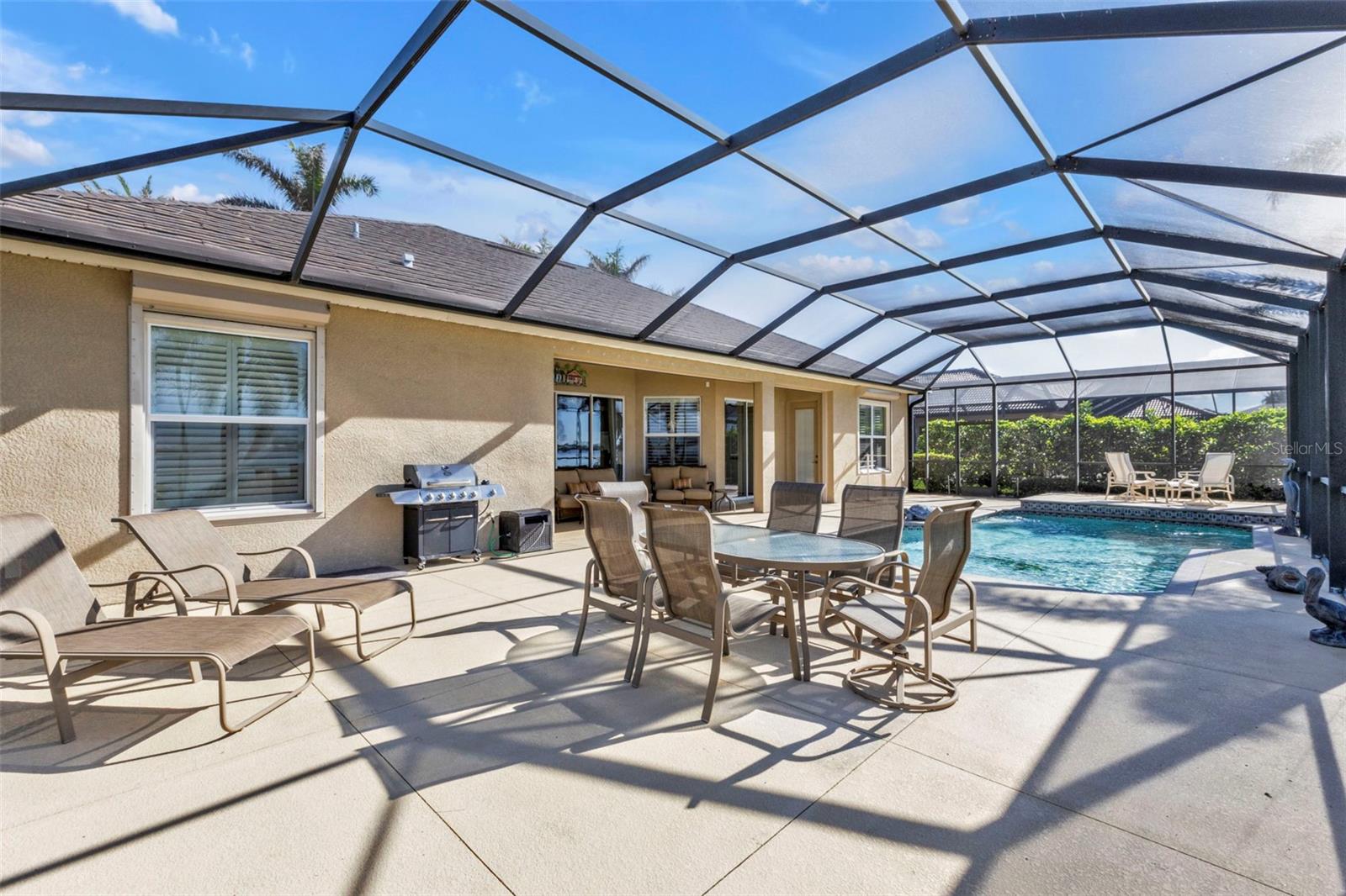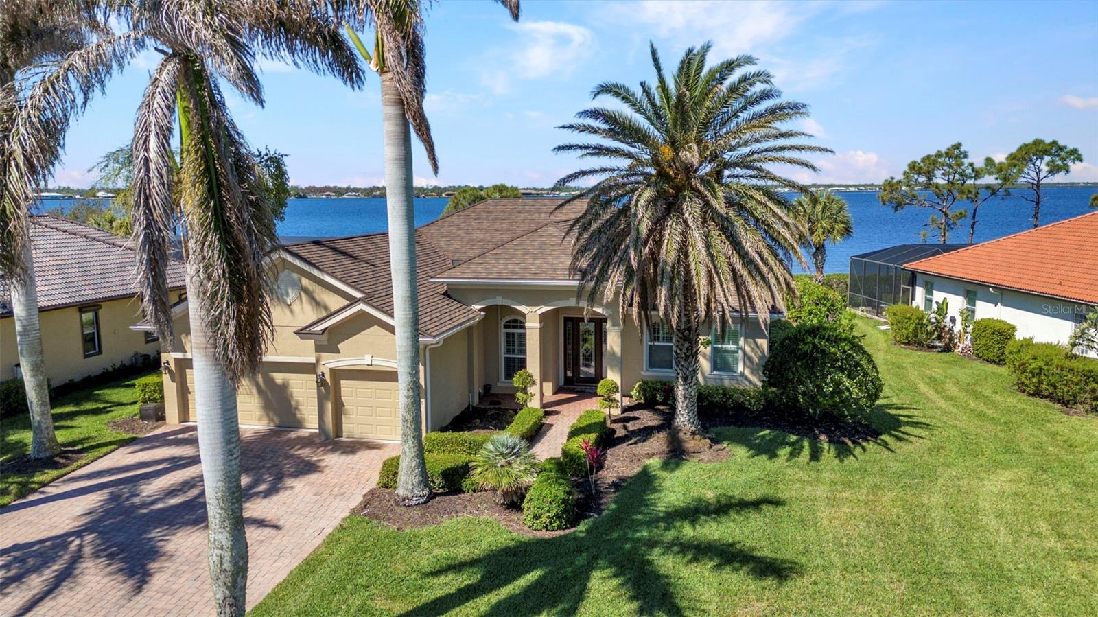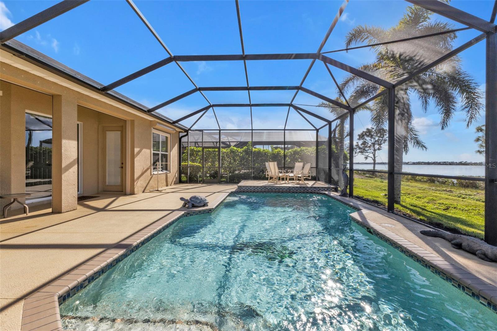 Breathtaking views of the Myakka River in this stunning 3 bed, 3 bath + office/den Sussex model home. As you enter through the grand entryway, you'll be impressed by the open and spacious living area, complete with soaring 10ft ceilings, exquisite crown molding, and gorgeous hardwood flooring complemented by large ceramic tile cut on the diagonal. The office/den, conveniently connected to one of the guest rooms, is perfect for remote work or relaxation. The impressive kitchen, open to the living room, boasts a breakfast bar, granite countertops, solid wood cabinets with under-counter lighting, a large pantry, and stainless-steel appliances, providing the perfect setting for culinary adventures. Enjoy your morning coffee while taking in the lovely water views at the kitchen dining nook, or entertain your guests in the elegant formal dining room with a tray ceiling. The primary suite is a true oasis, with private access to the lanai, tray ceiling, a large walk-in closet, and a luxurious bathroom featuring dual sinks with vanity, a large walk-in tiled shower, and a garden tub. The second guest room is conveniently located near the third full bathroom, which provides easy access to the lanai and pool. With the telescoping glass doors, the living room seamlessly flows into the outdoor living space, where you can relax, entertain guests, and take in the stunning views of the Myakka River. The oversized lanai is the perfect place to entertain guests and take a dip in the sparkling heated salt-water pool with tile detailing. Plenty of space for your cars and toys in the coveted 3-car garage. Additional features include roll-down hurricane shutters and full laundry with storage and a sink. The vibrant community of Riverwood features a highly acclaimed par 72 championship golf course, a new state-of-the-art fitness center, a resort-style pool with lap lanes, a walk-in shallow end, and a separate hot tub. Pickleball is all the rage, and Riverwood boasts six brand new courts, along with Six Har Tru tennis courts. World-class fishing, boating, dining, and shopping are just minutes away. Conveniently located between Sarasota and Ft. Myers on Florida's West Coast. Don't miss out on this opportunity to make this your dream home!