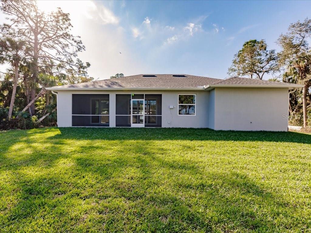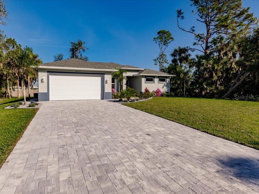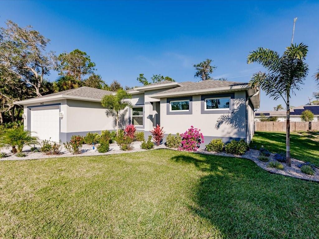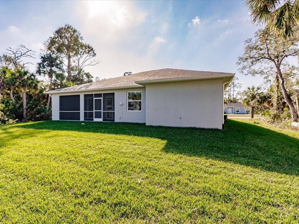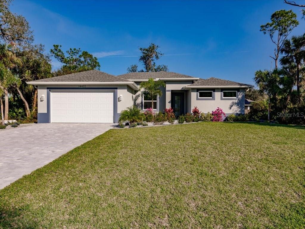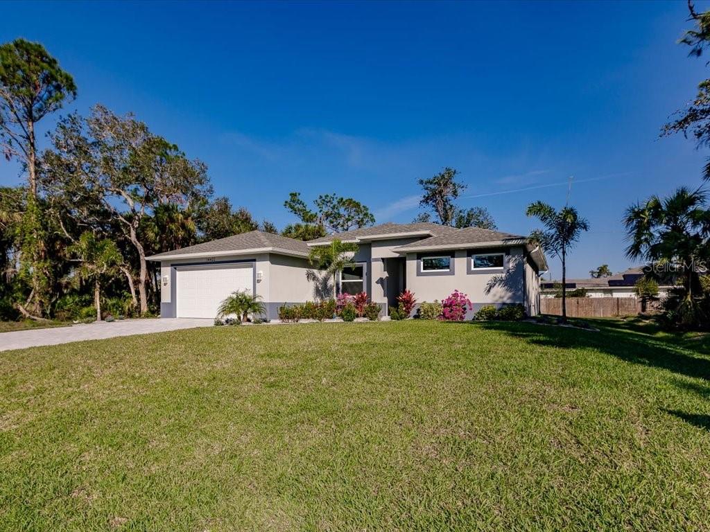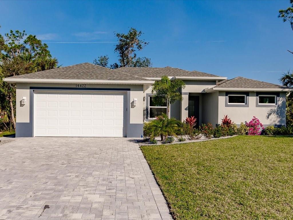 BRAND NEW, MOVE-IN-READY HOME WITH MANY UPGRADES, NOT YOUR STANDARD HOME - MUST SEE! At the end of Chamberlain in a very quiet area. Not in a flood zone and on public water. This home offers 3 bedrooms, 2 bathrooms, a study/den, and an oversized 2 car garage. This stunning residence boasts contemporary design elements throughout, featuring spacious living areas flooded with natural light, an Island kitchen with beautiful granite countertops, 42" upper custom cabinets with soft close doors, a slide-in convection range with built-in range hood and stainless steel appliances. Exquisite large floor tile throughout with the exception of the two guest bedrooms which have carpet. The spacious screened lanai with pavers overlooks the large backyard which is partially fenced and perfect for entertaining. Extra special features include 9.4 tray ceilings, St. Augustine sod and an irrigation system to keep it looking green and plush. Insulated windows and doors. Added bonus, all windows are trimmed out. This home has close proximity to Aldi's, Publix, Walmart, Restaurants and the Coco Plum Plaza. Only 16 miles to Englewood Beach. Don't miss out on this fantastic home - schedule a tour today!
