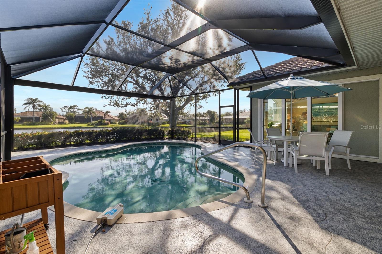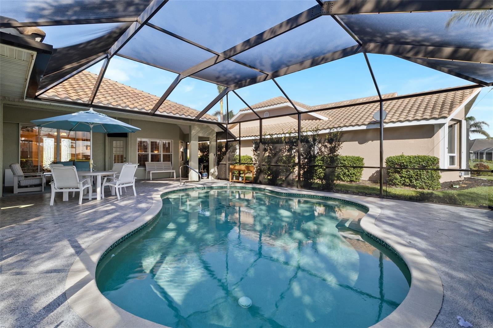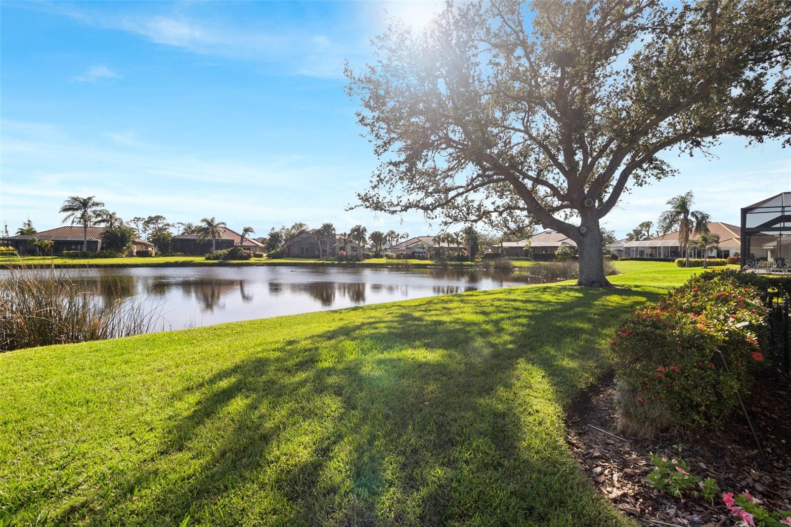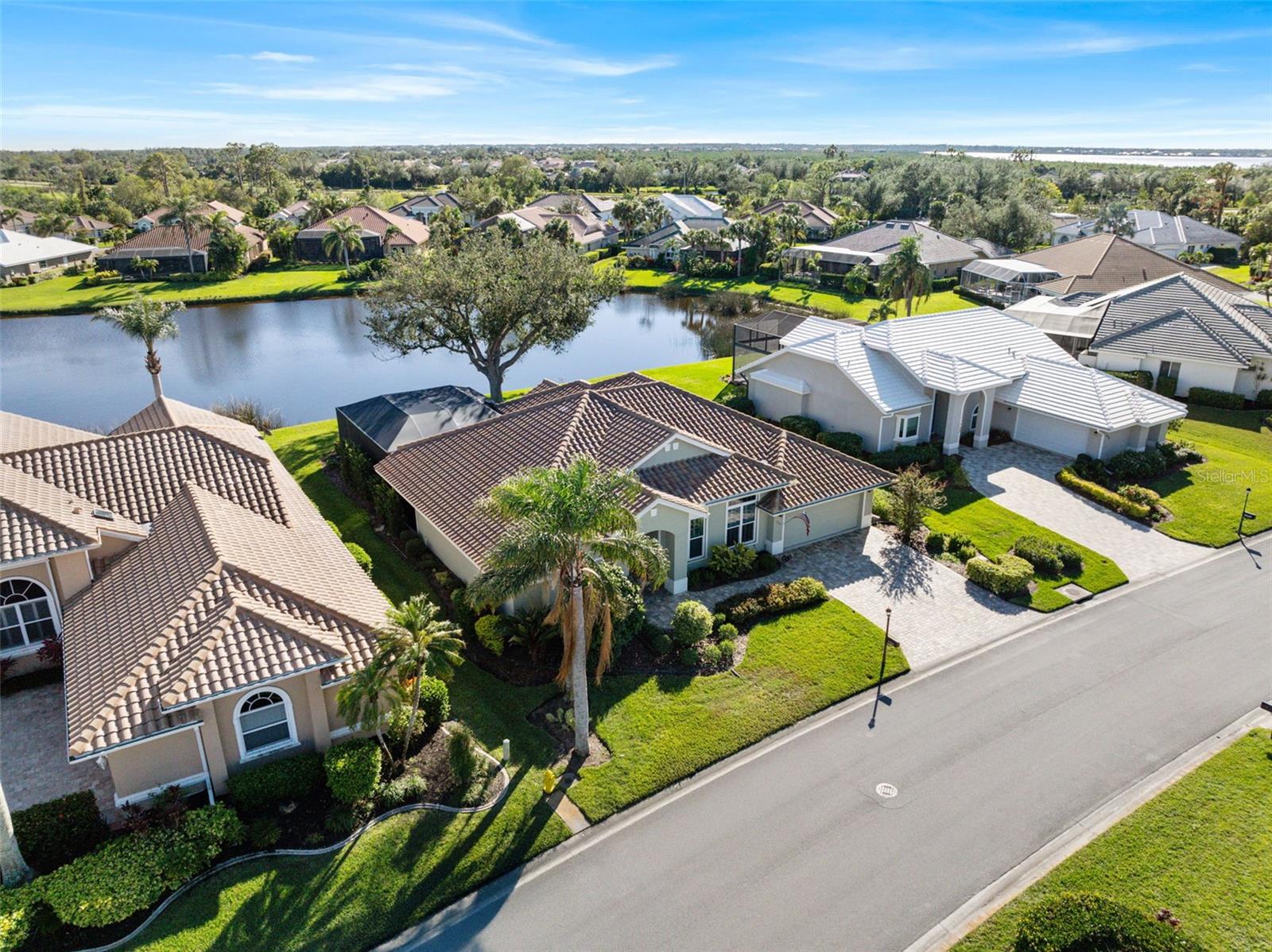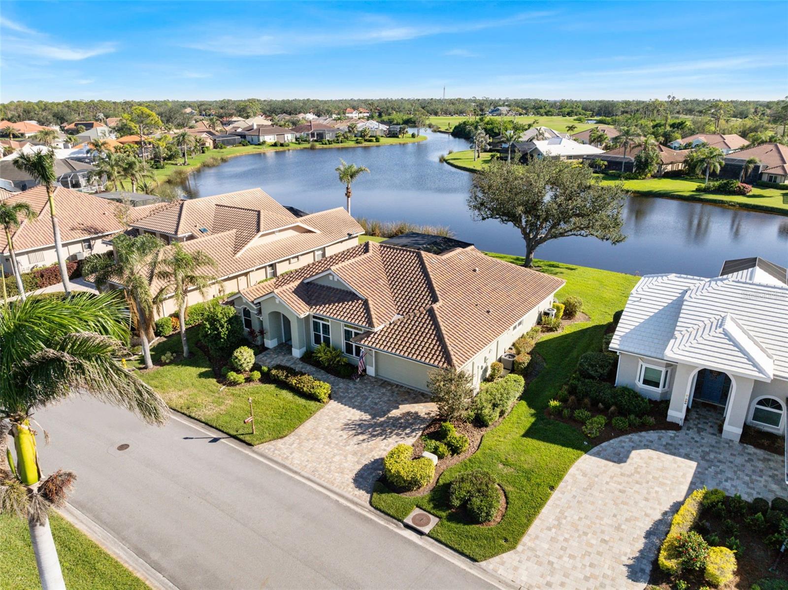3 Bedrooms | 2 Bathrooms | 2-Car Garage | 2 Flex Rooms Indulge in a lakeside lifestyle with this stunning home nestled within the highly sought-after, resort-style, gated community of Riverwood. It features panoramic views of tranquil Long Lake from nearly every room. The home has been thoughtfully upgraded with a new roof, hurricane windows, pool cage and paver driveway. Upon entering, you are treated to a decorator-designed formal living room and dining room, perfect for entertaining. Beyond, you enter a chef’s kitchen, which is both functional and elegant. It features a granite island, an induction stovetop, stainless steel appliances, travertine flooring and abundant cabinetry. The spacious kitchen opens up to a cozy family room. Two additional bedrooms are located off of the family room as well as a second bath with a shower. The bedrooms are spacious, carpeted and have high ceilings. Two additional flex rooms can be used as offices or hobby rooms. The large master bedroom suite features a tray ceiling,two- walk-in closets and an upgraded bathroom with a spa-like soaking tub. All rooms have either plantation shutters or Hunter Douglass window treatments. The screened lanai can be accessed from the master bedroom, living room, kitchen or family room and has a heated pool. Sliding doors can be opened from the living room, kitchen and family room to allow for seamless entertaining from indoors to the beautiful outdoor pool and outdoor kitchen grilling area. Beyond the home the owner can enjoy the many features of Riverwood, including a large well equipped gym, exercise classes, pickleball and tennis courts, dog park, meeting rooms and more. Additionally, residents can choose to join the renowned Riverwood Golf Club and the beach club.