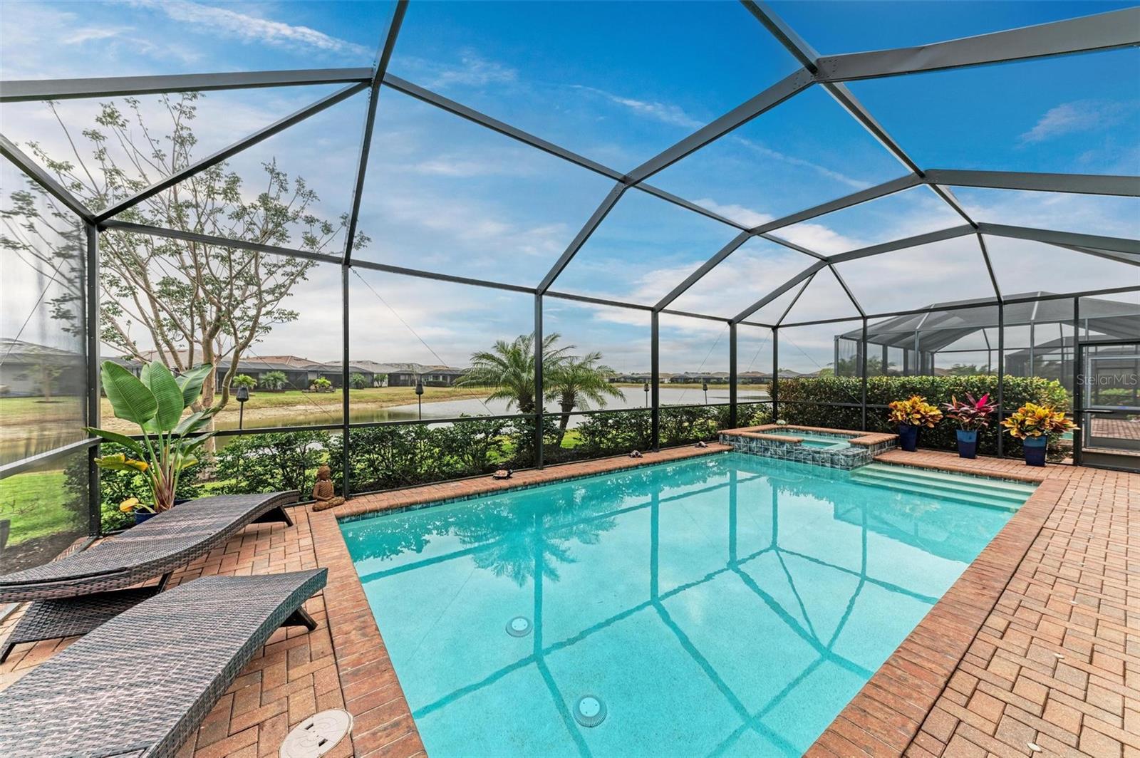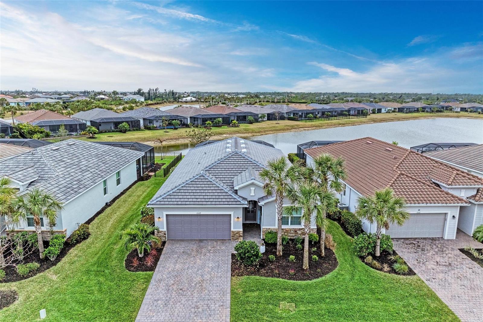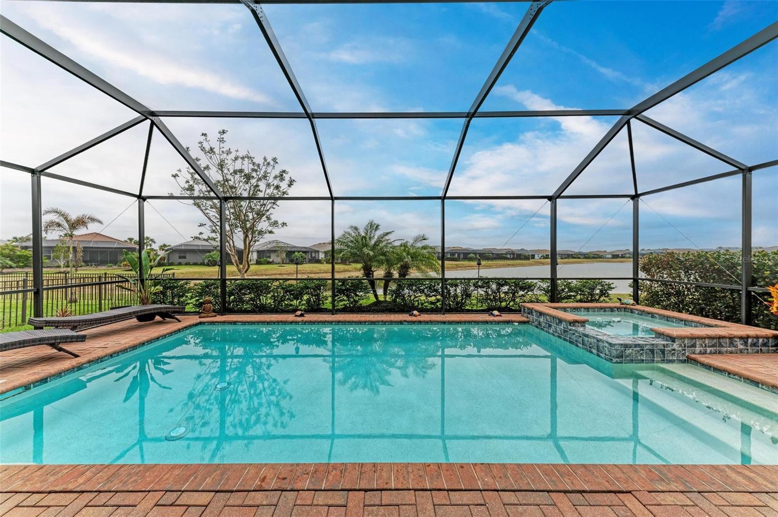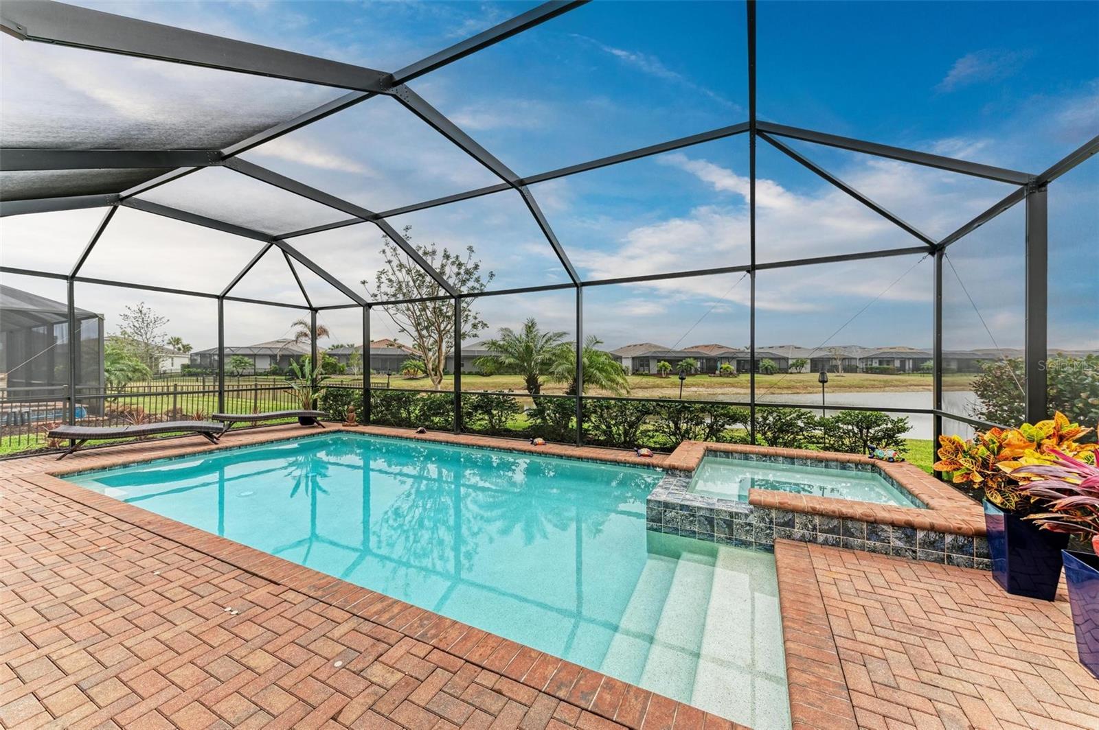 Welcome to your dream home in the exclusive Harbor West community! This beautifully appointed single-family home offers over 2,200 square feet of thoughtfully designed living space, combining comfort, luxury, and functionality in every detail. Step inside to find coffered ceilings, elegant finishes, and a spacious open layout that checks all the boxes. The home features 3 bedrooms and 3 full bathrooms, including a private guest suite with its own ensuite bath, ideal for visitors or multigenerational living. The expansive den offers flexible space for a home office, media room, or extra lounge area. Bedrooms offer generous walk-in closets, providing ample storage throughout the home. At the heart of the home, the stunning kitchen impresses with granite countertops, abundant cabinetry, and a layout perfect for everyday living and entertaining. The seamless indoor-outdoor flow leads to a large paver patio and pool deck, where you’ll find a heated saltwater pool and hot tub, ideal for relaxing or hosting gatherings. Enjoy breathtaking lake views and sunsets from your backyard oasis, creating the perfect setting for outdoor entertaining or peaceful evenings at home. Built in 2021, this home blends modern construction with timeless style to include a new tile roof and hurricane windows. Located in a gated community, you'll enjoy peace of mind along with the beauty and serenity of lakeside living. This home truly has it all—schedule your private showing today and discover why Harbor West is one of the area's most desirable communities!
