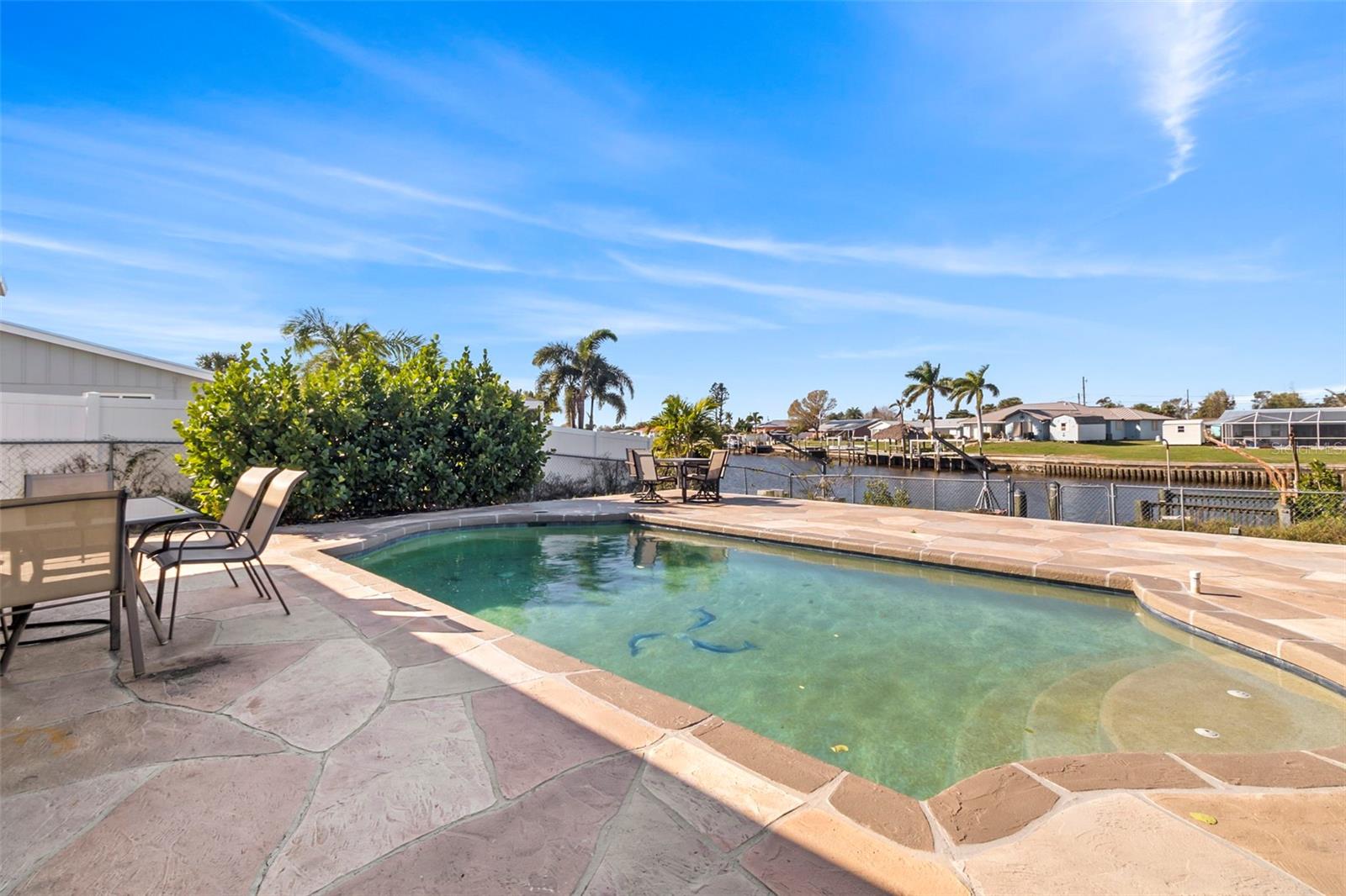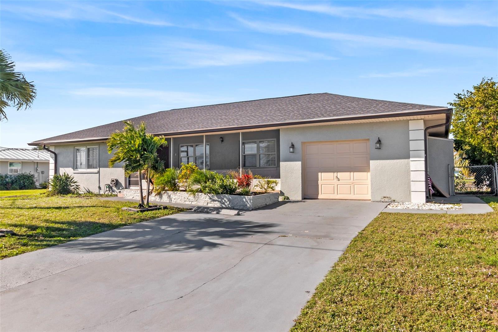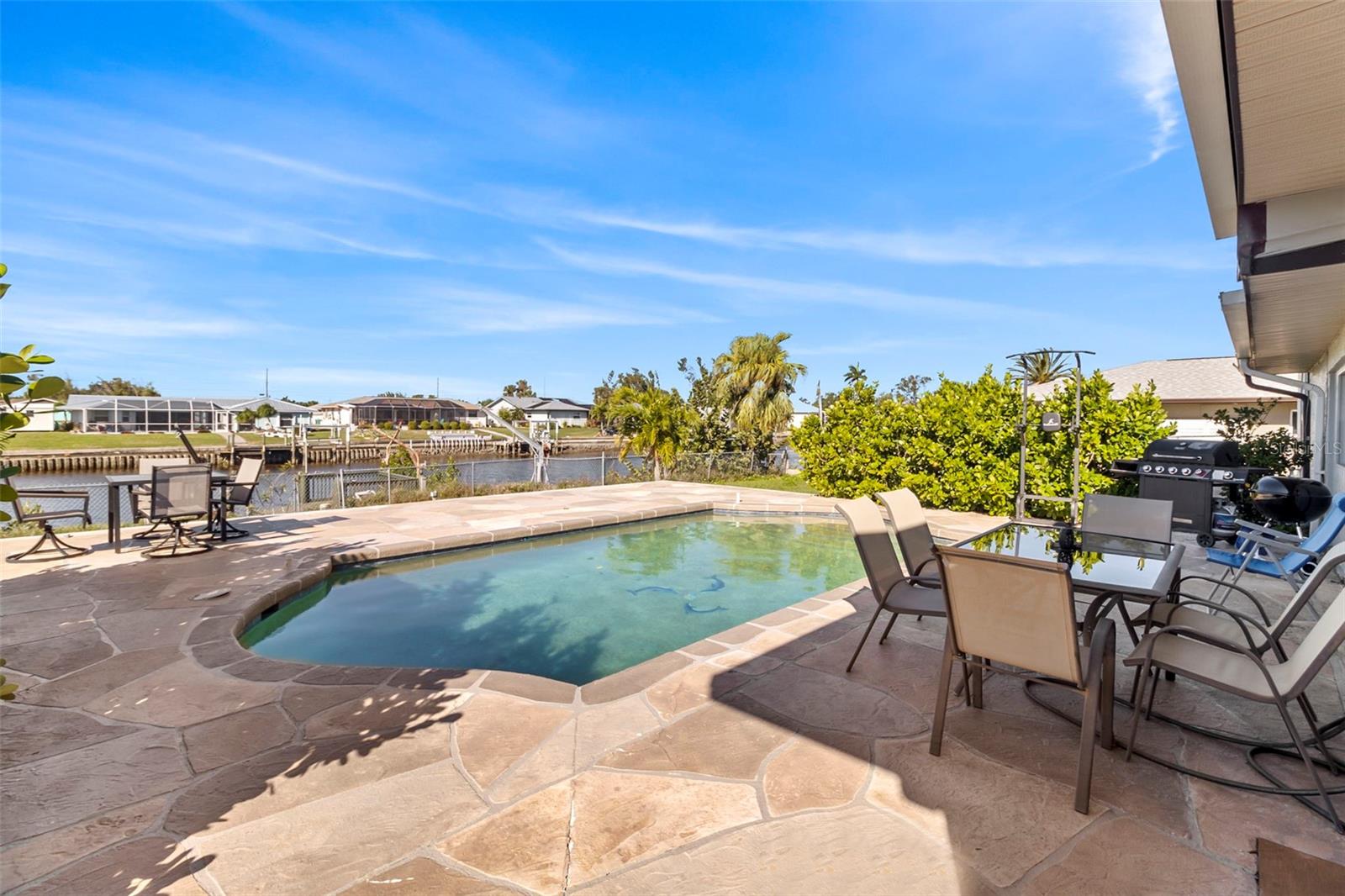 Discover your very own tropical retreat with this captivating 3-bedroom, 3-bath waterfront pool home in sought-after Port Charlotte Section 10—where every day feels like a vacation! Perfectly positioned on a deep-water canal with 80 feet of saltwater frontage, this boater’s paradise offers direct Gulf access with just one fixed bridge (approx. 11+ ft clearance), making it ideal for fishing, cruising, or sunset sails. Step inside to find an open, airy layout featuring stylish tile flooring throughout, a chef’s kitchen with granite countertops and wood cabinetry, and a light-filled family room with French doors that invite you to the expansive screened lanai and a sparkling 14x28 ft pool—your private oasis for entertaining or unwinding. The spacious master suite offers peaceful water views, a walk-in shower, and ample closet space, while two additional bedrooms and bathrooms provide room for family or guests. Enjoy the Florida lifestyle with your own dock equipped with electric and a lift, plus a fenced backyard adorned with mature landscaping and fruit trees. Recent upgrades include a brand-new roof and floor tiles, and there’s no HOA or CDD to worry about. With a 3-car garage, proximity to beaches, golf courses, and spring training stadiums, plus zoning that allows for flexible use, this home is a rare blend of charm, convenience, and coastal living. Whether you're seeking a serene personal haven or an investment with vacation rental potential—this home has it all!
