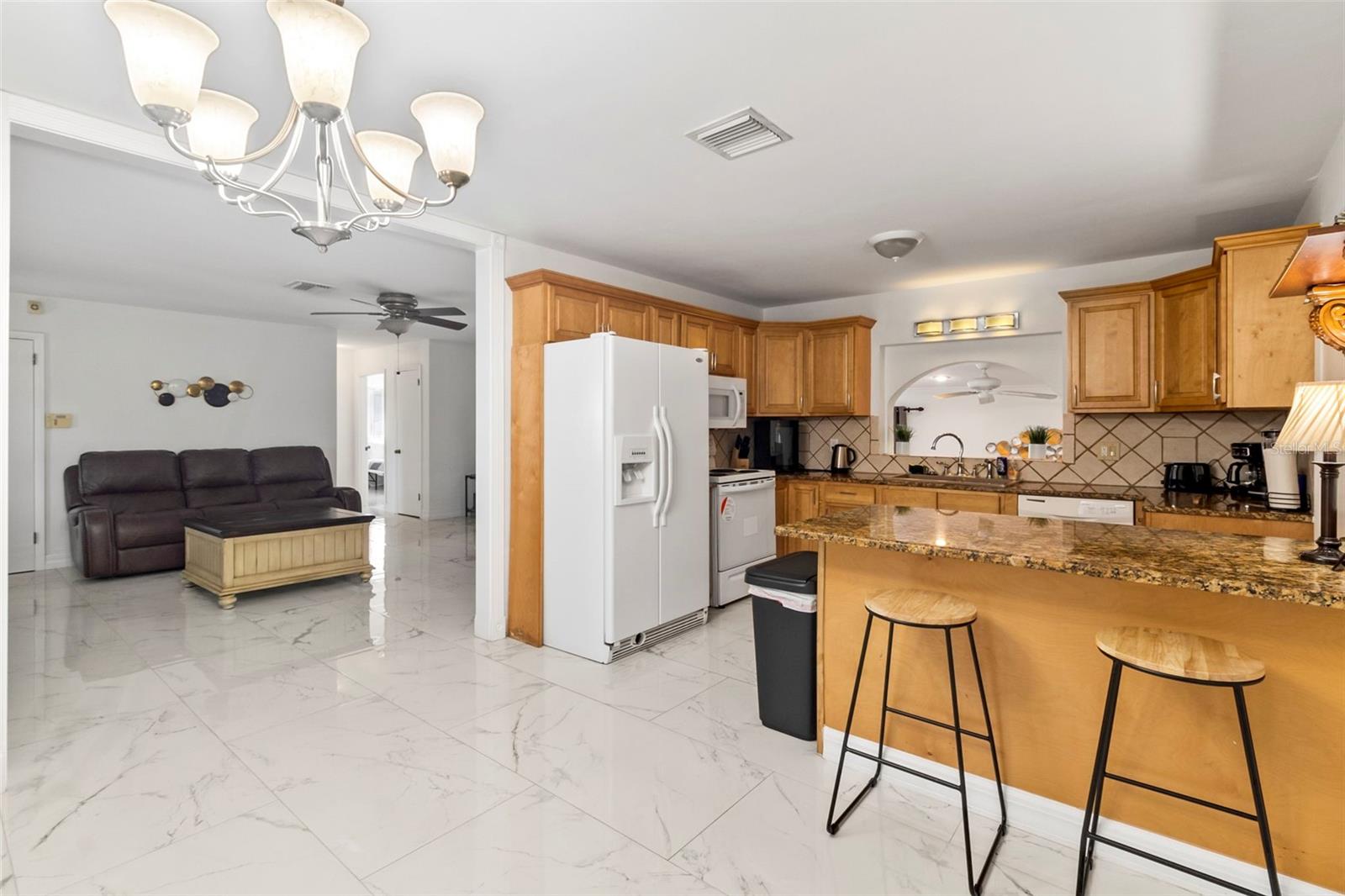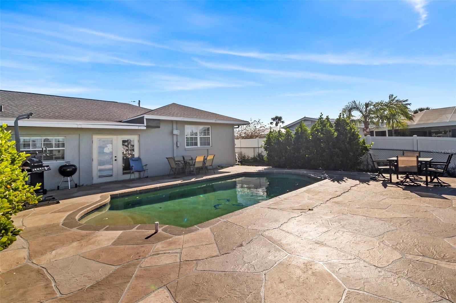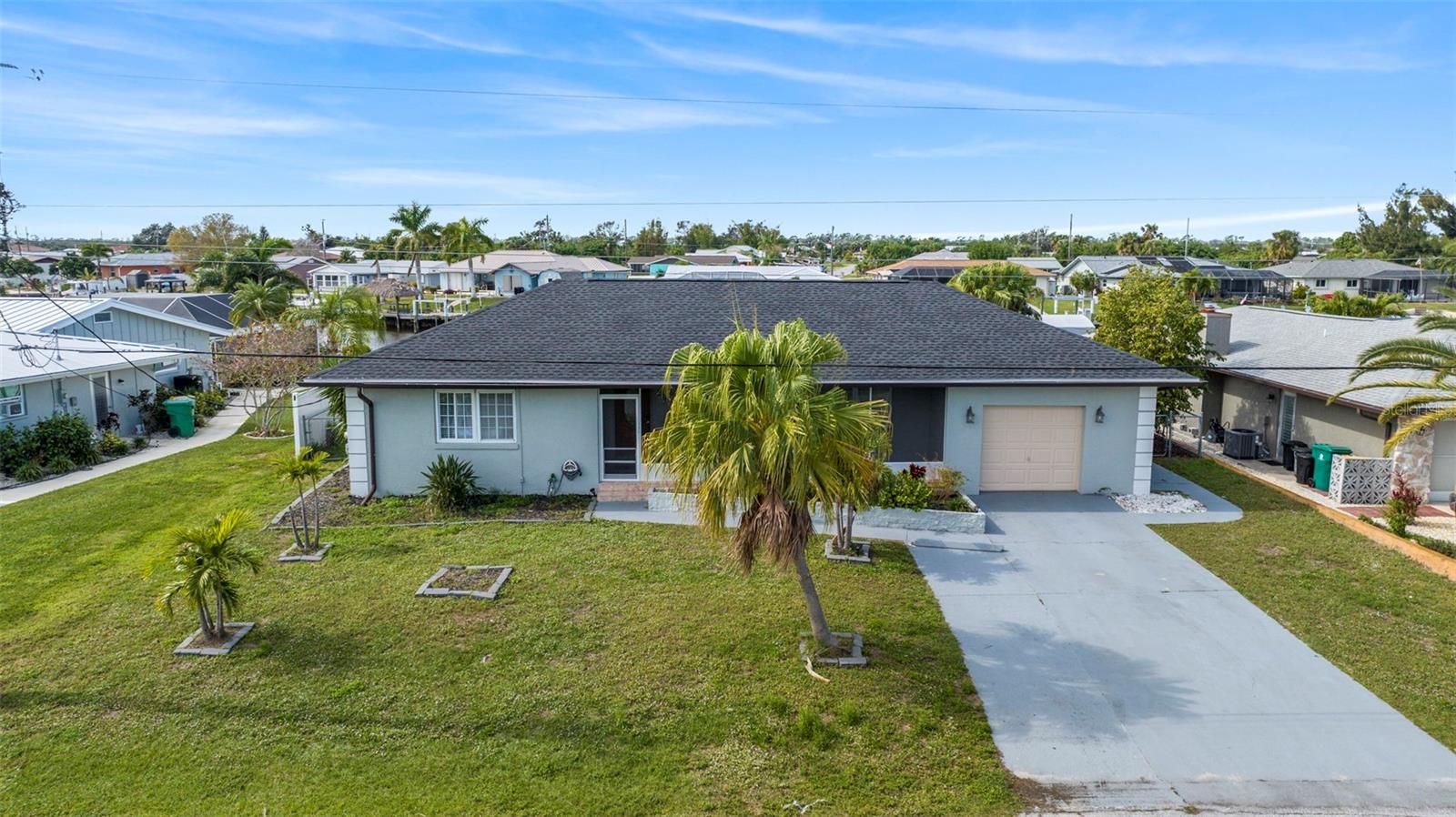 Discover your very own tropical retreat with this captivating 3-bedroom, 3-bath waterfront pool home in sought-after Port Charlotte Section 10—where every day feels like a vacation! Perfectly positioned on a deep-water canal with 80 feet of saltwater frontage, this boater’s paradise offers direct Gulf access with just one fixed bridge (approx. 11+ ft clearance), making it ideal for fishing, cruising, or sunset sails. Step inside to find an open, airy layout featuring stylish tile flooring throughout, a chef’s kitchen with granite countertops and wood cabinetry, and a light-filled family room with French doors that invite you to the expansive screened lanai and a sparkling 14x28 ft pool—your private oasis for entertaining or unwinding. The spacious master suite offers peaceful water views, a walk-in shower, and ample closet space, while two additional bedrooms and bathrooms provide room for family or guests. Enjoy the Florida lifestyle with your own dock equipped with electric and a lift, plus a fenced backyard adorned with mature landscaping and fruit trees. Recent upgrades include a brand-new roof and floor tiles, and there’s no HOA or CDD to worry about. With a 3-car garage, proximity to beaches, golf courses, and spring training stadiums, plus zoning that allows for flexible use, this home is a rare blend of charm, convenience, and coastal living. Whether you're seeking a serene personal haven or an investment with vacation rental potential—this home has it all!