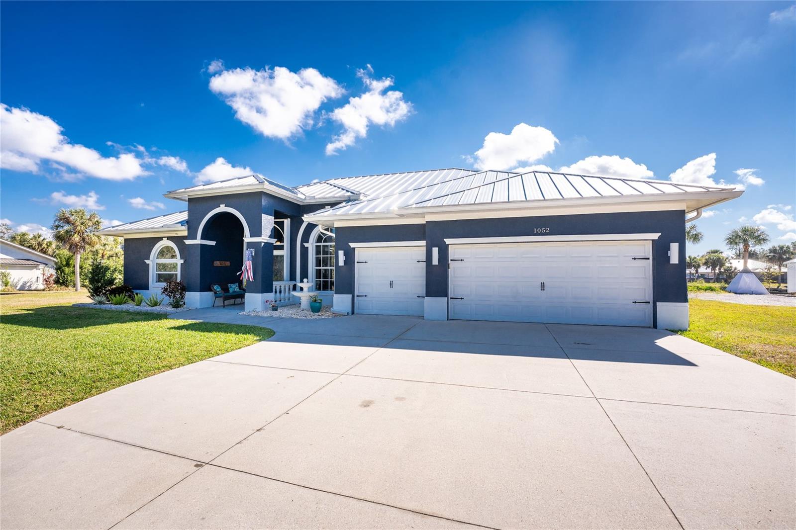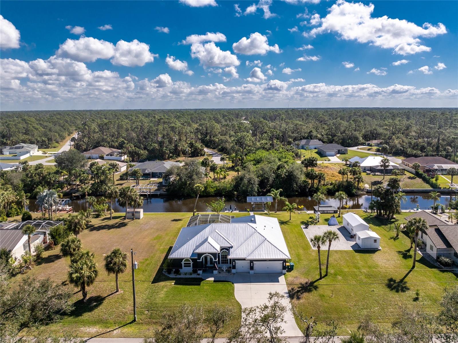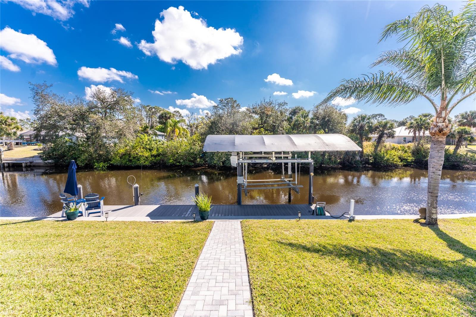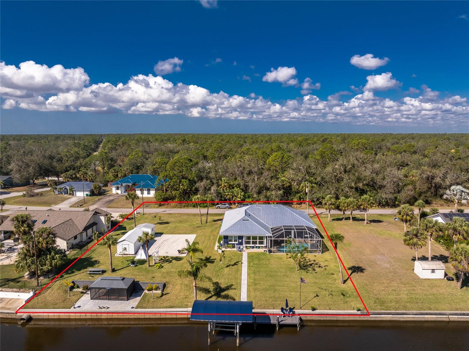 OUT OF FLOOD ZONE, DOUBLE LOT This stunning waterfront home sits on a rare double lot with 160 feet of water frontage, offering breathtaking views, a concrete seawall, and ample space for outdoor enjoyment. Located out of the flood zone, this property boasts a southeast-facing backyard, providing sunlight almost all day long, perfect for relaxing or entertaining. The home features a versatile and flexible floor plan, with a family room, living room, dining room, and a cozy dinette area framed by an aquarium window that brings the beauty of the outdoors inside. At the heart of the home is the spacious kitchen, designed with both style and functionality. Featuring quartz countertops, a tiled backsplash, a large island, a breakfast bar, and a pantry, this kitchen is ideal for cooking, entertaining, and creating memories. It seamlessly connects to the living areas, making it the perfect gathering space for family and friends. An indoor laundry room adds convenience and practicality to everyday living. The split floor plan provides privacy and comfort, with the primary bedroom suite located on the left side of the home and the two additional large bedrooms (12x13) on the opposite side. The luxurious primary suite features his-and-her closets, a spa-like bathroom with a large walk-in shower with quartz shower walls, his-and-her vanities, a garden tub, linen closet and a private water closet. Three sets of sliding glass doors lead to the inviting SALT-WATER swimming pool, creating a seamless connection between indoor and outdoor living. The tall ceilings with crown molding, elegant arches, and stately columns add a sense of grandeur, while updates like a new metal roof (2023), an HVAC system (2017), hurricane windows, and accordion shutters on the sliders provide peace of mind. Outdoors, the property is a true gem. It features new pilings and a 40x8 Trex boat dock, a concrete seawall, two spacious sheds (24x11 and 12x10), and a large area for RV or boat parking. The beautifully landscaped yard, with low-maintenance rocks surrounding the home, complements the property’s elegance. Additional features include city water, irrigation by well, and a three-car garage for all your storage needs. This home combines elegance, functionality, and waterfront living in a way that is truly unmatched. With its flexible layout, luxurious upgrades, and stunning outdoor spaces, it’s a one-of-a-kind property you won’t want to miss. Schedule your private showing today and discover all this home has to offer!