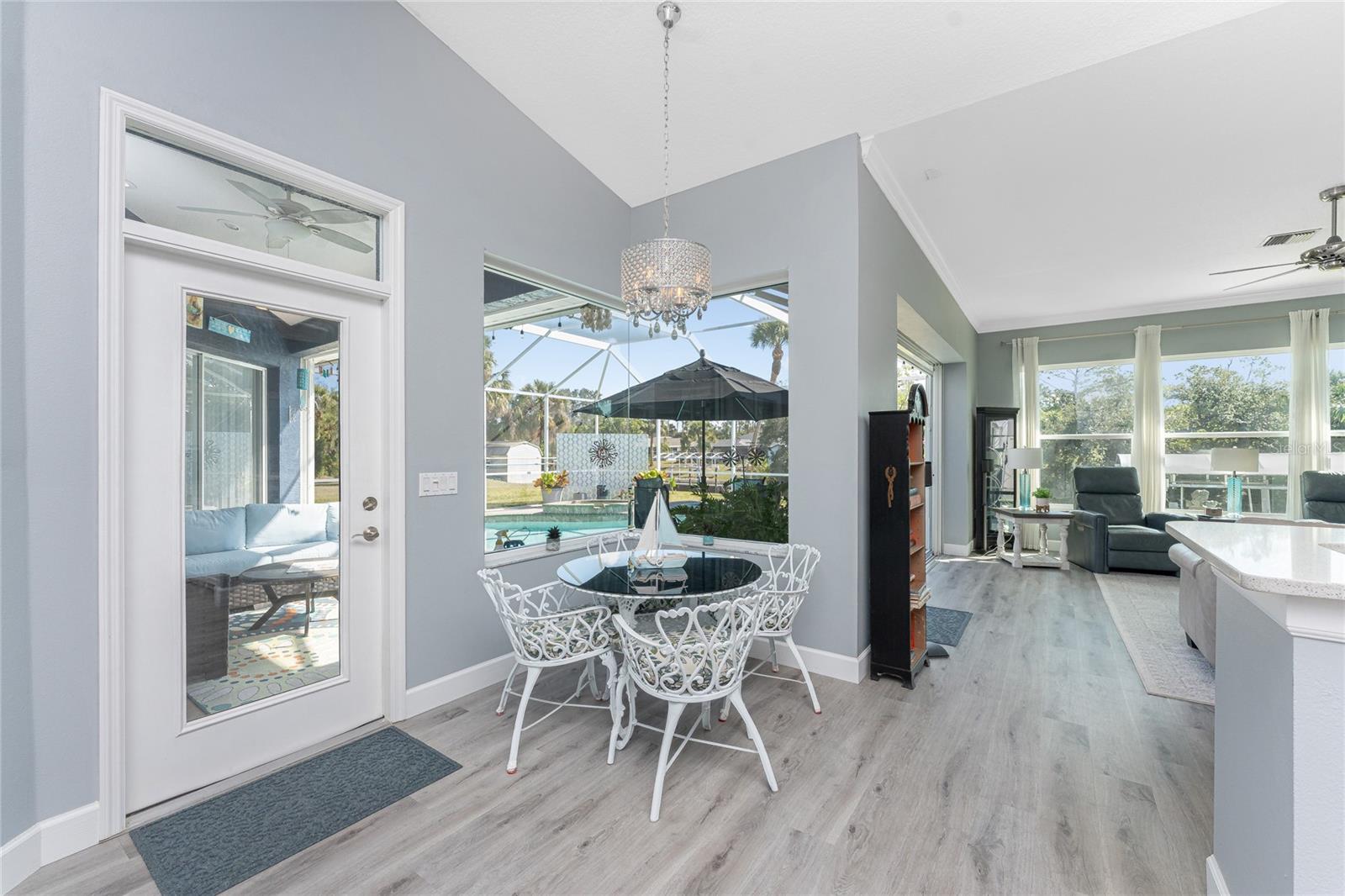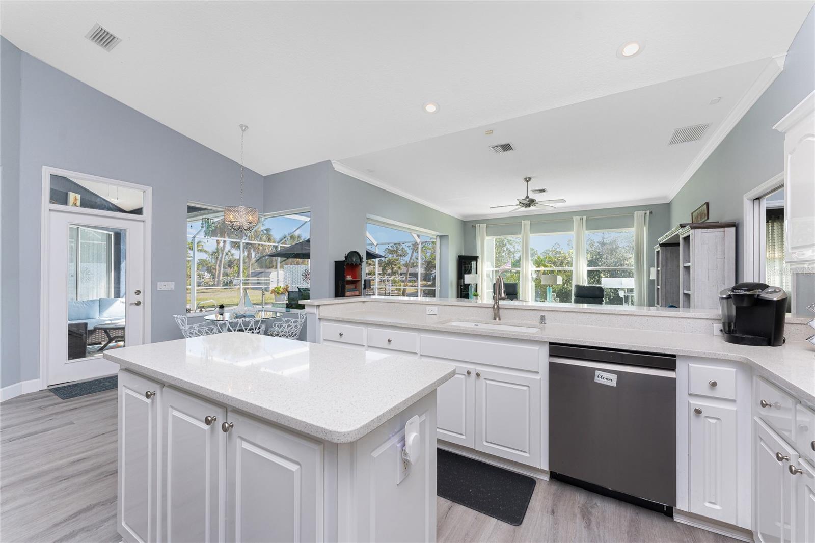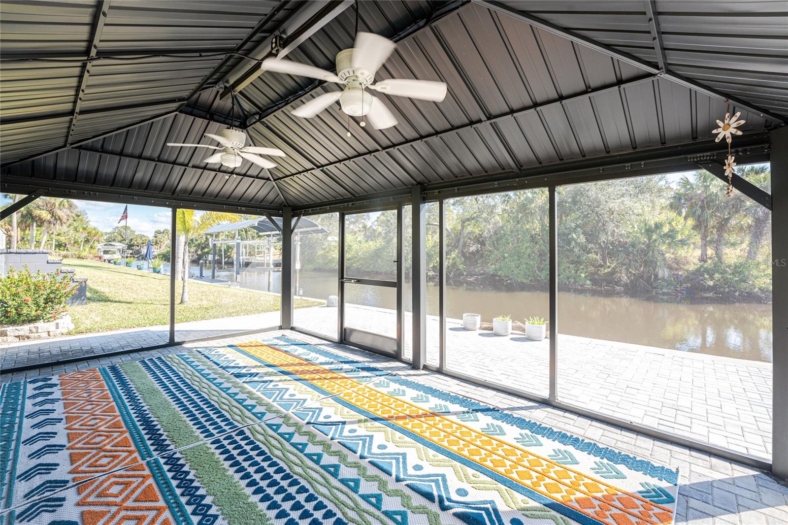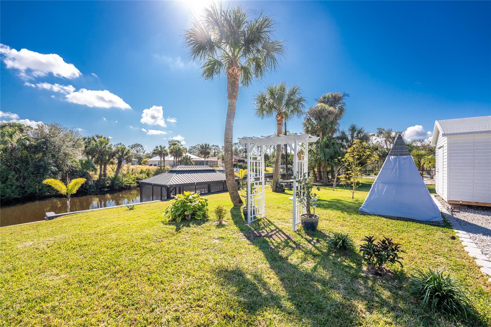 OUT OF FLOOD ZONE, DOUBLE LOT This stunning waterfront home sits on a rare double lot with 160 feet of water frontage, offering breathtaking views, a concrete seawall, and ample space for outdoor enjoyment. Located out of the flood zone, this property boasts a southeast-facing backyard, providing sunlight almost all day long, perfect for relaxing or entertaining. The home features a versatile and flexible floor plan, with a family room, living room, dining room, and a cozy dinette area framed by an aquarium window that brings the beauty of the outdoors inside. At the heart of the home is the spacious kitchen, designed with both style and functionality. Featuring quartz countertops, a tiled backsplash, a large island, a breakfast bar, and a pantry, this kitchen is ideal for cooking, entertaining, and creating memories. It seamlessly connects to the living areas, making it the perfect gathering space for family and friends. An indoor laundry room adds convenience and practicality to everyday living. The split floor plan provides privacy and comfort, with the primary bedroom suite located on the left side of the home and the two additional large bedrooms (12x13) on the opposite side. The luxurious primary suite features his-and-her closets, a spa-like bathroom with a large walk-in shower with quartz shower walls, his-and-her vanities, a garden tub, linen closet and a private water closet. Three sets of sliding glass doors lead to the inviting SALT-WATER swimming pool, creating a seamless connection between indoor and outdoor living. The tall ceilings with crown molding, elegant arches, and stately columns add a sense of grandeur, while updates like a new metal roof (2023), an HVAC system (2017), hurricane windows, and accordion shutters on the sliders provide peace of mind. Outdoors, the property is a true gem. It features new pilings and a 40x8 Trex boat dock, a concrete seawall, two spacious sheds (24x11 and 12x10), and a large area for RV or boat parking. The beautifully landscaped yard, with low-maintenance rocks surrounding the home, complements the property’s elegance. Additional features include city water, irrigation by well, and a three-car garage for all your storage needs. This home combines elegance, functionality, and waterfront living in a way that is truly unmatched. With its flexible layout, luxurious upgrades, and stunning outdoor spaces, it’s a one-of-a-kind property you won’t want to miss. Schedule your private showing today and discover all this home has to offer!