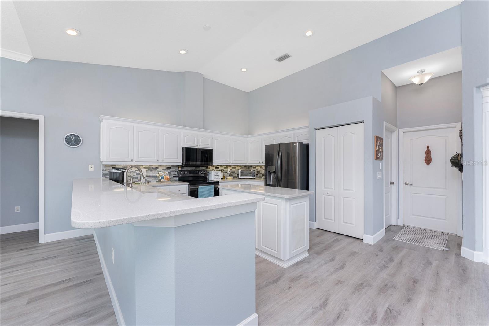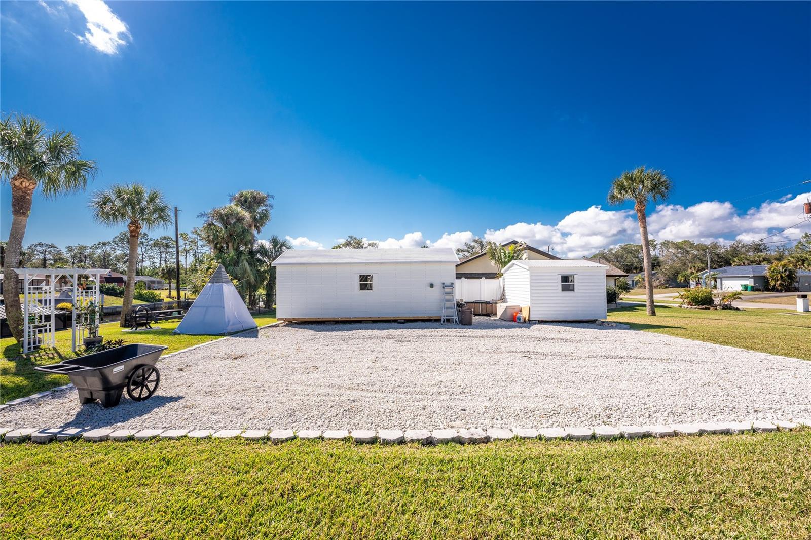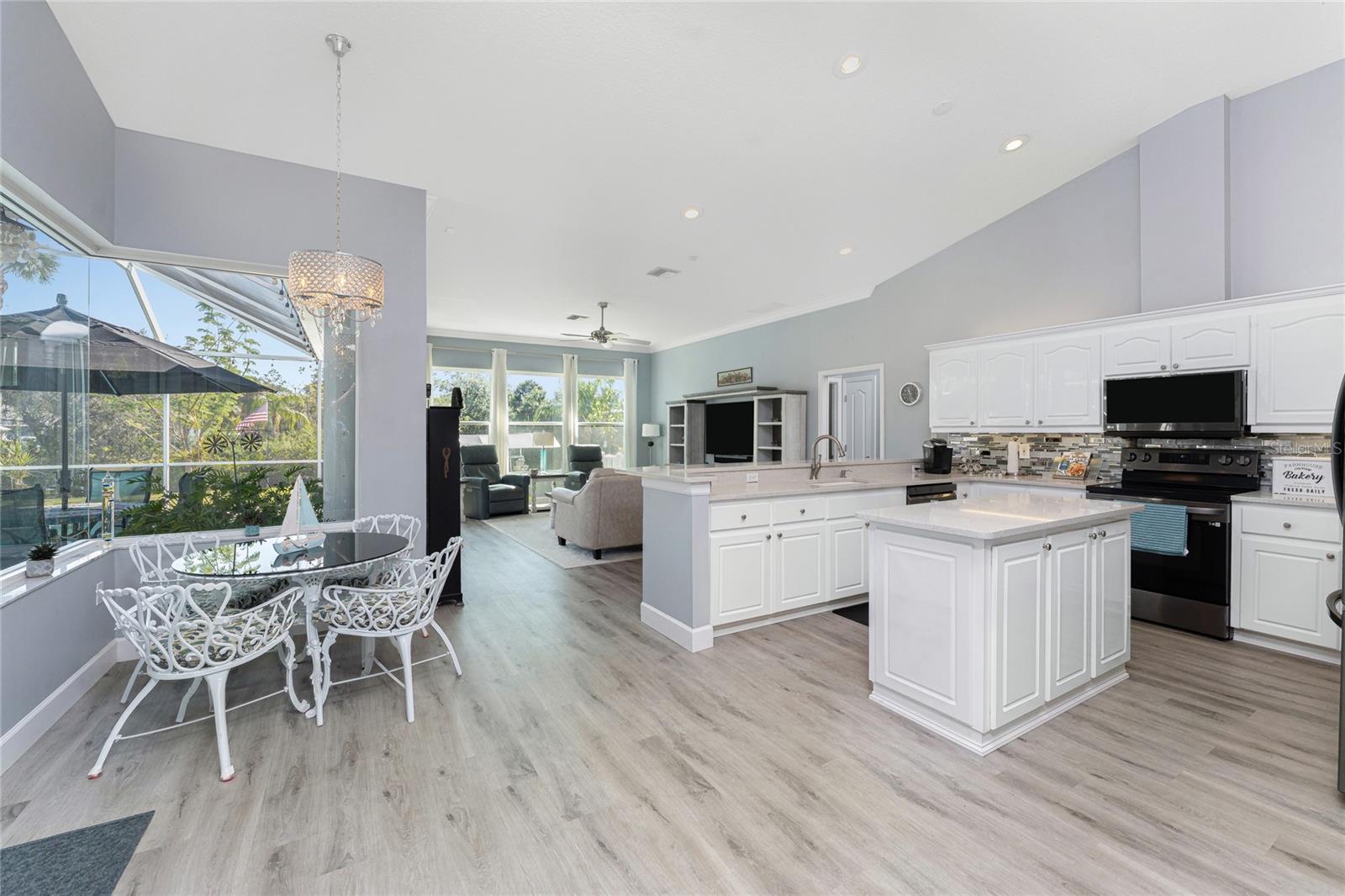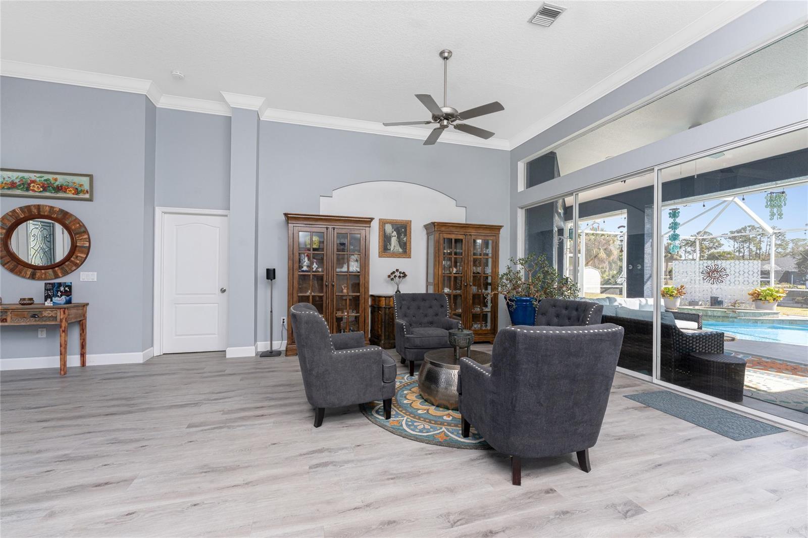 OUT OF FLOOD ZONE, DOUBLE LOT This stunning waterfront home sits on a rare double lot with 160 feet of water frontage, offering breathtaking views, a concrete seawall, and ample space for outdoor enjoyment. Located out of the flood zone, this property boasts a southeast-facing backyard, providing sunlight almost all day long, perfect for relaxing or entertaining. The home features a versatile and flexible floor plan, with a family room, living room, dining room, and a cozy dinette area framed by an aquarium window that brings the beauty of the outdoors inside. At the heart of the home is the spacious kitchen, designed with both style and functionality. Featuring quartz countertops, a tiled backsplash, a large island, a breakfast bar, and a pantry, this kitchen is ideal for cooking, entertaining, and creating memories. It seamlessly connects to the living areas, making it the perfect gathering space for family and friends. An indoor laundry room adds convenience and practicality to everyday living. The split floor plan provides privacy and comfort, with the primary bedroom suite located on the left side of the home and the two additional large bedrooms (12x13) on the opposite side. The luxurious primary suite features his-and-her closets, a spa-like bathroom with a large walk-in shower with quartz shower walls, his-and-her vanities, a garden tub, linen closet and a private water closet. Three sets of sliding glass doors lead to the inviting SALT-WATER swimming pool, creating a seamless connection between indoor and outdoor living. The tall ceilings with crown molding, elegant arches, and stately columns add a sense of grandeur, while updates like a new metal roof (2023), an HVAC system (2017), hurricane windows, and accordion shutters on the sliders provide peace of mind. Outdoors, the property is a true gem. It features new pilings and a 40x8 Trex boat dock, a concrete seawall, two spacious sheds (24x11 and 12x10), and a large area for RV or boat parking. The beautifully landscaped yard, with low-maintenance rocks surrounding the home, complements the property’s elegance. Additional features include city water, irrigation by well, and a three-car garage for all your storage needs. This home combines elegance, functionality, and waterfront living in a way that is truly unmatched. With its flexible layout, luxurious upgrades, and stunning outdoor spaces, it’s a one-of-a-kind property you won’t want to miss. Schedule your private showing today and discover all this home has to offer!