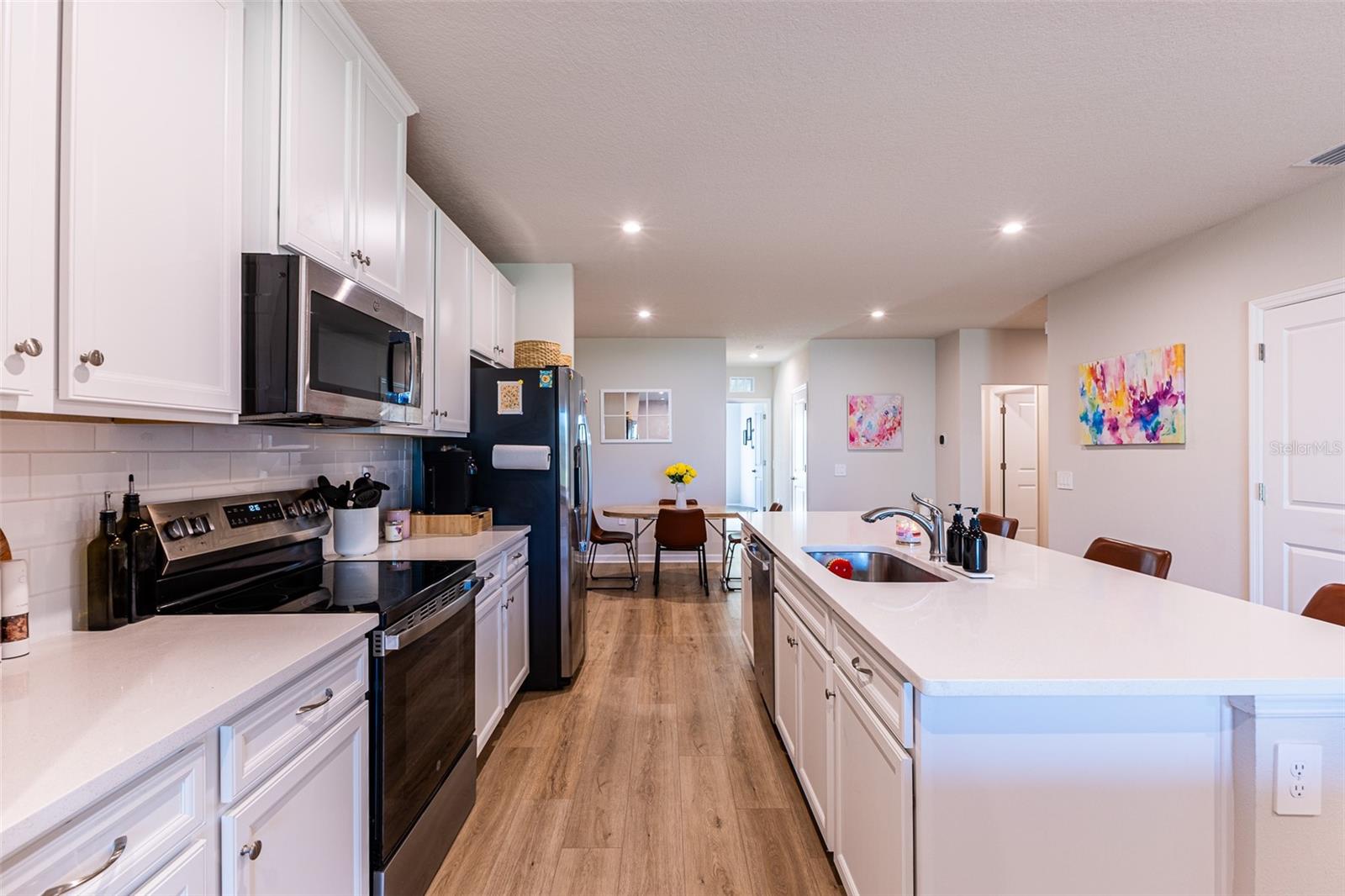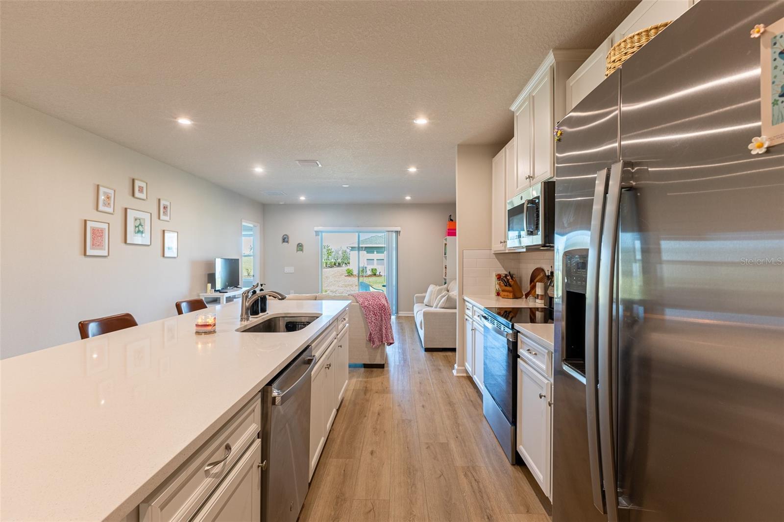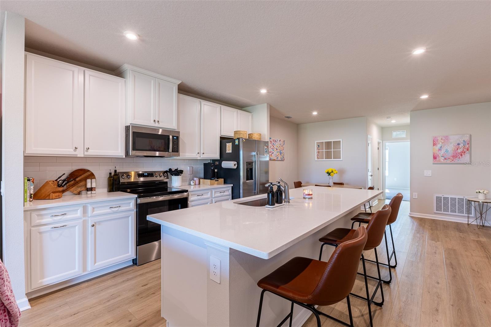 Step into this stunning, move-in ready 2024 BUILT VILLA located in the sought-after community of “The Palms at Westport”! Tucked away at the end of a peaceful, quiet corner lot on a cul-de-sac, this spacious 1,506 sq. ft. home offers 3 bedrooms, 2 bathrooms, and a 2-car garage — all designed for modern living and comfort. As you step inside, you’re greeted by an open-concept great room that flows seamlessly throughout the home. The kitchen is the heart of the space, featuring a large QUARTZ center island, crisp white wood cabinetry with elegant crown molding, pull-out drawers for easy access, and gleaming stainless steel appliances. The tiled backsplash adds a touch of style, while the deep pantry provides plenty of storage. Whether you're cooking a gourmet meal or enjoying a casual breakfast, this kitchen will inspire you. The high ceilings, laminate and tile flooring, and recessed lighting give the entire home a bright and airy feel. The spacious living room offers sliding doors that lead out to the covered patio area, perfect for relaxing or entertaining guests. The adjacent dining room, conveniently located just off the kitchen, makes meal time a breeze. The master suite is a true retreat, featuring an ensuite bathroom with dual quartz sinks, a walk-in shower, and a large walk-in closet to keep everything organized. The two additional bedrooms are generously sized with oversized closets, offering plenty of room for storage or personal space. The guest bathroom includes a tub/shower combination with beautiful tiled details. Built with durability in mind, this villa also comes with hurricane shutters for added peace of mind during storm season. The oversized corner lot provides extra outdoor space, and the extended paver driveway and walkway add to the home's curb appeal. In addition to the fantastic home itself, this community offers a variety of amenities that make every day feel like a vacation. The Centennial Park Recreational Center features basketball, pickleball, volleyball, a fitness center, and even a disc golf course. There's also a full range of outdoor sports fields, including baseball and soccer, to keep active lifestyles in mind. With a low HOA fee of just $167.84 per month, you'll enjoy affordable maintenance without sacrificing quality of life. The home’s central location is close to shopping, schools, the Town Center Mall, the Charlotte Baseball Stadium, and just a short drive to Englewood Beach and the Sunseekers Waterfront Resort. Don’t miss out on the chance to own this gem! Call today to schedule your private viewing and start the next chapter in your life at the Palms at Westport!