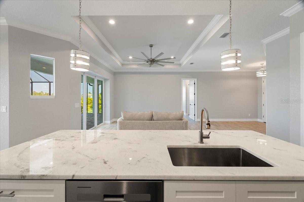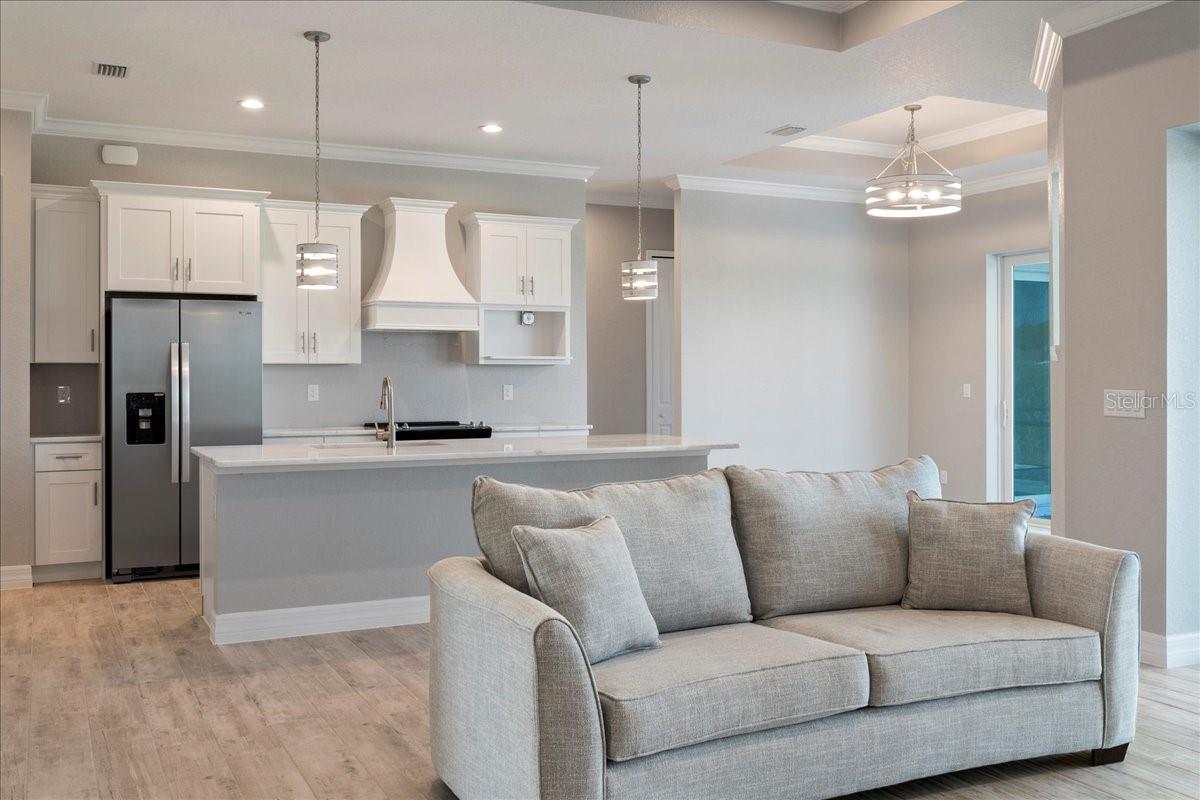 This BRAND-NEW home exudes quality craftsmanship, unmistakable from the moment you arrive in the coach-lite driveway and see the shiplap accented house with welcoming porch and double door entryway! Located in the highly desirable beach community of Englewood, this 3-bedroom, PLUS OFFICE, 2-bathroom, 2.5 car, exquisite home was built with no feature understated! The home boasts soaring volume ceilings and 8-foot doors throughout with the Living room having an immense tray ceiling full of recessed lighting, crown molding, a 6-foot ceiling fan, a 3-paneled sliding glass door connecting to the covered lanai area, providing a sunlit sanctuary. A separate dining area with its two sets of sliding glass door, provides ample room for any sideboard your table may have. Centrally located in this convenience driven designed open floorplan, the chef inspired kitchen with an incredible 9’ island, has TWO, 5’ PANTRIES, high-end Stainless-steel appliances, tile BACKSPLASH, solid wood, SOFT-CLOSE cabinetry, and is the hub for entertainment. Cabinetry has brushed nickel hardware and is topped in incredibly gorgeous veined, QUARTZ countertops. The split floorplan allows for owner privacy with the Primary Suite’s luxury including direct access to the lanai, tray ceiling, transom window to providing privacy along with natural lighting, two walk-in closets, an enormous, walk-in, tiled shower with two time saving shower heads, split vanities covered in luxury QUARTZ countertops, a private water closet, plus a linen closet. The home has a premium lighting package consisting of ceiling fans with lights, pendants over island, chandeliers in foyer and dining room, plus home has easy to upkeep & maintain allergen-free, porcelain plank flooring throughout. Interior Designer’s top pick for 2025 is showcased…shiplap accents on the kitchen island, Living Room & foyer wall. Let’s not forget to mention something you never have to think about, the convenient HURRICANE IMPACT WINDOWS AND SLIDING GLASS DOORS, providing peace of mind especially when you’re out of town. Outside you’ll find TWO LANAIS, one is an incredible 30’ long, and the other is a lovely oasis for your rear bedroom guests! The oversized 25’x22’, 579 square foot 2.5-car garage boasts two 10-foot hurricane rated overhead doors instead of a standard single 16-foot, providing so much more extra parking space between vehicles, plus garage has a handy side yard exterior door for convenience. With no HOA, you can utilize your investment as you see fit…live here yourself, rent it out annually, seasonally, or AirBNB it. Home is 100% Hurricane protected, and constructed by a Floridian builder who knows what has to be built in Southwest Florida for longevity and durability...hip roof design for long-term discounted insurance rates, off-ridge roof venting so peaks won't blow away, and STEM WALL construction which far exceeds monolithic slabs as sand can wash away but not cement blocks! This property is advantageously located near a golfing community, minutes to the beach, marinas, and boat launches. At nearly 2100 square feet under air, this custom designed home feels much bigger with its volume ceilings and is the perfect size for your needs in paradise! This a gem is priced to sell, is waiting for you, so call today for your private tour.