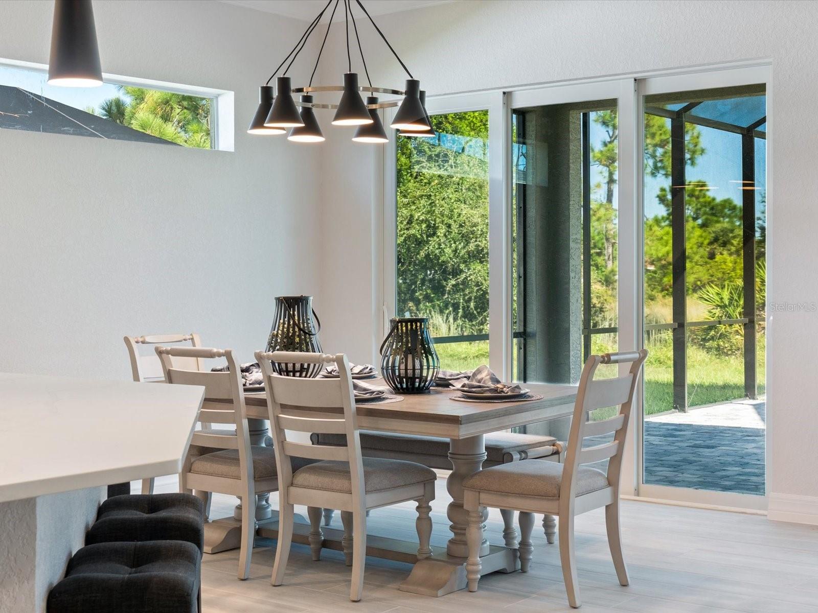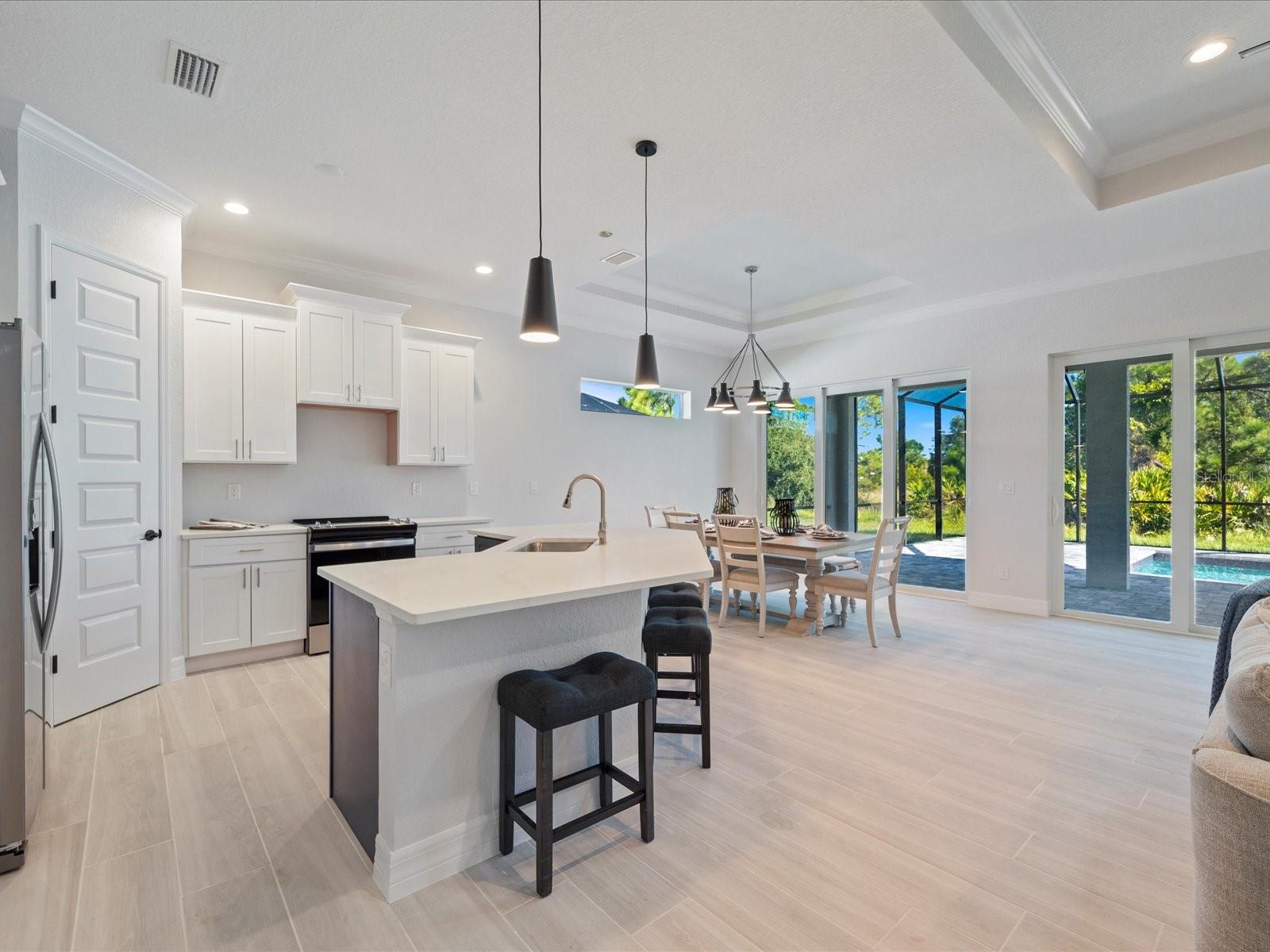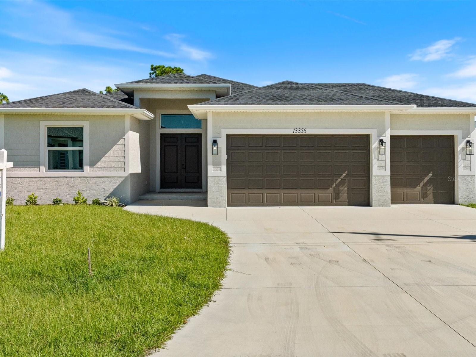 This BRAND-NEW home exudes quality craftsmanship—unmistakable from the moment you arrive! The coach-lit driveway, shiplap-accented exterior, welcoming front porch, and elegant double-door entryway set the stage for the beauty found within. Located in the highly desirable beach community of Englewood, this 4-BEDROOM, 2-BATHROOM, 3-CAR GARAGE home was built with no detail overlooked and no feature understated! Inside, you’ll find soaring volume ceilings and 8-foot doors throughout. The Living Room features an impressive tray ceiling with recessed lighting, crown molding, a 6-foot ceiling fan, and a 3-panel sliding glass door that opens to the covered lanai—creating a bright, sunlit sanctuary. The separate Dining Area, enhanced by a set of sliding glass doors, offers ample space for entertaining and your favorite sideboard. At the heart of this open, convenience-driven floorplan is the chef-inspired Kitchen—complete with an incredible, working ISLAND, WALK-IN PANTRY, high-end stainless steel appliances, TILE BACKSPLASH, and solid wood, SOFT-CLOSE cabinetry topped with luxurious veined QUARTZ countertops. Brushed nickel hardware and thoughtful finishes make this the hub of the home and the centerpiece for gatherings. The split floorplan provides owner privacy, with the Primary Suite offering direct lanai access, a tray ceiling, transom window for natural light and privacy, two walk-in closets, and a luxurious en suite bathroom featuring an enormous walk-in tiled shower, DUAL SINKS, vanity with QUARTZ countertops, and a private water closet. Throughout the home, you’ll find a premium lighting package including ceiling fans with lights, pendant fixtures over the island, and elegant chandeliers in the foyer and dining room. Easy-care, allergen-free porcelain plank flooring runs throughout. Showcasing one of Interior Designers’ top picks for 2025, the home includes stylish shiplap accents on the kitchen island, Living Room wall, and foyer feature wall. For peace of mind, this home is equipped with HURRICANE IMPACT WINDOWS AND SLIDING GLASS DOORS—offering security and confidence even when you’re away. Step outside to enjoy an impressive 23 feet long LANAI, perfect for entertaining. The oversized 30’x23’, 682 sq. ft. 3-car garage features two hurricane-rated overhead doors, providing extra parking and maneuvering space. With NO HOA, this property offers exceptional flexibility—live here year-round, rent it seasonally, or Airbnb it. Built by a local Floridian builder who understands what’s needed for longevity and durability in Southwest Florida, this home features a HIP ROOF design for long-term insurance discounts, OFF-RIDGE roof venting, and STEM WALL construction, which far exceeds monolithic slabs for storm resilience. Ideally located near golfing communities, marinas, boat launches, and Englewood’s beautiful beaches, this nearly 2,100 sq. ft. home feels even larger thanks to its open layout and soaring ceilings. This gem is priced to sell and waiting for you—call today for your private tour!