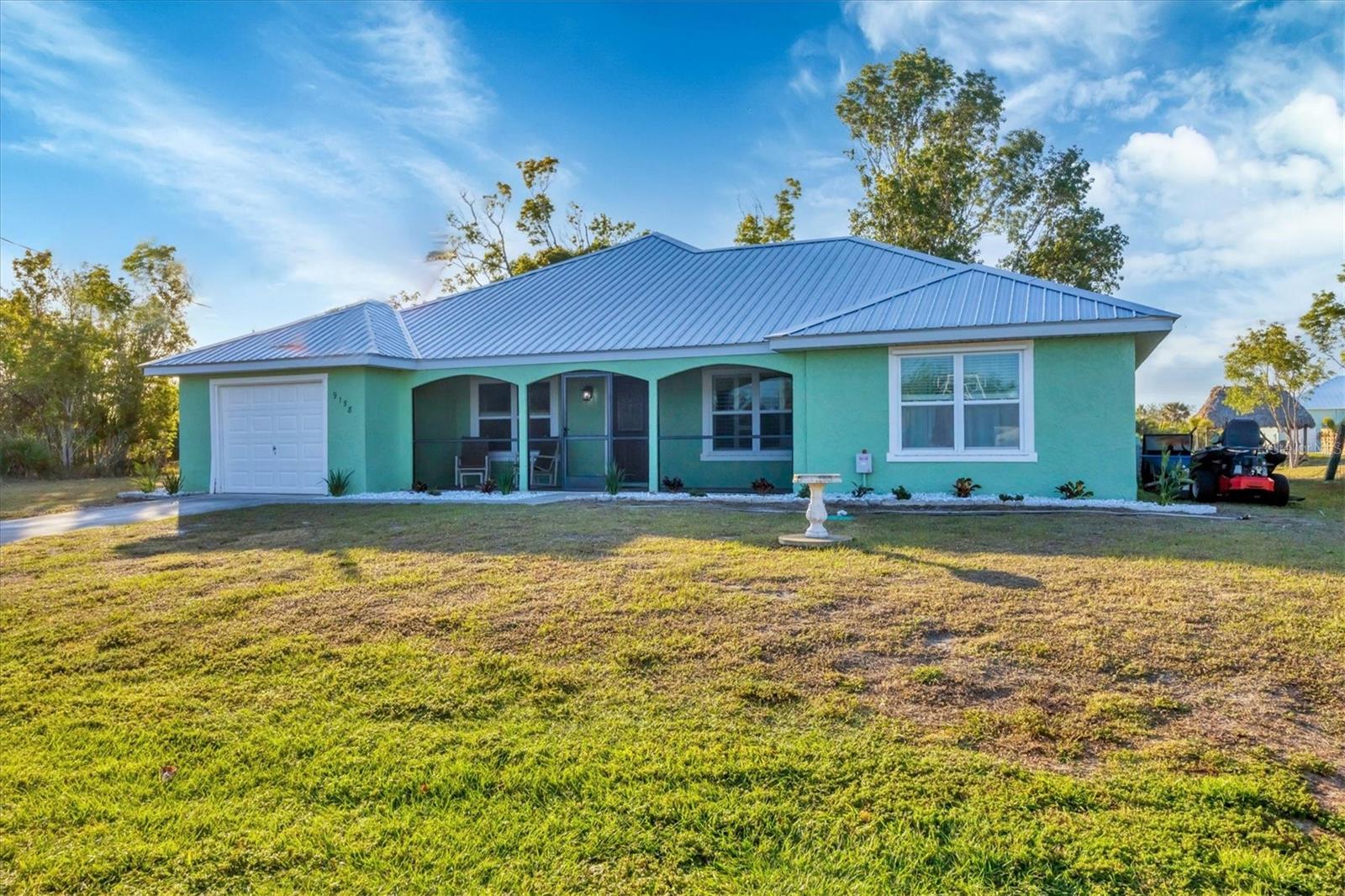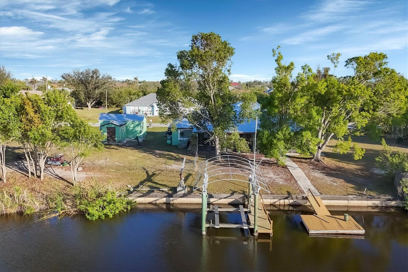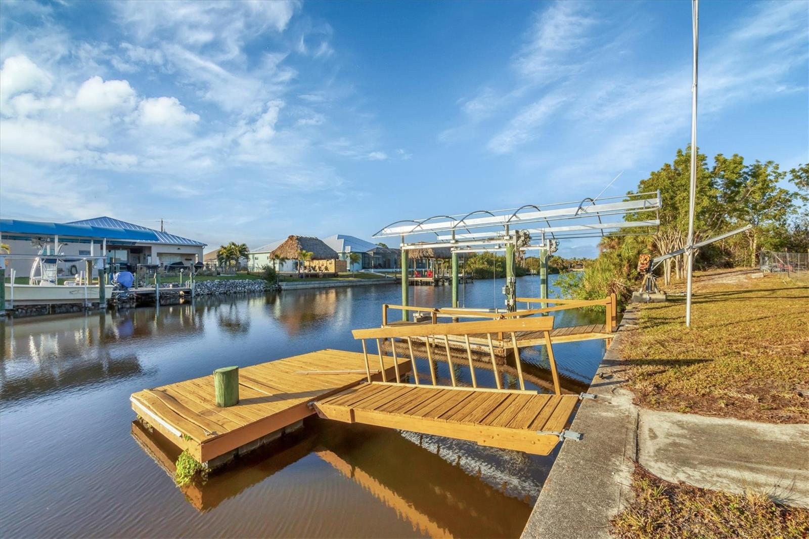Waterfront home is calling you to Paradise! This well maintained home has 2023 metal roof, A/C 2020, windows replaced 2011, fresh paint exterior 2023 and storm shutters to give you peace of mind. Lot that home sits on has seawall, boat lift and dock. The adjacent lot is NOT included in this listing. Yard has partial fencing for dog run which can easily be removed if not needed. The spacious layout in this home boasts living room as well as family room that has access to garage and sliders at back to lanai. Dining area conveniently adjacent to kitchen for ease of entertaining as well. Primary bedroom has direct access to lanai and walk in closet with en-suite. You'll be hosting friends and family all the time on the 12x45 screened lanai that's under the roof of the home. Beyond lanai is an open patio great for BBQ parties or dining in. In warmer days you'll appreciate the Mahogany trees that grace the backyard providing welcomed shade. Prior to deciding to move seller was going to renovate kitchen and can furnish plan/drawings. South Gulf Cove is a sought after waterfront community with abundance of new homes around, has a public boat ramp, park and playground. There is only one bridge out to the Lagoon on the Zephyr waterway from this home, then on to River, Intracoastal and Gulf to enjoy the Florida lifestyle dream. Appx. 15 minute ride to Gulf beaches and multiple golf courses too. And seller says you love the incredible neighbors on this street! Don't miss out, call today for your very own viewing!