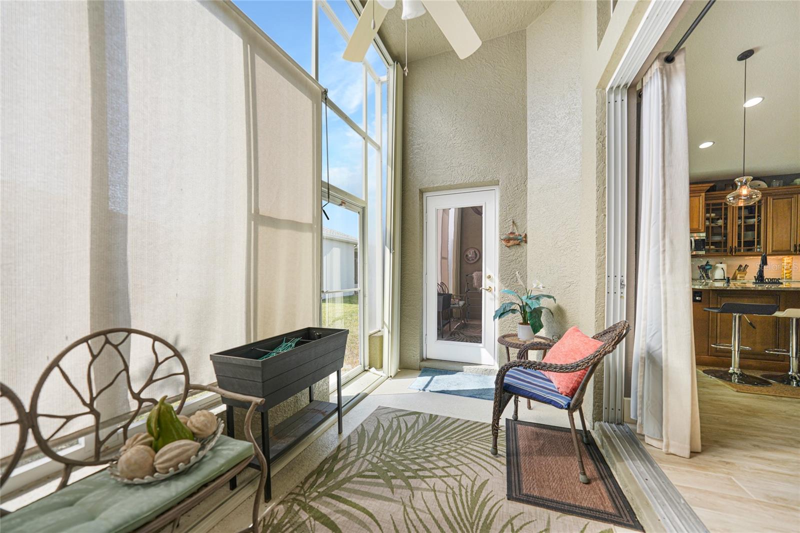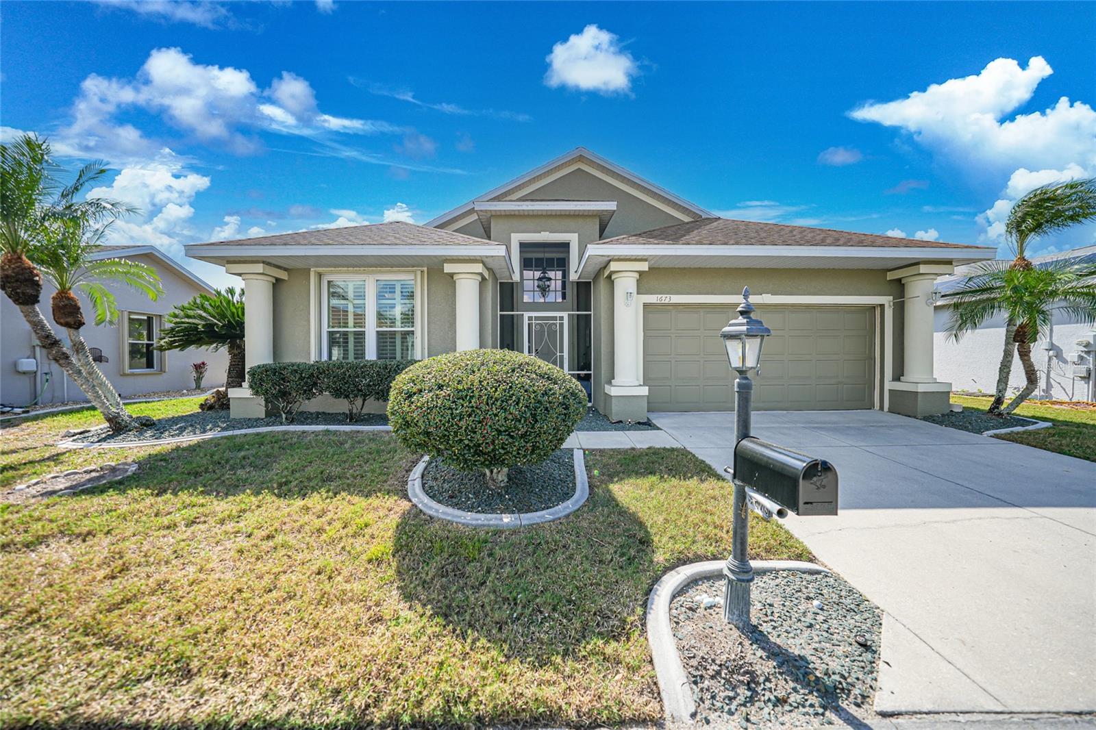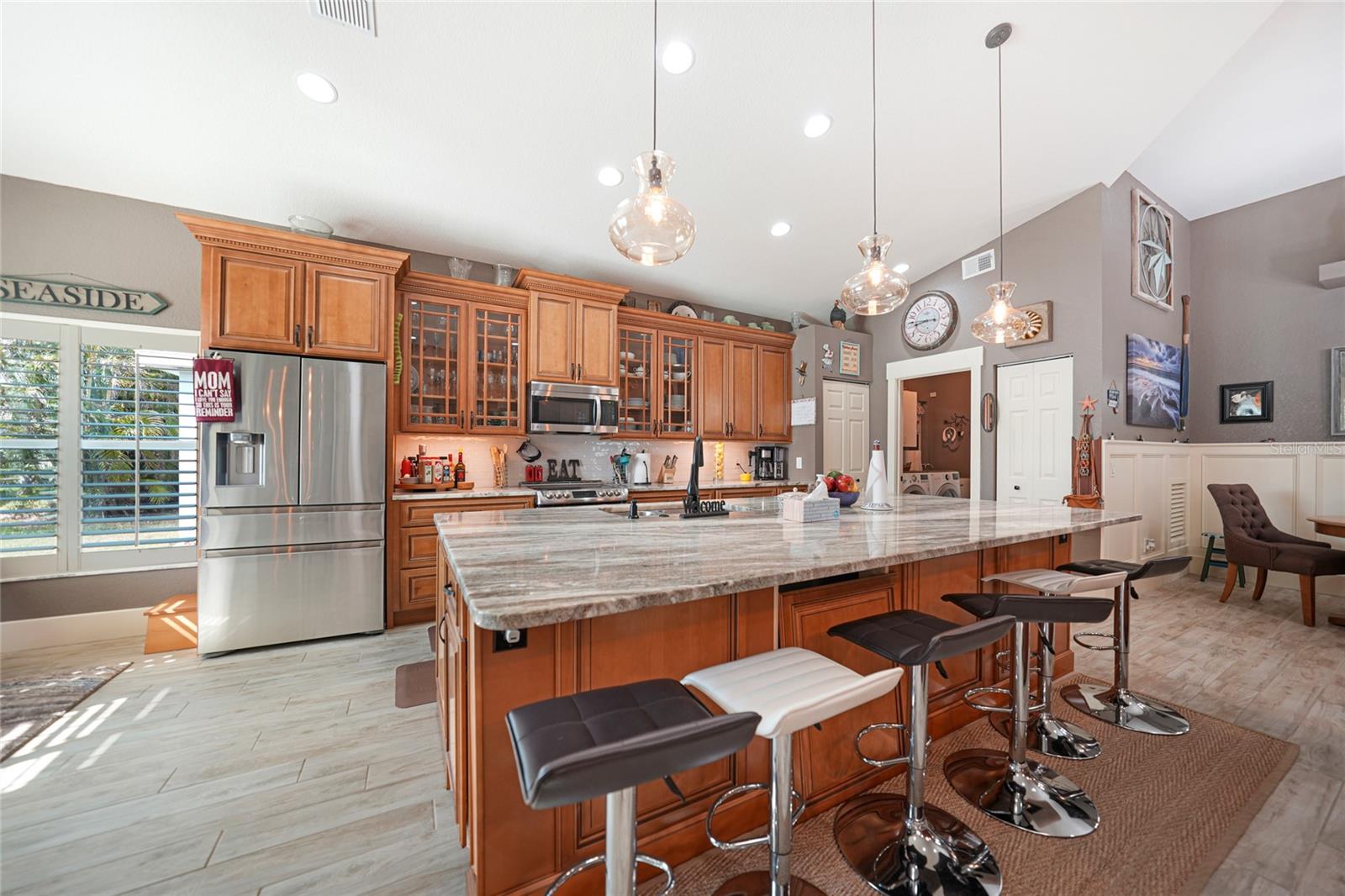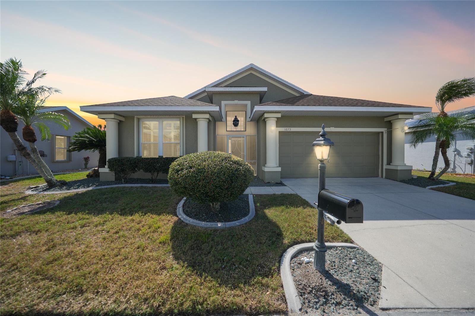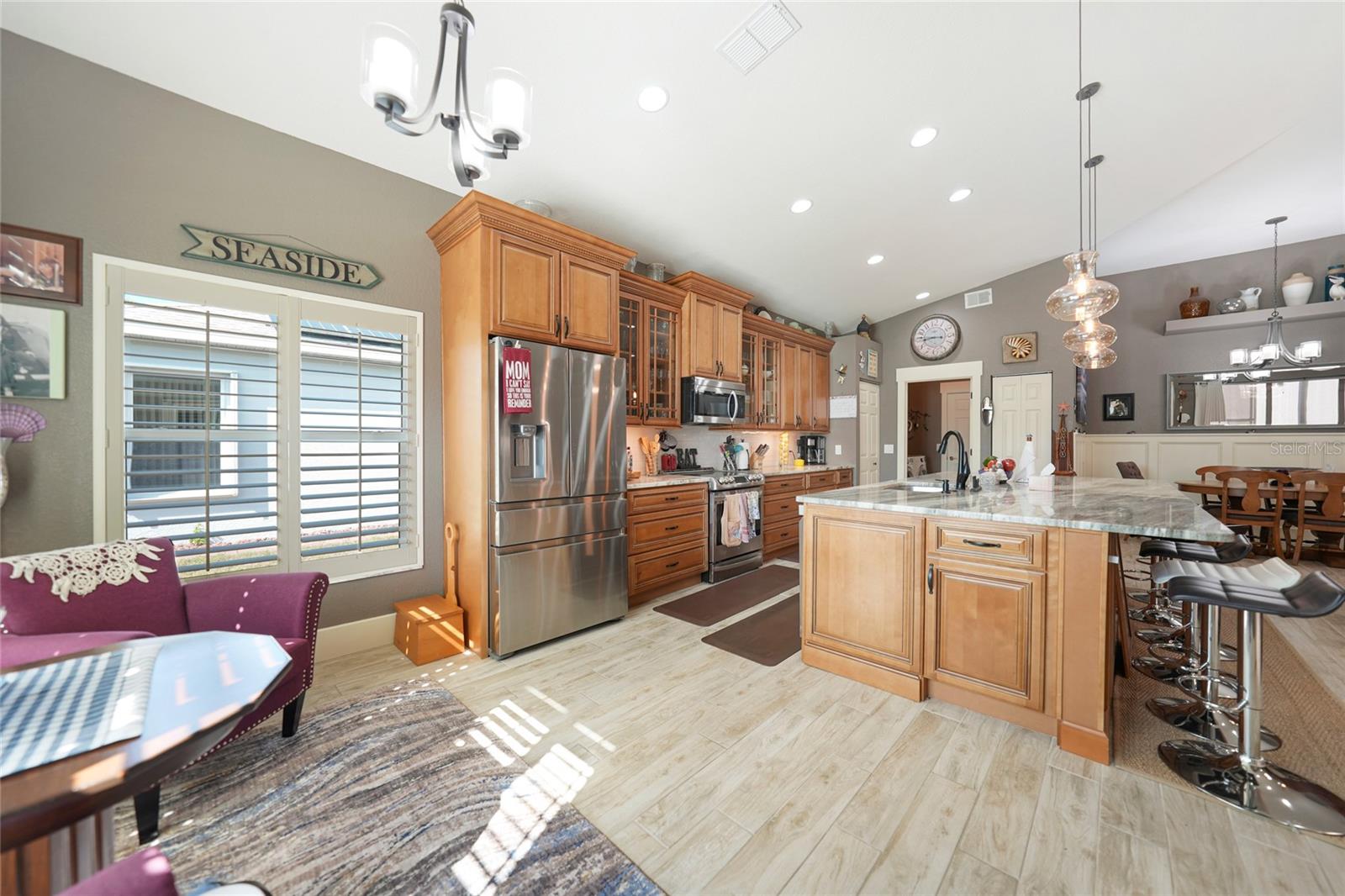 Welcome to this exceptional Ashton model in the sought-after 55+ community of King’s Gate! One of a kind home. This lovely home was thoughtfully, remodeled and designed to take advantage of its size. Though it was designed for entertaining with its extra large island with seating, this home is comfortable for every day living. This home is one that looks like no others in this gated community. The interior design is warm and inviting And quite stunning! This home stands out with its open floor plan, soaring ceilings, and a host of elegant upgrades throughout. This property features a solar system that provides affordable electricity, designed to cover all your energy needs. As a result, the owner receives an annual credit. Beautiful wood-look tile flooring and plantation shutters provide timeless charm, while color accent walls, stylish light fixtures, recessed lighting, and plant shelves add designer touches. Both bathrooms have been tastefully updated, enhancing the home’s appeal. The kitchen is a chef’s dream, featuring a large island with breakfast bar, granite countertops, rich wood cabinetry with deep drawers and glass-front accents, and stainless steel appliances, including a four-door refrigerator. A spacious pantry and decorative plumbing fixtures complete the space, which opens seamlessly into the main living and dining areas—perfect for entertaining. The master suite has been extended by two feet for added space and boasts a walk-in closet and an updated en suite bath with dual sinks, elegant mirrors and fixtures, and a large glass-enclosed shower. The living and dining areas offer custom floating shelves to showcase your personal collections. Other highlights include a dedicated laundry room, additional fridge, and overhead cabinets for extra storage. The home also features accordion storm shutters, a new roof (2016), a new hot water heater (2019), a new garage screen door, fresh interior and exterior paint, updated door trim and baseboards, a water softener, and extra insulation. Relax in your private lanai with vinyl windows, ideal for enjoying both sunny days and cool evenings. The home boasts impressive curb appeal, with landscape curbing and a pillared, screened front entry. King’s Gate offers an active, gated 55+ community with amenities like a beautiful clubhouse, Olympic-sized pool, spa, fitness center, tennis courts, bocce, lawn bowling, shuffleboard, a computer room, and a full-time Activities Director. Plus, you’re just minutes from local beaches, dining, shopping, and golf courses, and have easy access to public parks, bike trails, boat ramps, Charlotte Harbor, and the Gulf of Mexico. Convenient access to I-75 makes this home a true gem for Florida living. Come seek and find this one of a kind gem for yourself.