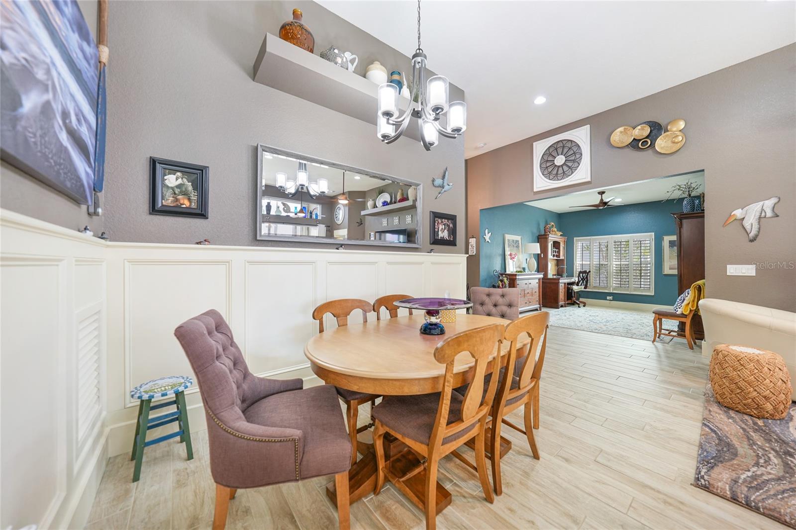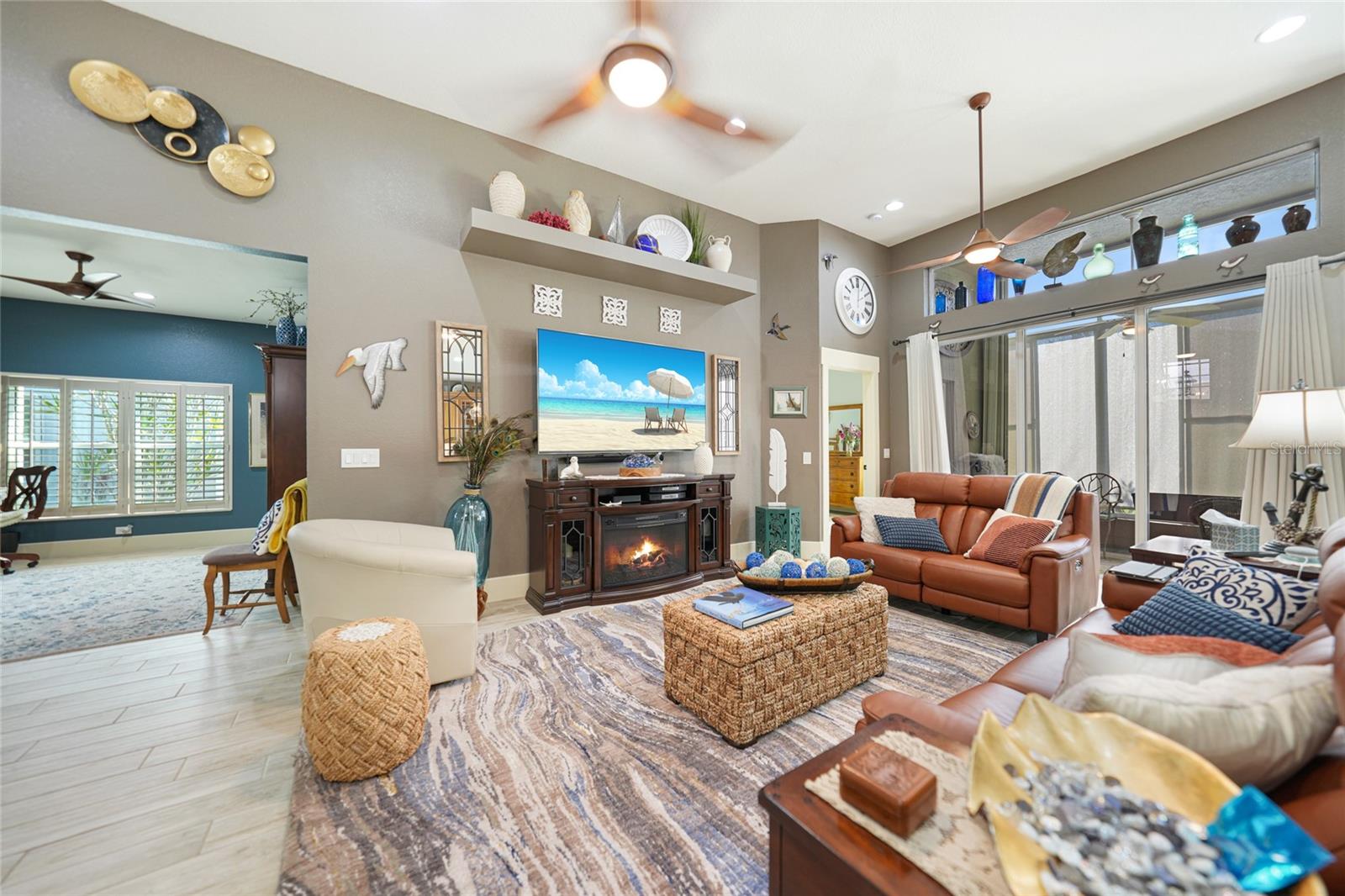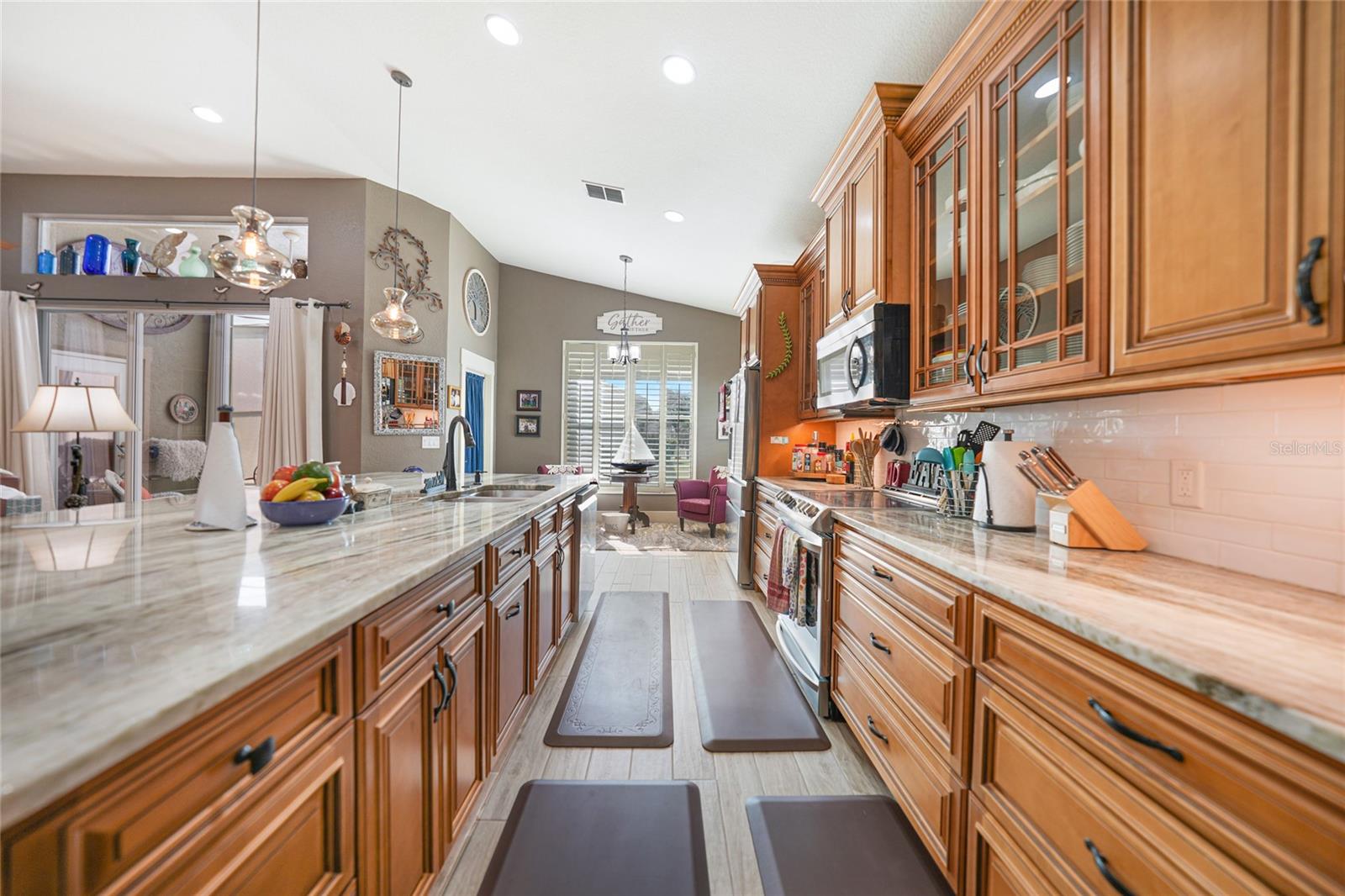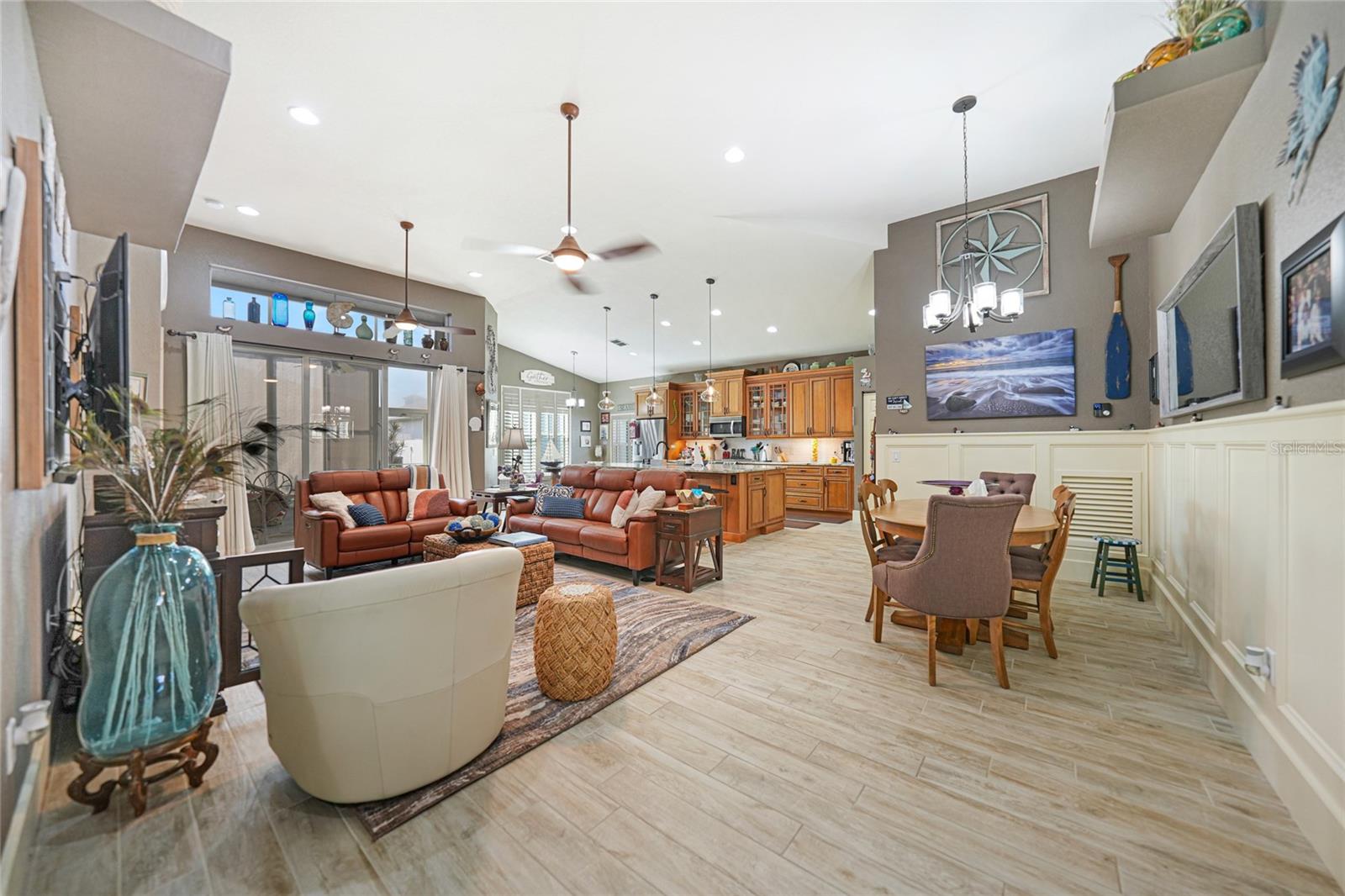 Welcome to this exceptional Ashton model in the sought-after 55+ community of King’s Gate! One of a kind home. This lovely home was thoughtfully, remodeled and designed to take advantage of its size. Though it was designed for entertaining with its extra large island with seating, this home is comfortable for every day living. This home is one that looks like no others in this gated community. The interior design is warm and inviting And quite stunning! This home stands out with its open floor plan, soaring ceilings, and a host of elegant upgrades throughout. This property features a solar system that provides affordable electricity, designed to cover all your energy needs. As a result, the owner receives an annual credit. Beautiful wood-look tile flooring and plantation shutters provide timeless charm, while color accent walls, stylish light fixtures, recessed lighting, and plant shelves add designer touches. Both bathrooms have been tastefully updated, enhancing the home’s appeal. The kitchen is a chef’s dream, featuring a large island with breakfast bar, granite countertops, rich wood cabinetry with deep drawers and glass-front accents, and stainless steel appliances, including a four-door refrigerator. A spacious pantry and decorative plumbing fixtures complete the space, which opens seamlessly into the main living and dining areas—perfect for entertaining. The master suite has been extended by two feet for added space and boasts a walk-in closet and an updated en suite bath with dual sinks, elegant mirrors and fixtures, and a large glass-enclosed shower. The living and dining areas offer custom floating shelves to showcase your personal collections. Other highlights include a dedicated laundry room, additional fridge, and overhead cabinets for extra storage. The home also features accordion storm shutters, a new roof (2016), a new hot water heater (2019), a new garage screen door, fresh interior and exterior paint, updated door trim and baseboards, a water softener, and extra insulation. Relax in your private lanai with vinyl windows, ideal for enjoying both sunny days and cool evenings. The home boasts impressive curb appeal, with landscape curbing and a pillared, screened front entry. King’s Gate offers an active, gated 55+ community with amenities like a beautiful clubhouse, Olympic-sized pool, spa, fitness center, tennis courts, bocce, lawn bowling, shuffleboard, a computer room, and a full-time Activities Director. Plus, you’re just minutes from local beaches, dining, shopping, and golf courses, and have easy access to public parks, bike trails, boat ramps, Charlotte Harbor, and the Gulf of Mexico. Convenient access to I-75 makes this home a true gem for Florida living. Come seek and find this one of a kind gem for yourself.