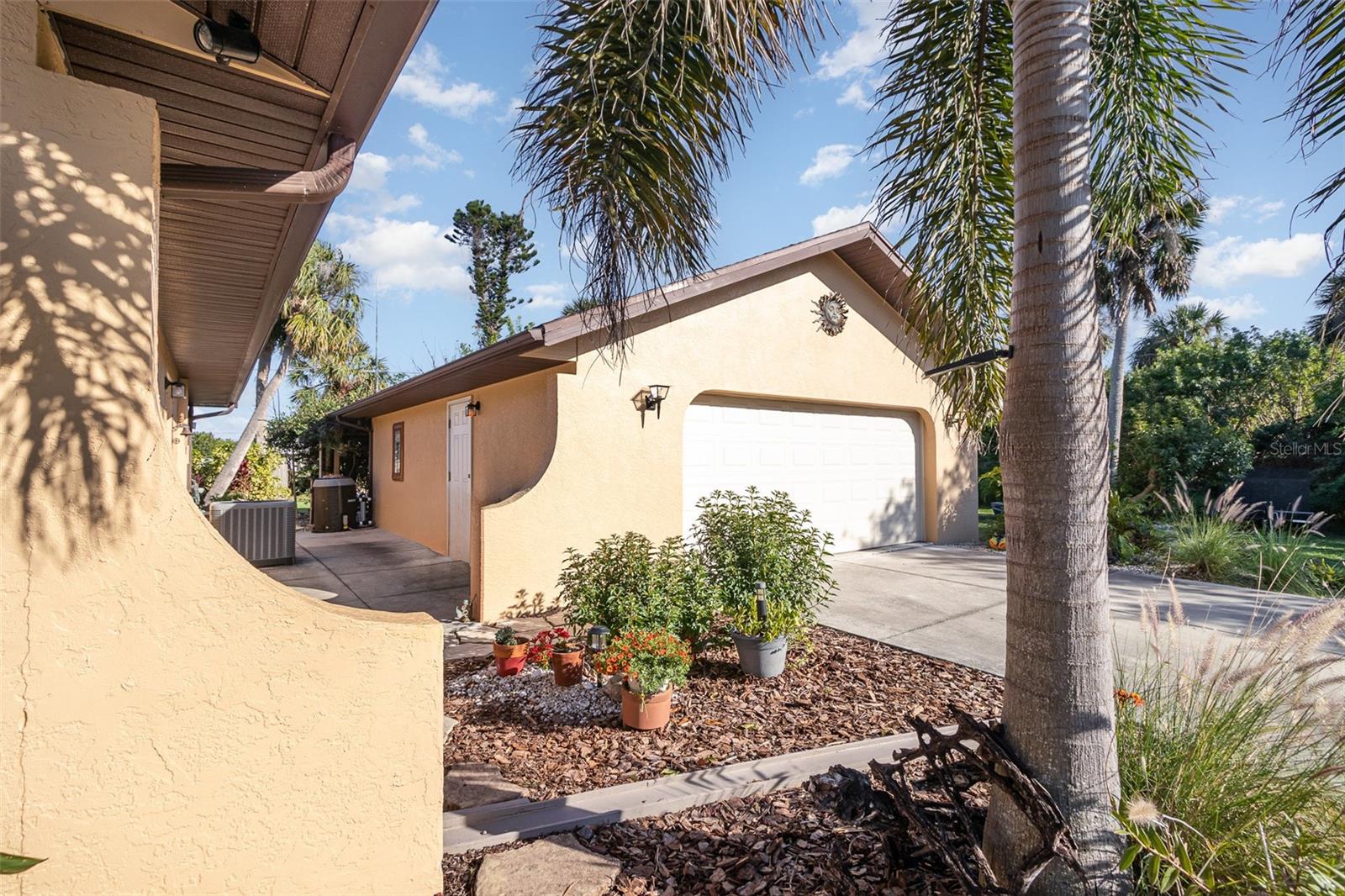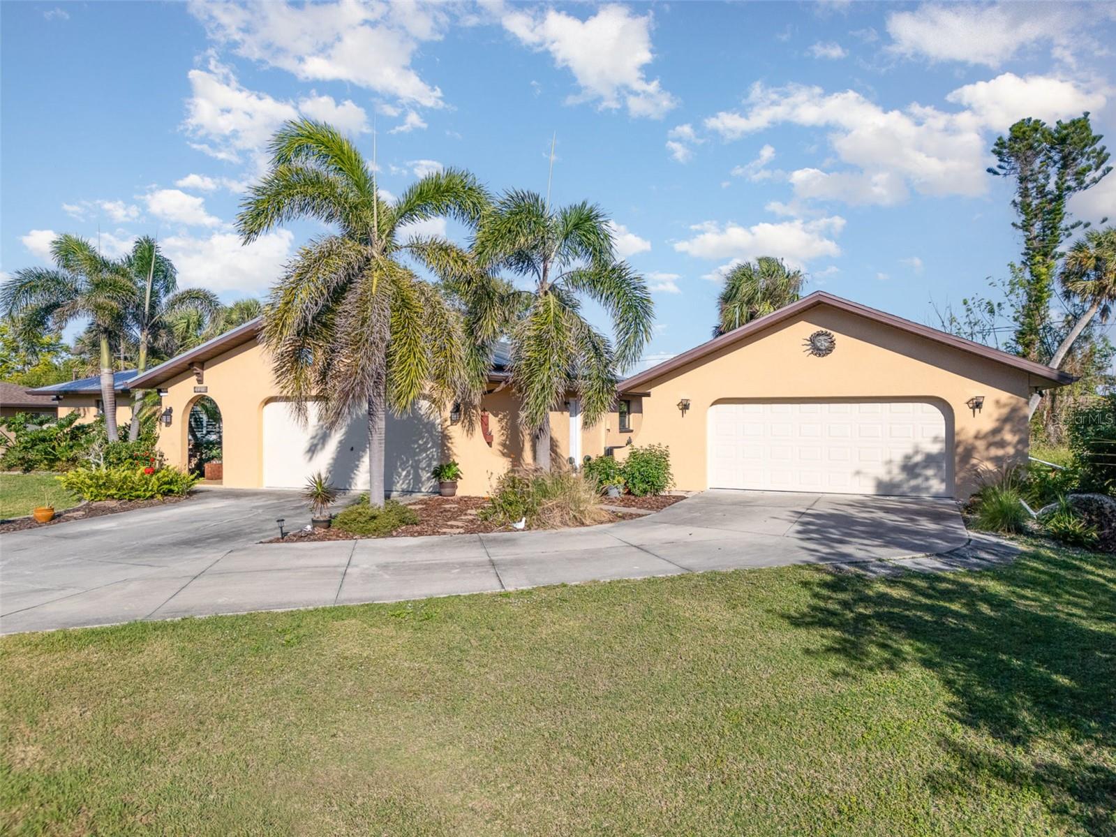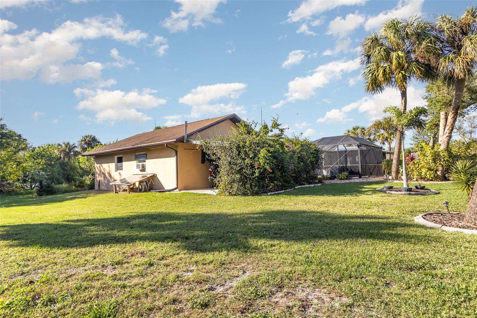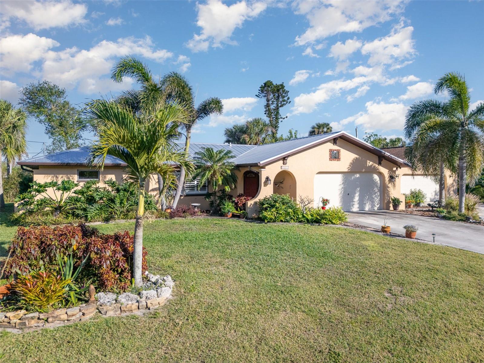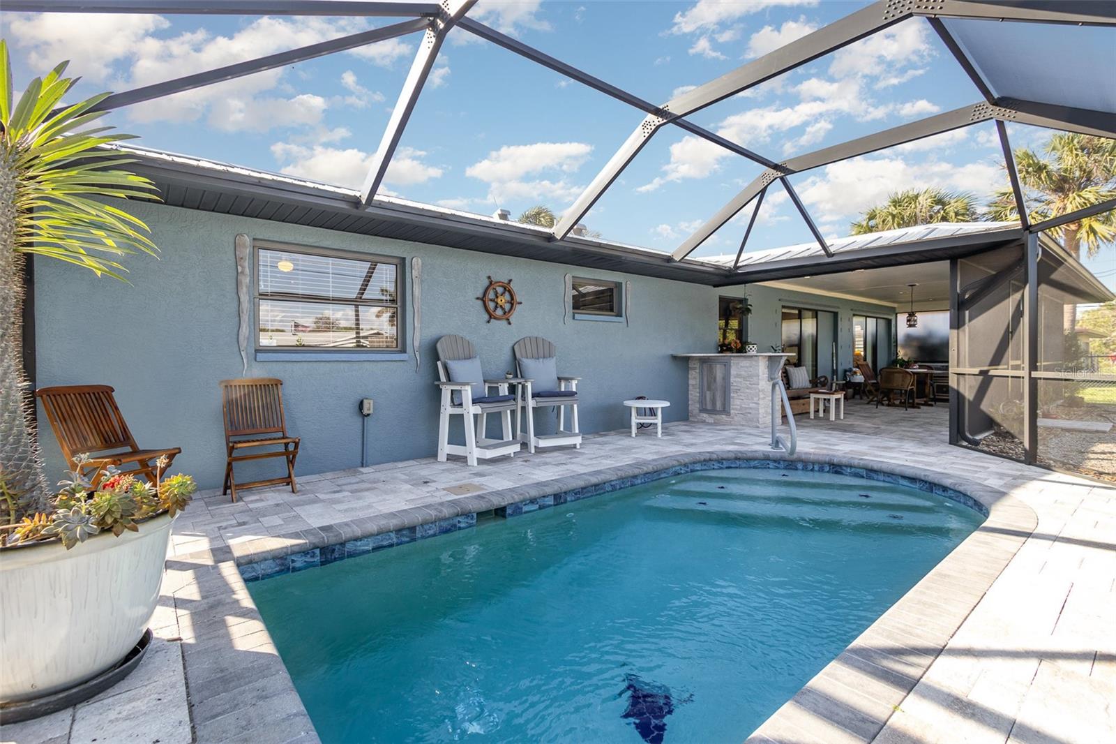 "Huge Price Improvement" Welcome to this stunning 2-bedroom, 2-bathroom with space for an office pool home, ideally located on two lots in a desirable area of Port Charlotte. Offering a split floorplan and a wealth of custom features, this home provides both comfort and style. The expansive master suite boasts French door entry, a large walk-in closet, and sliding door access to the back porch, where you can enjoy the tranquility of the private lanai. The en-suite bath features a spacious walk-in shower. On the opposite side of the home, you'll find a generously sized guest room (18x12') with a beautiful bathroom featuring a granite countertop and a vessel sink. The gourmet kitchen is a chef's dream with solid wood cabinets, granite countertops, stainless steel appliances, and a unique wood ceiling that adds a warm, inviting touch. For added convenience, the home includes an inside laundry room, offering the feel of a larger home. Step outside to the private lanai, complete with a paver deck (720sqft) and a large covered area perfect for entertaining. Relax in the hot tub, enjoy a cold drink at the standalone bar area, or take a dip in the refreshing saltwater, heated pool. Surrounded by mature landscaping and palm trees, this outdoor space feels like your own tropical oasis. Potential 16x30' dog run with minimal effort. The detached garage/workshop is a bonus, featuring a sink, air conditioning powered by a solar panel, and ample space for all your hobbies. The home is energy-efficient, thanks to the new metal roof installed before Hurricane Ian, and the custom-owned solar panels help keep electric bills around $80 a month. Other custom touches include plantation shutters, custom trim work, tile floors, and vaulted ceilings. “Bonus” the sewer assessment has already been paid in full! Located along the desirable Edgewater Corridor, you'll have easy access to everything Port Charlotte and Punta Gorda have to offer. This beautiful home truly has it all—don’t miss your chance to make it yours!