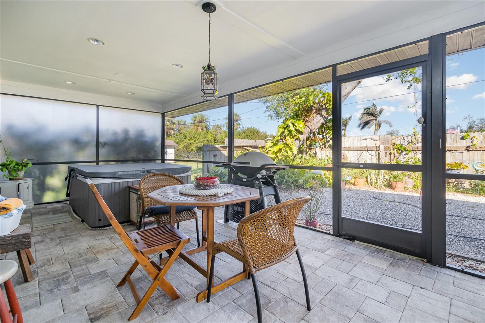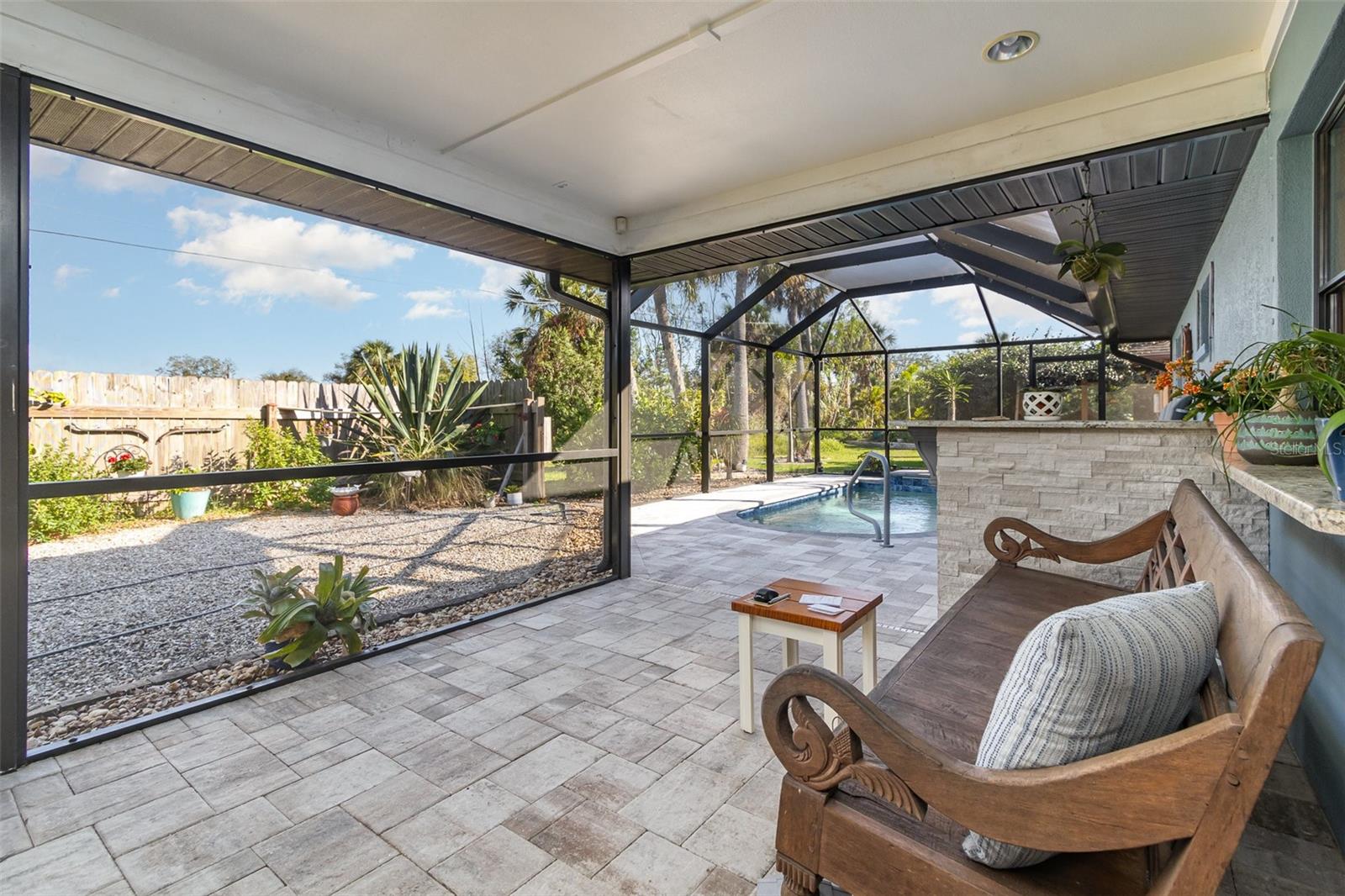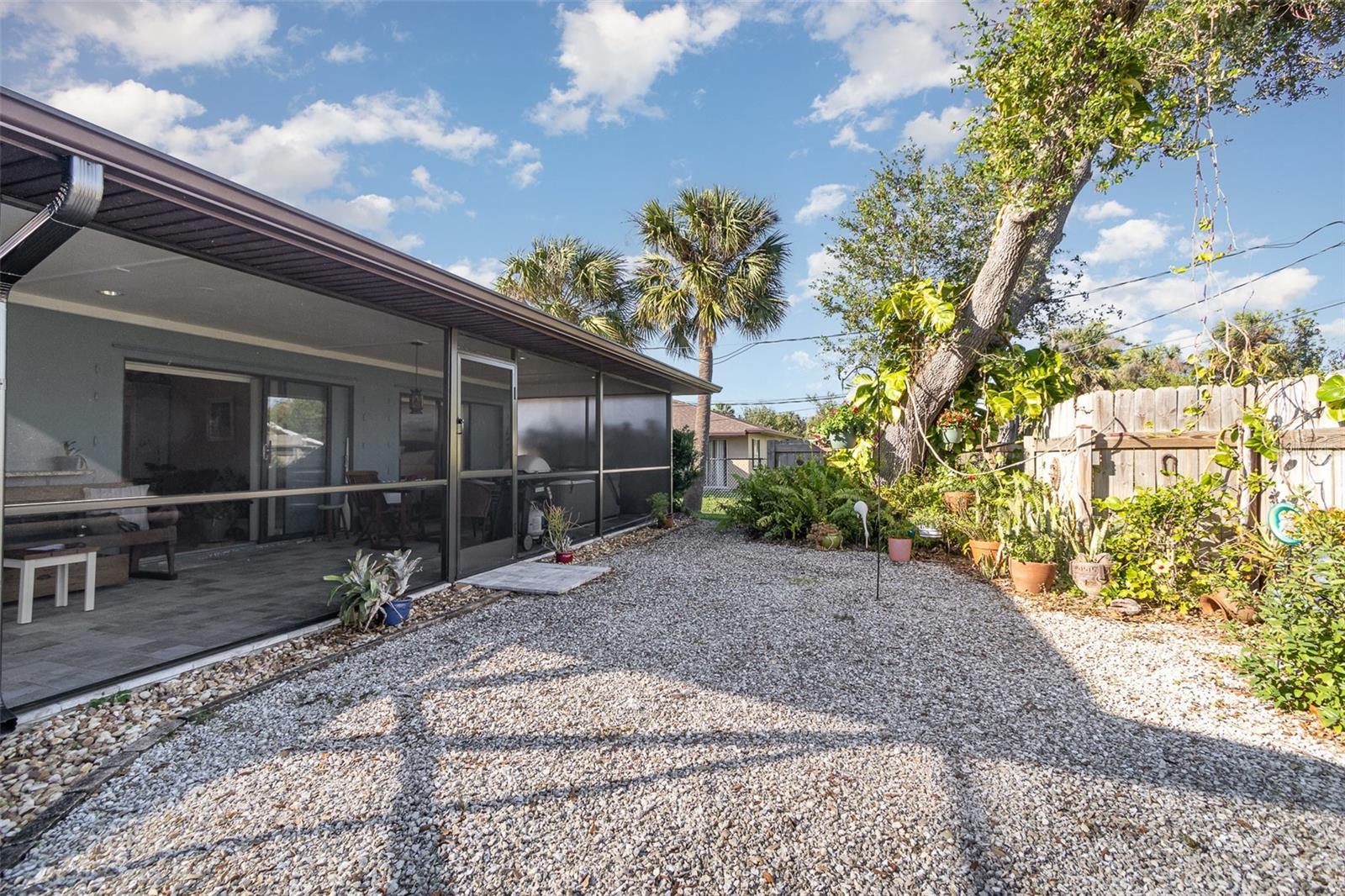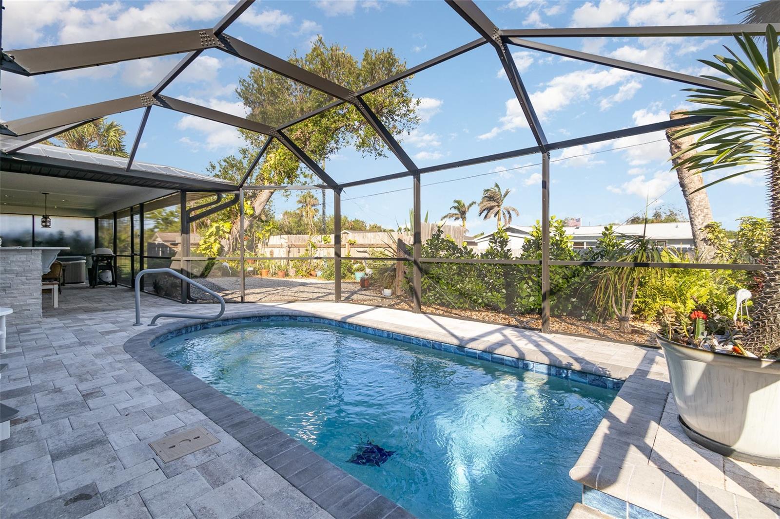 "Huge Price Improvement" Welcome to this stunning 2-bedroom, 2-bathroom with space for an office pool home, ideally located on two lots in a desirable area of Port Charlotte. Offering a split floorplan and a wealth of custom features, this home provides both comfort and style. The expansive master suite boasts French door entry, a large walk-in closet, and sliding door access to the back porch, where you can enjoy the tranquility of the private lanai. The en-suite bath features a spacious walk-in shower. On the opposite side of the home, you'll find a generously sized guest room (18x12') with a beautiful bathroom featuring a granite countertop and a vessel sink. The gourmet kitchen is a chef's dream with solid wood cabinets, granite countertops, stainless steel appliances, and a unique wood ceiling that adds a warm, inviting touch. For added convenience, the home includes an inside laundry room, offering the feel of a larger home. Step outside to the private lanai, complete with a paver deck (720sqft) and a large covered area perfect for entertaining. Relax in the hot tub, enjoy a cold drink at the standalone bar area, or take a dip in the refreshing saltwater, heated pool. Surrounded by mature landscaping and palm trees, this outdoor space feels like your own tropical oasis. Potential 16x30' dog run with minimal effort. The detached garage/workshop is a bonus, featuring a sink, air conditioning powered by a solar panel, and ample space for all your hobbies. The home is energy-efficient, thanks to the new metal roof installed before Hurricane Ian, and the custom-owned solar panels help keep electric bills around $80 a month. Other custom touches include plantation shutters, custom trim work, tile floors, and vaulted ceilings. “Bonus” the sewer assessment has already been paid in full! Located along the desirable Edgewater Corridor, you'll have easy access to everything Port Charlotte and Punta Gorda have to offer. This beautiful home truly has it all—don’t miss your chance to make it yours!