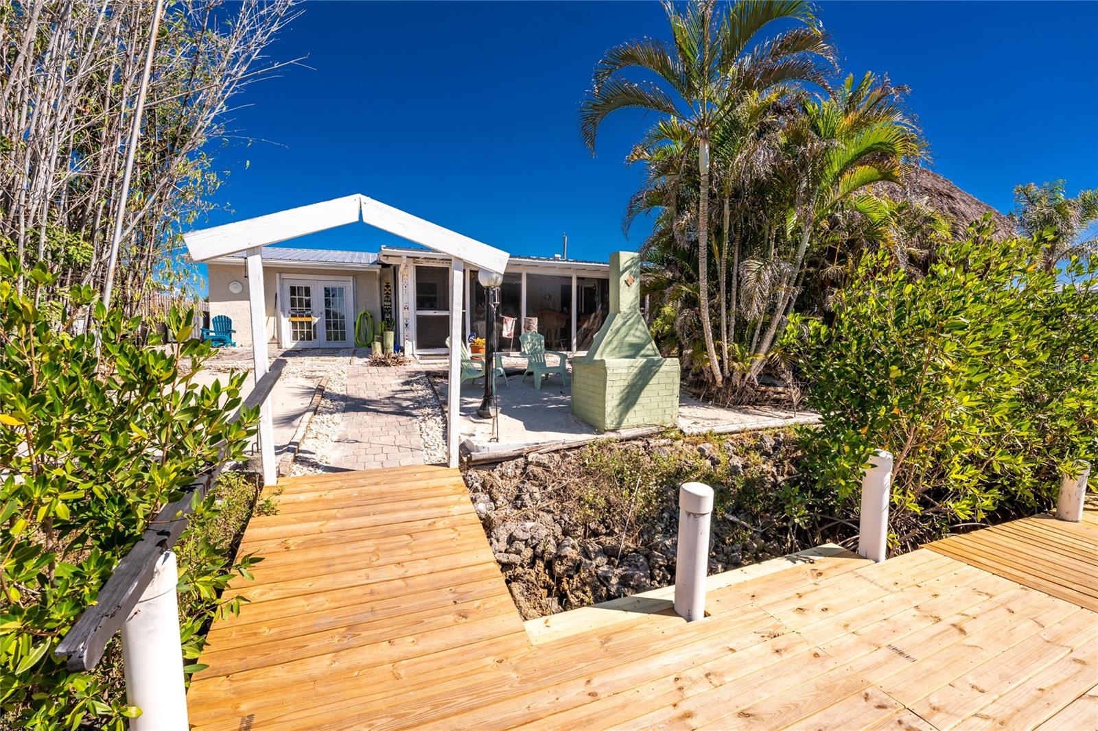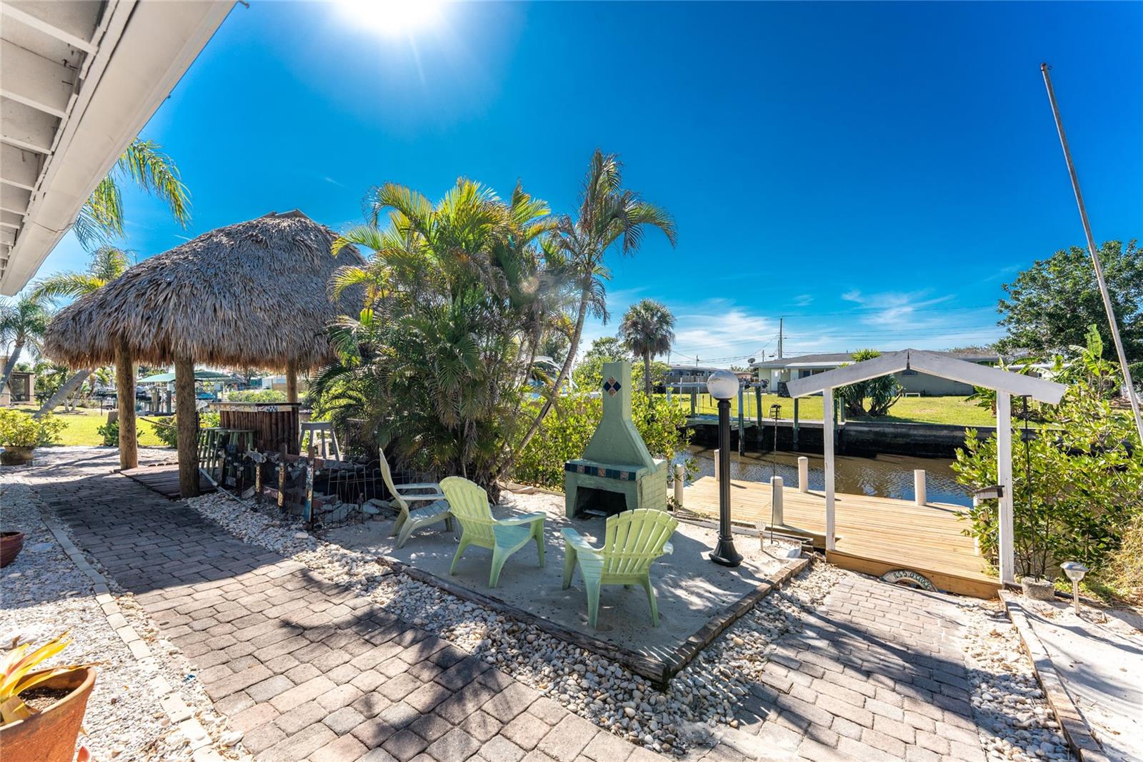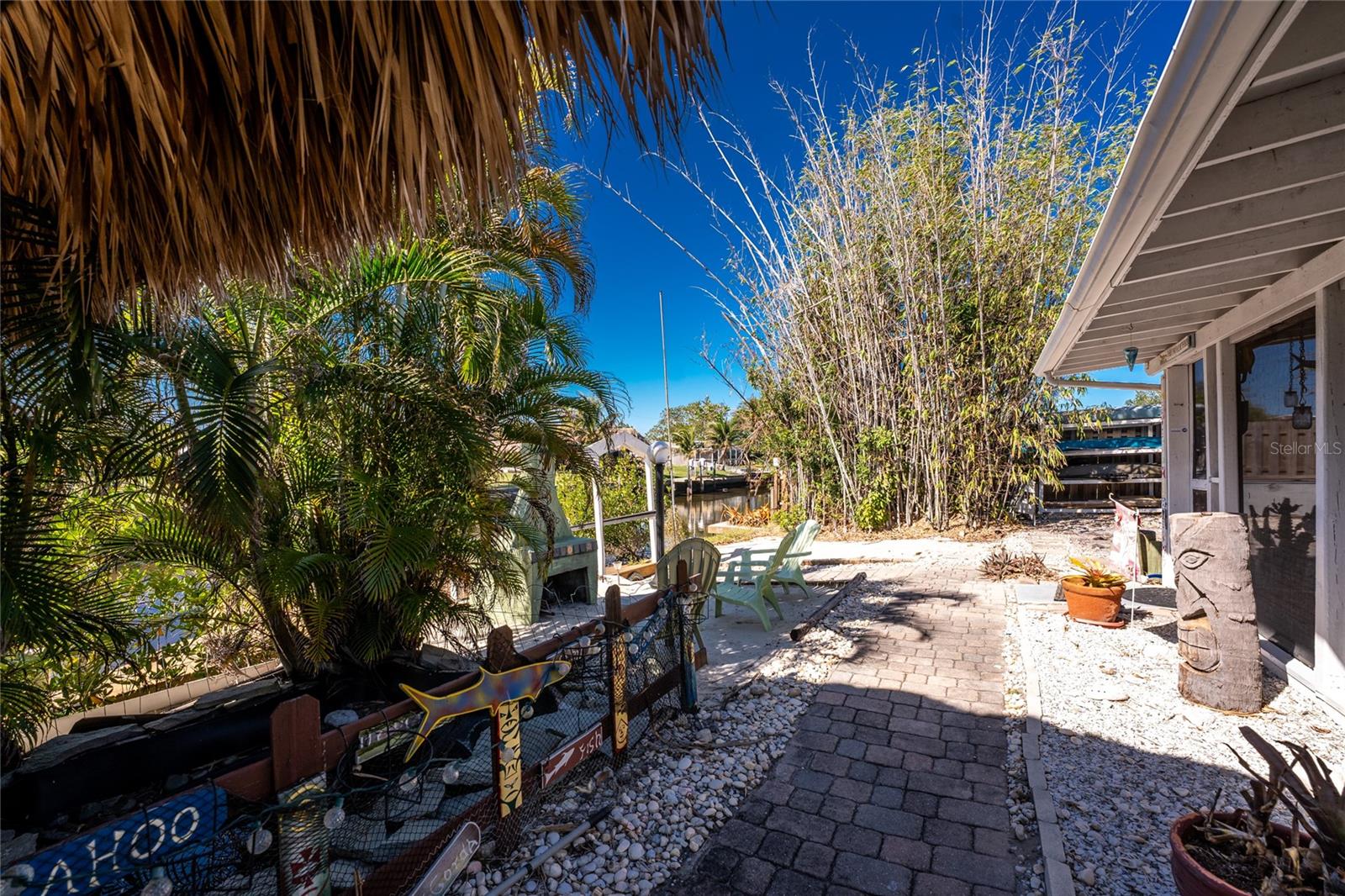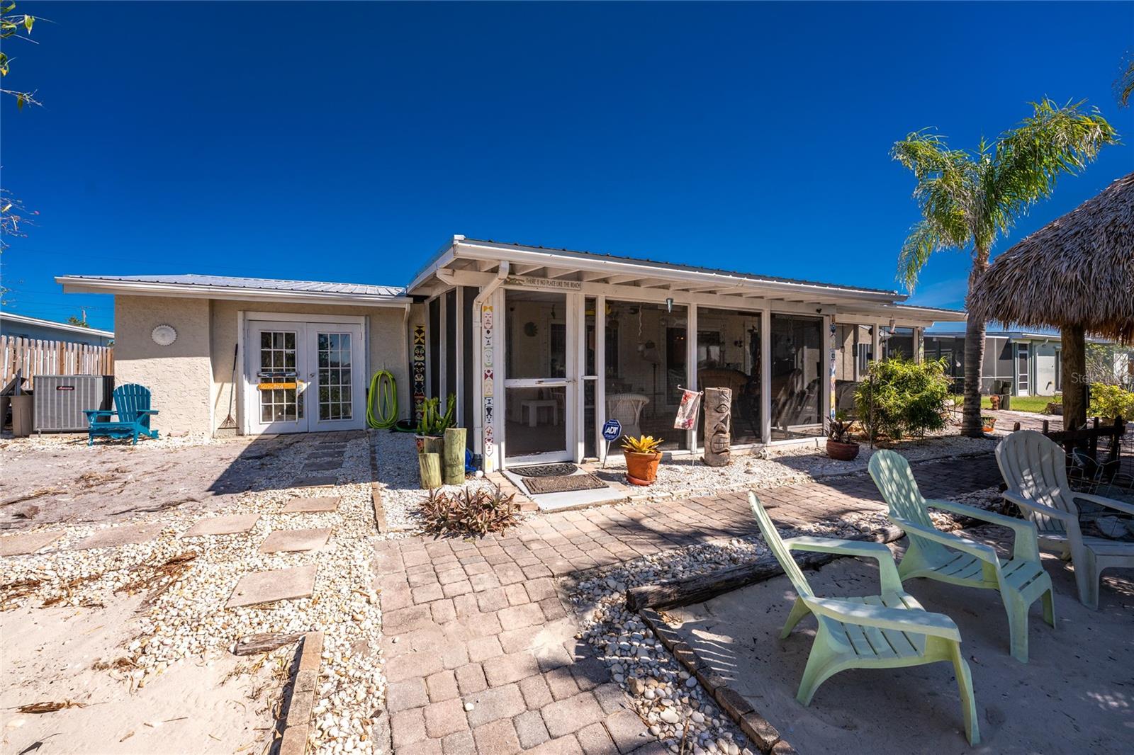 Your slice of paradise awaits! Check out this charming 3-bedroom, 2-bath GULF ACCESS home! Walking up, you'll be welcomed by a stunning courtyard adorned with a jasmine-lined trellis, creating a serene and inviting entrance. Step into the bright living room, where the open layout seamlessly connects to the dining area and the beautifully appointed kitchen. The kitchen is complete with granite countertops, a stylish tile backsplash, pantry, and an eat-in island—perfect for casual meals or entertaining. The split floor plan offers privacy, with the guest bedrooms to the left and the master suite to the right. You'll likely spend most of your time on the expansive screened-in patio—ideal for enjoying Florida’s beautiful weather. If you're looking for more ways to relax, head over to the Tiki bar for a refreshing drink or enjoy your morning coffee by the sanded fire pit. Other notable features include METAL ROOF(2023), ELECTRIC PANEL (2021), and HURRICANE SHUTTERS. Located just MINUTES from OPEN WATER. Close proximity to medical facilities, shopping, amenities, and vibrant DOWNTOWN Punta Gorda. Don’t miss out on this Florida retreat—schedule your showing today!
