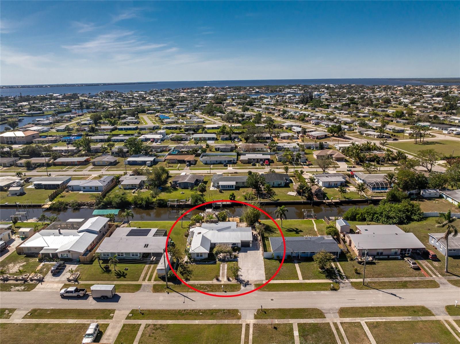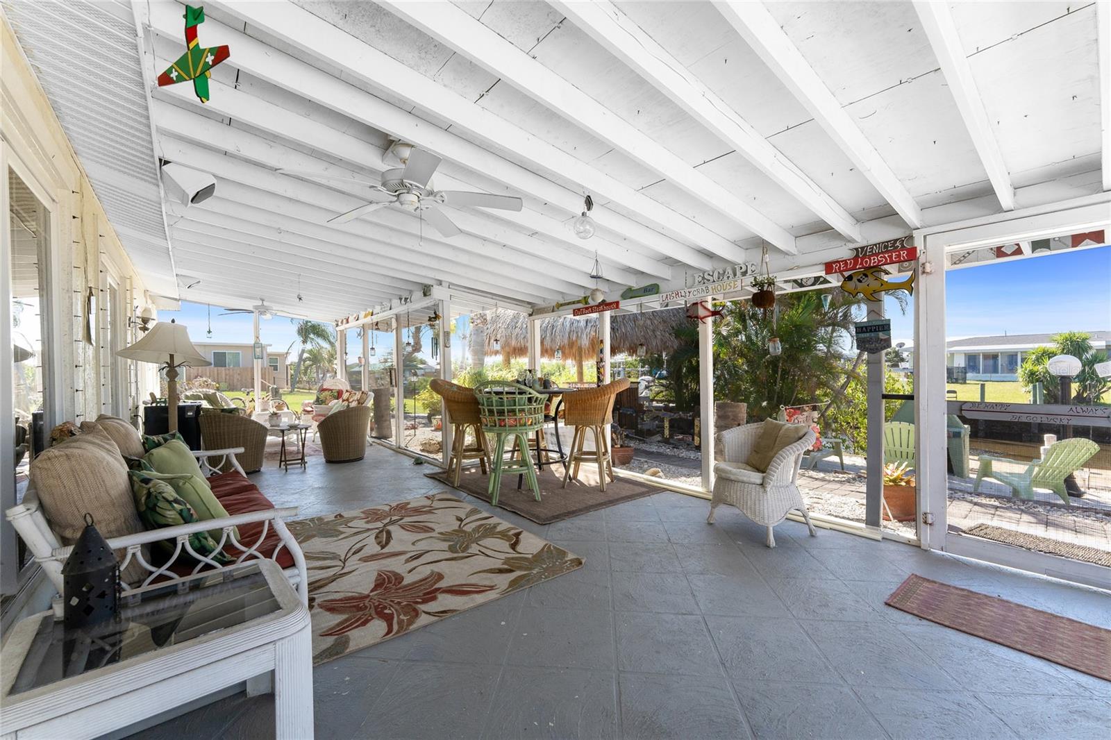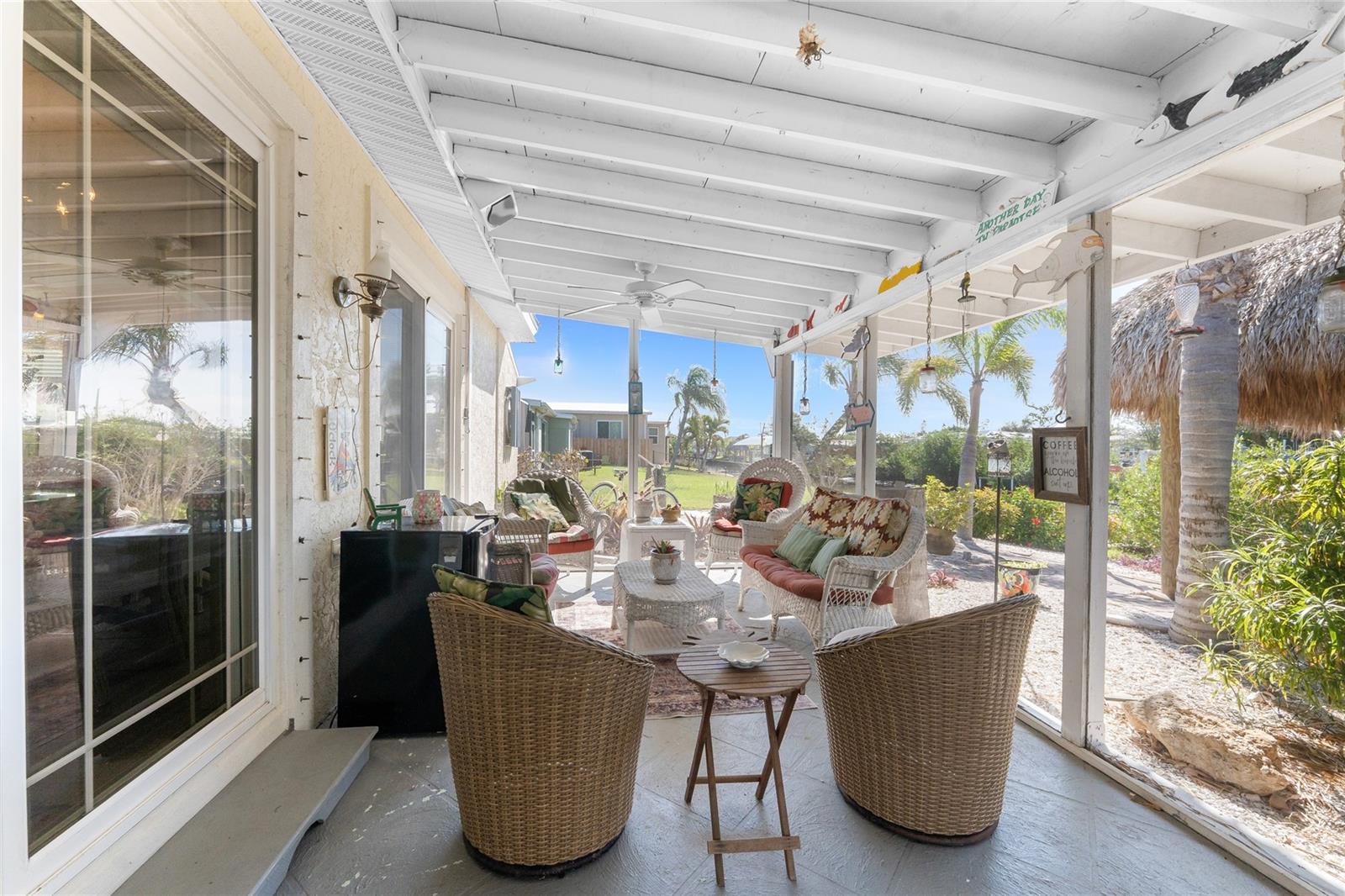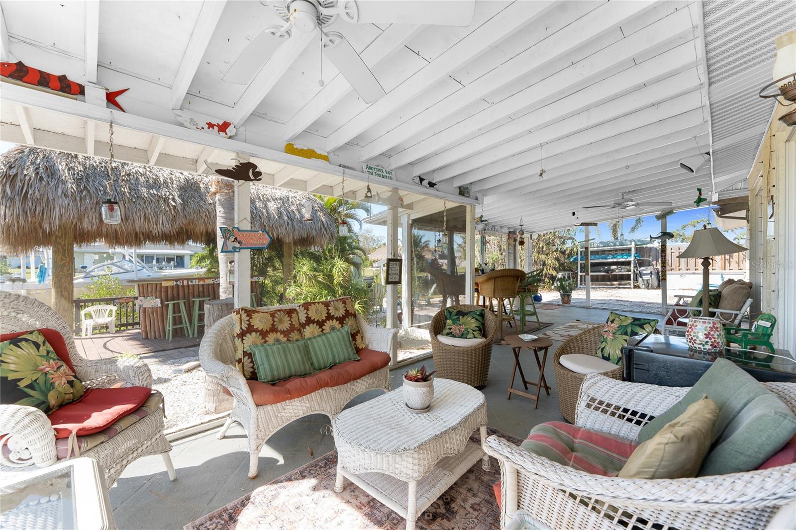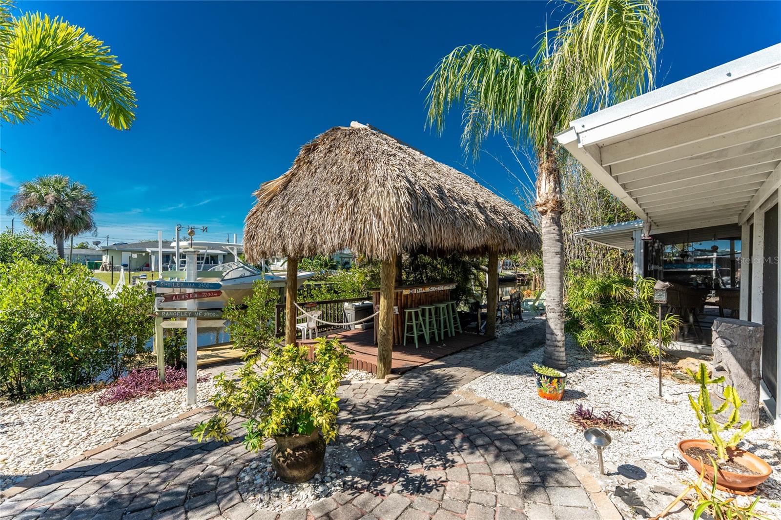 Your slice of paradise awaits! Check out this charming 3-bedroom, 2-bath GULF ACCESS home! Walking up, you'll be welcomed by a stunning courtyard adorned with a jasmine-lined trellis, creating a serene and inviting entrance. Step into the bright living room, where the open layout seamlessly connects to the dining area and the beautifully appointed kitchen. The kitchen is complete with granite countertops, a stylish tile backsplash, pantry, and an eat-in island—perfect for casual meals or entertaining. The split floor plan offers privacy, with the guest bedrooms to the left and the master suite to the right. You'll likely spend most of your time on the expansive screened-in patio—ideal for enjoying Florida’s beautiful weather. If you're looking for more ways to relax, head over to the Tiki bar for a refreshing drink or enjoy your morning coffee by the sanded fire pit. Other notable features include METAL ROOF(2023), ELECTRIC PANEL (2021), and HURRICANE SHUTTERS. Located just MINUTES from OPEN WATER. Close proximity to medical facilities, shopping, amenities, and vibrant DOWNTOWN Punta Gorda. Don’t miss out on this Florida retreat—schedule your showing today!