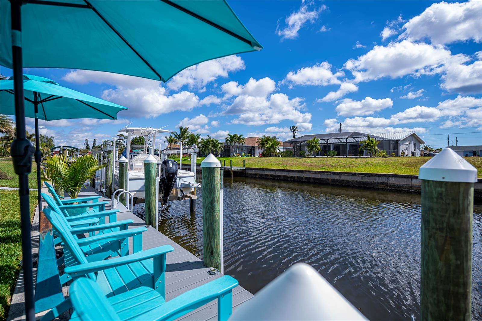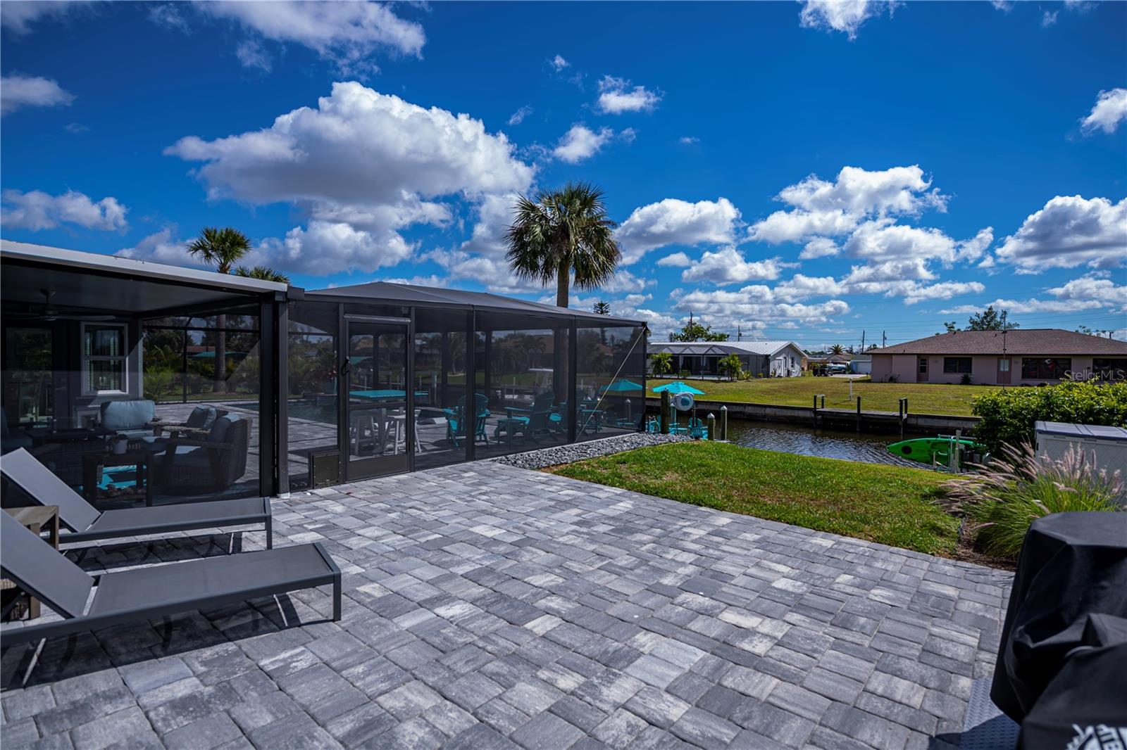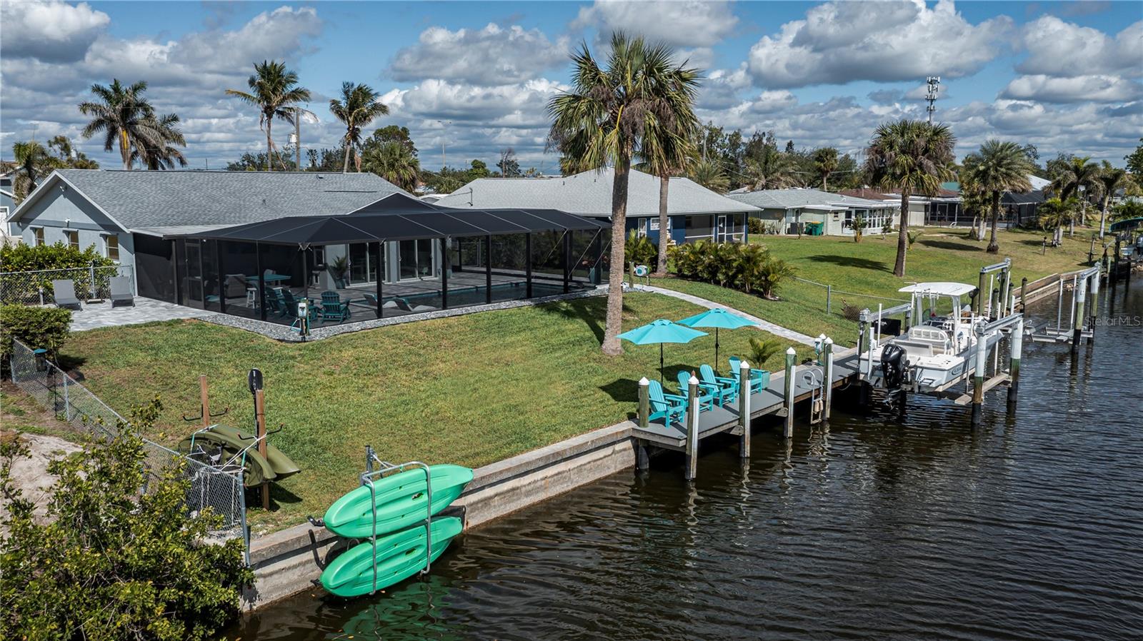 Here is a spectacular SALTWATER LOT BEAUTY on 90 ft of premium waterfront boasting quick gulf access and a stunningly spacious 3 bedroom, 2 bath with 2 car garage plus brand new HEATED SALTWATER POOL, and very low cost flood zone, higher elevation!! OPTION TO PURCHASE ADDITIONAL LOT NEXT DOOR! Instantly welcoming, enjoy the mature/ manicured landscaping, TASTEFULLY FURNISHED w/ OPTION TO PURCHASE, NO HOA, extra long driveway, city water and sewer, and a nicely fenced backyard adding even more to the all the longer list of upgrades this home provides. Experience gentle harbor breezes and abundant natural light, the foyer opens up to vaulted ceilings, gentle coastal colors, tall sliding glass doors and expansive waterfront/pool views! A chef worthy kitchen awaits, this home is designed for entertaining... rich shaker style cabinetry, stainless appliances including a double oven, granite countertops, and convenient breakfast bar with door to the big separate dining area adjacent to the family room all with designer lighting/fans,truly a wonderful open concept layout! The master bedroom is serene so relax in complete comfort with its own pool/screened lanai access, big walk- in closet, ensuite upgraded master bath complete with dual sinks and spa like rain head shower. Guests will have two premium bedrooms to choose from offering spacious closets, luxury vinyl flooring, one with a suspended tv and both share an exceptionally stylish bathroom with the rest of the main house. Inside laundry has matching samsung washer and dryer too. Enjoy picturesque sunsets every night and swim year round, BRAND NEW saltwater POOL is HEATED, superior screening and paver lined decking add to both the sunbathers or covered entertaining area. The magical sounds of the waterfall ledge relaxes and tantalizes your senses night or day while the baja shelf allows you to lounge lavishly and soak up the sun with toes gently cooling at the edge the pool. Outside enthusiasts will appreciate the open air paver patio deck, while boaters and fishing enjoy the ease of all from a very long 28 x 5 trex dock. With water and power, the boat lift will hold the largest power boats to be out in the harbor in merely minutes, its only a few bike-ride blocks away to the Port Charlotte Beach ! Kayak racks are also in place so your options to enjoy this dreamy florida lifestyle all MOVE IN READY (furniture includes list attached mls) are limitless. Port Charlotte Beach is a favorite biking area, with boat ramp, heated pool, both bocce ball and horseshoe pits, tennis courts, volleyball, playground, boardwalk, fishing pier, pavilions, picnic areas and recreation center, dog friendly and INCREDIBLE SUNSETS! Close to historic downtown Punta Gorda, sunseeeker resort, dining, farmers markets, festivals, PG Airport, shopping and more. Don't let this great DOUBLE SALTWATERFRONT opportunity disappear, a must see so hurry to schedule your showing TODAY!