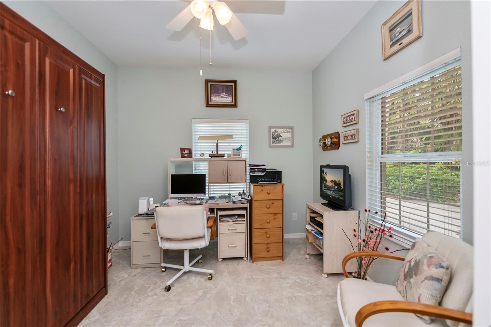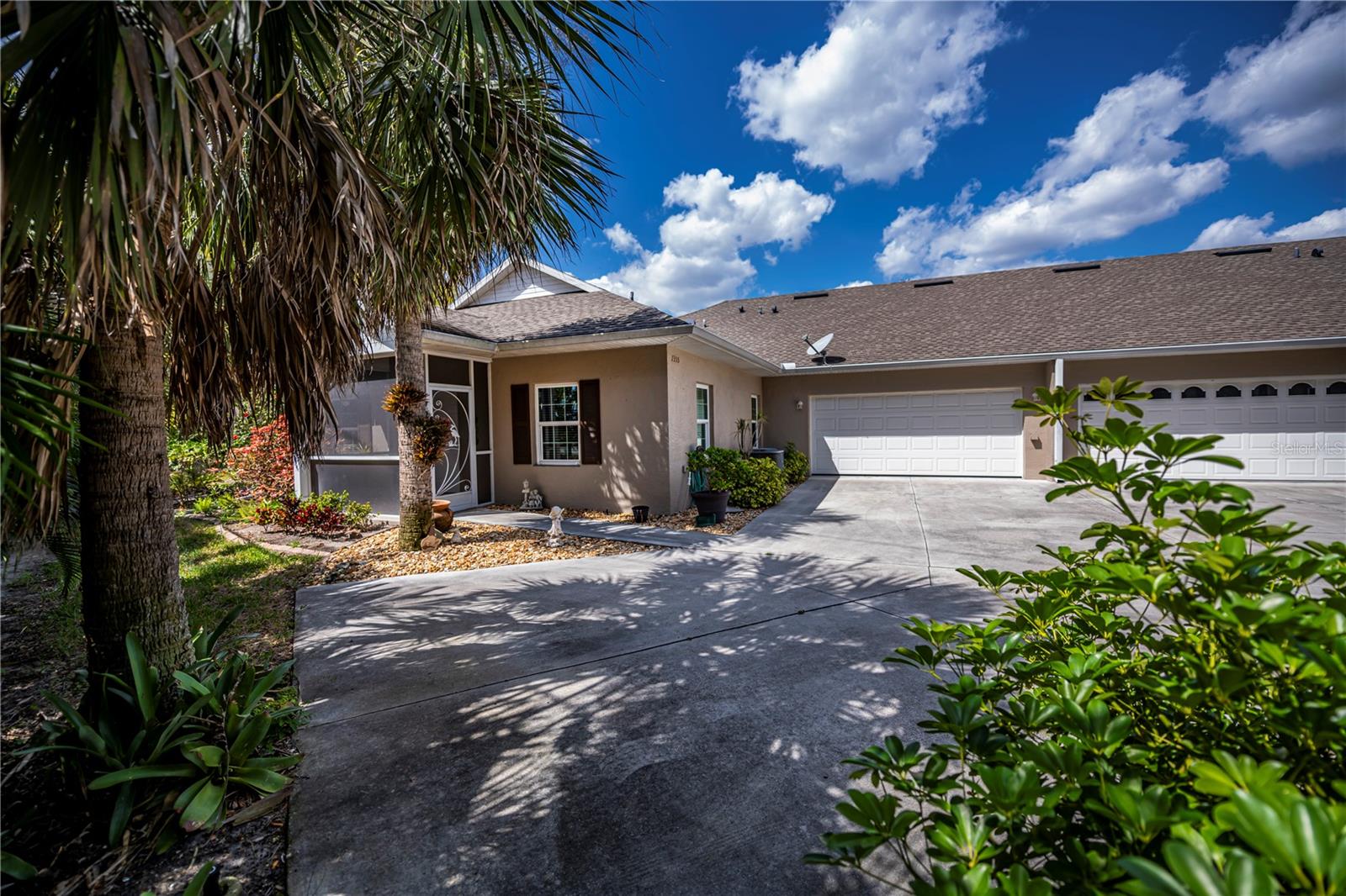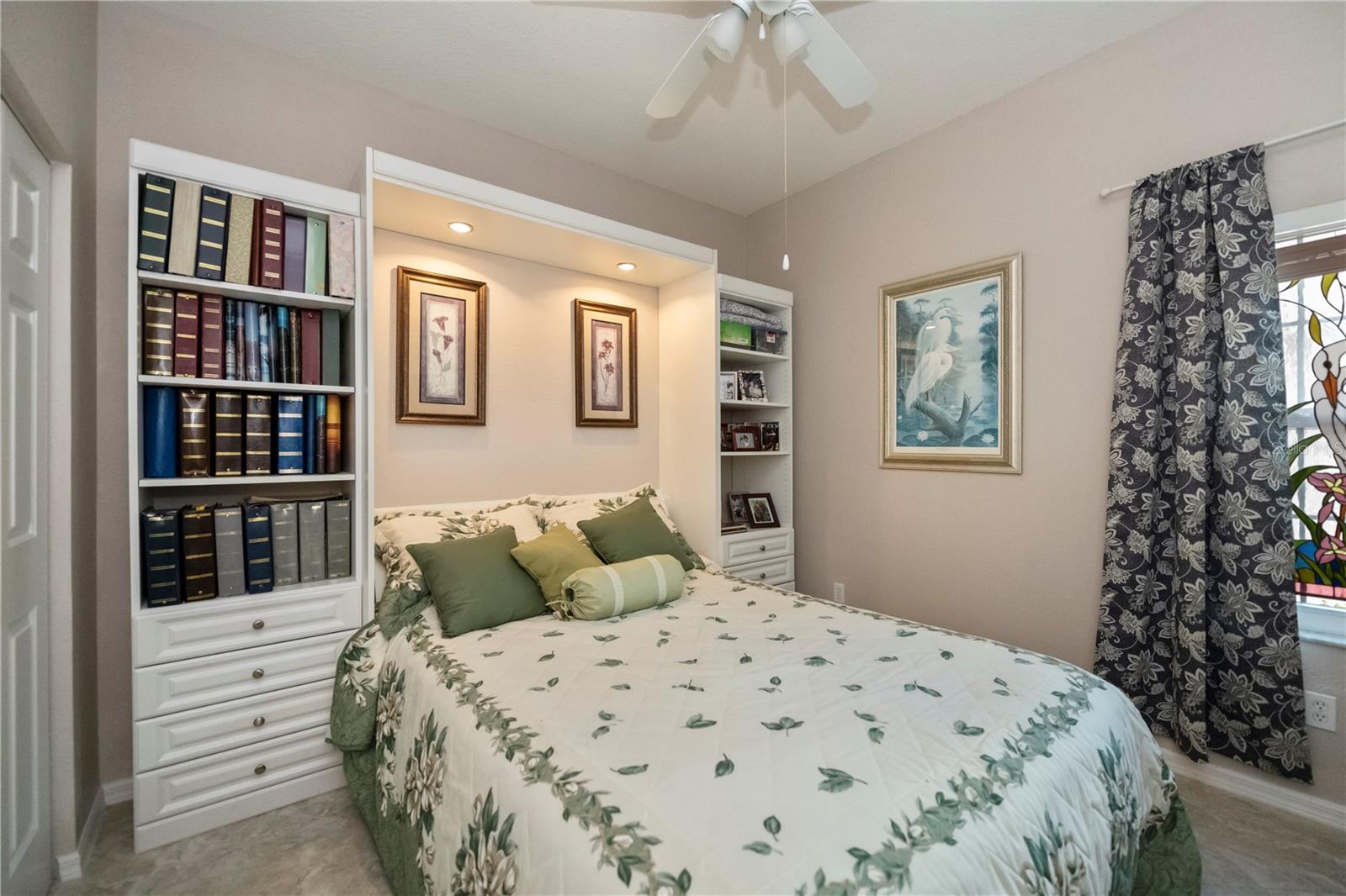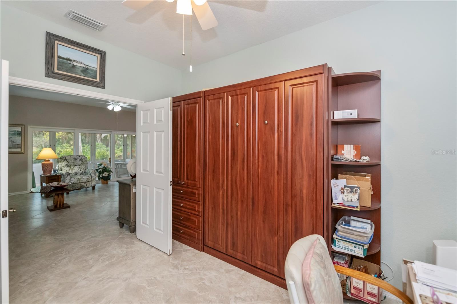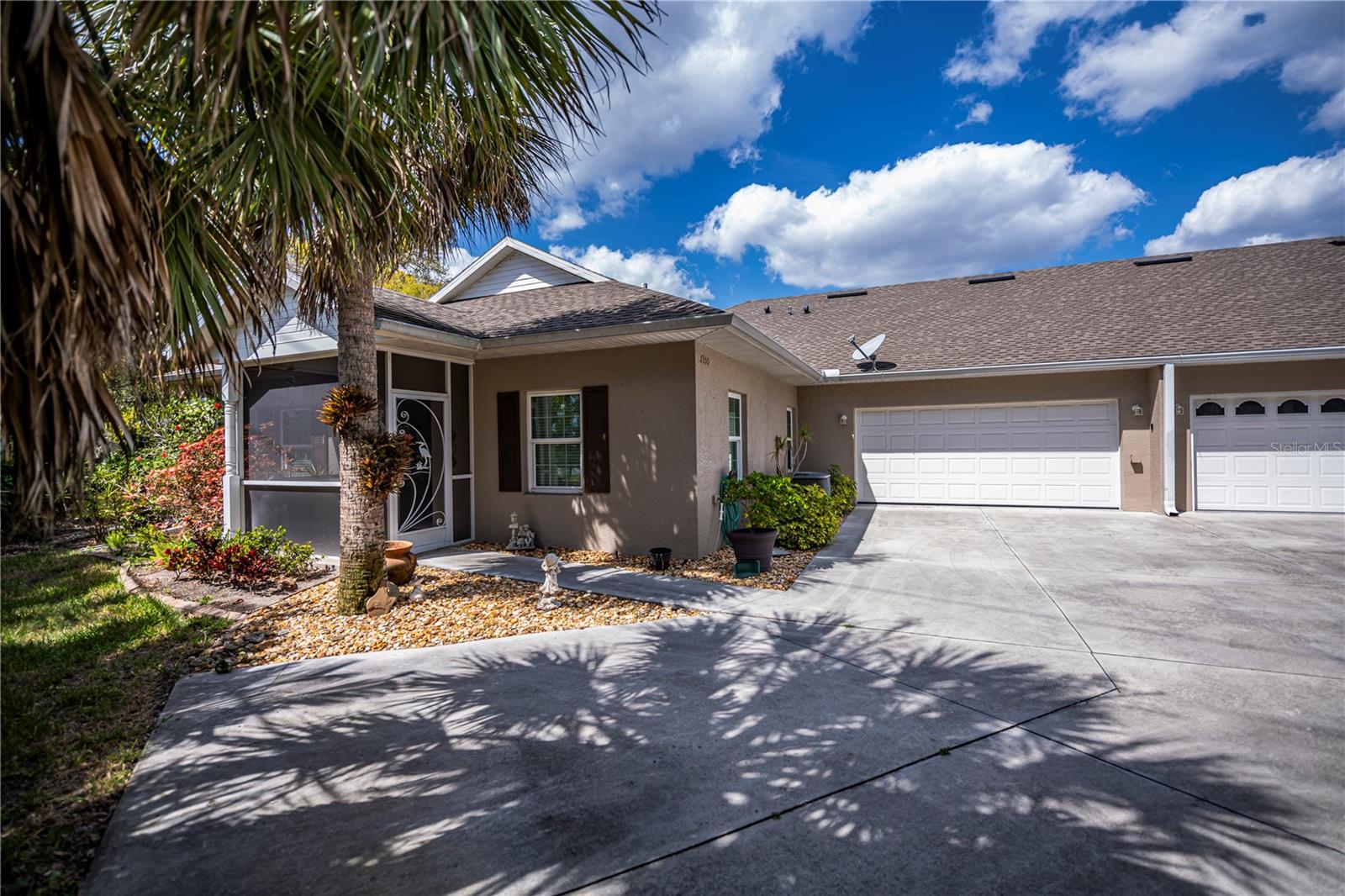 Pride of ownership shows in this immaculate upgraded beautifully TURNKEY FURNISHED villa. This is an absolute must see gem. As you enter thru the screened tiled front porch you are greeted with a bright & light great room opening to the gorgeous cook's kitchen w/wood cabinets, crown molding, soft close drawers, pull out drawers in bottom cabinets, granite counters w/undercounter sink, & includes top-of-the-line appliances, inc. Bosch dishwasher, Samsung French door refrigerator, & GE smooth top drop in range. Tile floors on the diagonal are everywhere which makes the rooms all flow together. Third bedroom/den is off the great room & has French doors, built in full murphy bed w/cabinets w/closet/storage space. Good sized master bedroom w/2 walk-in closets & ensuite master bath w/high vanity w/dual sinks, & walk-in shower w/handicap bar. Split bedroom floorplan to give guests privacy. Second bedroom has built-in queen murphy w/storage. Interior laundry closet w/full size LG top load washer & dryer. & shelving for storage. Bay of sliders in the great room opens to the enclosed Florida room that is tiled & can be used year-round. Garage has coated floor, newer hurricane garage door, pull down staircase, drop down storage, storage shelves, & laundry tub. All of that plus IMPACT WINDOWS & DOOR, freshy painted interior within last 4 years, new A/C Heat in 2019, Water heater in 2018, & new roof in 2018. Located in sought after Heritage Oak Park-a gated active community with a full-time activity's director on staff planning many activities for your enjoyment. Other amenities include a large clubhouse, heated pool, fitness room, billiards room, lending library, bocce ball, shuffleboard, tennis, pickleball, & walking path around the lake. Community was built around all the old native oak trees which gives you the feeling that you are in the country yet conveniently located to shopping & restaurants.