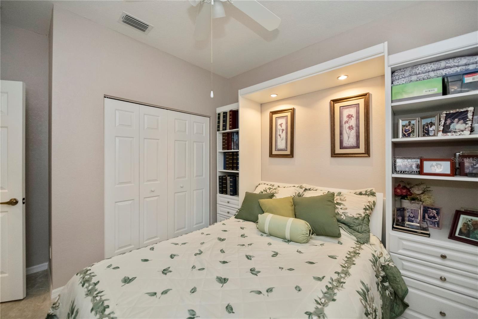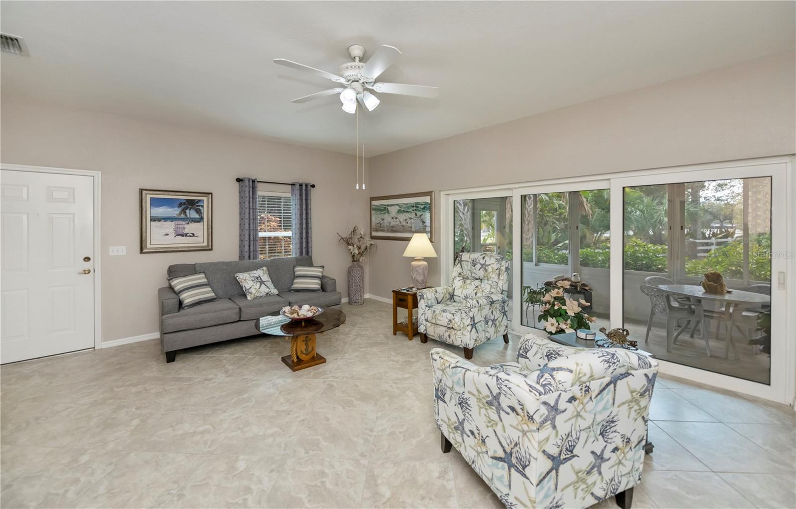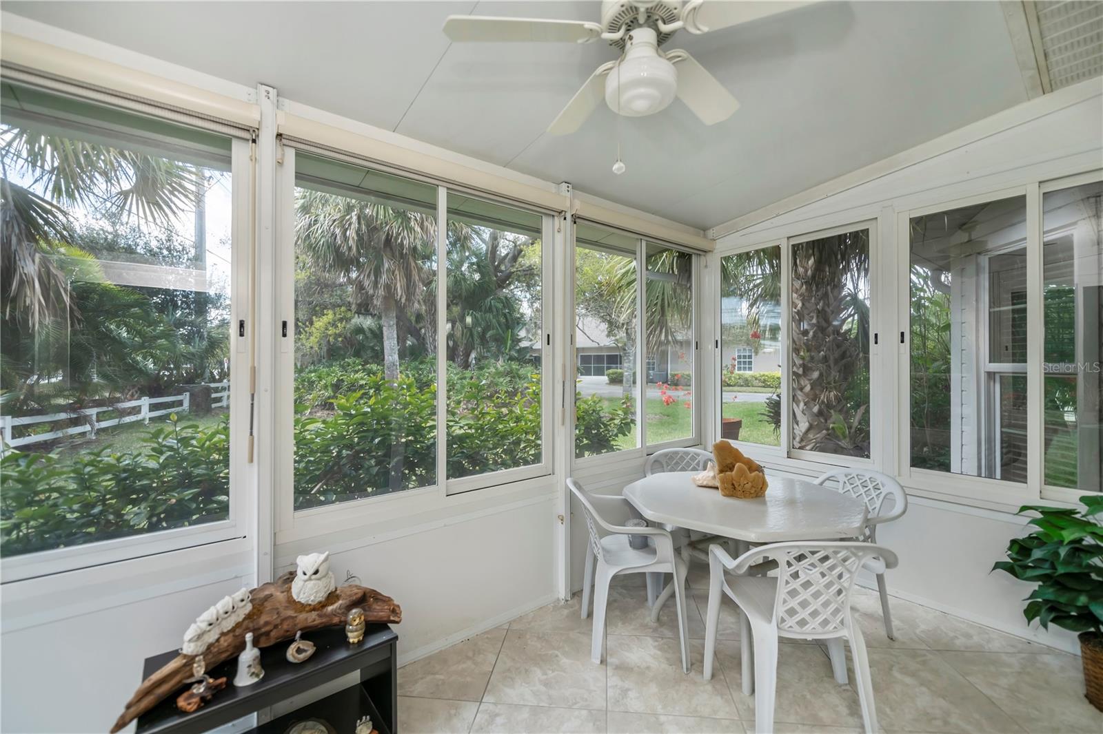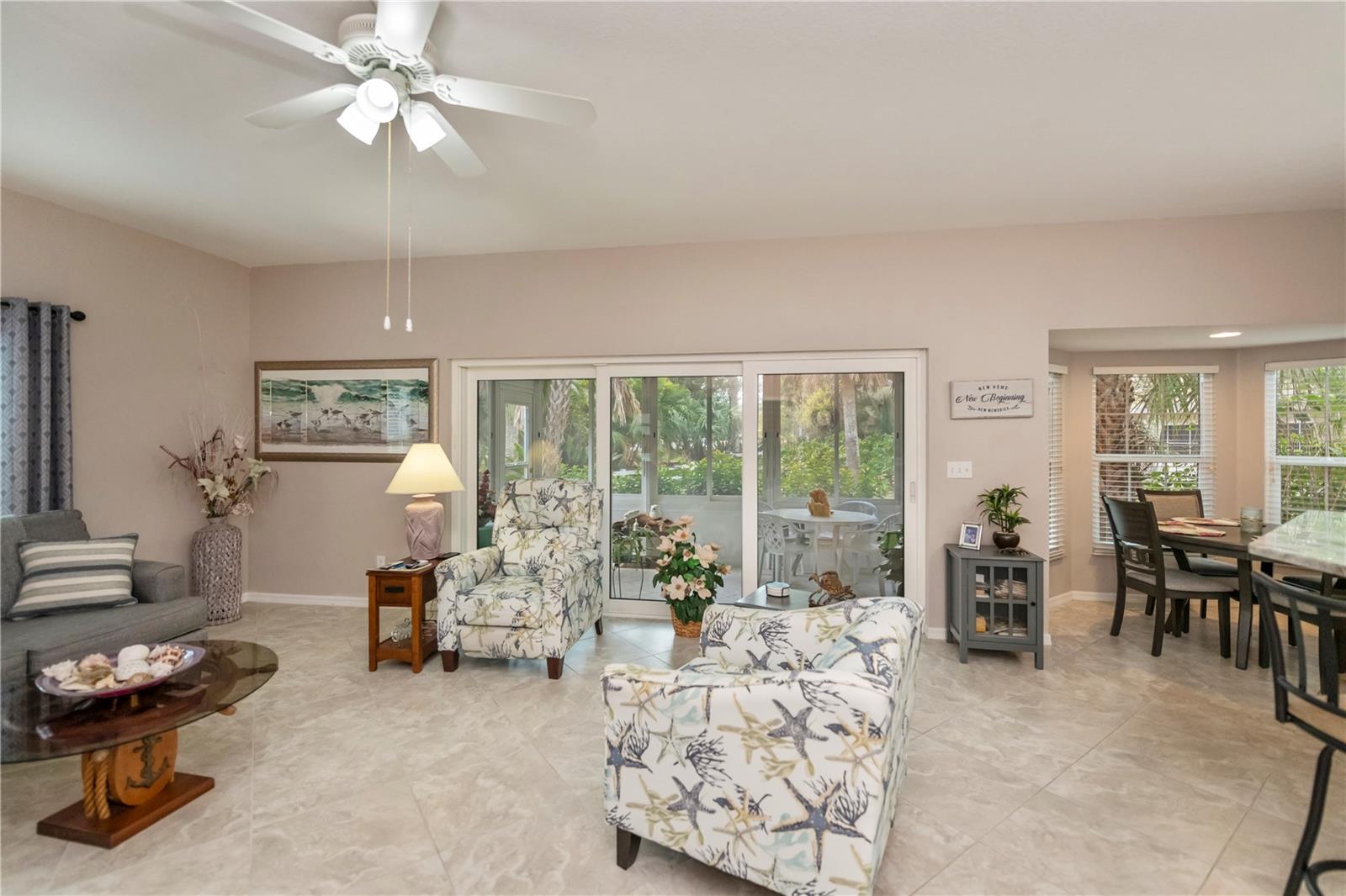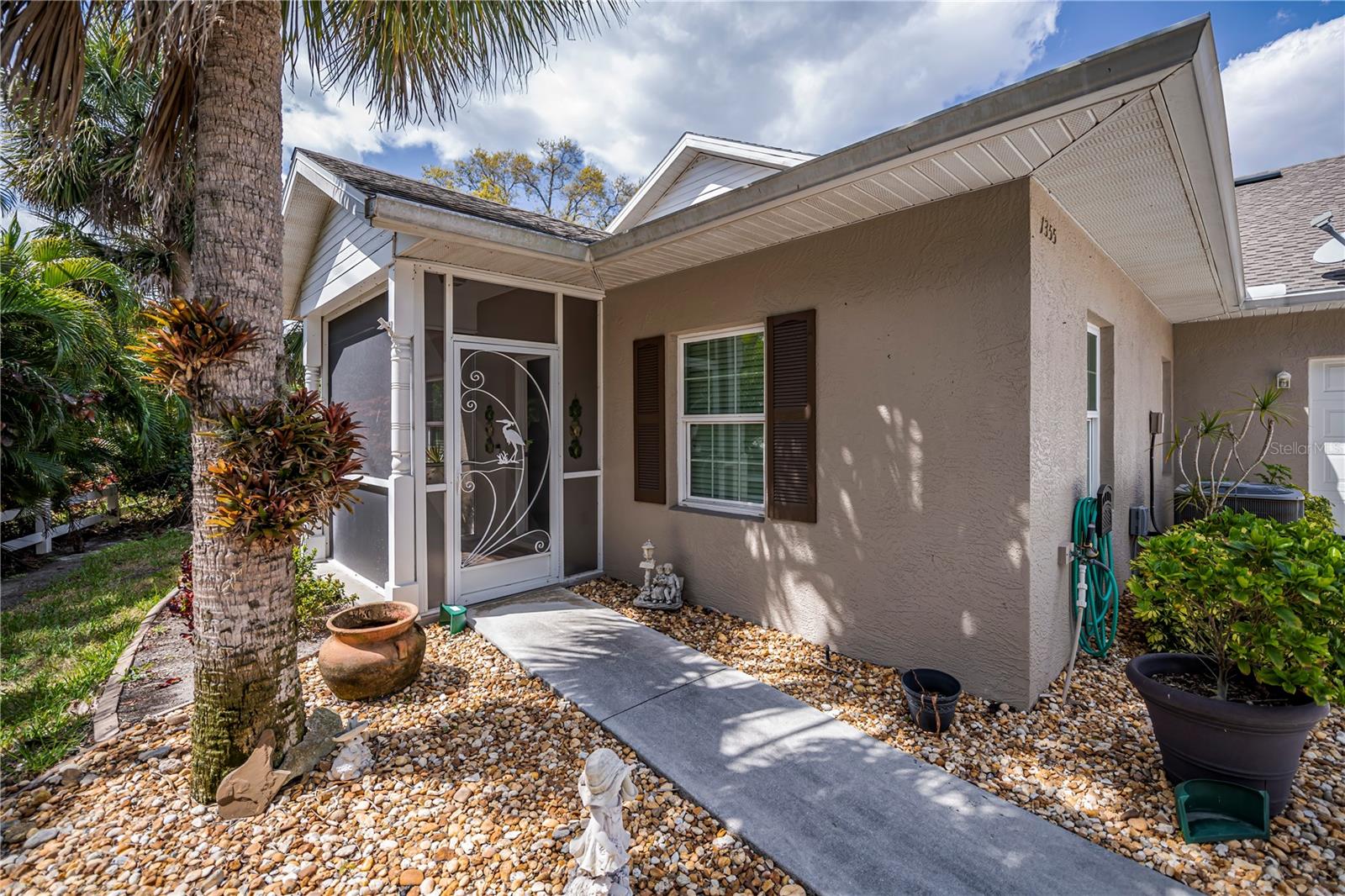 Pride of ownership shows in this immaculate upgraded beautifully TURNKEY FURNISHED villa. This is an absolute must see gem. As you enter thru the screened tiled front porch you are greeted with a bright & light great room opening to the gorgeous cook's kitchen w/wood cabinets, crown molding, soft close drawers, pull out drawers in bottom cabinets, granite counters w/undercounter sink, & includes top-of-the-line appliances, inc. Bosch dishwasher, Samsung French door refrigerator, & GE smooth top drop in range. Tile floors on the diagonal are everywhere which makes the rooms all flow together. Third bedroom/den is off the great room & has French doors, built in full murphy bed w/cabinets w/closet/storage space. Good sized master bedroom w/2 walk-in closets & ensuite master bath w/high vanity w/dual sinks, & walk-in shower w/handicap bar. Split bedroom floorplan to give guests privacy. Second bedroom has built-in queen murphy w/storage. Interior laundry closet w/full size LG top load washer & dryer. & shelving for storage. Bay of sliders in the great room opens to the enclosed Florida room that is tiled & can be used year-round. Garage has coated floor, newer hurricane garage door, pull down staircase, drop down storage, storage shelves, & laundry tub. All of that plus IMPACT WINDOWS & DOOR, freshy painted interior within last 4 years, new A/C Heat in 2019, Water heater in 2018, & new roof in 2018. Located in sought after Heritage Oak Park-a gated active community with a full-time activity's director on staff planning many activities for your enjoyment. Other amenities include a large clubhouse, heated pool, fitness room, billiards room, lending library, bocce ball, shuffleboard, tennis, pickleball, & walking path around the lake. Community was built around all the old native oak trees which gives you the feeling that you are in the country yet conveniently located to shopping & restaurants.