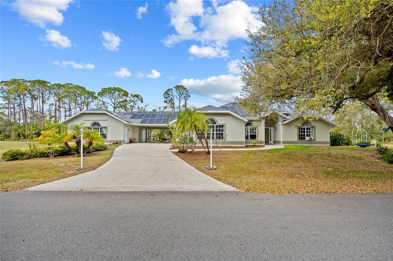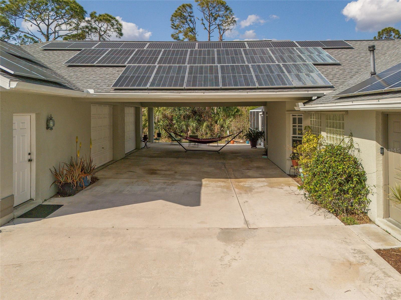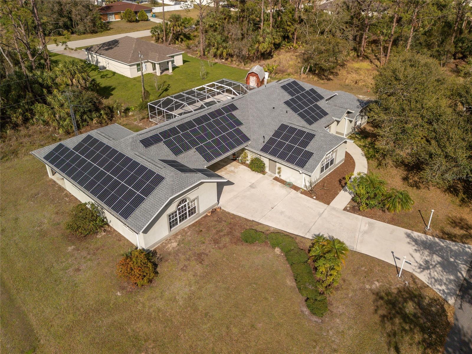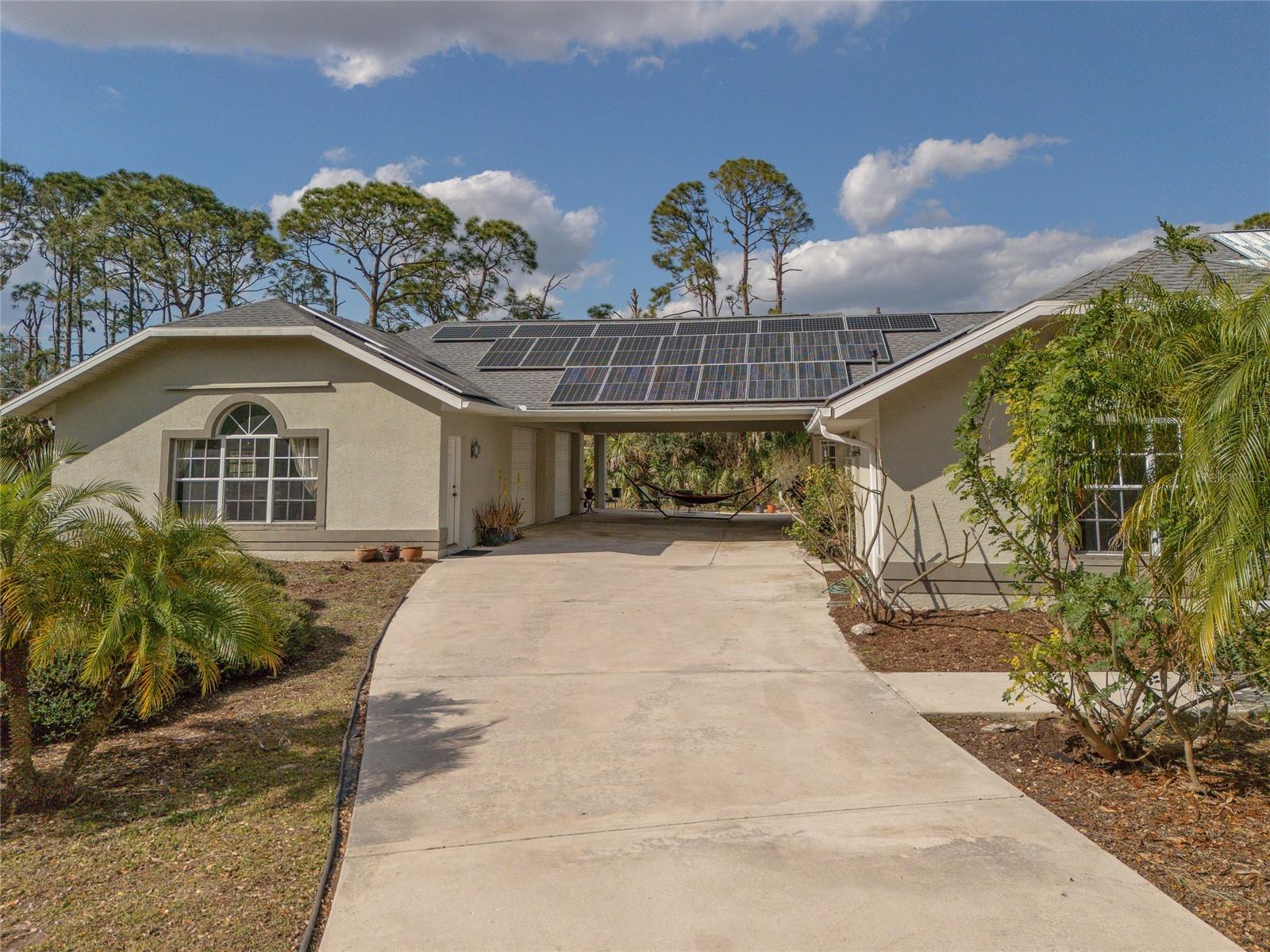 TRIPLE LOT! POWERFUL WHOLE HOME SOLAR FOR ENERGY INDEPENDENCE! Spacious 4 bedroom + bonus room, 3 bath, pool home nestled in a peaceful, beautiful neighborhood, where all essential stores can be accessed without ever having to navigate busy main roads. Inviting open floor plan features high ceilings, skylights, tile flooring, large slider to lanai in living and lots of windows for an abundance of light. Split floor plan provides privacy for all including walk-in closets and bath access from every bedroom. Expansive outdoor living space offers 5,000 sq. ft. of concrete boasting a massive four-car breezeway, an extra-long driveway, and two spacious back porches. One porch features a fully screened PebbleTec pool with in-floor cleaning jets, offering a relaxing and low-maintenance oasis. The property features a large solar system that generates an impressive 40 MWh per year—that’s enough energy to power about 3–4 average U.S. homes annually! Combined with propane-heated hot water and a dedicated gas line behind the stove, the home is highly energy-efficient. Living in Southwest Florida, adding batteries would make it fully off-grid and self-sustaining. SOLAR LOAN TO BE ASSUMED BY BUYER. The oversized garage features large storage room and a versatile fully insulated and air-conditioned 220 sq. ft. shop providing endless possibilities—whether for multigenerational living, a home office, a gym, or a yoga studio. With ample storage space, it’s a perfect retreat for work or hobbies. Additional features include new roof in 2022, hurricane protection and security system. It's the perfect blend of tranquility and convenience. The property is surrounded by abundant nature and thriving plants featuring a variety of lush plants, including a majestic heritage oak, food-producing plants, and pollinator-friendly flora. It has bananas, hog plums, moringa, red hibiscus, dragon fruit, prickly pear, and aloe—creating a self-sustaining, vibrant ecosystem. Great location close to Murdock restaurant and shopping district and Cocoplum Plaza, Centennial Park, schools, golf and a short drive fishing, boating and Venice beaches. Don’t miss this opportunity! Schedule your private showing today! -OWNER OCCUPIED- CAMERAS ON PROPERTY.