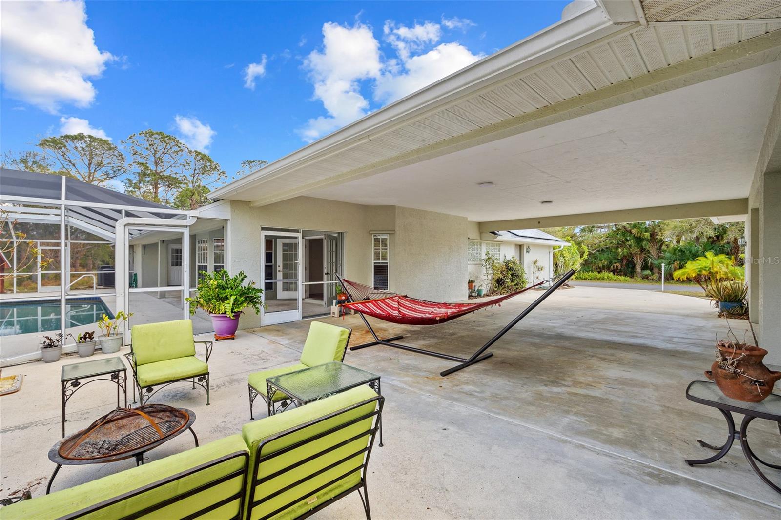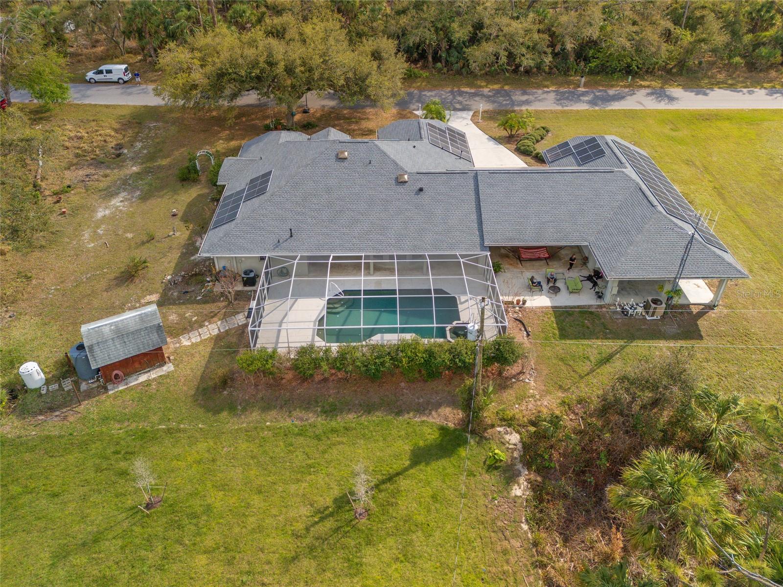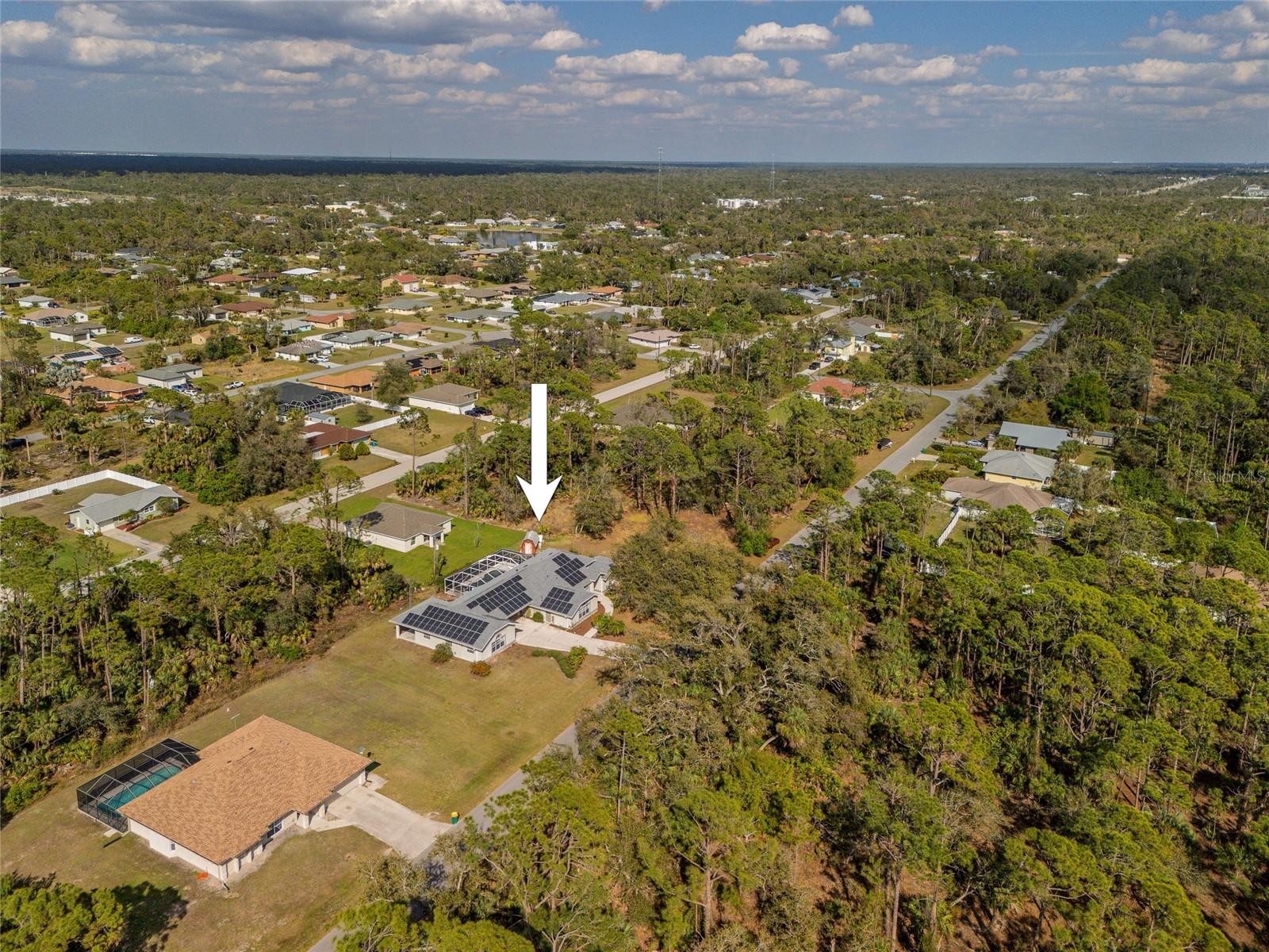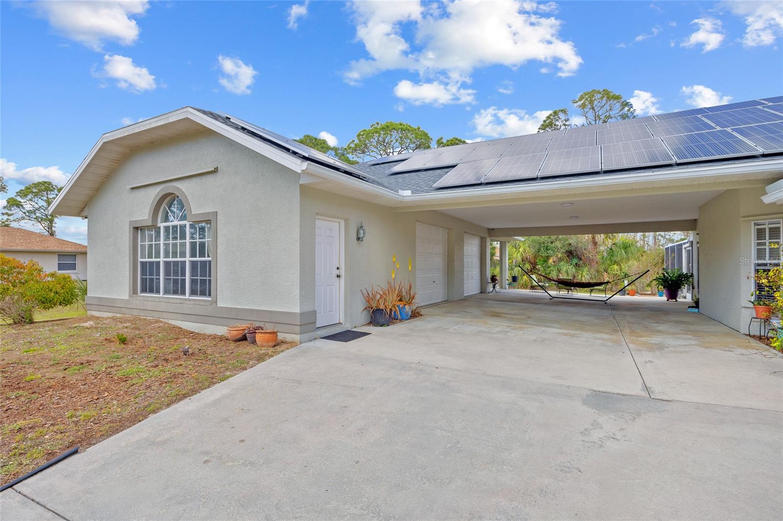 TRIPLE LOT! POWERFUL WHOLE HOME SOLAR FOR ENERGY INDEPENDENCE! Spacious 4 bedroom + bonus room, 3 bath, pool home nestled in a peaceful, beautiful neighborhood, where all essential stores can be accessed without ever having to navigate busy main roads. Inviting open floor plan features high ceilings, skylights, tile flooring, large slider to lanai in living and lots of windows for an abundance of light. Split floor plan provides privacy for all including walk-in closets and bath access from every bedroom. Expansive outdoor living space offers 5,000 sq. ft. of concrete boasting a massive four-car breezeway, an extra-long driveway, and two spacious back porches. One porch features a fully screened PebbleTec pool with in-floor cleaning jets, offering a relaxing and low-maintenance oasis. The property features a large solar system that generates an impressive 40 MWh per year—that’s enough energy to power about 3–4 average U.S. homes annually! Combined with propane-heated hot water and a dedicated gas line behind the stove, the home is highly energy-efficient. Living in Southwest Florida, adding batteries would make it fully off-grid and self-sustaining. SOLAR LOAN TO BE ASSUMED BY BUYER. The oversized garage features large storage room and a versatile fully insulated and air-conditioned 220 sq. ft. shop providing endless possibilities—whether for multigenerational living, a home office, a gym, or a yoga studio. With ample storage space, it’s a perfect retreat for work or hobbies. Additional features include new roof in 2022, hurricane protection and security system. It's the perfect blend of tranquility and convenience. The property is surrounded by abundant nature and thriving plants featuring a variety of lush plants, including a majestic heritage oak, food-producing plants, and pollinator-friendly flora. It has bananas, hog plums, moringa, red hibiscus, dragon fruit, prickly pear, and aloe—creating a self-sustaining, vibrant ecosystem. Great location close to Murdock restaurant and shopping district and Cocoplum Plaza, Centennial Park, schools, golf and a short drive fishing, boating and Venice beaches. Don’t miss this opportunity! Schedule your private showing today! -OWNER OCCUPIED- CAMERAS ON PROPERTY.