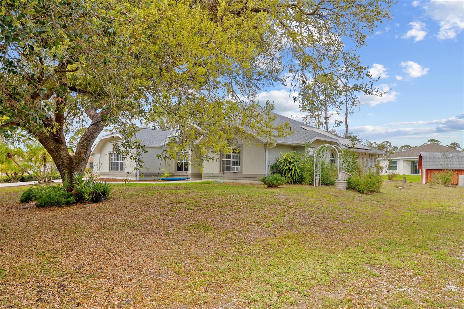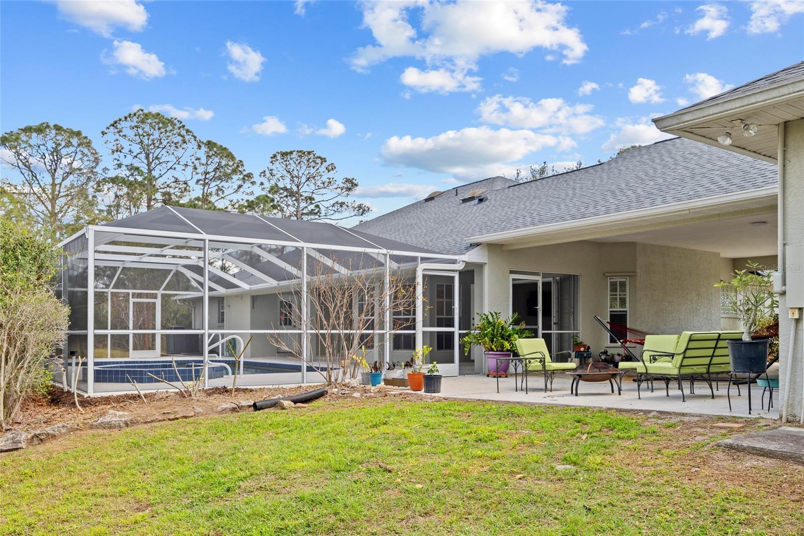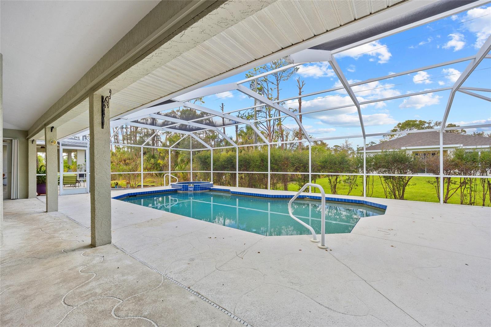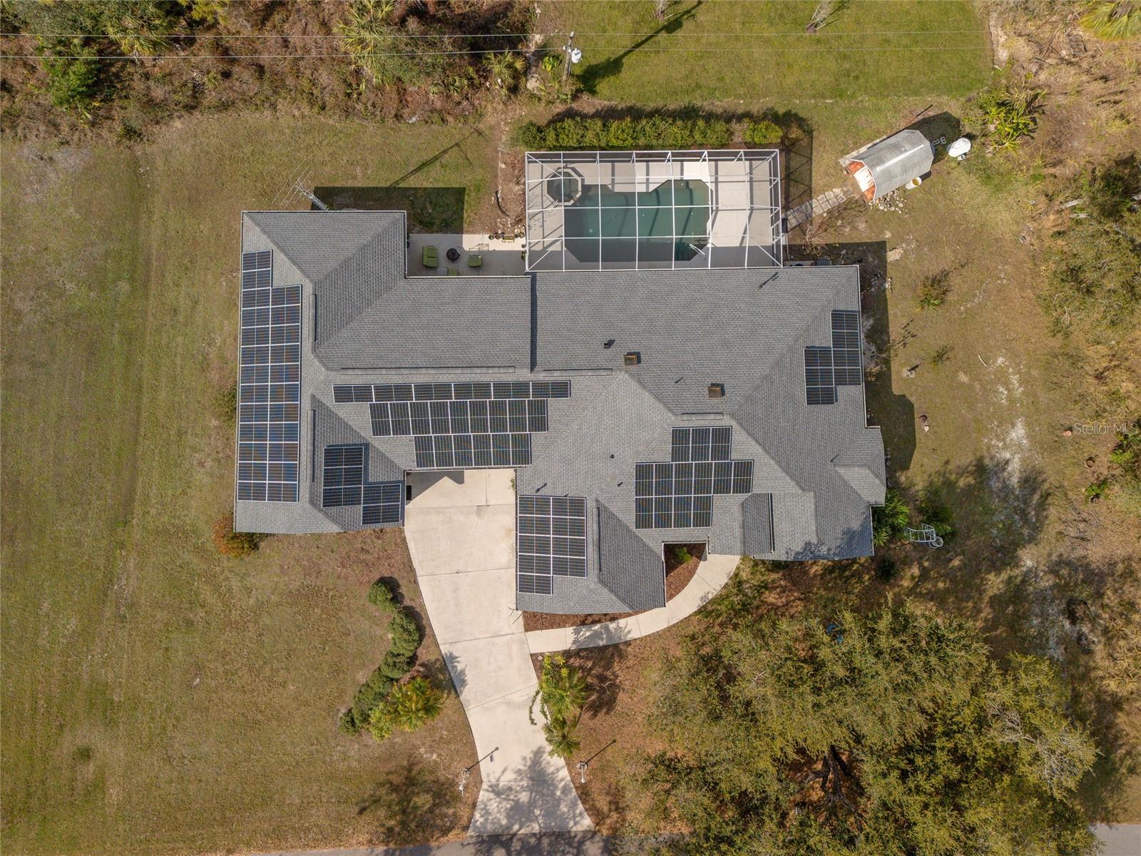 TRIPLE LOT! POWERFUL WHOLE HOME SOLAR FOR ENERGY INDEPENDENCE! Spacious 4 bedroom + bonus room, 3 bath, pool home nestled in a peaceful, beautiful neighborhood, where all essential stores can be accessed without ever having to navigate busy main roads. Inviting open floor plan features high ceilings, skylights, tile flooring, large slider to lanai in living and lots of windows for an abundance of light. Split floor plan provides privacy for all including walk-in closets and bath access from every bedroom. Expansive outdoor living space offers 5,000 sq. ft. of concrete boasting a massive four-car breezeway, an extra-long driveway, and two spacious back porches. One porch features a fully screened PebbleTec pool with in-floor cleaning jets, offering a relaxing and low-maintenance oasis. The property features a large solar system that generates an impressive 40 MWh per year—that’s enough energy to power about 3–4 average U.S. homes annually! Combined with propane-heated hot water and a dedicated gas line behind the stove, the home is highly energy-efficient. Living in Southwest Florida, adding batteries would make it fully off-grid and self-sustaining. SOLAR LOAN TO BE ASSUMED BY BUYER. The oversized garage features large storage room and a versatile fully insulated and air-conditioned 220 sq. ft. shop providing endless possibilities—whether for multigenerational living, a home office, a gym, or a yoga studio. With ample storage space, it’s a perfect retreat for work or hobbies. Additional features include new roof in 2022, hurricane protection and security system. It's the perfect blend of tranquility and convenience. The property is surrounded by abundant nature and thriving plants featuring a variety of lush plants, including a majestic heritage oak, food-producing plants, and pollinator-friendly flora. It has bananas, hog plums, moringa, red hibiscus, dragon fruit, prickly pear, and aloe—creating a self-sustaining, vibrant ecosystem. Great location close to Murdock restaurant and shopping district and Cocoplum Plaza, Centennial Park, schools, golf and a short drive fishing, boating and Venice beaches. Don’t miss this opportunity! Schedule your private showing today! -OWNER OCCUPIED- CAMERAS ON PROPERTY.