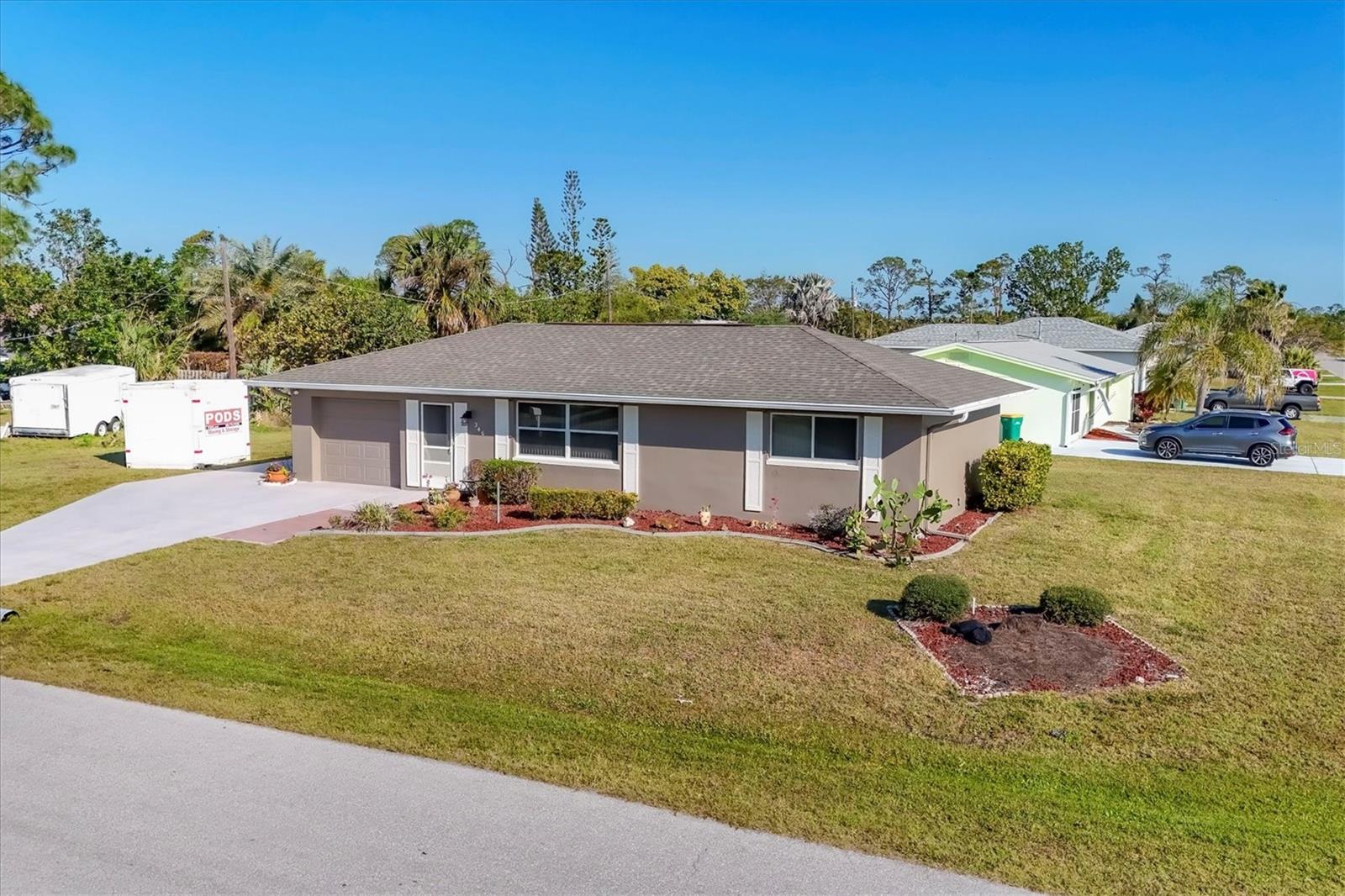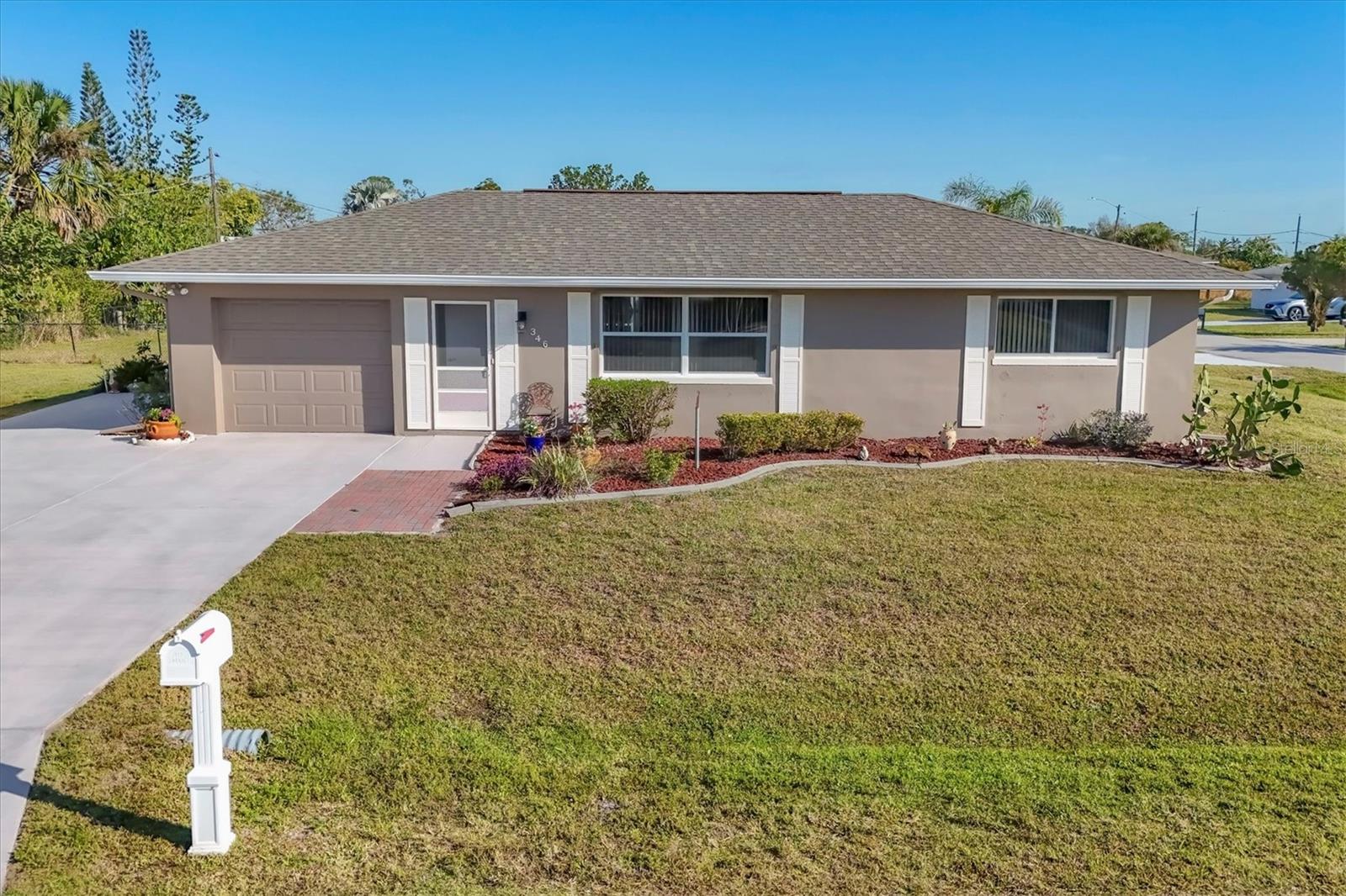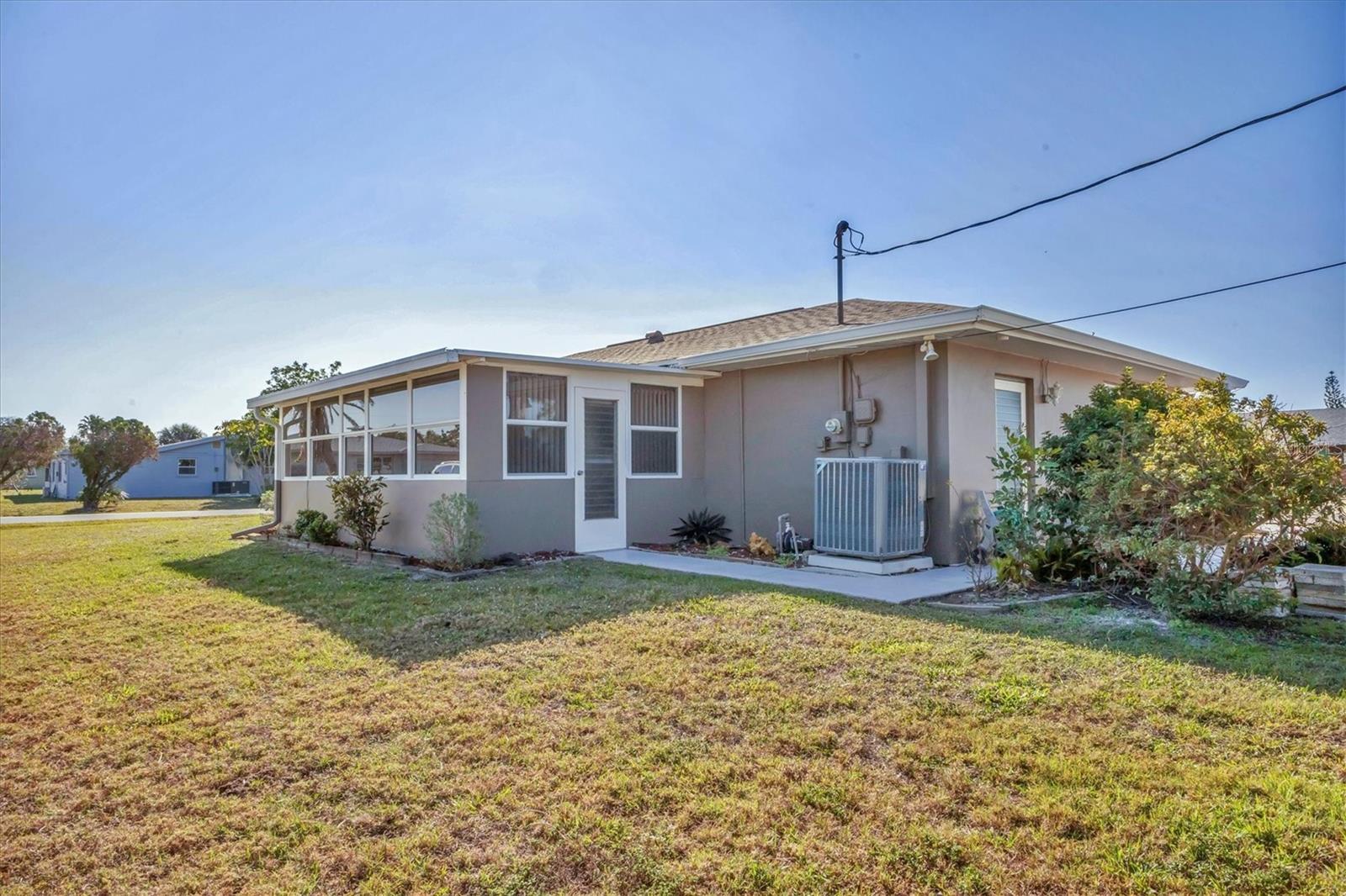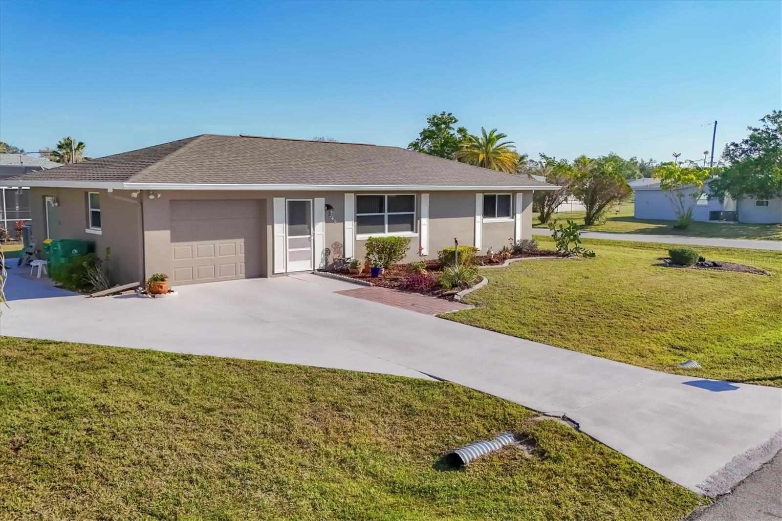 Welcome to this beautiful two bedroom, two bathroom home situated on a desirable corner lot in the heart of Port Charlotte. This property offers a spacious layout featuring a large one-car garage with additional slab space beside it, ideal for extra parking. The interior garage features wood steps (not pull-down) leading to the attic area, offering plenty of extra storage. A new roof 2021, new A/C unit 2024, new water heater 2021, gutters and soffit 2023, water shutoff valve 2021, exterior of the home and driveway painted 2025. The home’s living areas are enhanced by durable ceramic tile with a plank design in the living room, while the bedrooms are carpeted for comfort. An abundence of kitchen cabinets with plenty of corrian counter space to enhance this lovely kitchen. The finished lanai adds additional space for relaxation or entertaining. The home is located near shopping, dining, and entertainment, as well as spring training facilities for baseball fans. Don’t miss out on the opportunity to own this lovely home with an ideal combination of comfort, location, and modern upgrades. The home boasts beautiful landscaping that enhances its curb appeal, and it is connected to city water and sewer for your convenience. The property has been meticulously maintained, with recent updates