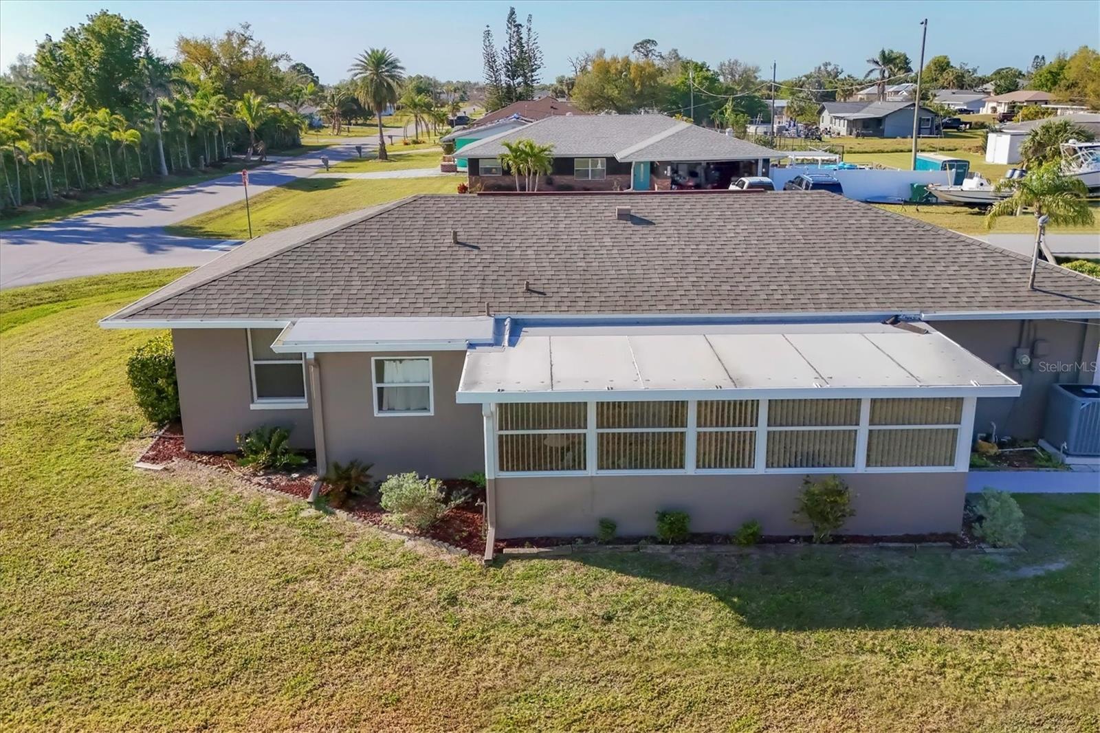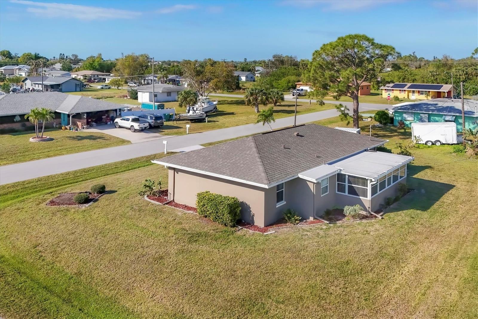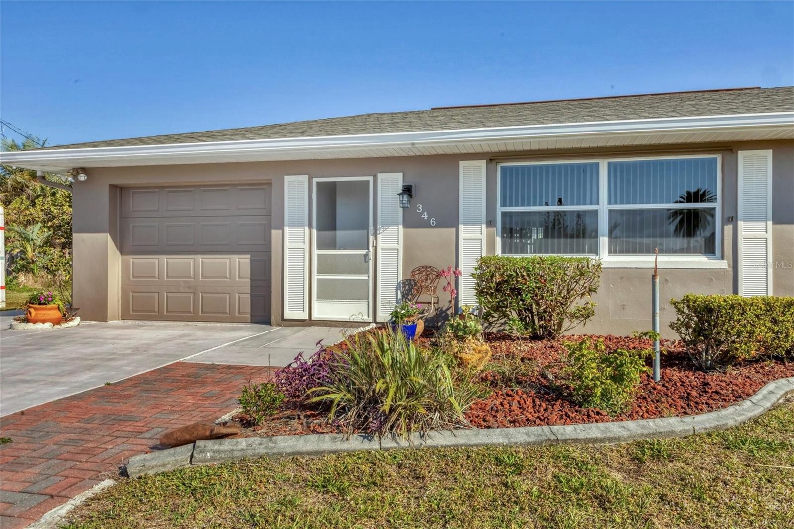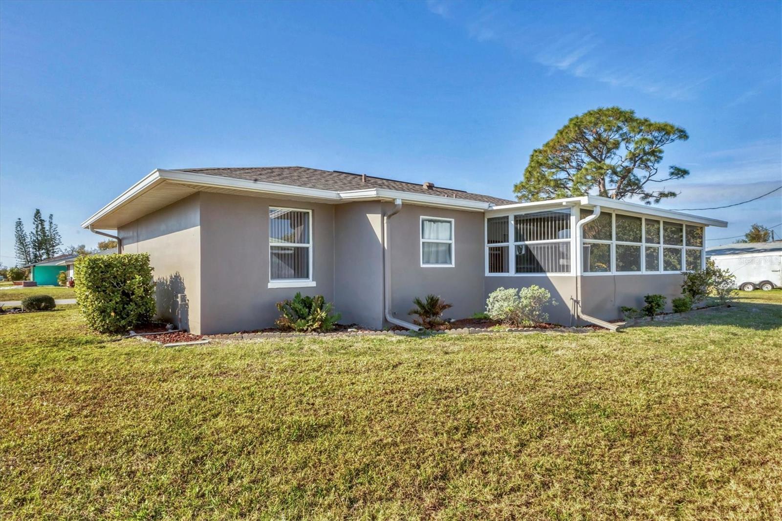 Welcome to this beautiful two bedroom, two bathroom home situated on a desirable corner lot in the heart of Port Charlotte. This property offers a spacious layout featuring a large one-car garage with additional slab space beside it, ideal for extra parking. The interior garage features wood steps (not pull-down) leading to the attic area, offering plenty of extra storage. A new roof 2021, new A/C unit 2024, new water heater 2021, gutters and soffit 2023, water shutoff valve 2021, exterior of the home and driveway painted 2025. The home’s living areas are enhanced by durable ceramic tile with a plank design in the living room, while the bedrooms are carpeted for comfort. An abundence of kitchen cabinets with plenty of corrian counter space to enhance this lovely kitchen. The finished lanai adds additional space for relaxation or entertaining. The home is located near shopping, dining, and entertainment, as well as spring training facilities for baseball fans. Don’t miss out on the opportunity to own this lovely home with an ideal combination of comfort, location, and modern upgrades. The home boasts beautiful landscaping that enhances its curb appeal, and it is connected to city water and sewer for your convenience. The property has been meticulously maintained, with recent updates