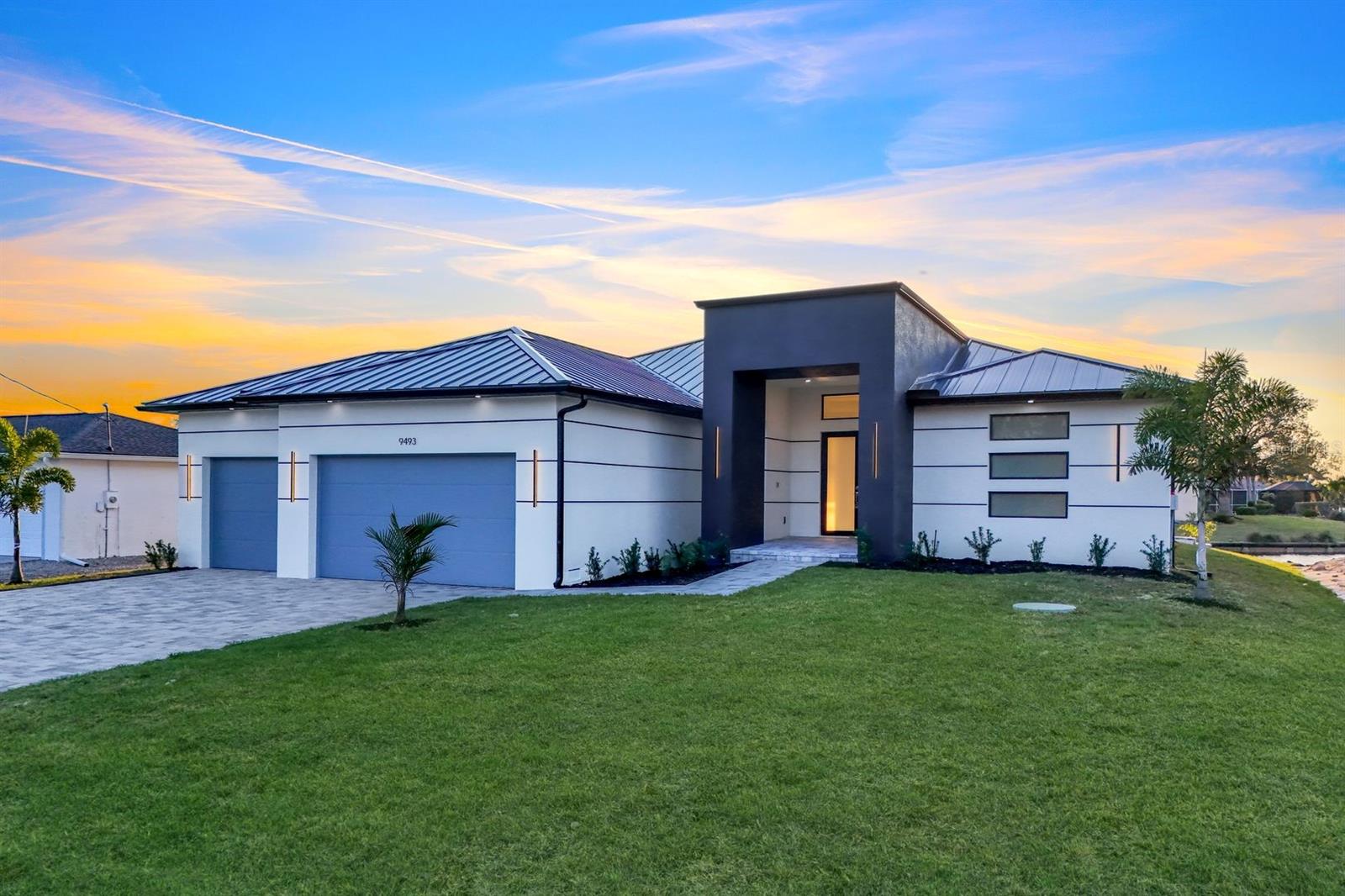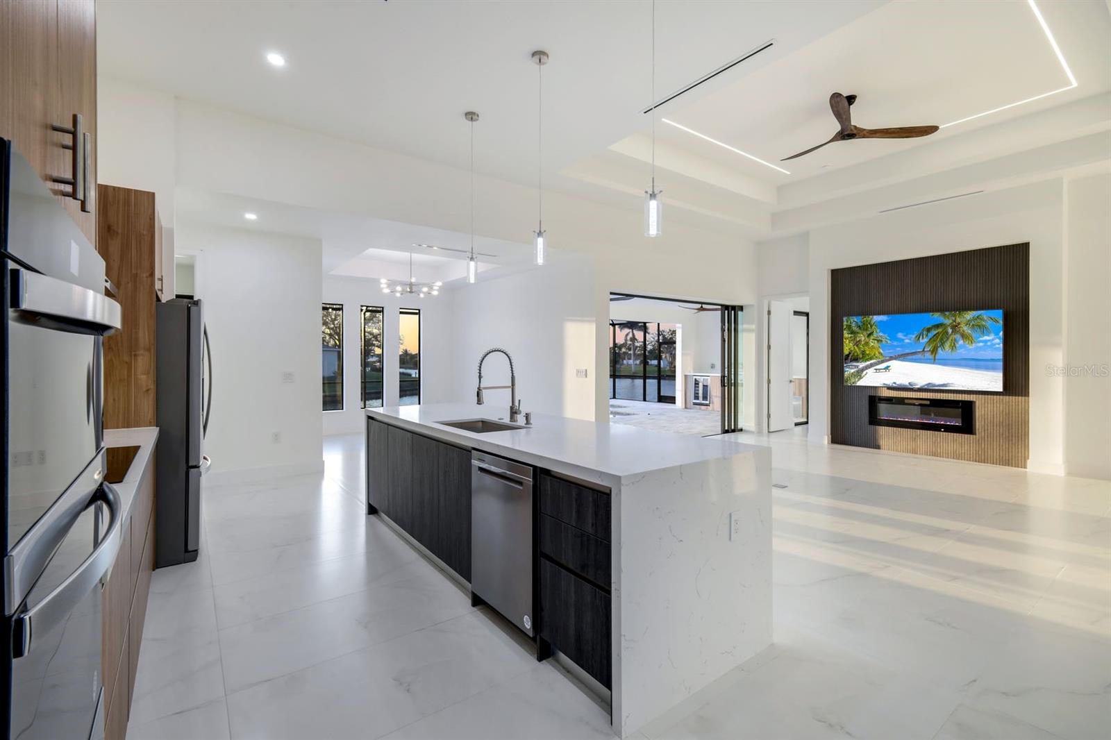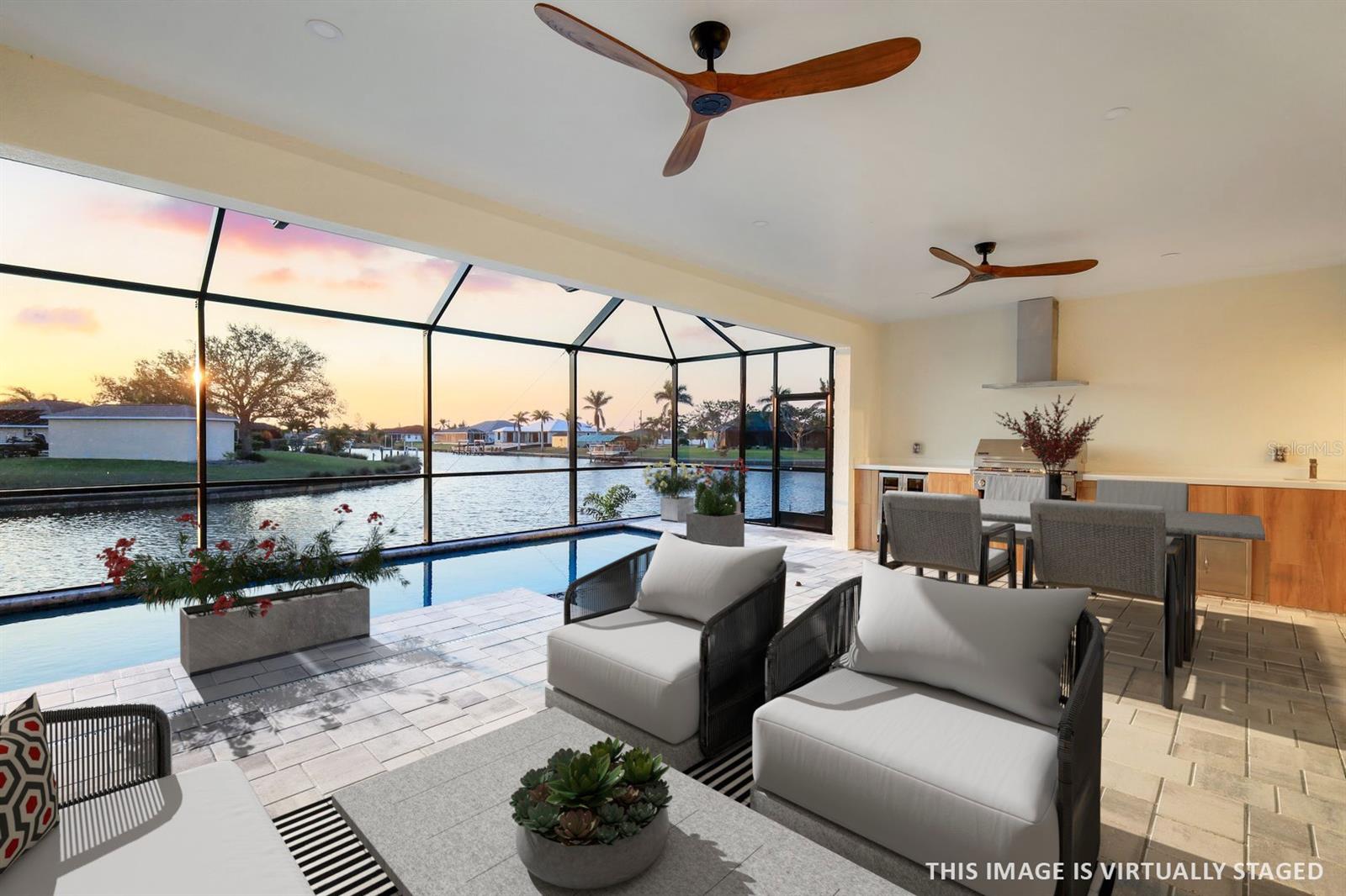 One or more photo(s) has been virtually staged. Stunning Gulf Access Waterfront Home with Modern Amenities Ready to move in. This magnificent 4-bedroom, 3-bathroom waterfront property offers 2,446 sq. ft. of luxurious living space. The entire house is adorned with oversized tiles, giving it a sleek and modern look.An upgraded kitchen with elegant quartz countertops featuring waterfall edges, European-style cabinets, and top-of-the-line Samsung appliances. A stylish living room with a modern electric fireplace and LED striped lights in the entryway for a touch of sophistication.A fully equipped outdoor kitchen, perfect for entertaining guests.A durable metal roof and hurricane impact windows providing extra protection and peace of mind.This move-in-ready home is designed for both comfort and style, making it the perfect place to enjoy waterfront living.