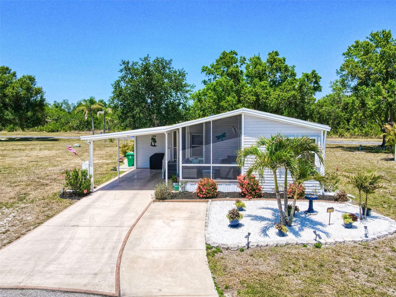 An exceptional LAND OWNED partially furnished, 2-bedroom 2 bath with a den located on a cul-de-sac in the beautiful waterfront community of Village of Holiday Lake. This home boasts New Roof in 2022, updated kitchen, open floorplan, New Windows 2019, 2 screened lanai’s, new sliding glass door, French doors, sky lights and Golf Cart parking. New accordion hurricane shutters were installed in 2024 for maximum protection! The large shed is perfect for additional storage. The Village of Holiday Lake has many amenities such as boat ramp, 25+ boat slips with access to the Myakka river from butterford waterway to Charlotte Harbor and the Gulf, large fenced areas for boat and RV parking, 2 pools, BBQ area for entertaining, Recreation hall with full kitchen, fitness center, craft room, laundry facility, Pickleball, Tennis, Woodworking and so much more. This is a golf cart friendly community and is located close to 5 golf courses in Rotonda. It is just minutes away from gulf beaches, shopping, restaurants and so much more. This is an awesome community and location, schedule your showing today!