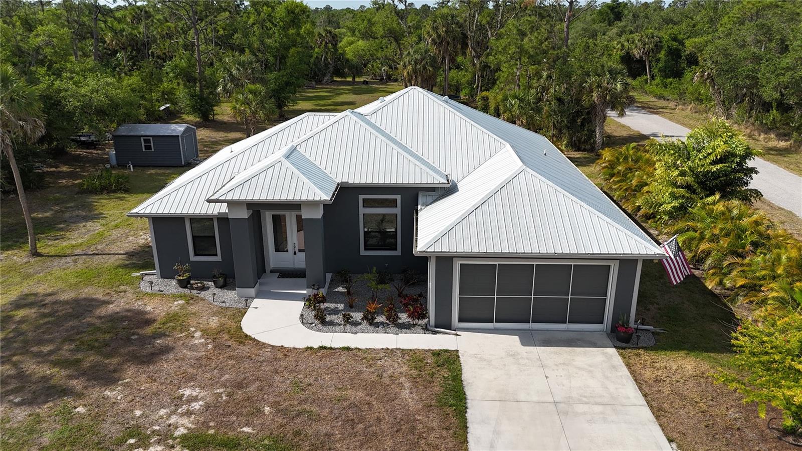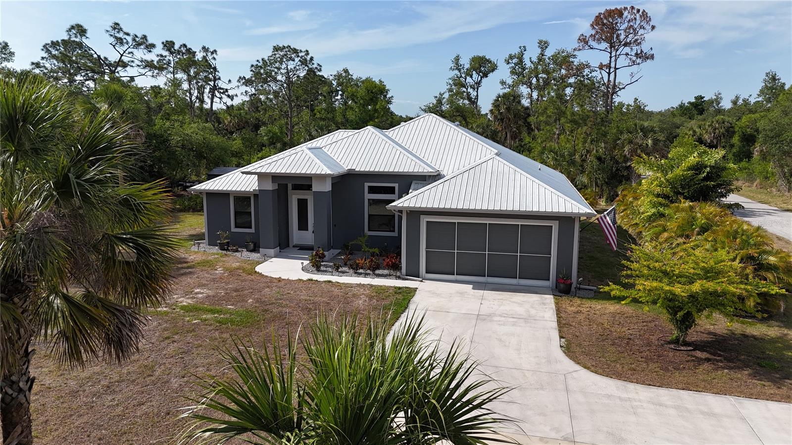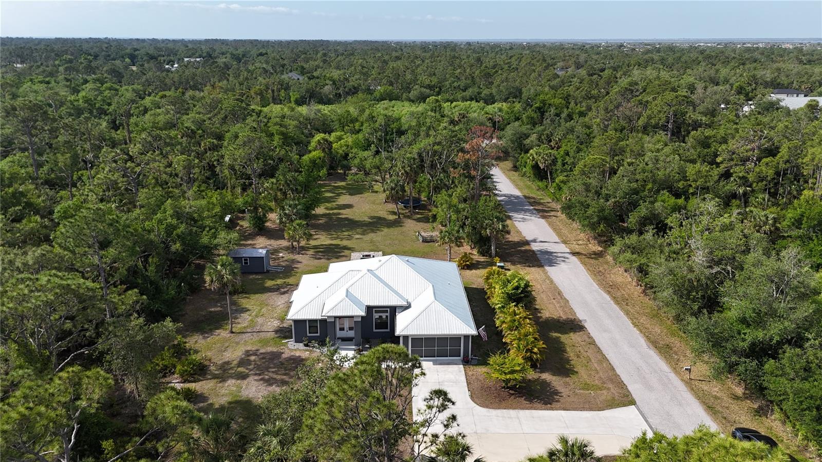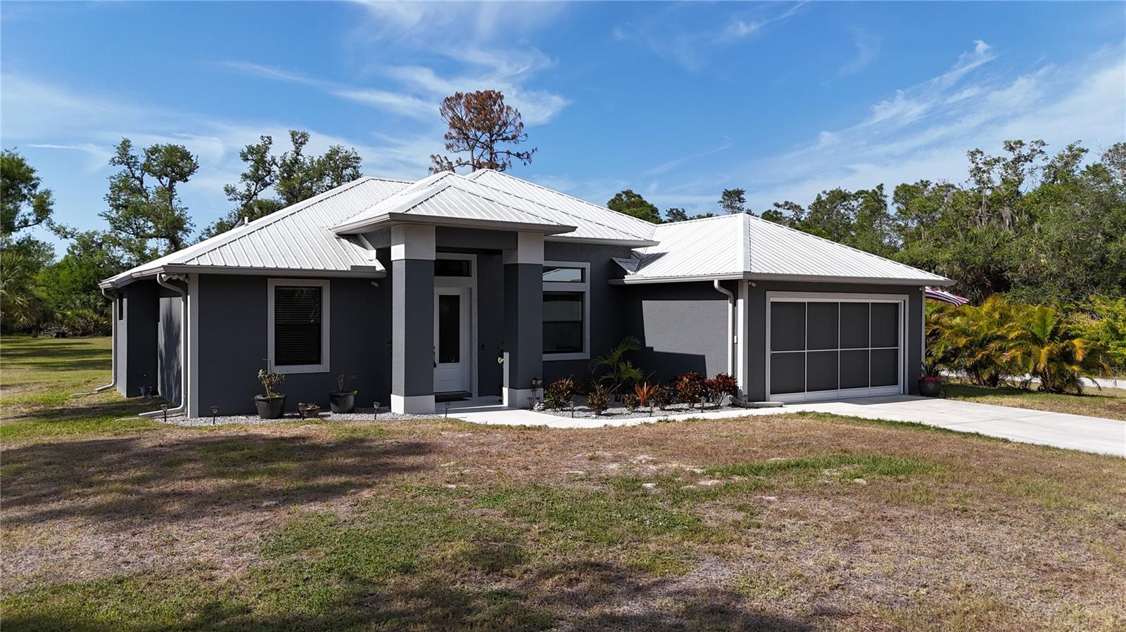 *3D VIRTUAL TOUR* Welcome home to your picture perfect CUSTOM BUILT home on 1.7 ACRES in the desirable area of Port Charlotte off Collingswood Blvd NOT IN A FLOOD ZONE! This beautifully crafted home combines elegance & comfort, while featuring 3 bedrooms + DEN, 2 baths & a 2 car garage. As you approach the property, you'll be captivated by it's charming curb appeal, featuring lush landscaping, pebble rock, curbing, retractable garage screen door, T-shaped driveway, gutters & downspouts, flag holder, METAL ROOF (w/40yr transferable warranty) & to top it all off exterior soffit lights, for nighttime ambiance. Open the double front doors & be greeted with a grand entrance that's sure to please with gorgeous upgrades including 8' doorways, modern fixtures, high tray ceilings, warm, neutral colors & wood blinds throughout making this home one you don't want to miss! The welcoming Great Room draws your attention as you enter, complete with tall ceilings & natural sunlight beaming through the triple pocket sliding doors, wood plank ceramic tile flows freely throughout the main living areas making cleaning a breeze & pet friendly. The gourmet kitchen would make any chef happy! It boasts stainless steel appliances, quality cabinets with soft close feature, GRANITE countertops, ornate backsplash, closet pantry, WHOLE HOUSE R.O. System, farmhouse sink, plant shelves & a centered breakfast bar/island that is highlighted by 3 hanging pendant lights & has added storage & seating options when entertaining! The quaint dining room flows seamlessly together with the kitchen & makes the perfect gathering spot! Retreat to the primary bedroom, it is comfortable & large in size & houses private lanai access & an en-suite master bath, that offers dual sinks, make-up vanity, linen & walk-in clothing closet, private water closet & walk-in Roman shower. The guest bedrooms are across the home in this desirable split bedroom floor plan. Both bedrooms are supplied with a private closet, ceiling fan & window. A well-appointed guest bath with vanity, shower/tub combo & toilet is in between the bedrooms for added convenience. A den with built in desk would make for an excellent office, craft room or game room - the possibilies are endless! The inside laundry room has additional storage, utility sink & custom top for washer/dryer where you can fold your clothes or iron. The 2-car garage & large driveway provides ample storage & parking spaces for vehicles or hobbies. Pocket sliders from the Great Room open to your peaceful extended, screened in lanai showcasing panoramic backyard views, the epitome of Florida living. Entertain family & friends all while enjpoying the firepit & gorgeous weather Florida has to offer or grab a good book & relax while taking in the sights & sounds of your serene 1.7 acres of land. No deed restrictions or HOA fees. The terrific location of this home allows QUICK access to shopping, golfing & restaurants. Close proximity to the beautiful Gulf Beaches. Also nearby, Charlotte Harbor & the Gulf of Mexico where fishing is plentiful! Love Baseball? Charlotte Sports Park, home of the Tampa Bay Rays baseball spring training & the BRAND NEW Wellen Park area where you can watch an Atlanta Braves spring training baseball game, shop, dine out or enjoy a Sunday at the Farmers Market are just a short drive! US-41 & Interstate 75 allow you quick access to the North or South. Include this home on your "Must See List" and start packing!