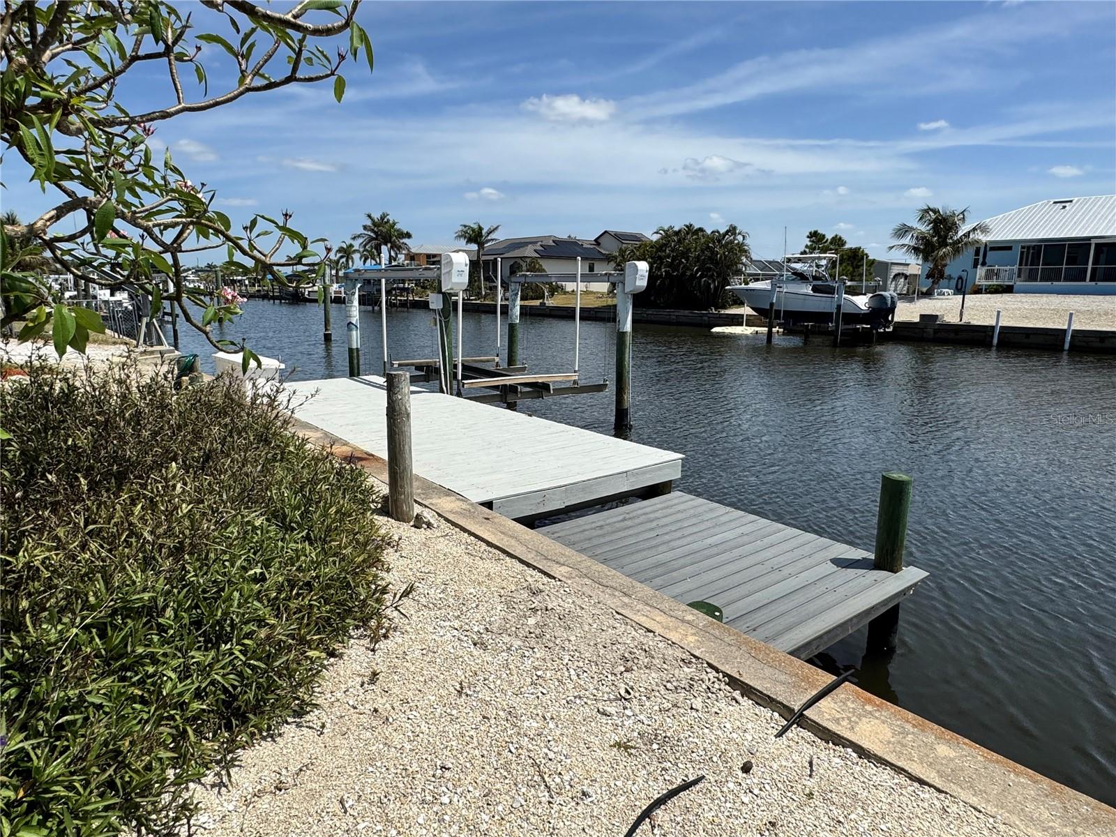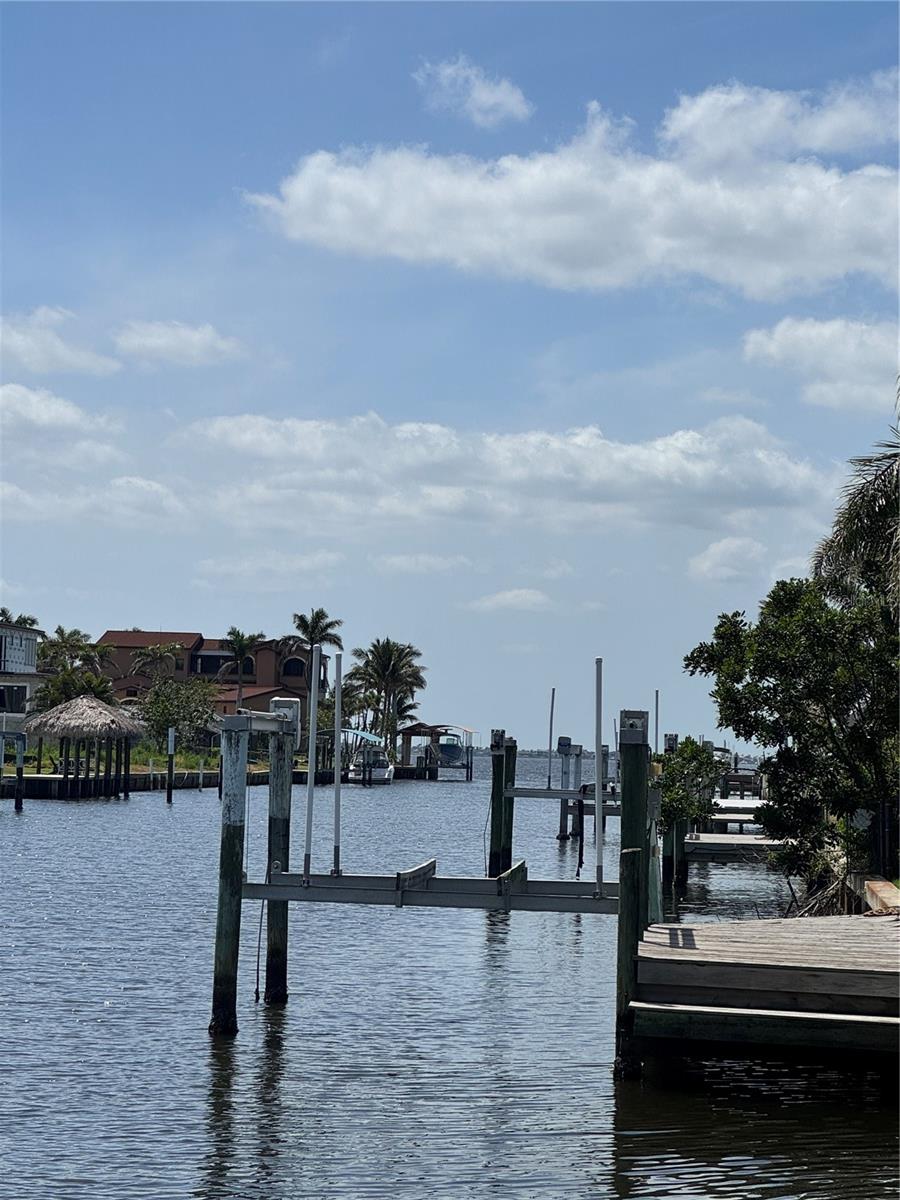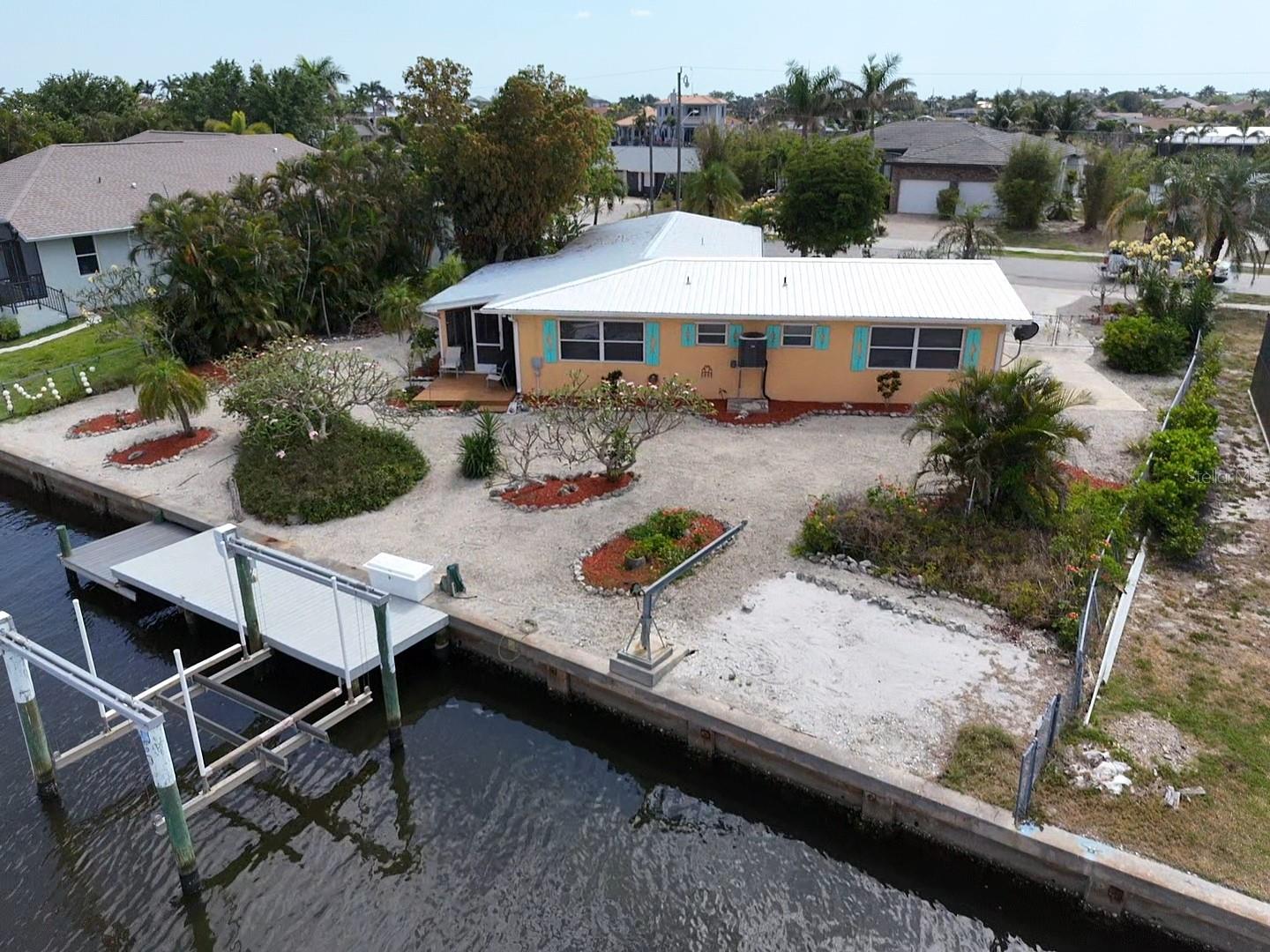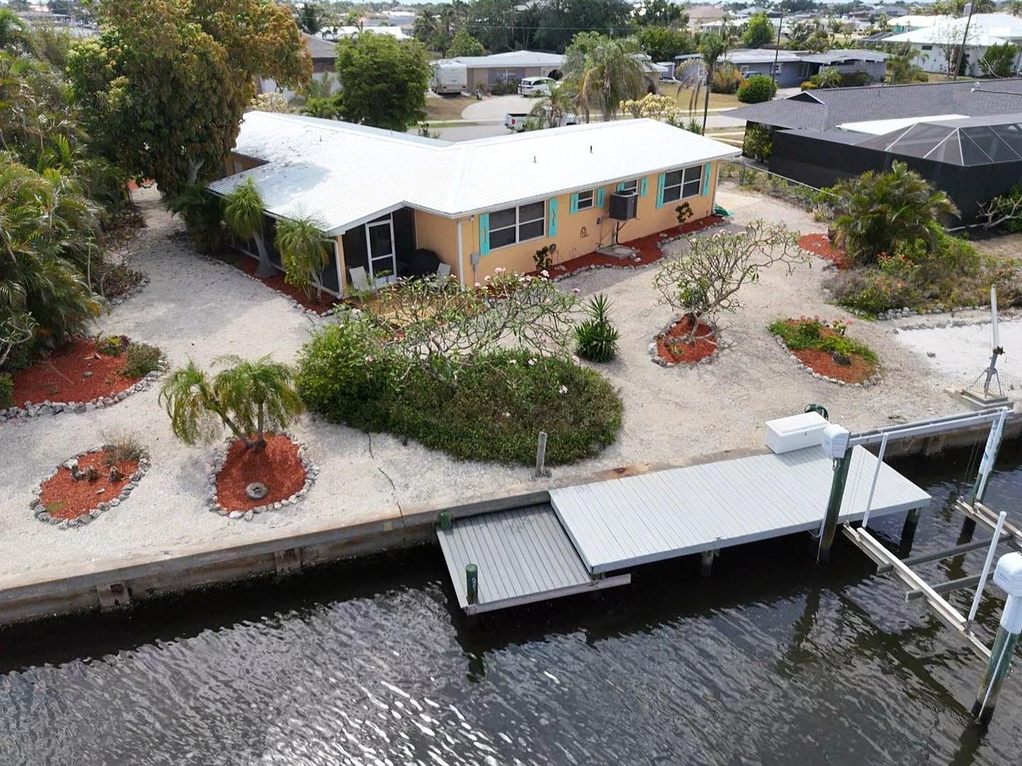 SAILBOAT SALTWATER FRONT~~~ Just 11 lots in from the Harbor & the open water leading to the Gulf. This beautiful waterfront ~~ 3 bedroom, 2 bath dollhouse features a new metal roof in 2023, new A/C in 2024 that is raised approx. over 4 feet off the ground. Kitchen is light and bright with a bar height countertop, newer dishwasher and a walk-in pantry. Master bedroom is off the back of the home with a large picturesque window to the canal, a walk-in closet and terrazzo floors. The 2nd guest bedroom offers French doors and bamboo flooring. 3rd bedroom has terrazzo floors and built in closet. This home offers hurricane shutters, 100 feet of seawall, a 10,000# boat lift with composite dock and lower dock for kayaks, a Davit, chain link fenced backyard, screened in lanai, a wooden deck for grilling, newer hot water heater, inside laundry room with laundry tub, 1x6 baseboards, crown molding, listellos around casing of front door, screened front entry, mature tropical landscaping, large Mango tree and plumerias abound. Additional concrete driveway to accommodate your boat trailer or R.V.