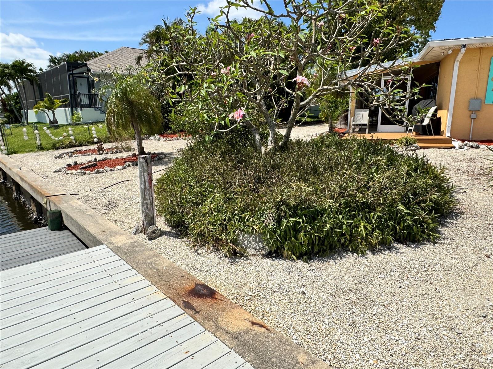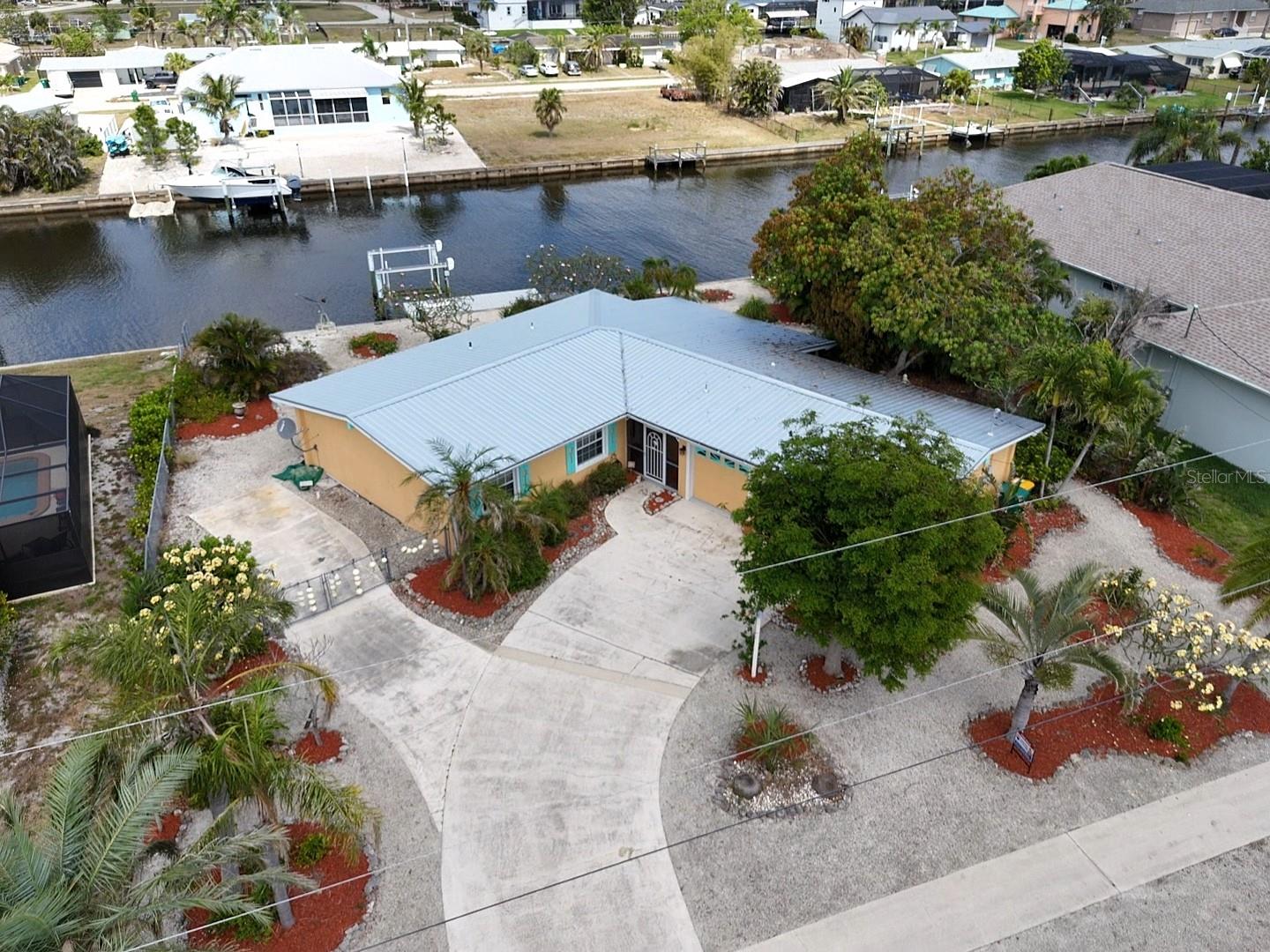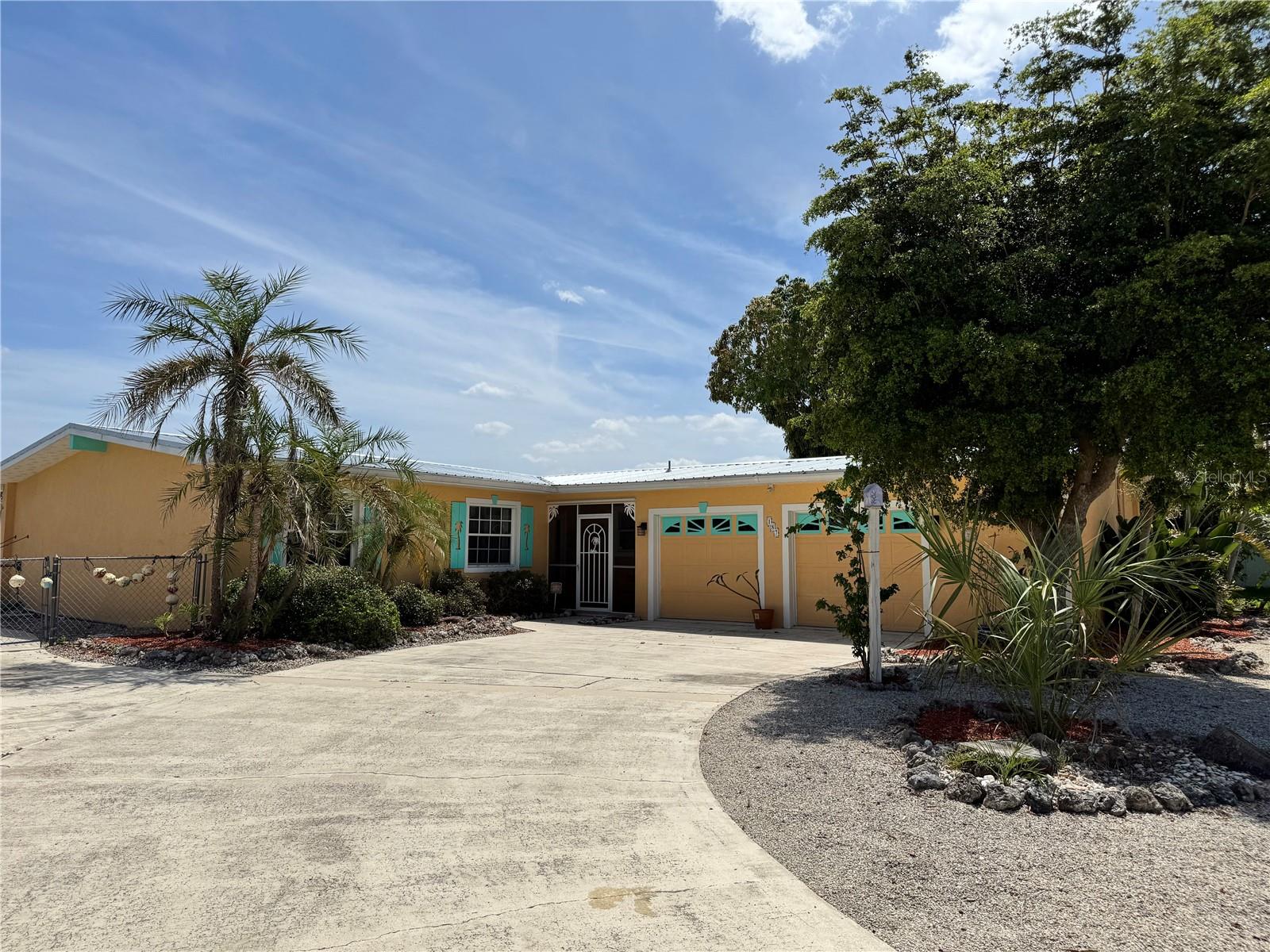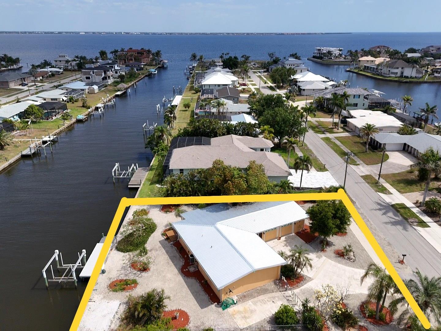 SAILBOAT SALTWATER FRONT~~~ Just 11 lots in from the Harbor & the open water leading to the Gulf. This beautiful waterfront ~~ 3 bedroom, 2 bath dollhouse features a new metal roof in 2023, new A/C in 2024 that is raised approx. over 4 feet off the ground. Kitchen is light and bright with a bar height countertop, newer dishwasher and a walk-in pantry. Master bedroom is off the back of the home with a large picturesque window to the canal, a walk-in closet and terrazzo floors. The 2nd guest bedroom offers French doors and bamboo flooring. 3rd bedroom has terrazzo floors and built in closet. This home offers hurricane shutters, 100 feet of seawall, a 10,000# boat lift with composite dock and lower dock for kayaks, a Davit, chain link fenced backyard, screened in lanai, a wooden deck for grilling, newer hot water heater, inside laundry room with laundry tub, 1x6 baseboards, crown molding, listellos around casing of front door, screened front entry, mature tropical landscaping, large Mango tree and plumerias abound. Additional concrete driveway to accommodate your boat trailer or R.V.