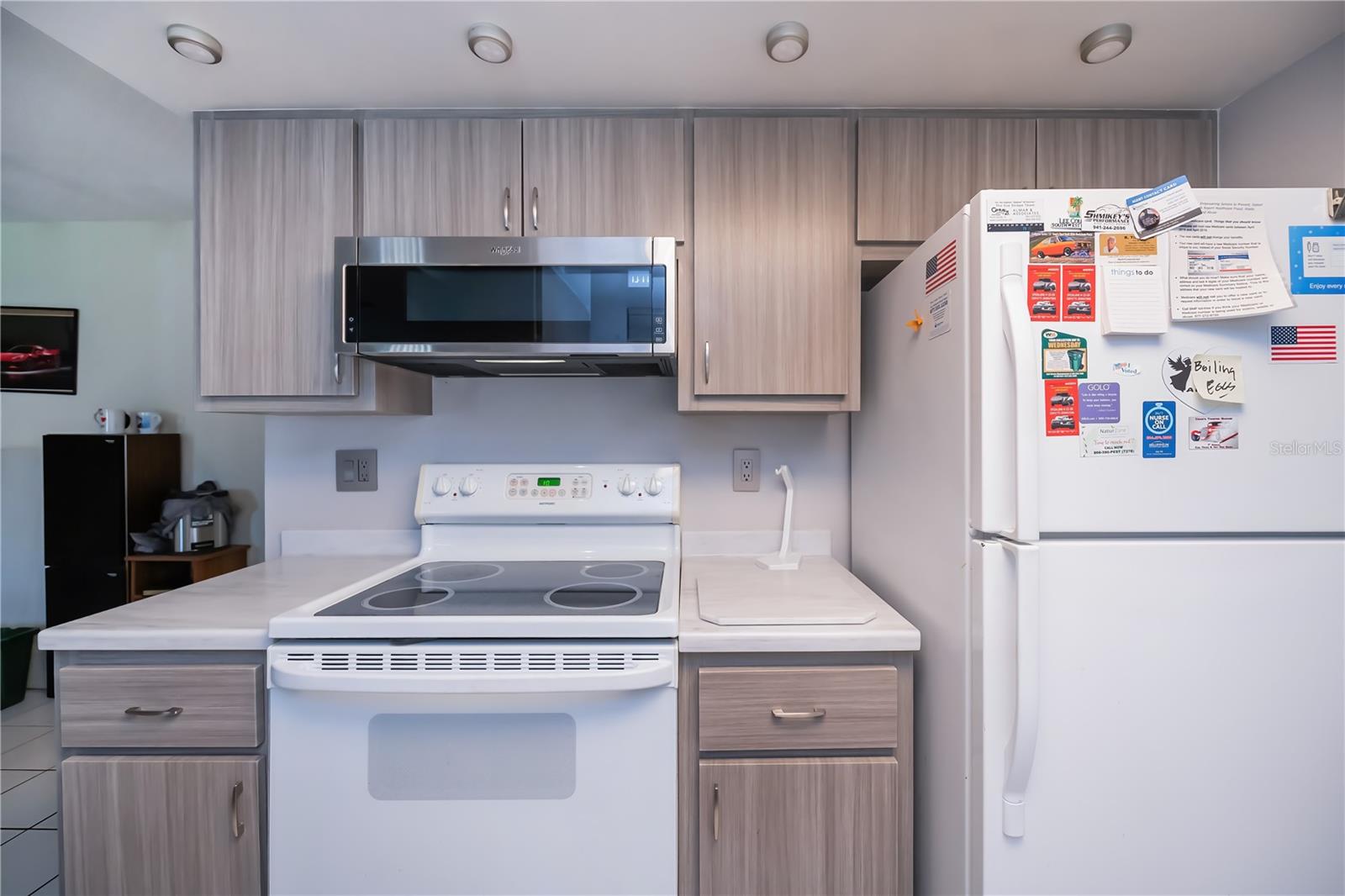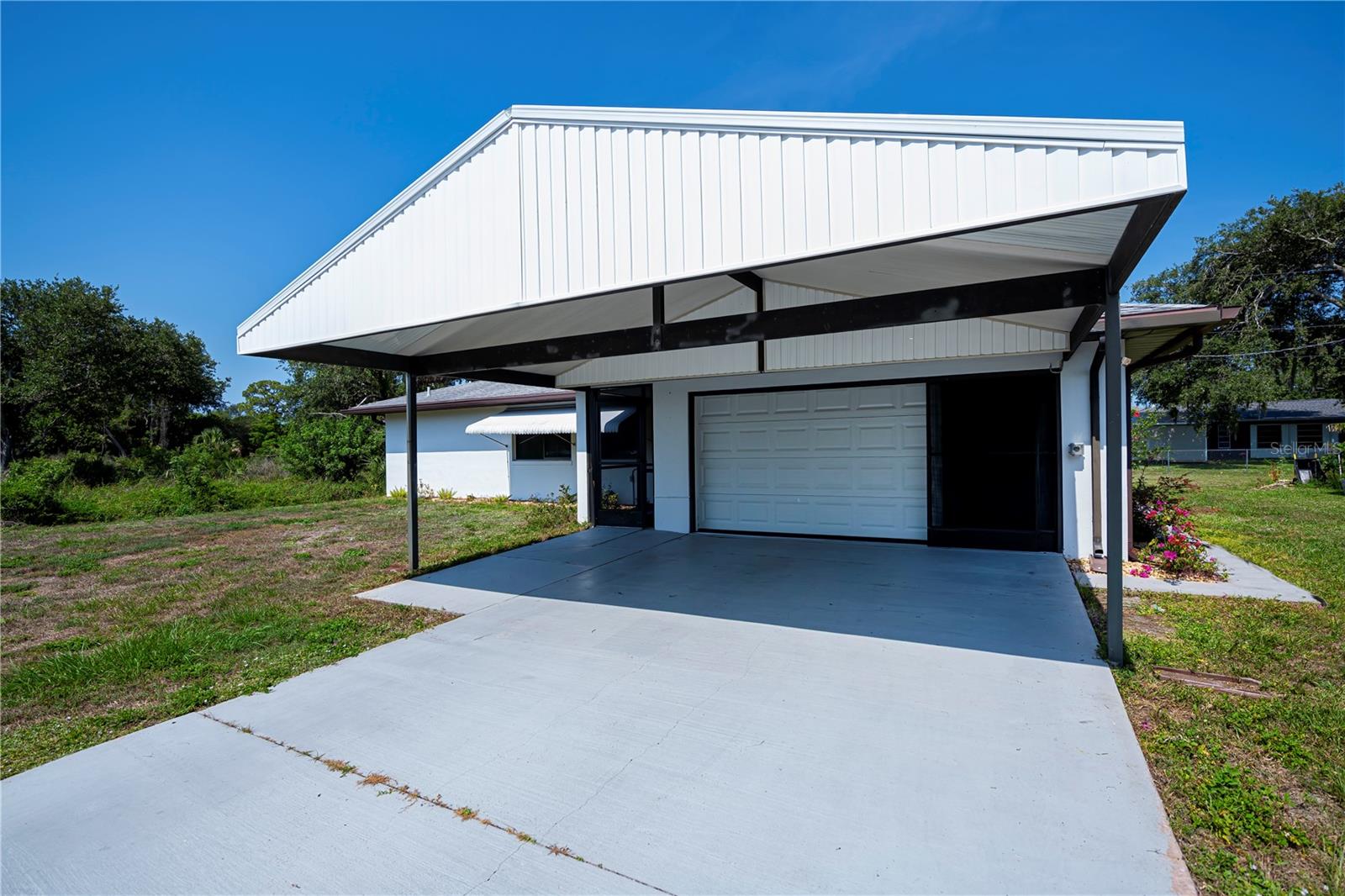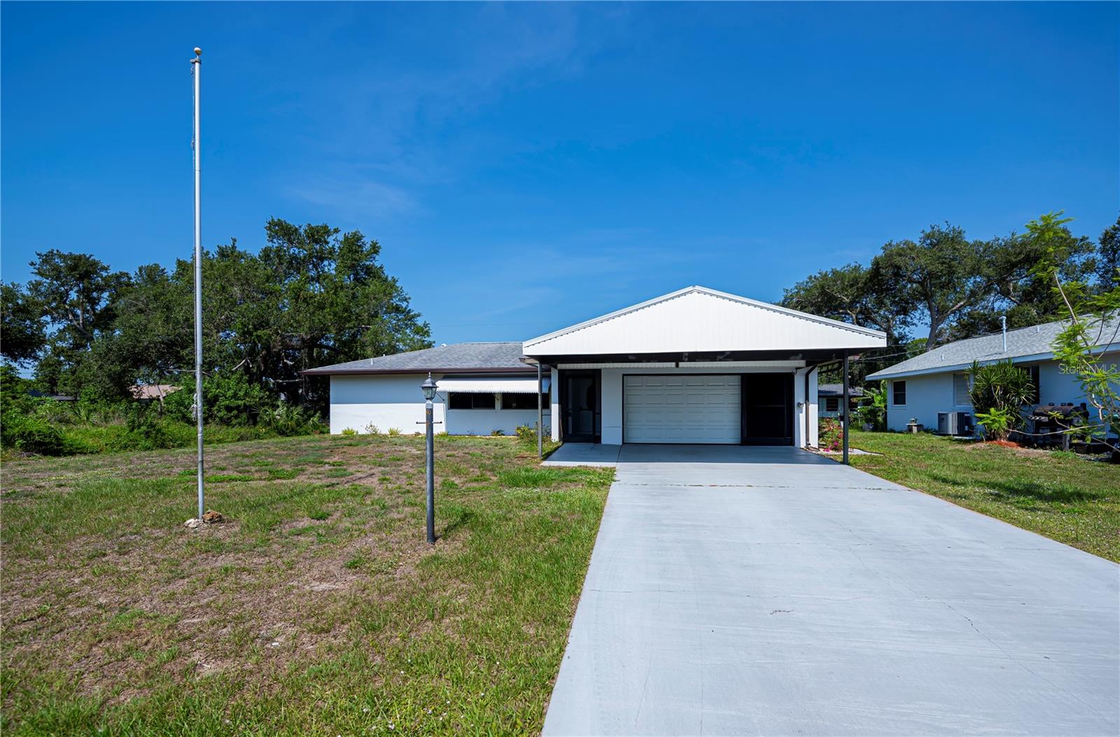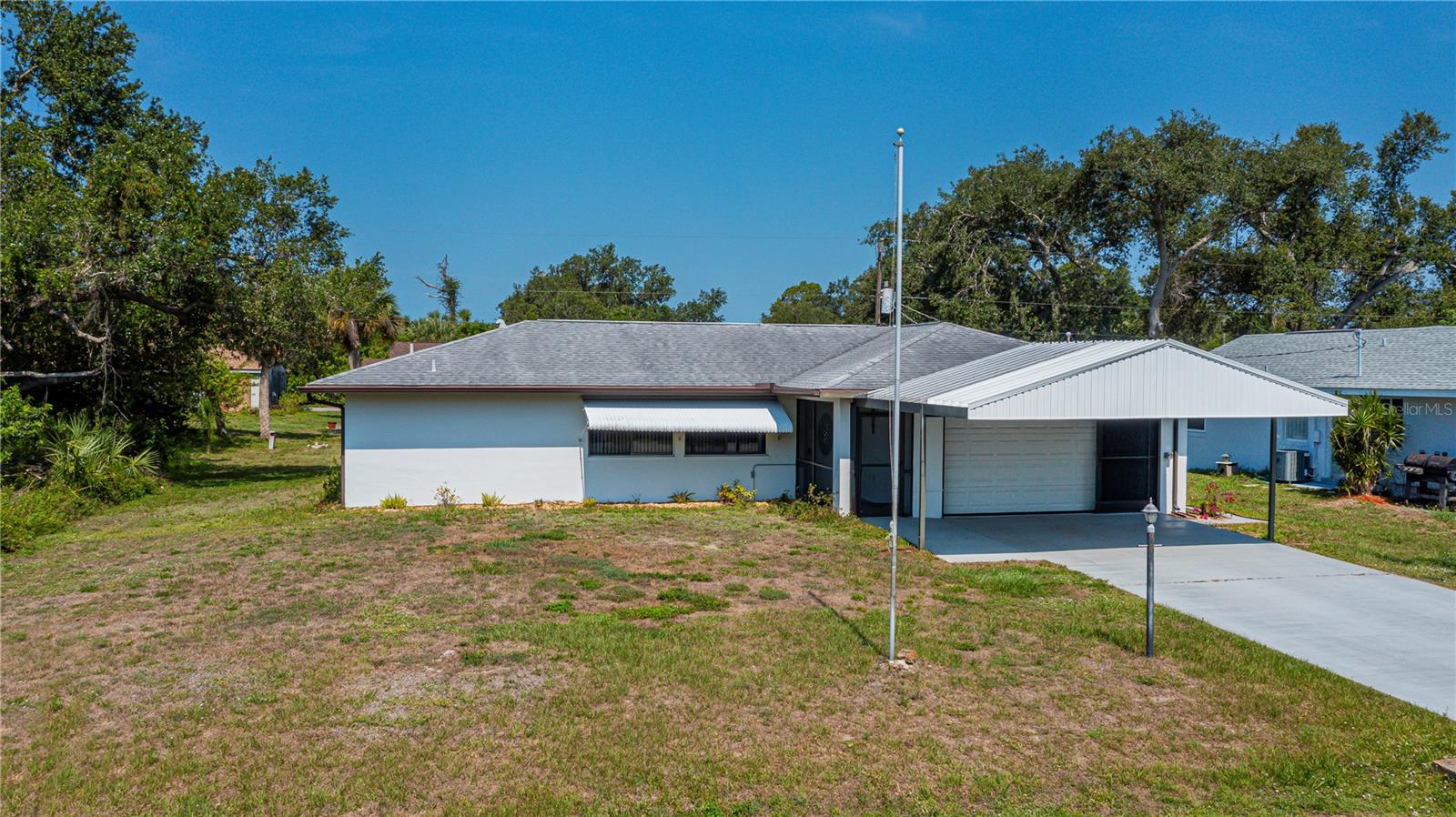 REDUCED! Welcome to your Florida Dream Home! Nestled on a quiet street just-minutes from shopping, restaurants. hospitals & medical facilities, this home offers convenience & comfort. Boasting 2 bedrooms, 2 full baths, 2-car garage, and addl. 2-car carport. This home features a nicely designed floorplan with split bedrooms, living room/dining room, good sized master bedroom, large family room, & 31X11 Florida Room for year-round use. Lots of updates & upgrades inc. roof 2014, A/C-Heat in 2021, new garage door in 2022, eco-smart tankless water heater in 2025, accordion shutters on sliders in 2023, newer electric box, new shed in 2018, 2021 installed charging station for electric car, & Lift Master garage door opener w/internet connection. Kitchen was remodeled in 2019 w/new cabinets and Silestone countertop, & equipped w/smooth top range, microwave hood, & refrigerator. Redone second bath with a linen closet, newer shower, tile floors, toilet, vanity, 2 medicine cabinets, heater/vent/light, & mirror w/built in lights. Garage would make a perfect man cave with its checkered floorboards. NOT IN A FLOOD ZONE.