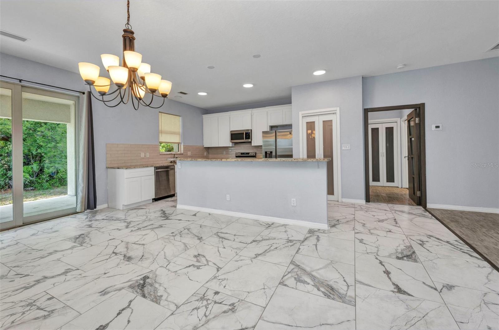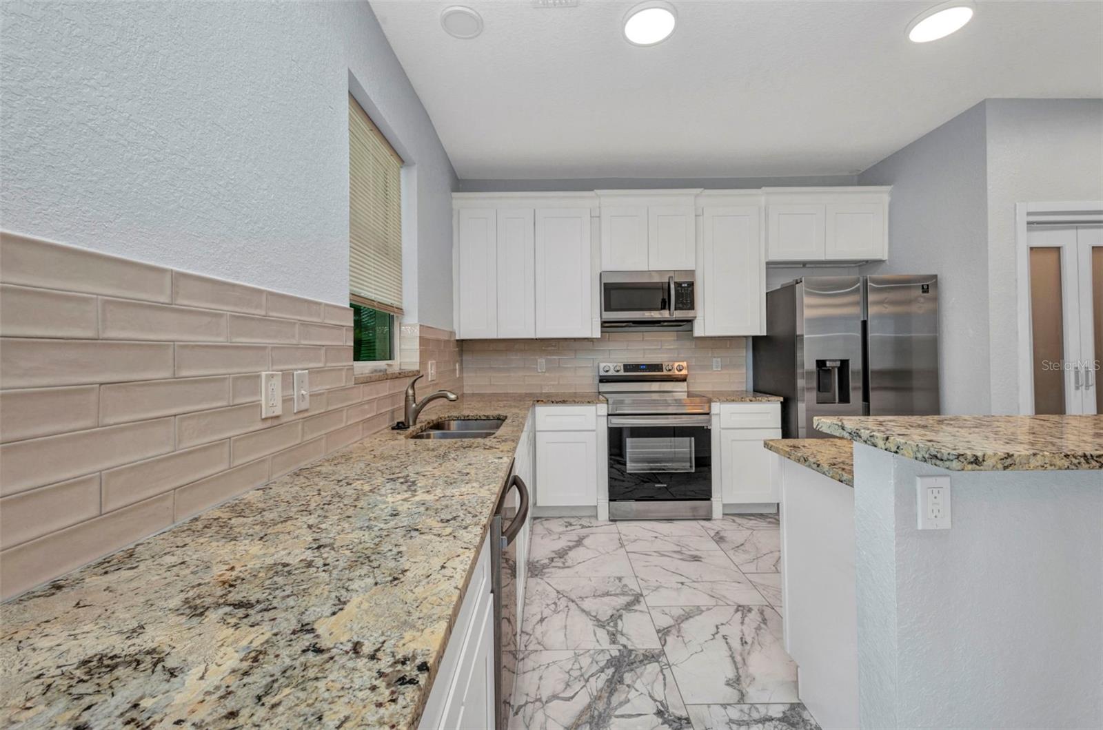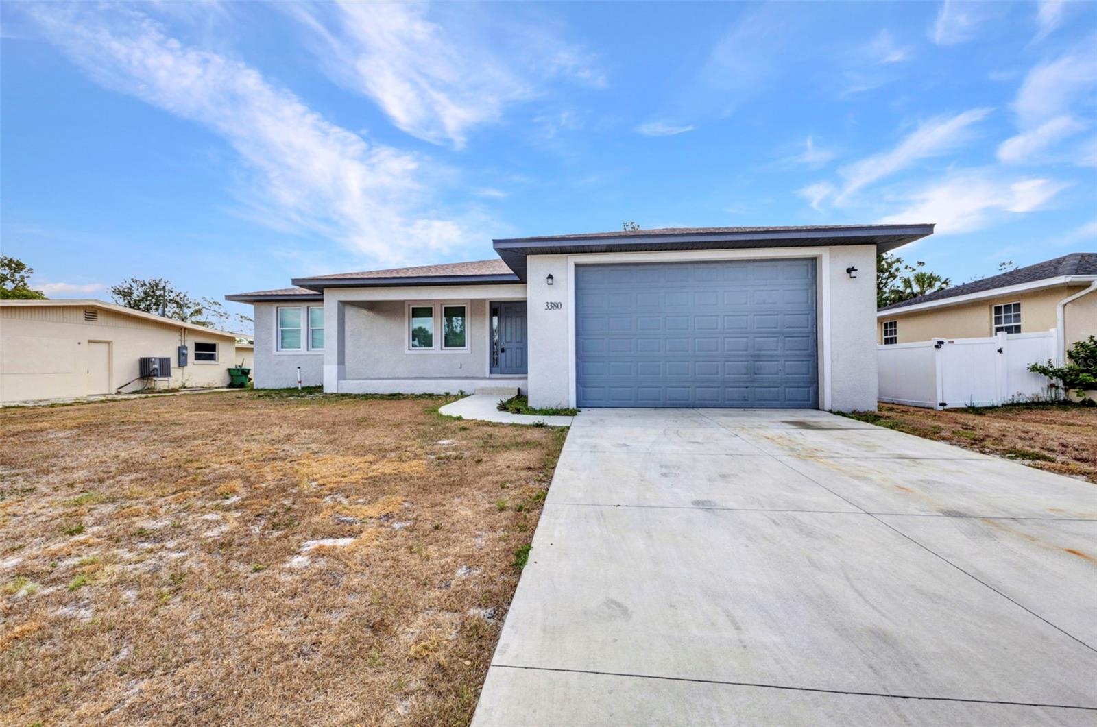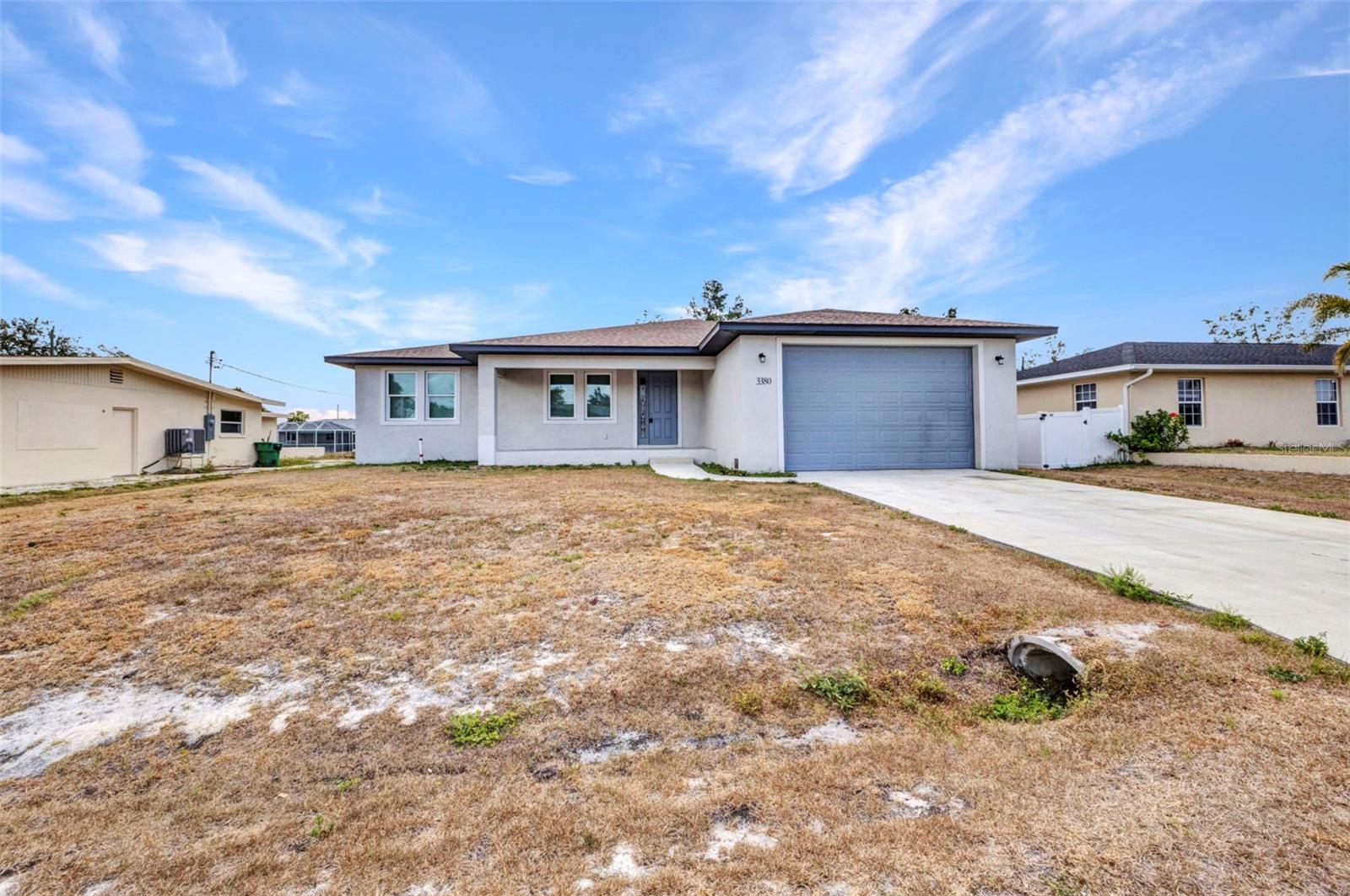 Beautifully Designed 3-Bedroom Home with Spacious Garage – Perfect for Your Truck or Boat! Step into comfort and style in this tastefully designed 3-bedroom, 2-bathroom home that checks all the boxes. From the moment you walk in, you'll notice the upgraded modern interior doors with glass inserts, adding a touch of elegance and natural light throughout the living spaces. Home also has hurricane impact windows throughout. The open-concept layout features gorgeous tile and vinyl flooring throughout, paired with granite countertops and stainless steel appliances in a well-appointed kitchen—perfect for cooking and entertaining. Retreat to the expansive master suite featuring a large bedroom, dual vanities, a luxurious stand-alone soaking tub, and a spacious walk-in shower. Vehicle and outdoor enthusiasts will love the oversized 2-car garage—25 feet deep with a 10-foot high garage door—ideal for trucks, boats, or extra storage. The nearly 300 sq. ft. covered lanai offers a perfect space for relaxing or entertaining guests year-round. With public water and sewer, this home offers both convenience and modern living in one beautiful package. Don't miss your opportunity to own this stunning, move-in-ready home!