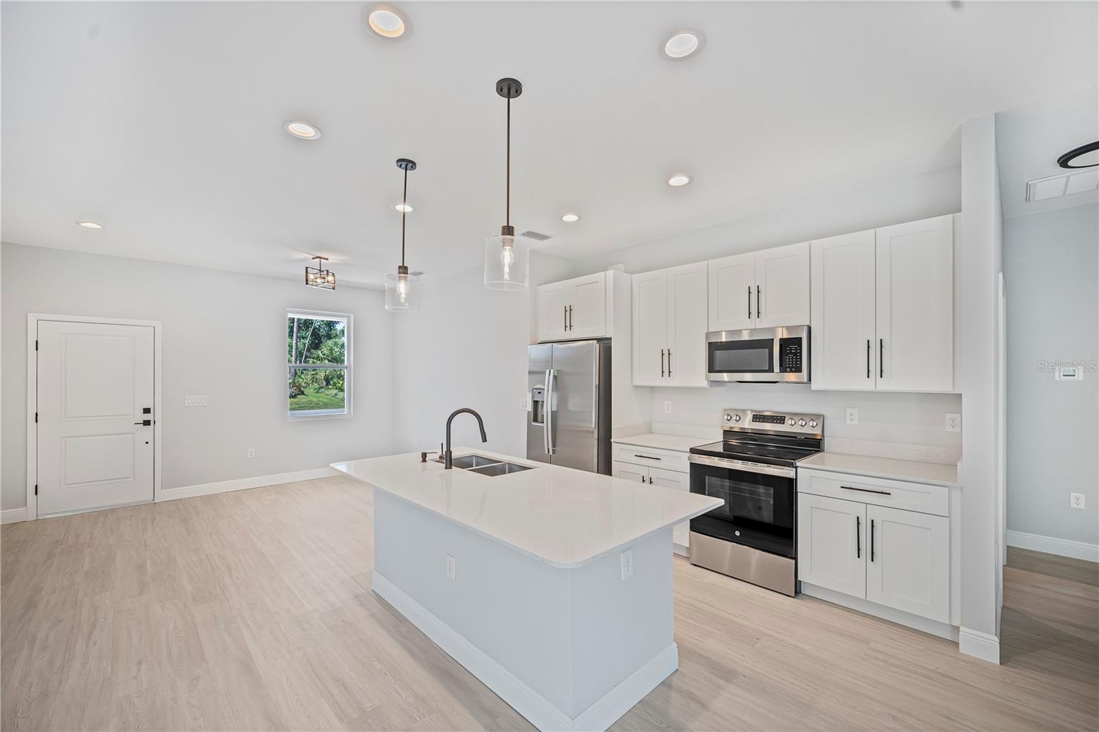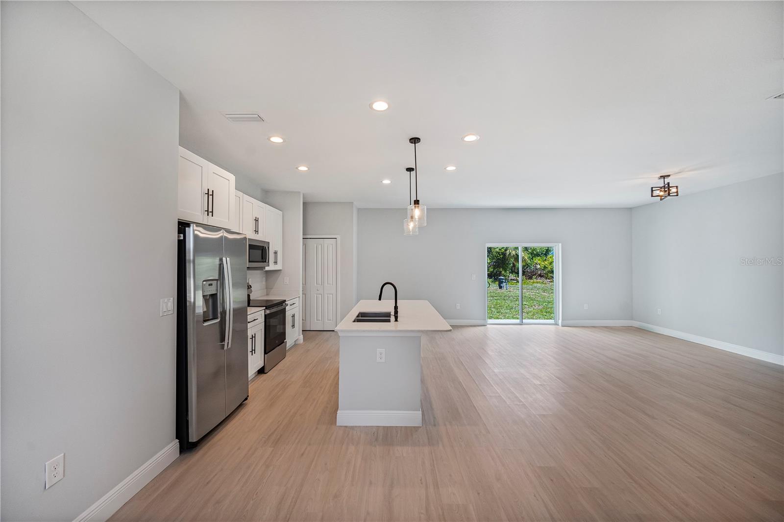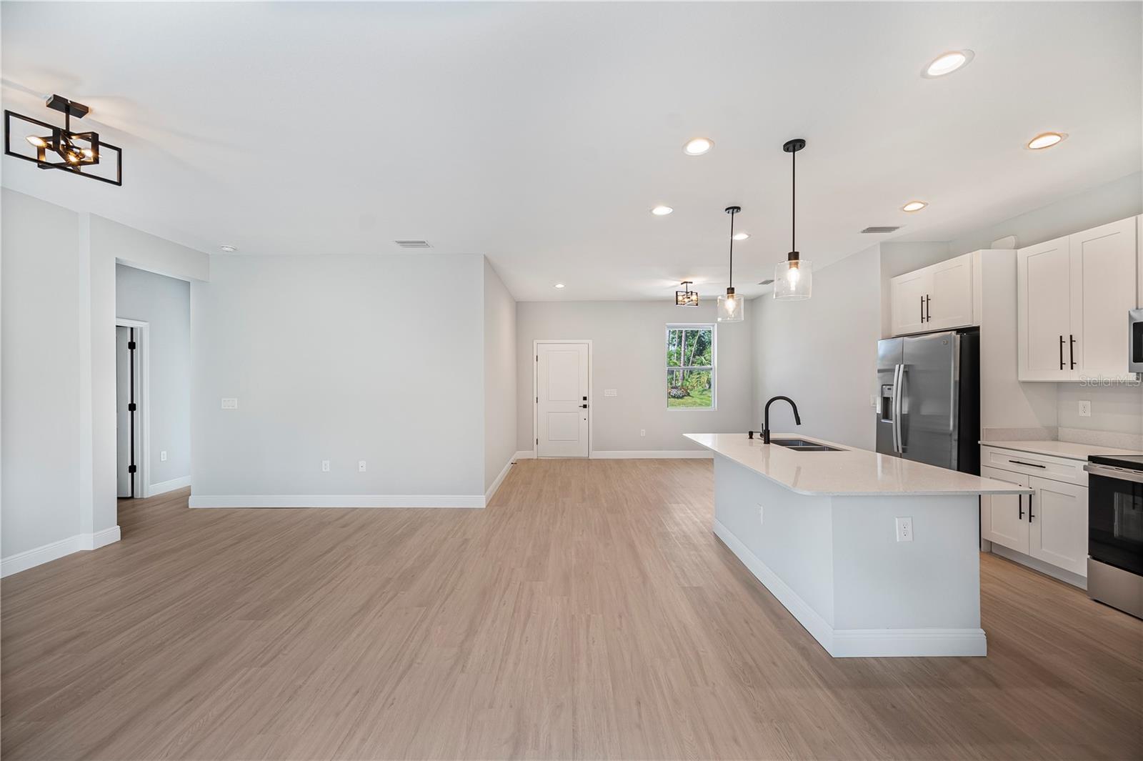 Welcome to your brand-new dream home! This beautifully crafted 4-bedroom, 2-bathroom residence offers a perfect blend of style and practicality in a peaceful neighborhood setting. From the moment you walk in, you'll appreciate the open-concept layout, filled with natural light and modern finishes throughout. The kitchen is a showstopper—featuring gleaming granite countertops, stainless steel appliances, plenty of cabinet space, and elegant pendant lighting over a spacious island, perfect for entertaining or family meals. The adjacent dining and living areas offer seamless flow, ideal for both everyday living and hosting guests. Each bedroom is generously sized, with luxury vinyl plank flooring running throughout for a cohesive, high-end feel. The bathrooms are designed with care—boasting modern tile work, quality hardware, and a spa-like atmosphere. The oversized laundry room offers added convenience, and the epoxied garage floors provide both durability and style. Sliding glass doors lead out to a private outdoor area ready for your finishing touches. Situated in a quiet and well-located neighborhood, this home offers easy access to schools, shopping, and main roadways while still maintaining a sense of retreat. Don’t miss your chance to own this exceptional new home—schedule your private showing today!