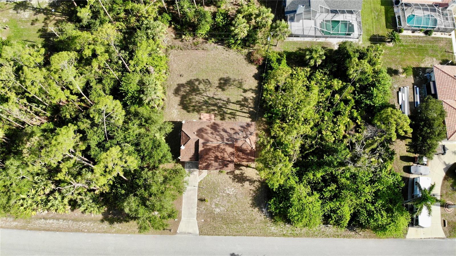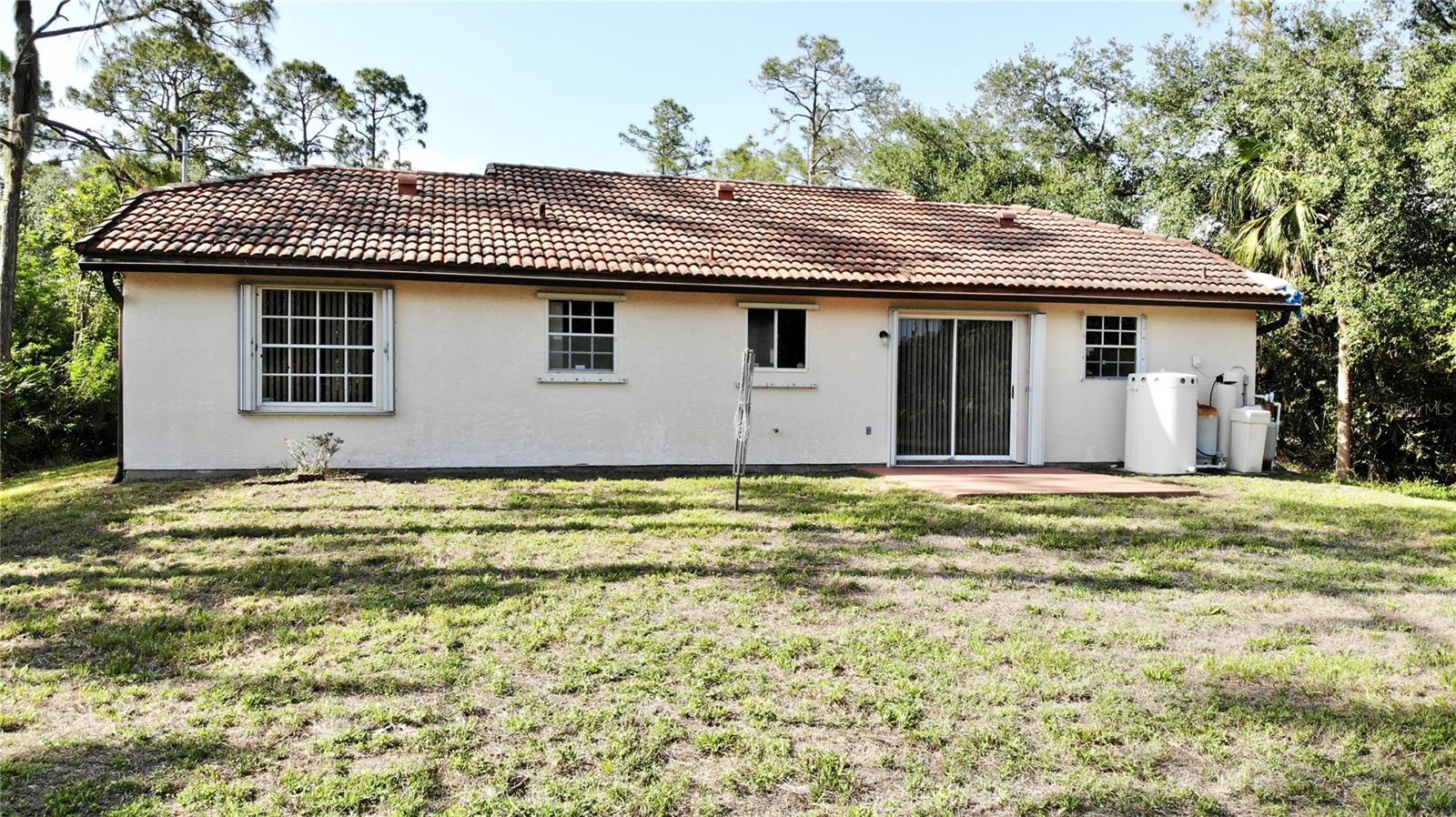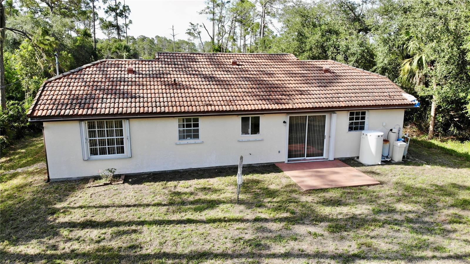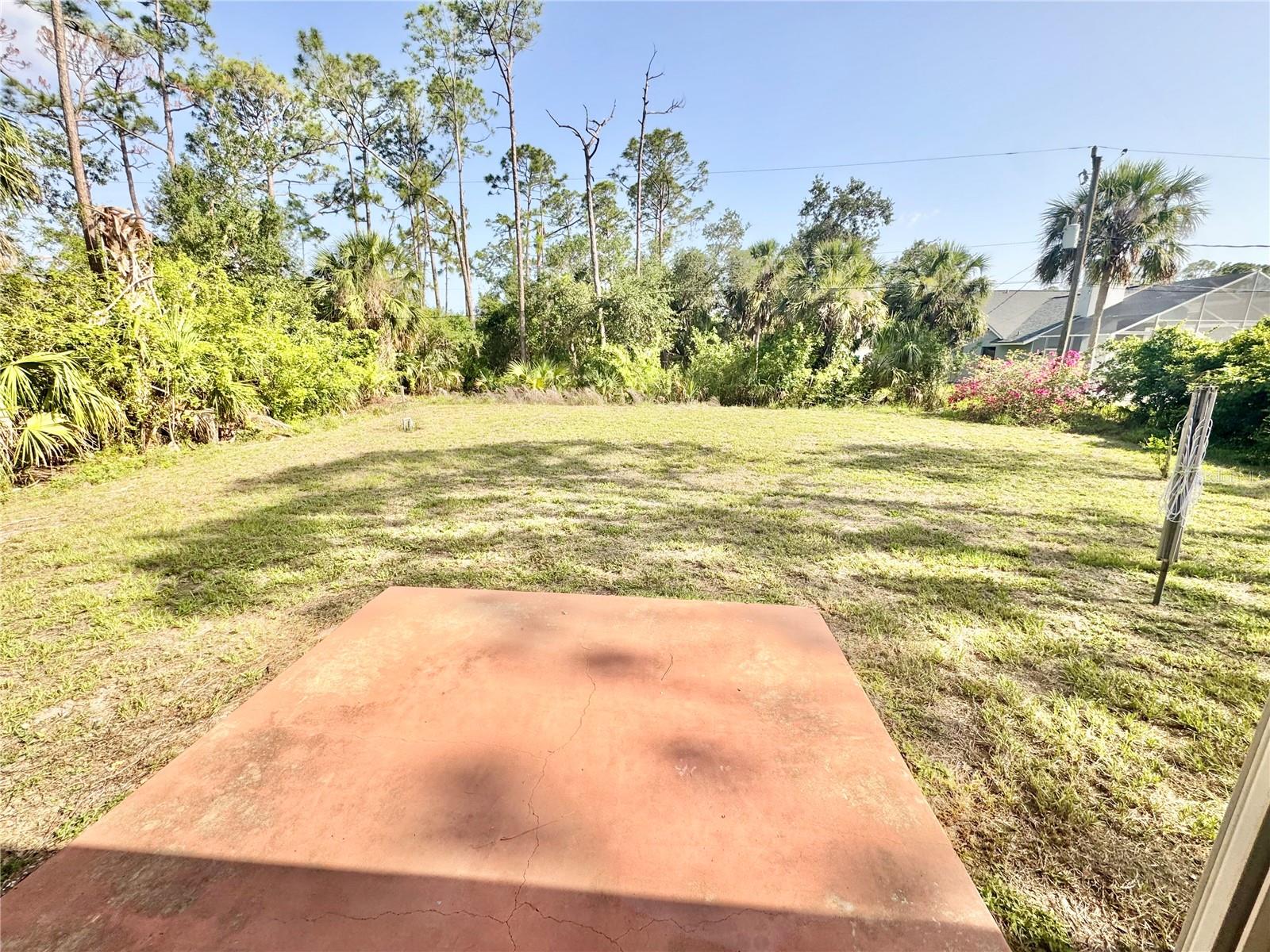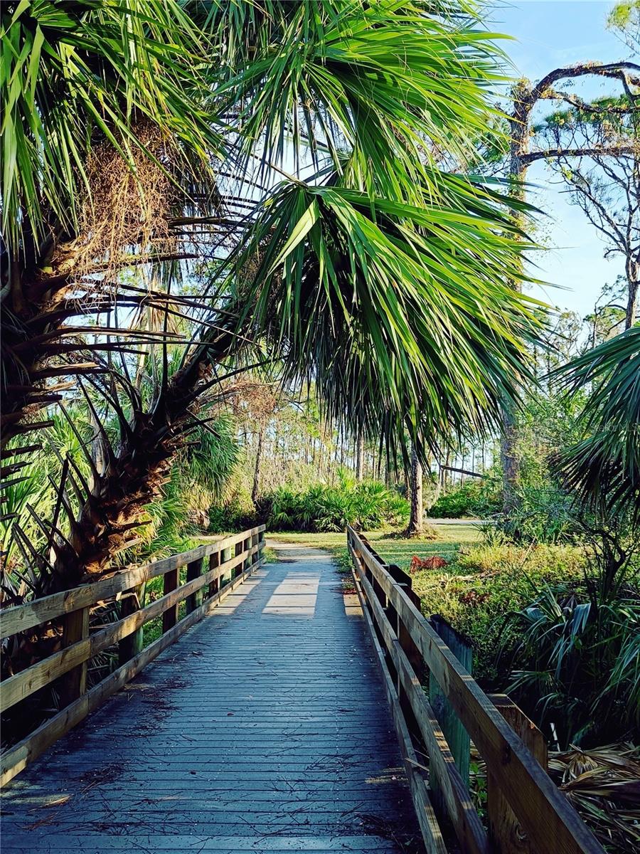 Tucked away in a peaceful, wooded setting, this charming 2-bedroom, 2-bath home with a one-car garage provides comfort, space, and quiet surroundings. Inside, you'll find high vaulted ceilings in the main living area that create an open, airy feel. Both bedrooms include mirrored sliding closet doors, and the layout is functional and inviting. The spacious backyard provides plenty of room to relax, garden, or expand, with a rear concrete pad ready for a future patio or Florida room. A cozy front porch adds to the home's charm, while accordion and panel shutters add extra peace of mind during storm season. Best of all, there's no monthly water bill—making this home as practical as it is peaceful. Though it feels like a private retreat, you're never far from everything you need. Just a short walk away is the beautiful Ollie’s Pond Park, perfect for birdwatching, nature walks, and quiet reflection. And with shopping, dining, entertainment, and major roadways nearby, you’ll enjoy the perfect balance of seclusion and convenience. This hidden gem is ready to welcome you home.
