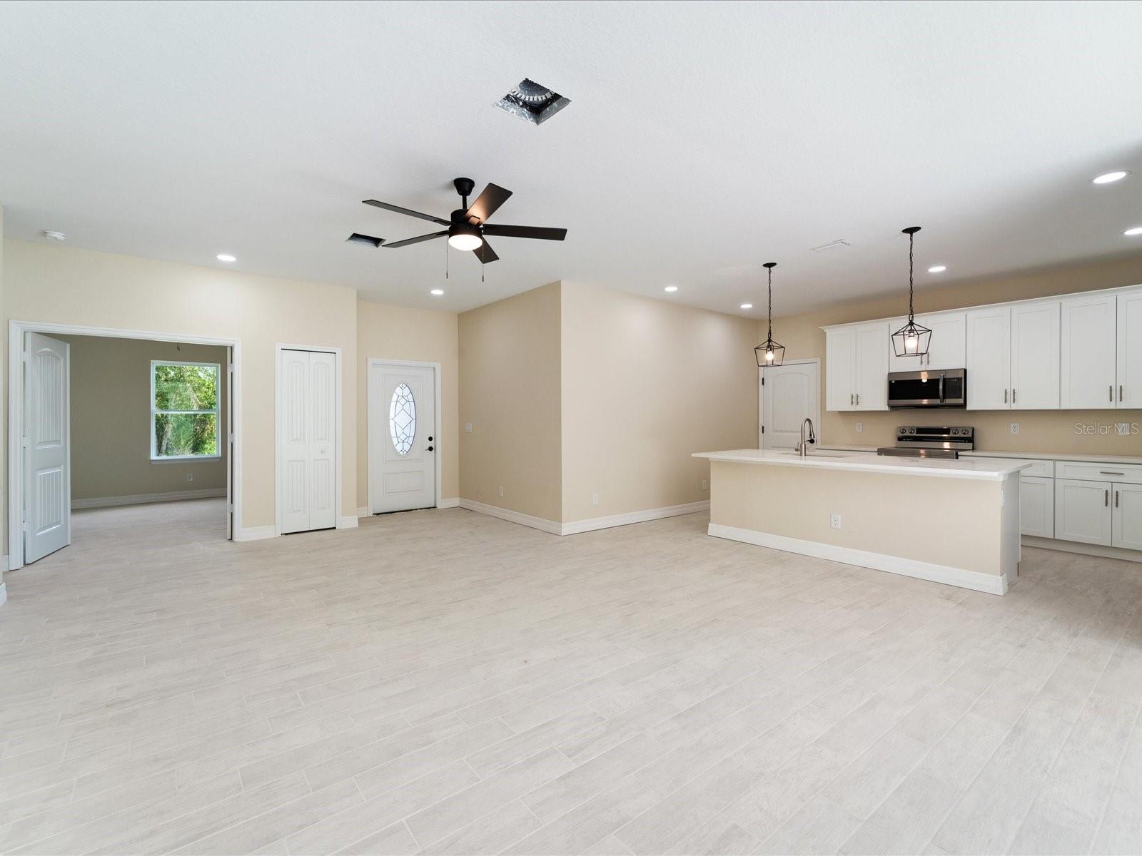 No need to wait for a new build when this lovely 3 bedroom, plus OFFICE/DEN, 2 full bathrooms, with 2 car-garage will be ready in 4 weeks! Have 15-20 years of worry-free maintenance buying brand new and being pampered with the state-of-the-art items such as beautiful Quartz countertops, ABUNDANT amount of 42" solid wood cabinetry with soft close doors & drawers, Stainless Steel refrigerator, dishwasher, range, & microwave, upgraded high-end lighting including ceiling fans with light kits in all Bedrooms, Living Room, & Office plus a generous amount of recessed lights, allergen-free porcelain plank flooring throughout, twin walk-in closets in Primary Bedroom, soaring 9'4" high ceilings throughout, 5 1/4" baseboards, fully tiled bathtub walls and walk-in shower...no plastic inserts here! Live in extravagance without spending a fortune! Dedicated Laundry room with window that streams in natural light. Built to current building codes and beyond, this home will provide a lifetime of ease with hurricane IMPACT WINDOWS, doors, and sliders, never put up a shutter and enjoy low cost Home Owner's insurance as New construction is the least expensive to insure plus this home IS NOT in a flood zone, so no flood insurance needed! With no HOA, and no deed restrictions, you can utilize your investment as you see fit…live here yourself, rent it out annually, seasonally, or AirBNB it. Bring all your toys...store your RV, boat, kayaks, put up shed for an art studio, trampoline, or treehouse, doesn't matter in this neighborhood of Charlotte County! And of course, what could be more Florida than having your own pool which this 10,000 square foot property has plenty of room for! Pictures of same floor plan but not actual home, colors and finish choices may vary. Other locations available, some with smaller floor plans. Call for your private showing today!